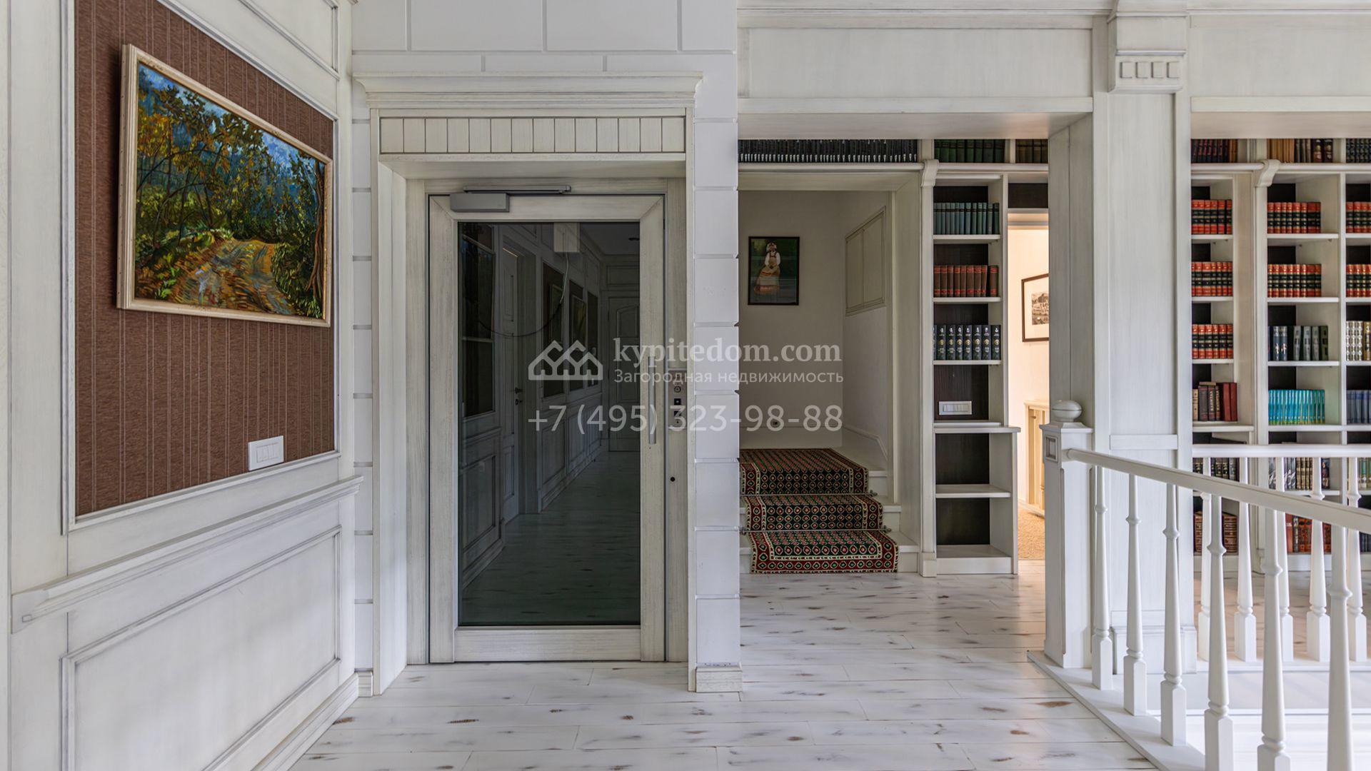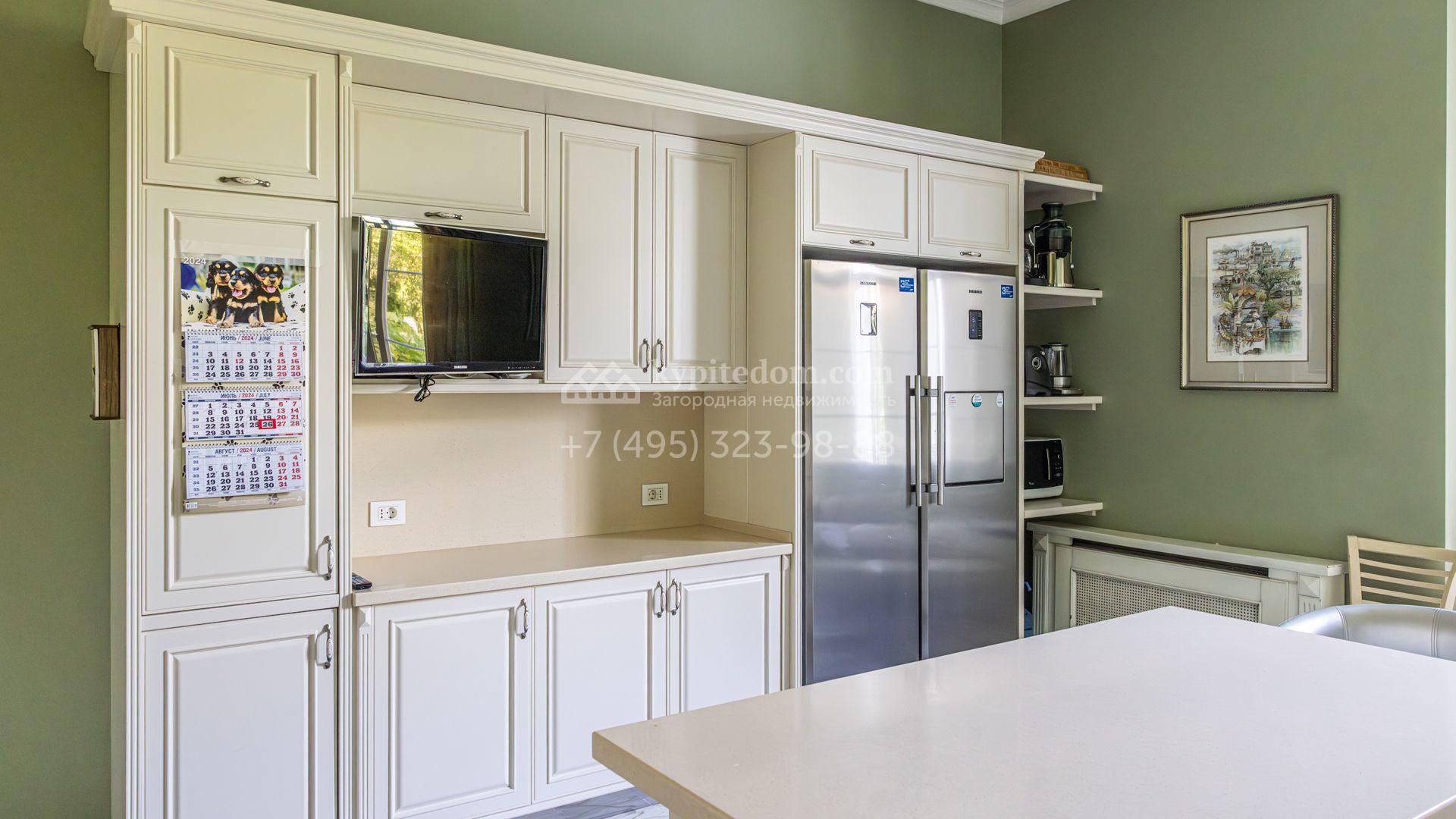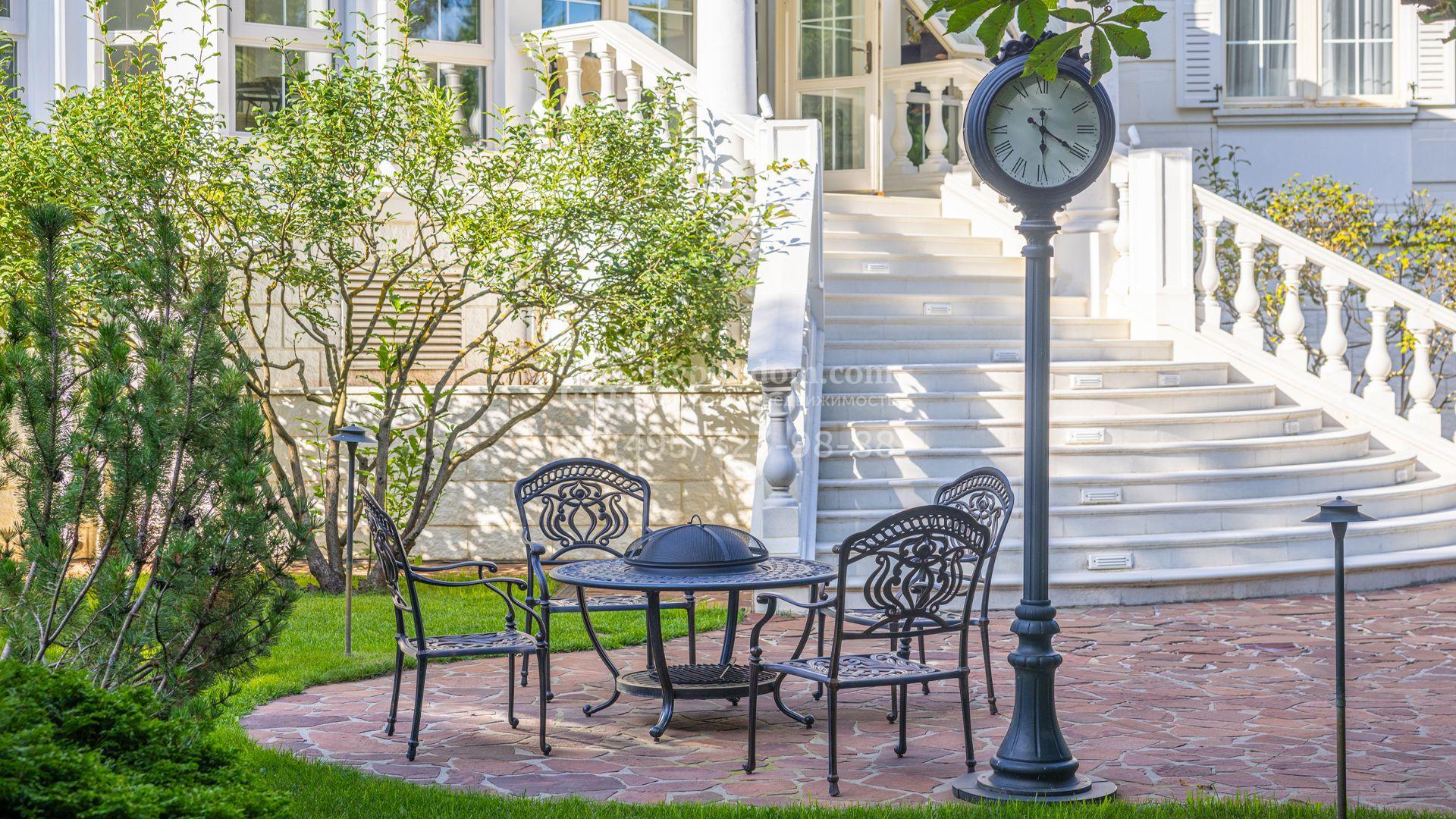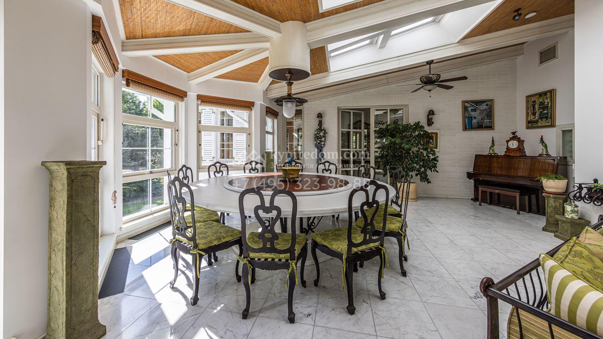 Загородная резиденция площадью 1245 м² расположена на просторном участке 50 соток. Фасад здания в классическом стиле облицован молочным кликером и декорирован колоннами, балясинами и ставнями. В отделке светлого интерьера преобладают теплые оттенки, создающие атмосферу уюта. Планировкой дома предусмотрены 5 спален, гостиная с камином, столовая с камином, рабочая с выходом в гараж и лестницей на цокольный этаж и парадная кухни, кабинет с зоной отдыха, зимний сад, веранда с барной зоной, столом на 12 персон, диванной зоной и отдельным выходом в сад, бильярдная-кинозал и гараж на 2 машины.