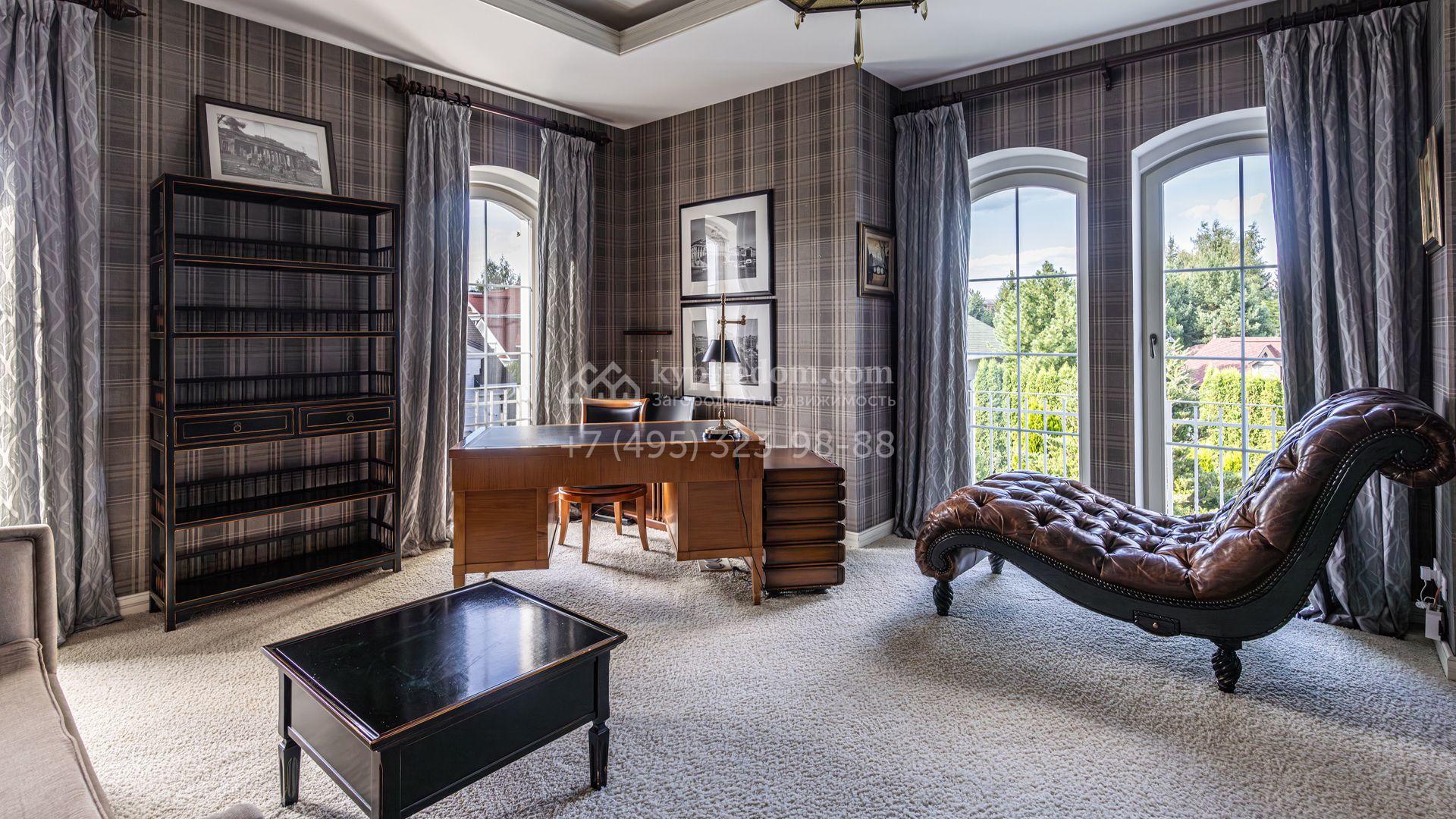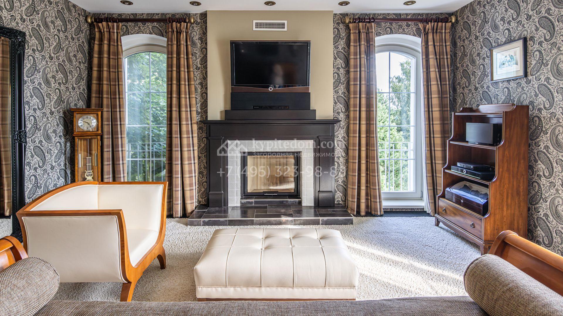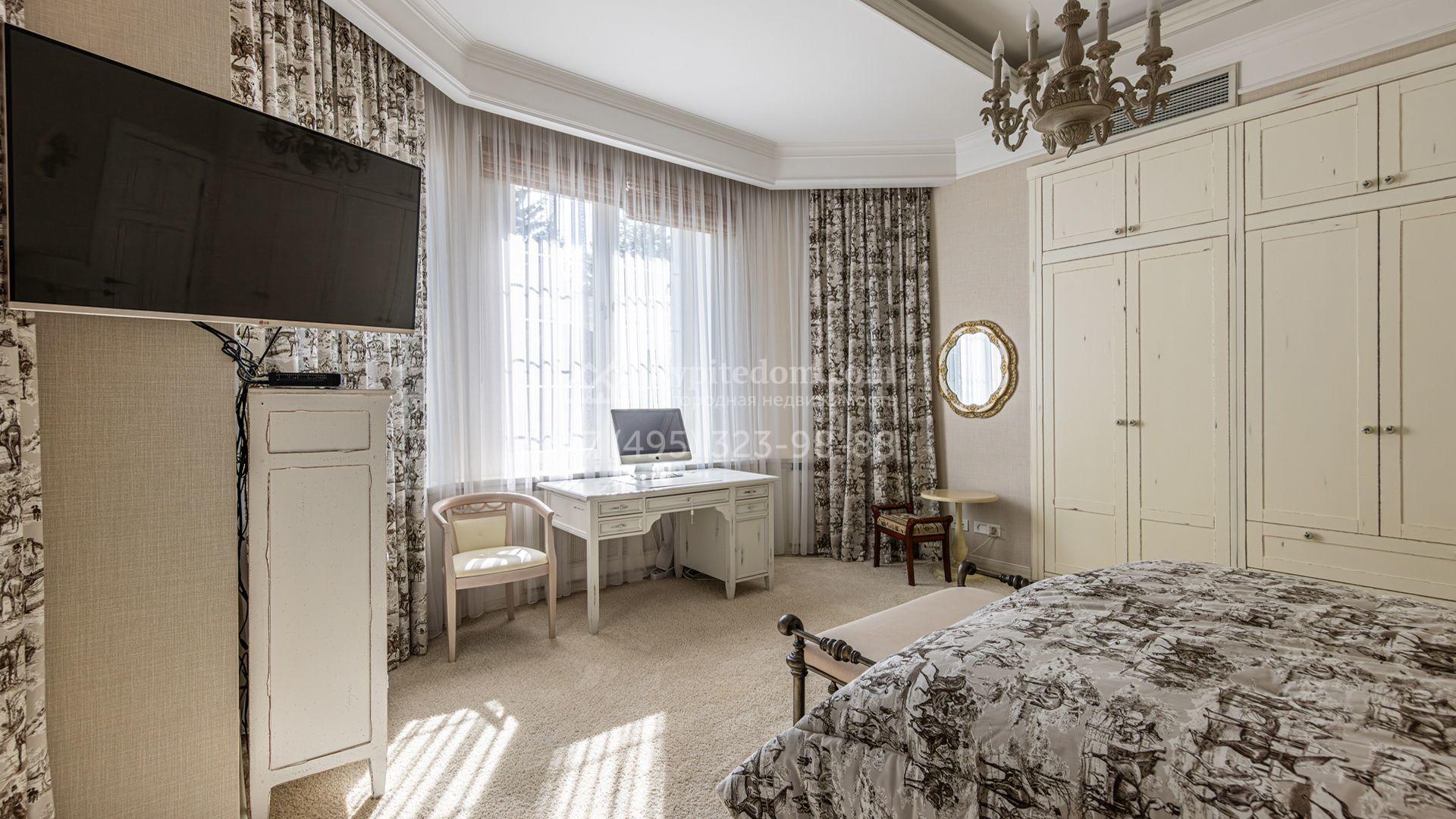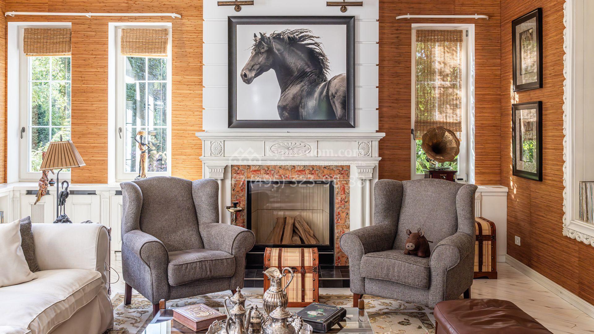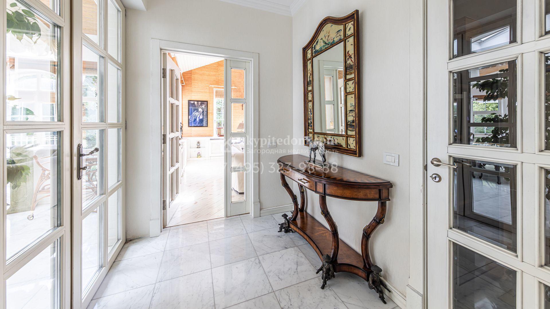 Загородная резиденция площадью 1245 м² расположена на просторном участке 50 соток. Фасад здания в классическом стиле облицован молочным кликером и декорирован колоннами, балясинами и ставнями. В отделке светлого интерьера преобладают теплые оттенки, создающие атмосферу уюта. Планировкой дома предусмотрены 5 спален, гостиная с камином, столовая с камином, рабочая с выходом в гараж и лестницей на цокольный этаж и парадная кухни, кабинет с зоной отдыха, зимний сад, веранда с барной зоной, столом на 12 персон, диванной зоной и отдельным выходом в сад, бильярдная-кинозал и гараж на 2 машины.