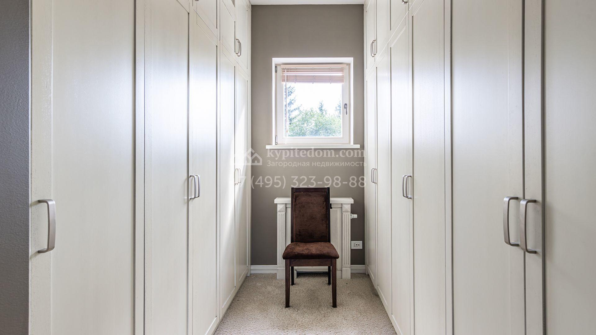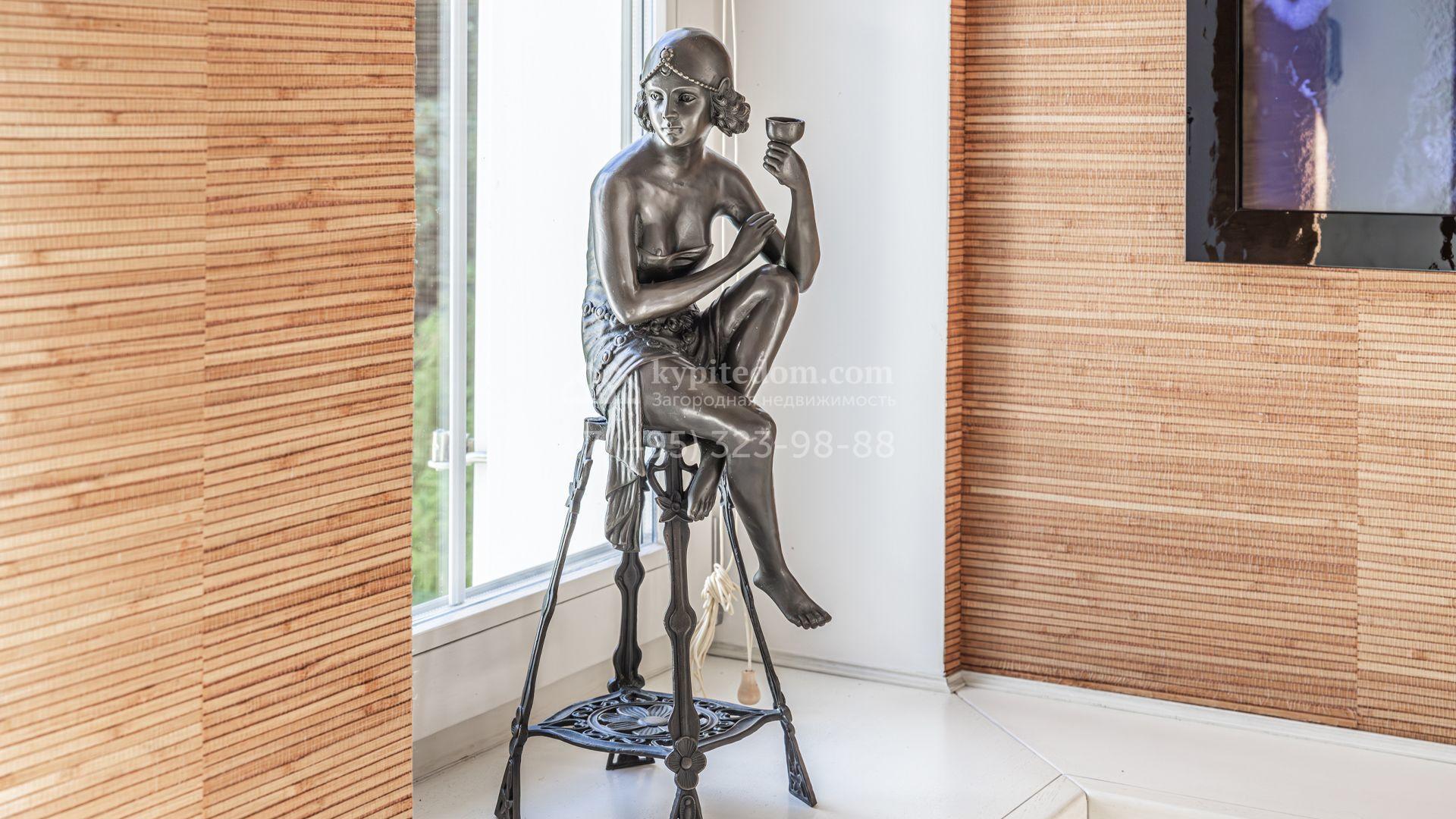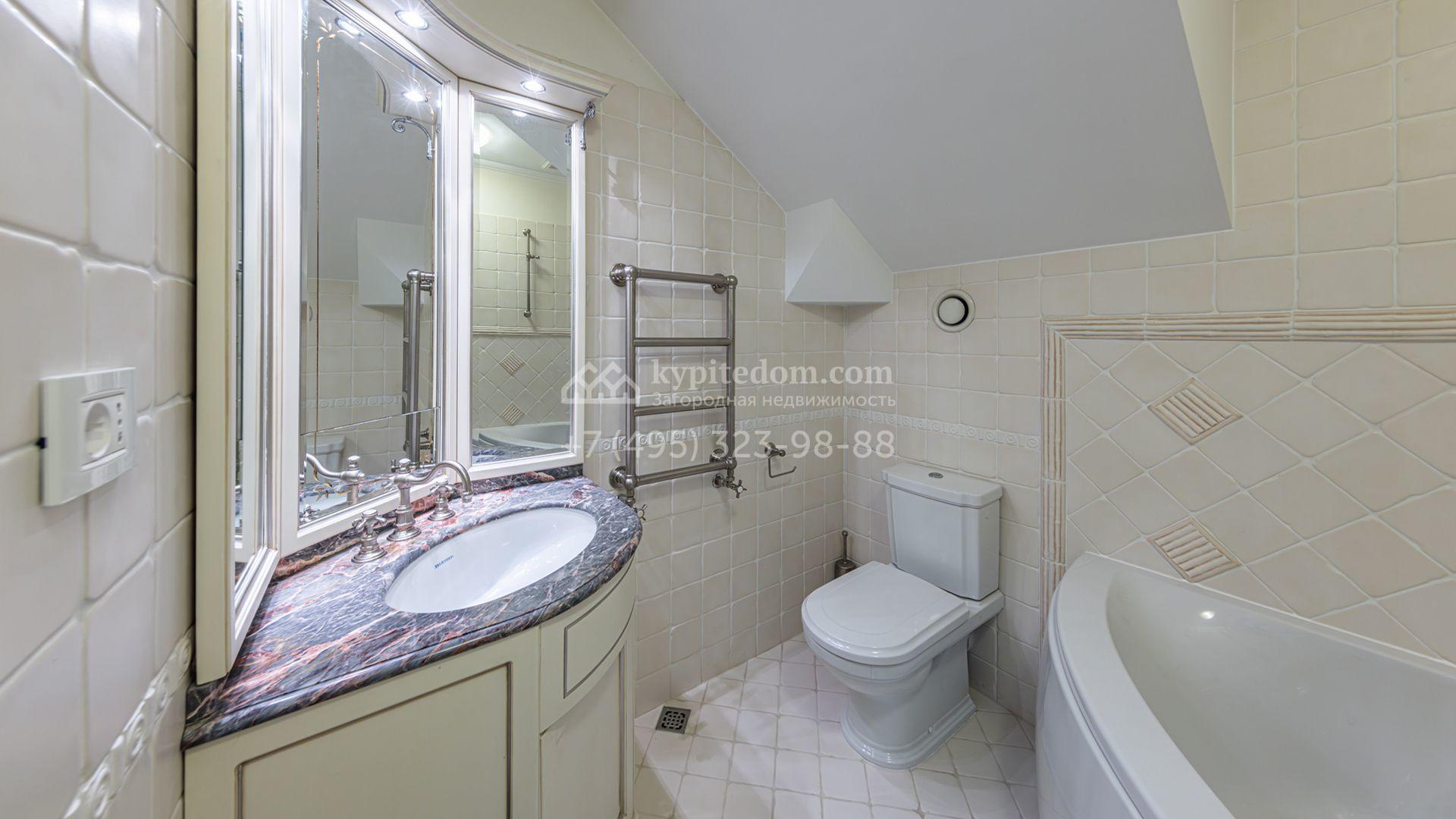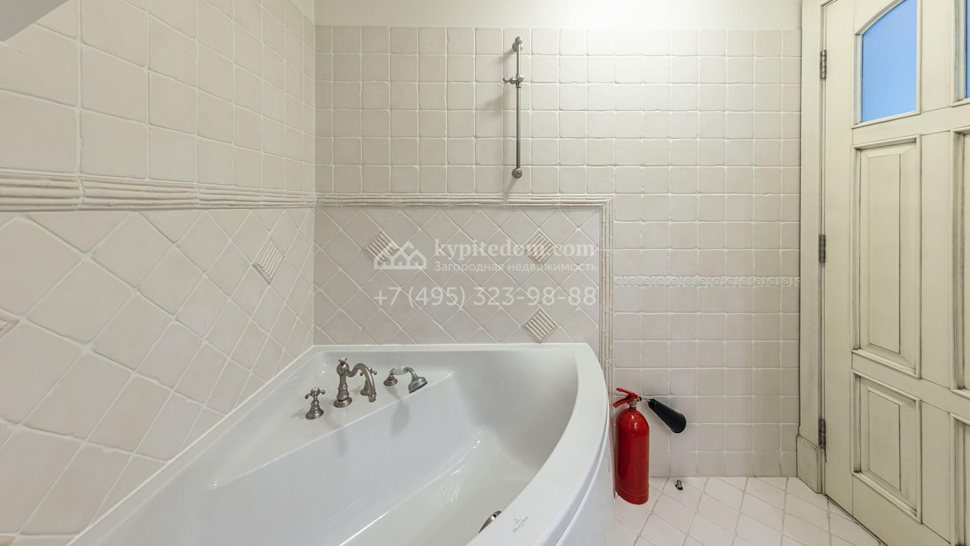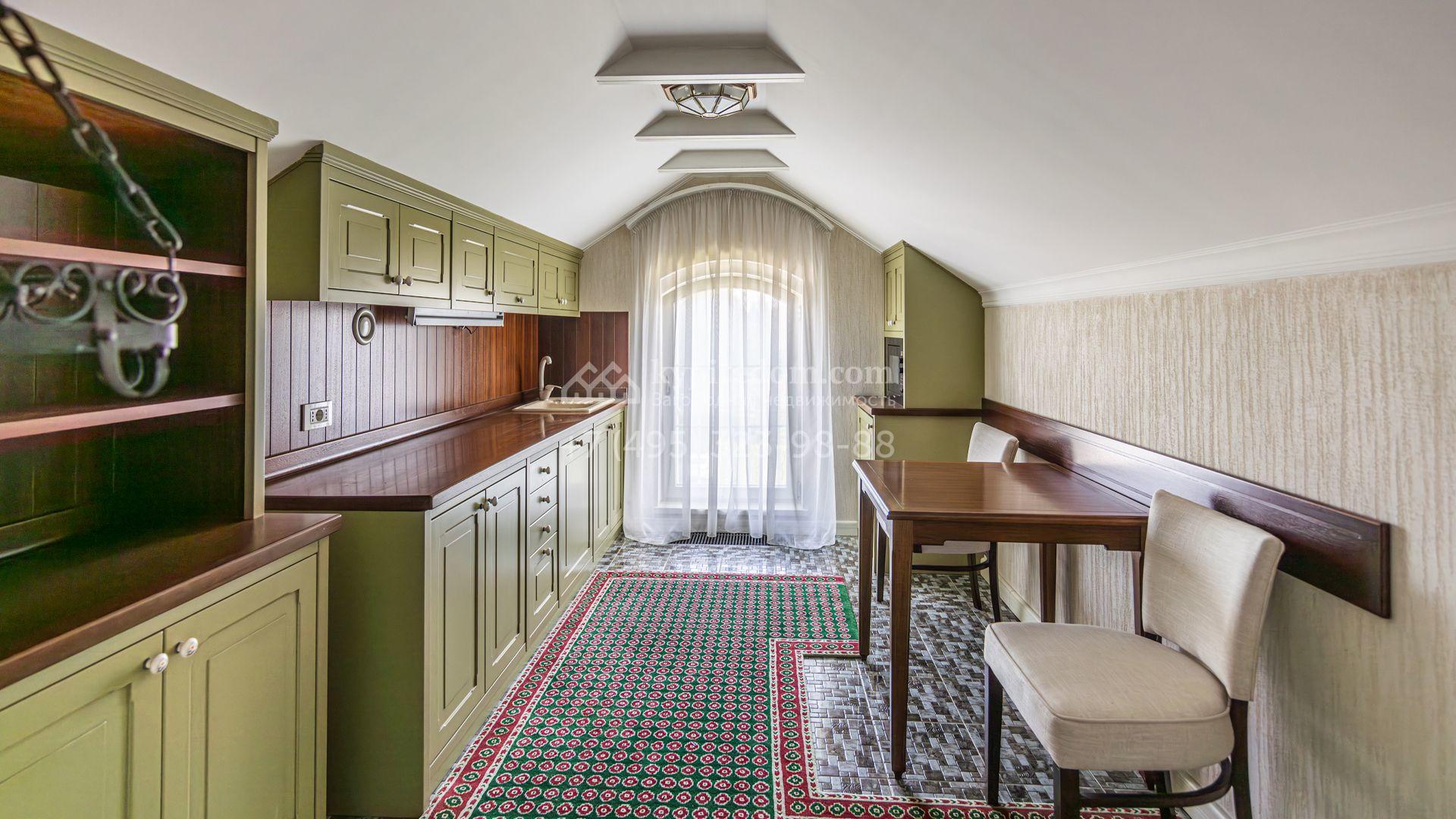 Загородная резиденция площадью 1245 м² расположена на просторном участке 50 соток. Фасад здания в классическом стиле облицован молочным кликером и декорирован колоннами, балясинами и ставнями. В отделке светлого интерьера преобладают теплые оттенки, создающие атмосферу уюта. Планировкой дома предусмотрены 5 спален, гостиная с камином, столовая с камином, рабочая с выходом в гараж и лестницей на цокольный этаж и парадная кухни, кабинет с зоной отдыха, зимний сад, веранда с барной зоной, столом на 12 персон, диванной зоной и отдельным выходом в сад, бильярдная-кинозал и гараж на 2 машины.