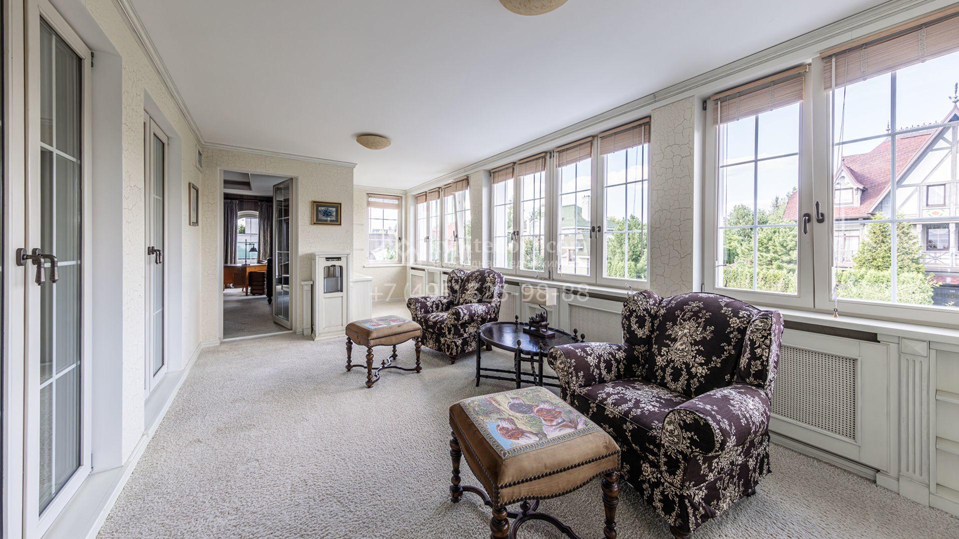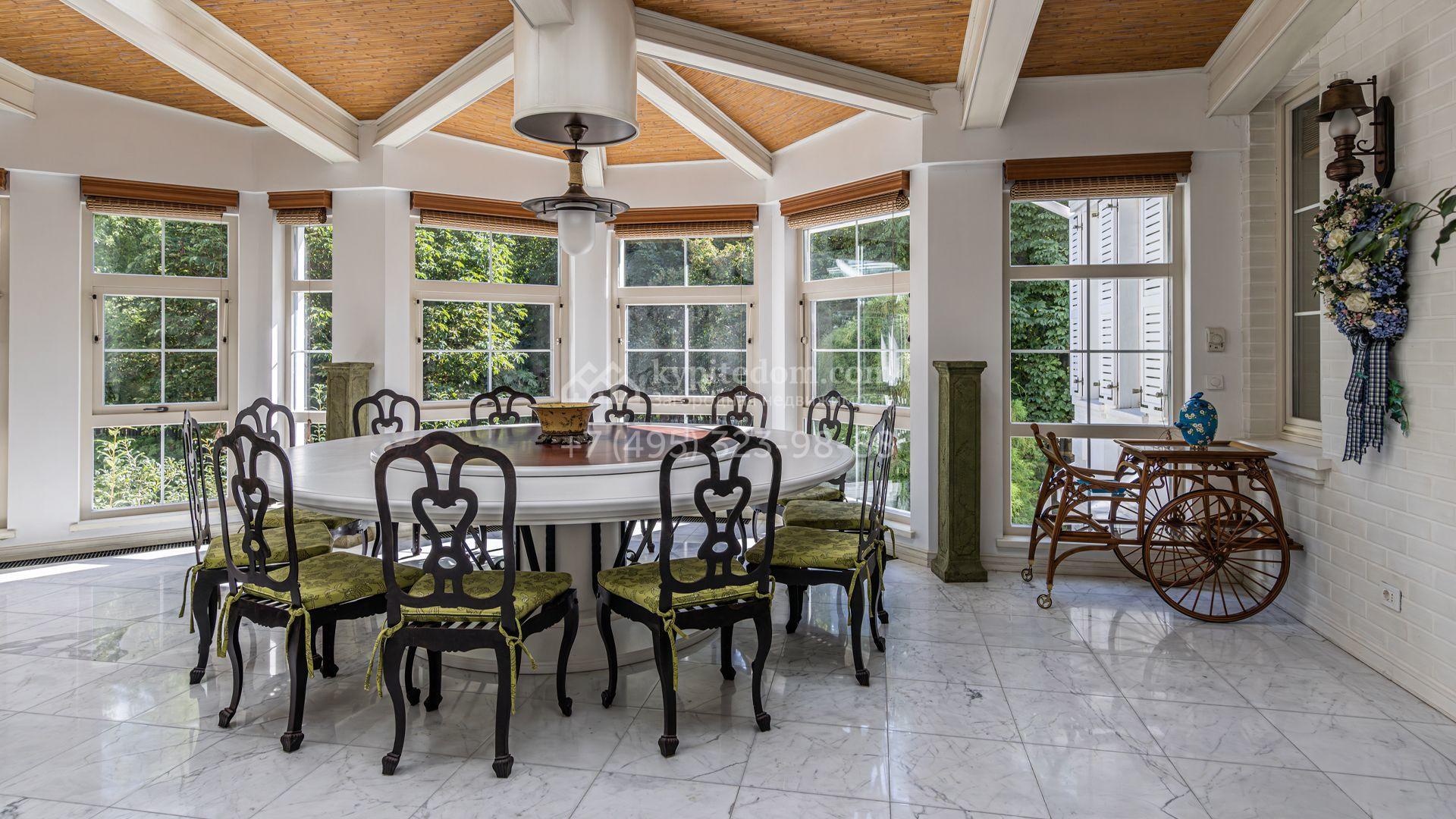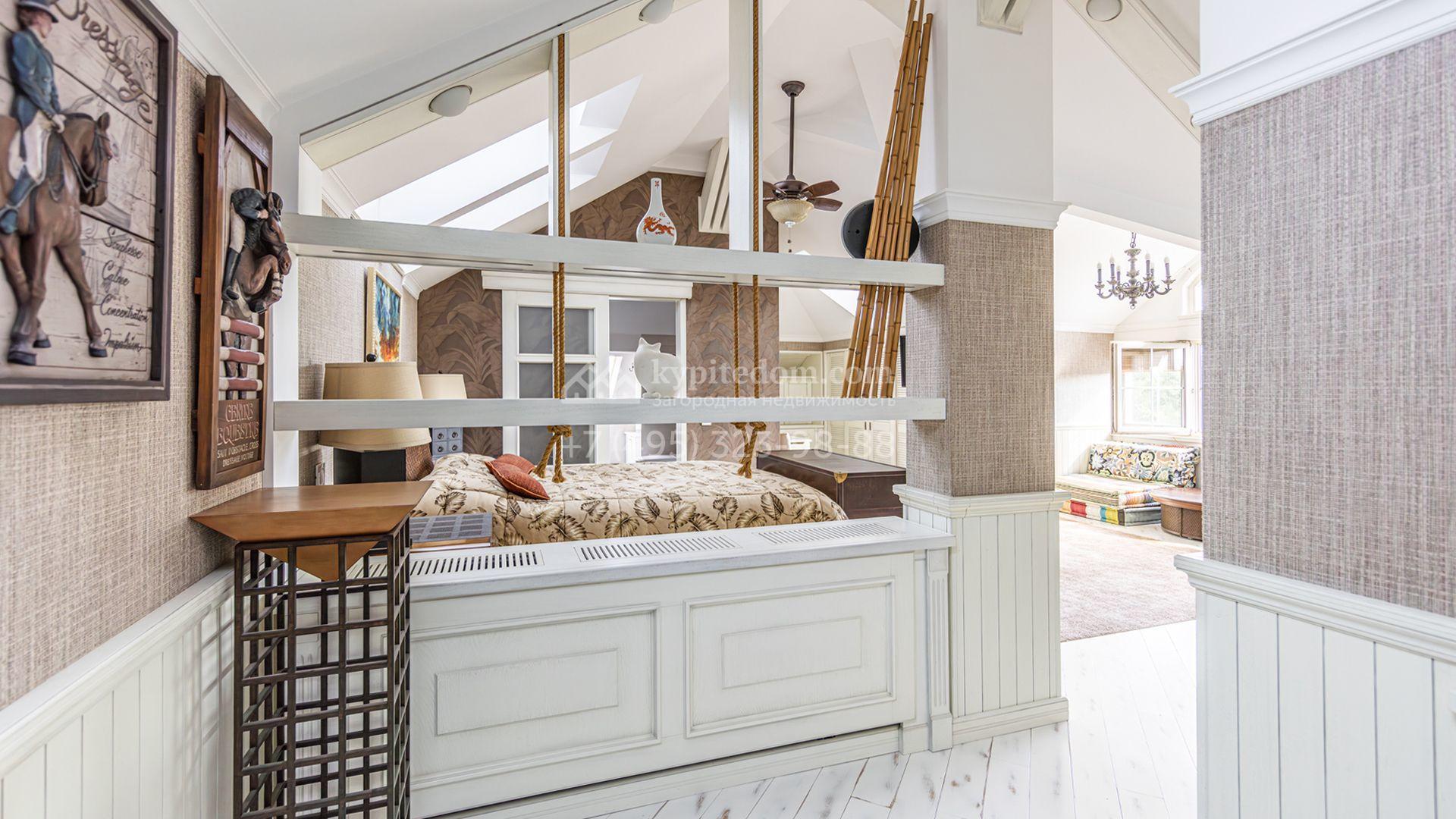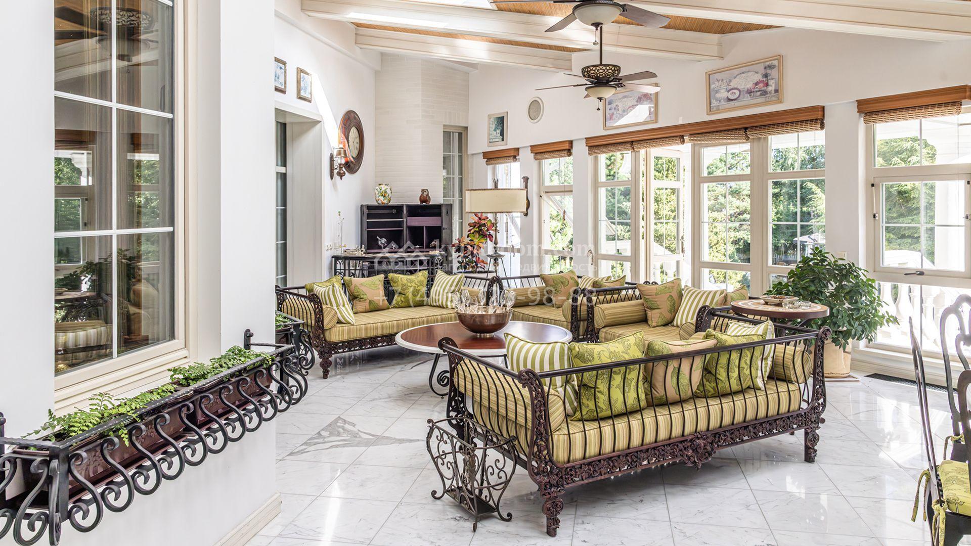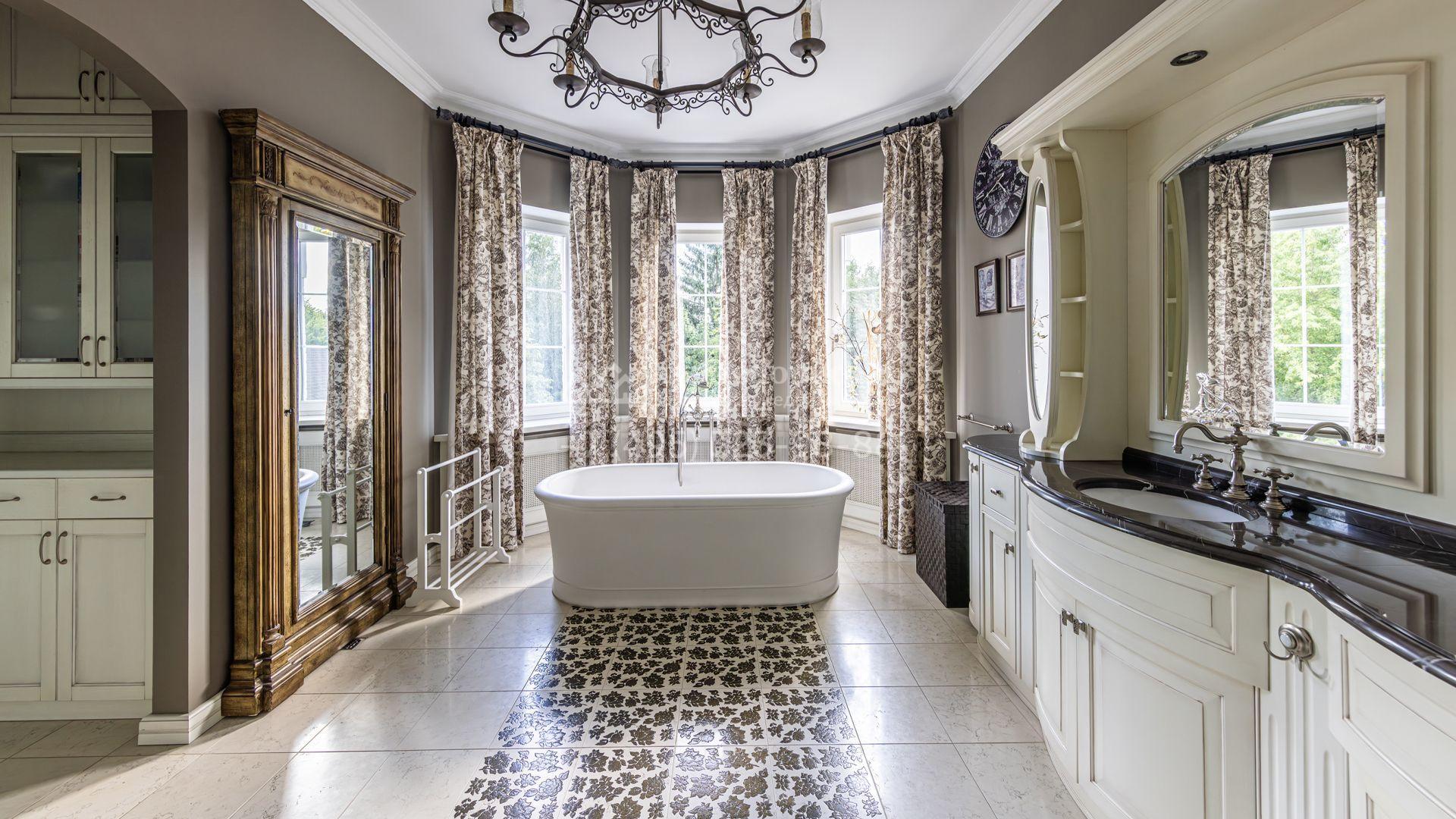 Загородная резиденция площадью 1245 м² расположена на просторном участке 50 соток. Фасад здания в классическом стиле облицован молочным кликером и декорирован колоннами, балясинами и ставнями. В отделке светлого интерьера преобладают теплые оттенки, создающие атмосферу уюта. Планировкой дома предусмотрены 5 спален, гостиная с камином, столовая с камином, рабочая с выходом в гараж и лестницей на цокольный этаж и парадная кухни, кабинет с зоной отдыха, зимний сад, веранда с барной зоной, столом на 12 персон, диванной зоной и отдельным выходом в сад, бильярдная-кинозал и гараж на 2 машины.