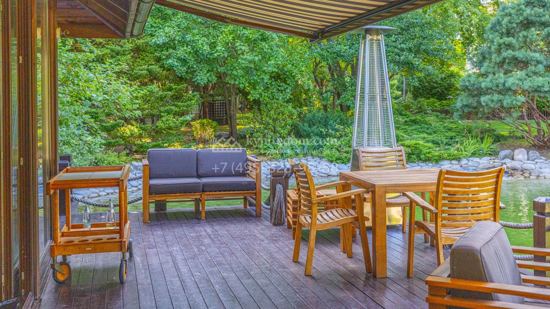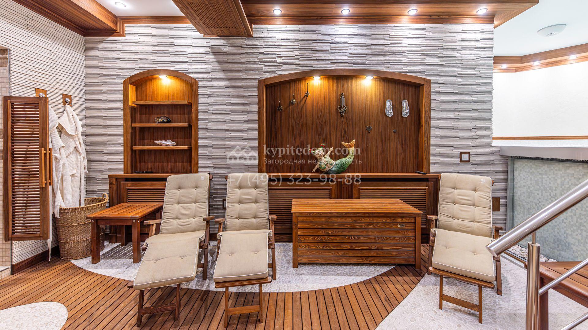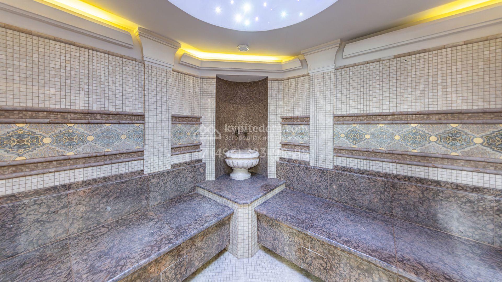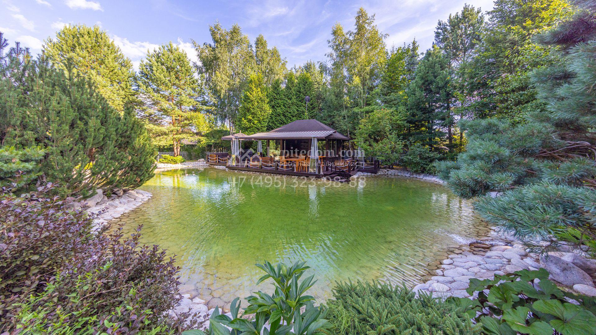 Расслабиться в конце дня можно в SPA-зоне с хаммамом и бассейном с противотоком. Коттедж оборудован пассажирским лифтом для всех уровней. Рядом построен хозяйственный дом 128 м² с комнатой охраны, квартирой для персонала, мастерской и гаражом на 2 машины с навесом. На участке с ландшафтным дизайном обустроен собственный пруд с шестиступенчатой системой очистки воды для купания, на берегу установлены беседка с кухней и санузлом и дека с диванной зоной, зонтом, грилем и лестницей в пруд. Оборудованы баскетбольная и бадминтонная площадки, выделенная территория с грилем для кейтеринга и загон для выгула собак.