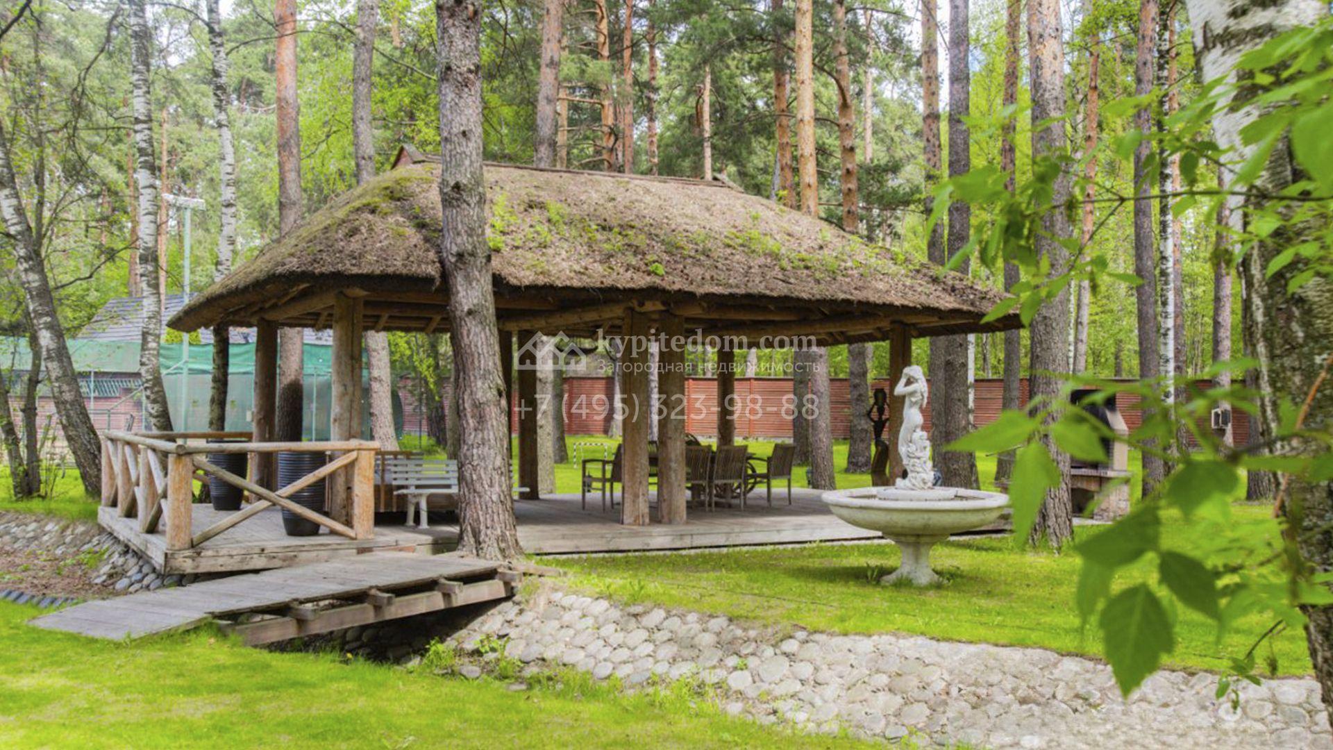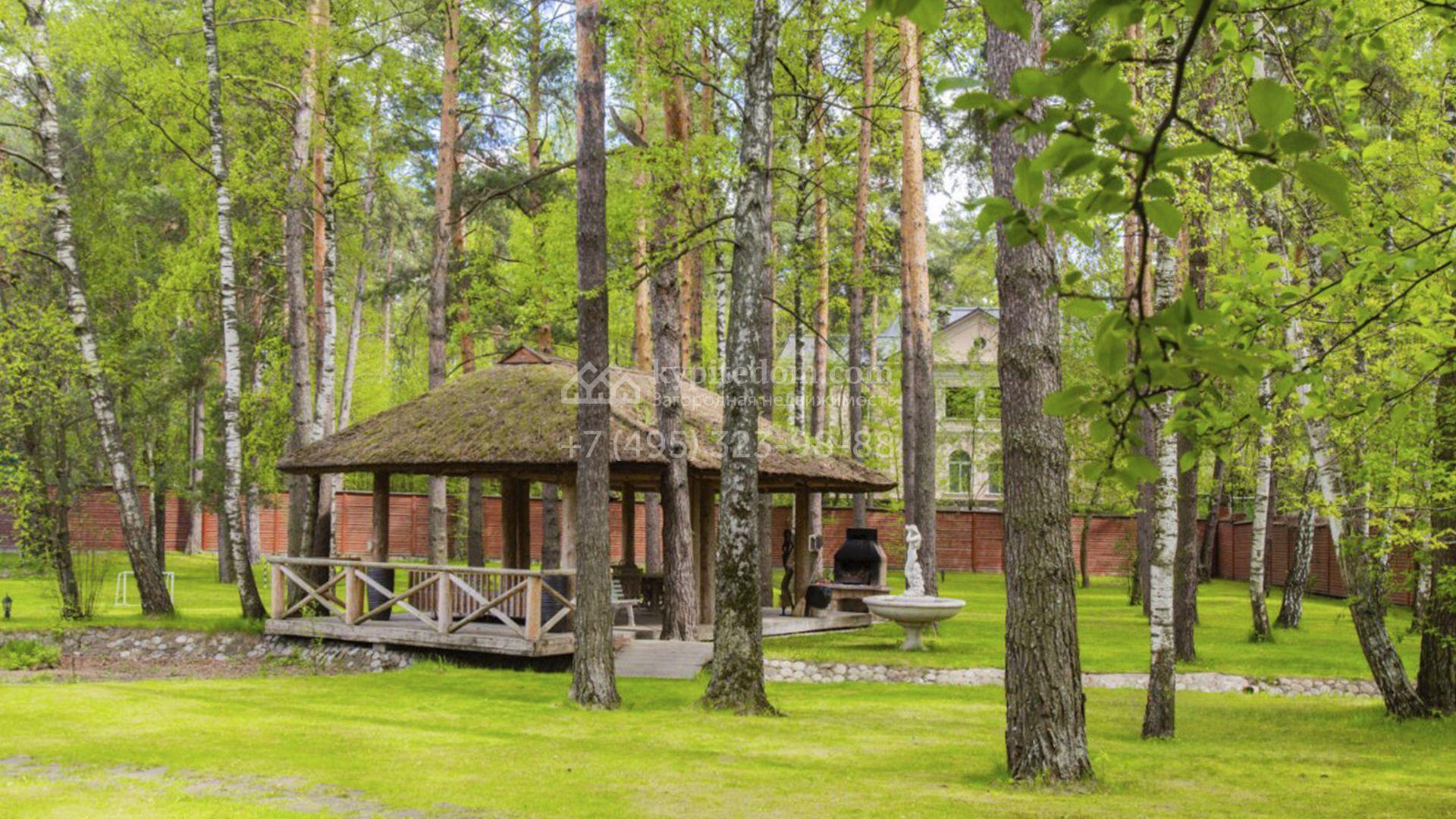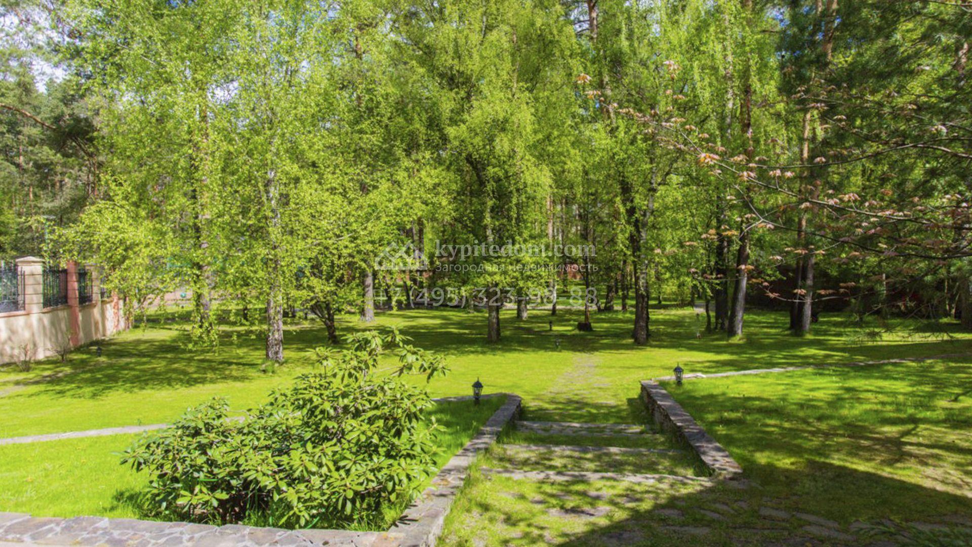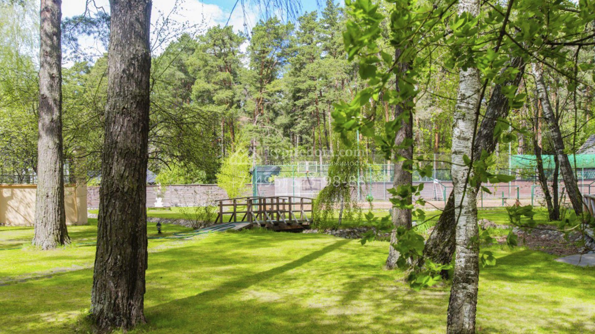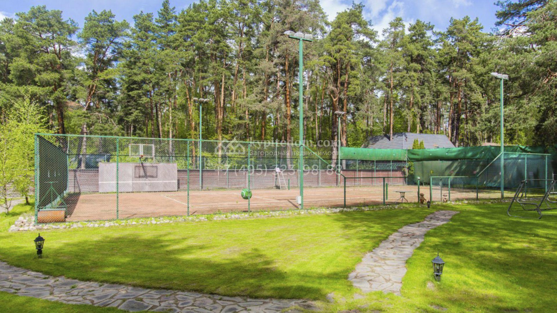 Планировка включает гостиную с камином, кухню-столовую с удобным островом, библиотеку, зимний сад, 5 спален, сауну, кабинет, тренажерный зал, вместительные гардеробные и просторную террасу с маркизой и зоной отдыха. На мансарде разместили игровую и ученическую комнаты. Кроме того, в контуре дома обустроена комната для персонала с отдельным входом. Машины можно оставить во встроенном гараже или же в отдельностоящем, рассчитанном на 2 автомобиля. Дополнительно на территории построены профессиональный теннисный корт, уютная беседка-барбекю, домик для охраны и техническое помещение с блоком для персонала. На участке вдохните запах свежескошенной травы, прогуливаясь по освещенным мощеным дорожкам в тени высоких деревьев и любуйтесь тихой речкой, через которую прокинуты живописные мостики.