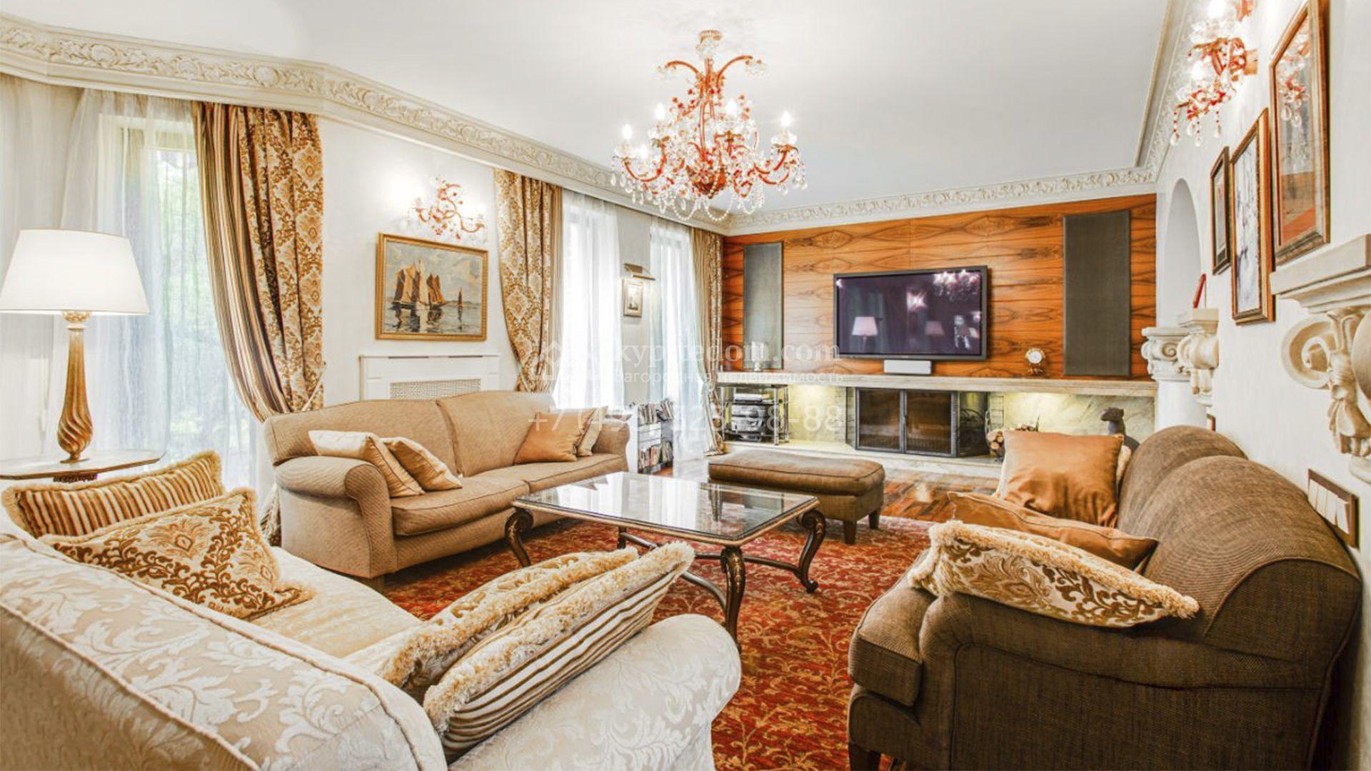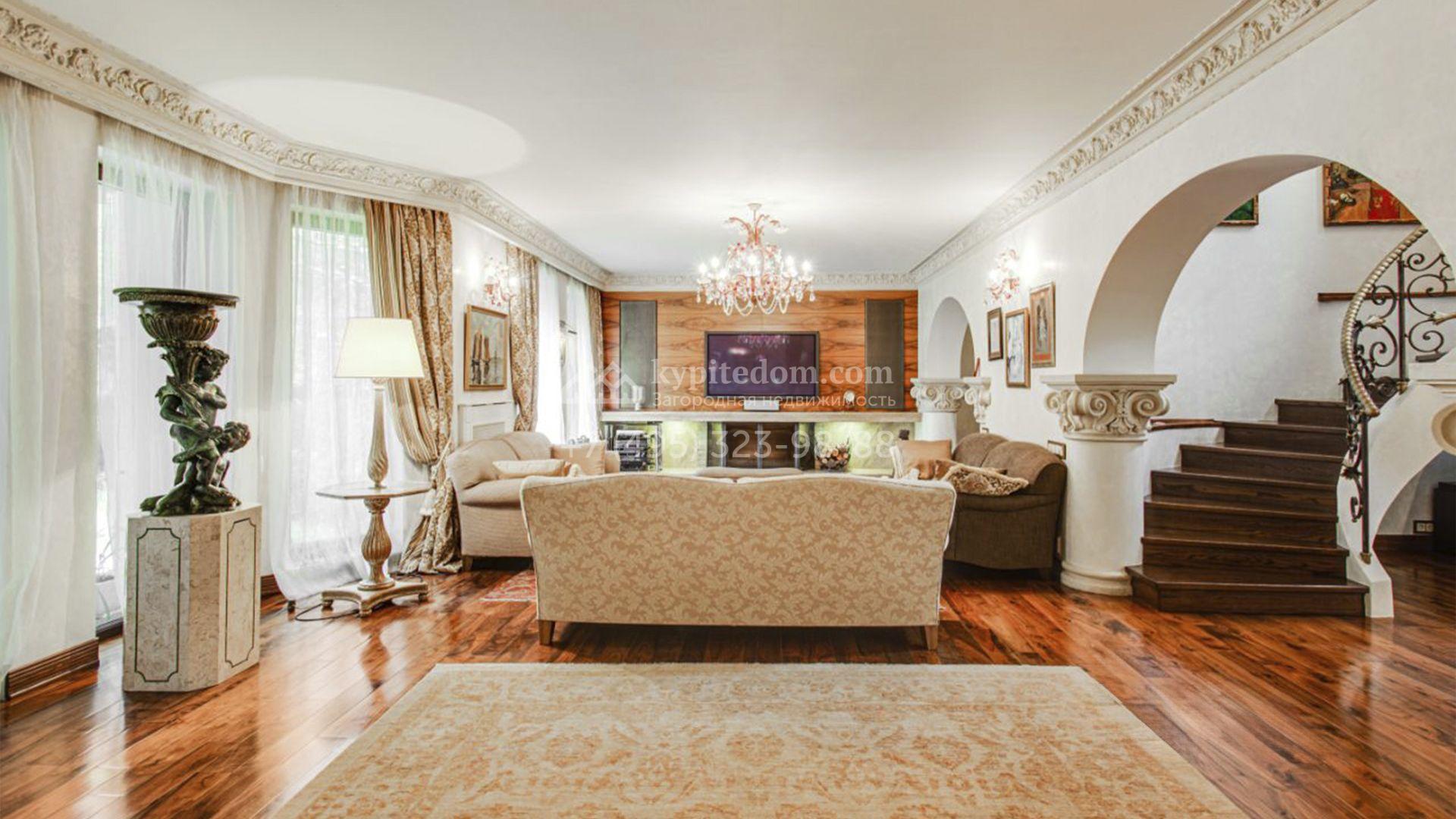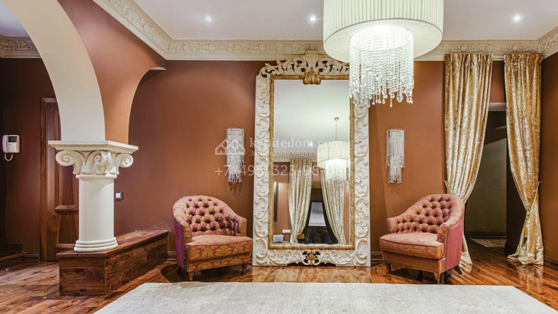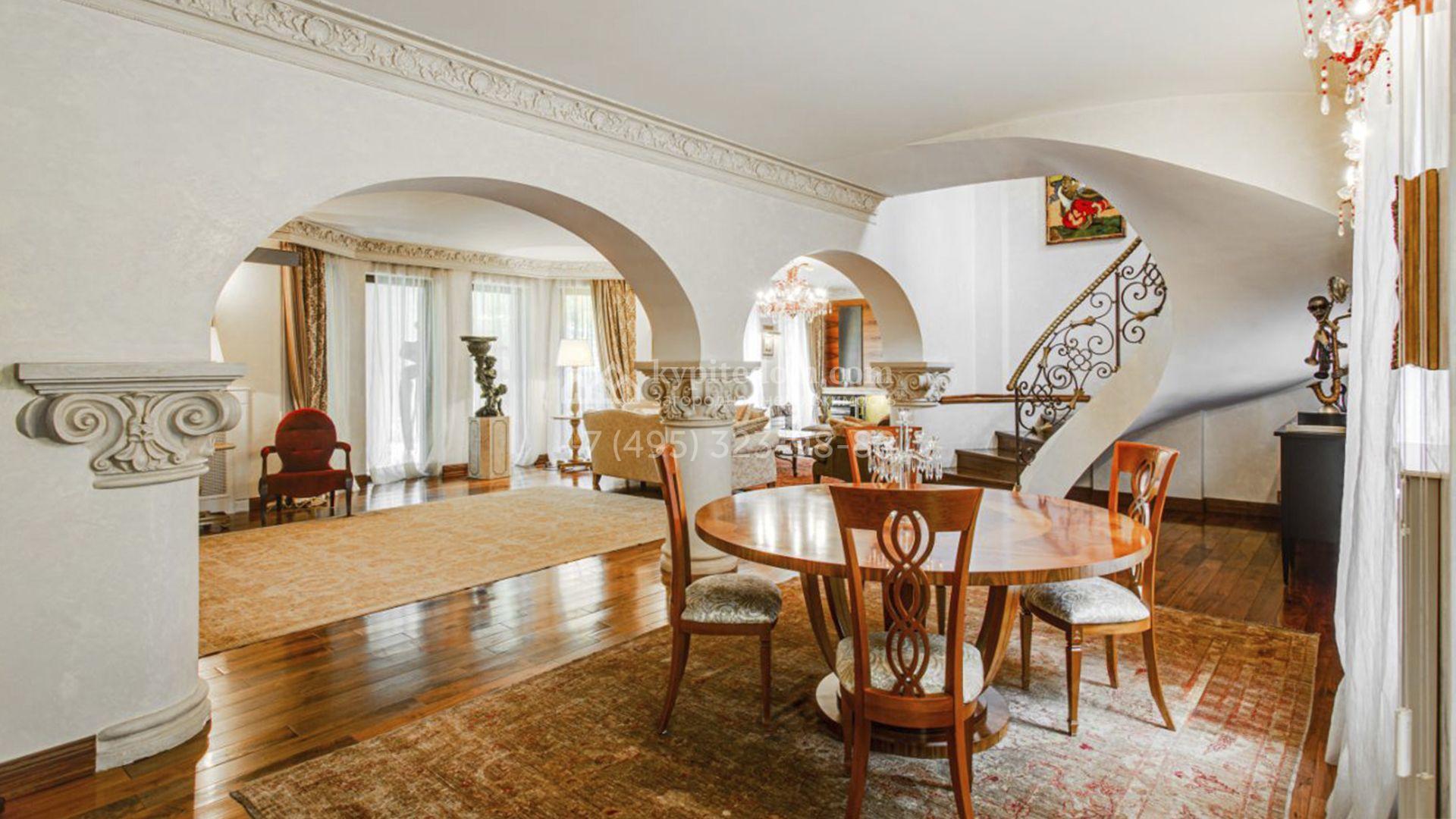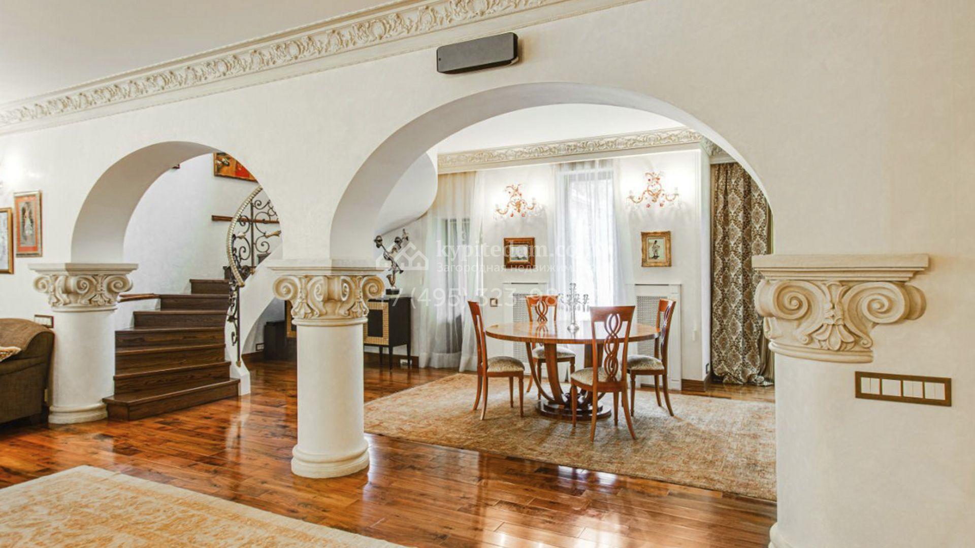 Загородная резиденция площадью 726 м² расположена на лесном участке 73 сотки. Фасад, выполненный в неоклассическом стиле, облицован кирпичом, коралловой штукатуркой и плиткой с фактурой камня, а также украшен изящной рустовкой, мозаикой и подсветкой, подчеркивающей архитектуру в вечерние часы. Панорамное остекление создает ощущение гармонии с природой и наполняет внутренние пространства светом. Интерьеры выдержаны в спокойных тонах, отделаны с использованием высококачественных натуральных материалов и дополнены классическими элементами — элегантными колоннами и лепниной на карнизах. Коттедж укомплектован мебелью от ведущих производителей, современной бытовой техникой и сантехникой. Система кондиционирования обеспечивает идеальный микроклимат в любое время года.