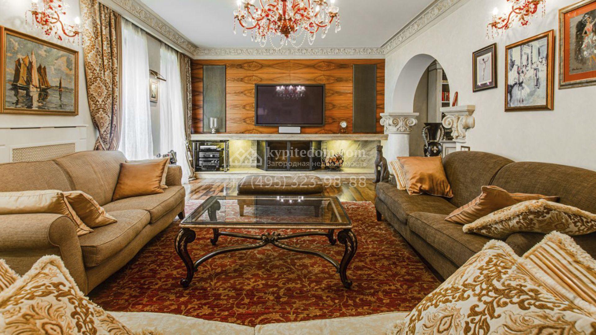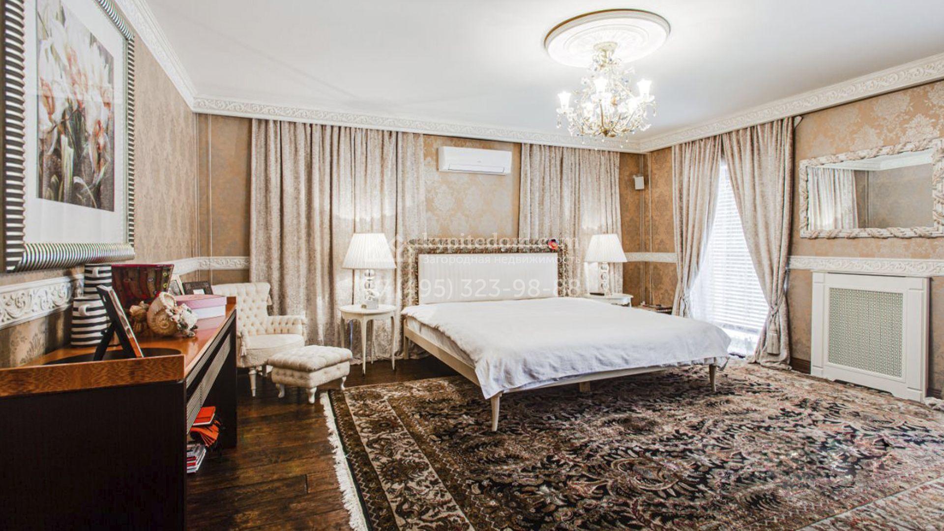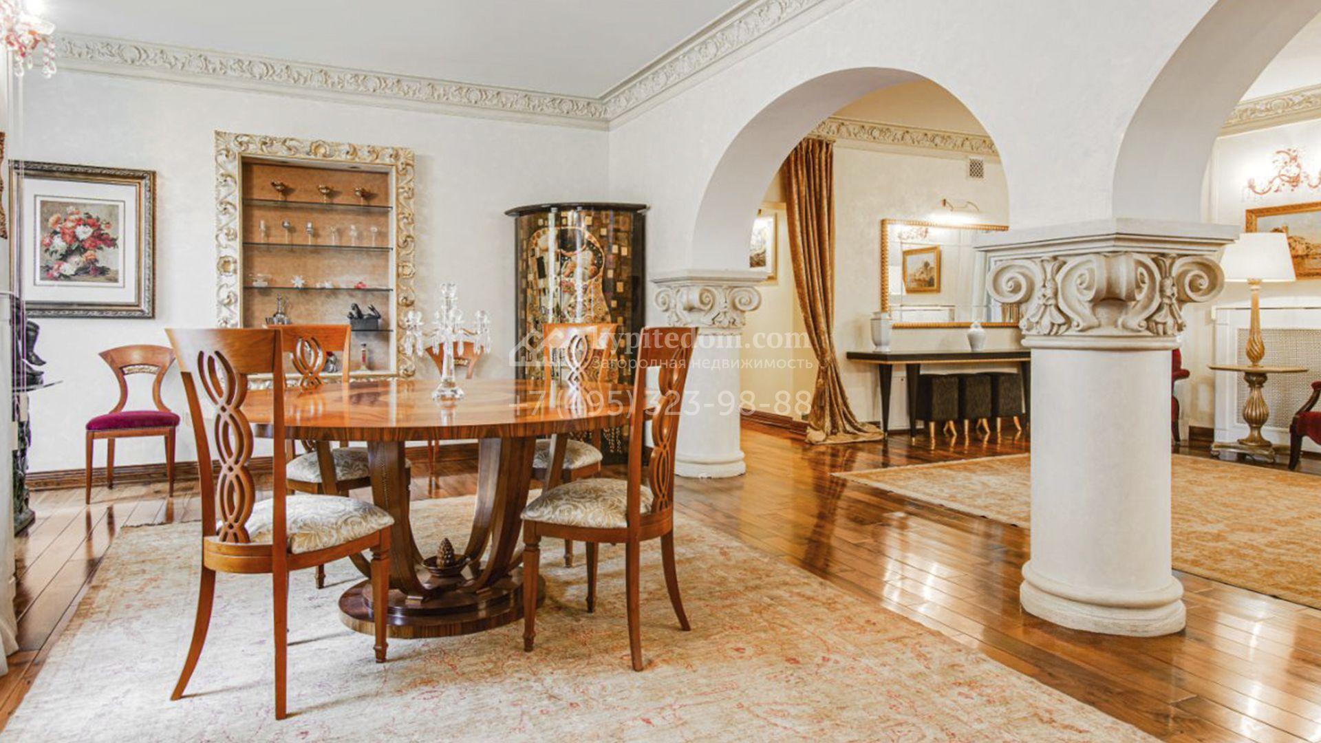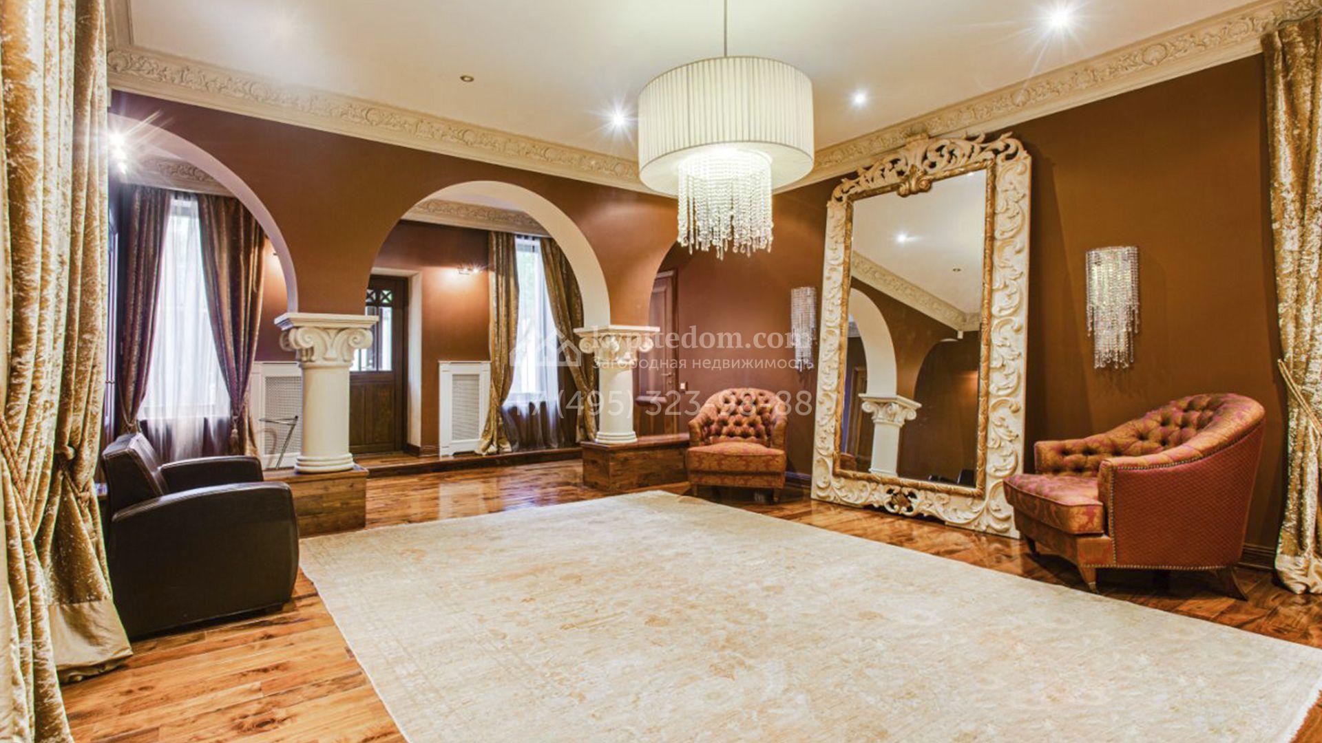 Загородная резиденция площадью 726 м² расположена на лесном участке 73 сотки. Фасад, выполненный в неоклассическом стиле, облицован кирпичом, коралловой штукатуркой и плиткой с фактурой камня, а также украшен изящной рустовкой, мозаикой и подсветкой, подчеркивающей архитектуру в вечерние часы. Панорамное остекление создает ощущение гармонии с природой и наполняет внутренние пространства светом. Интерьеры выдержаны в спокойных тонах, отделаны с использованием высококачественных натуральных материалов и дополнены классическими элементами — элегантными колоннами и лепниной на карнизах. Коттедж укомплектован мебелью от ведущих производителей, современной бытовой техникой и сантехникой. Система кондиционирования обеспечивает идеальный микроклимат в любое время года.