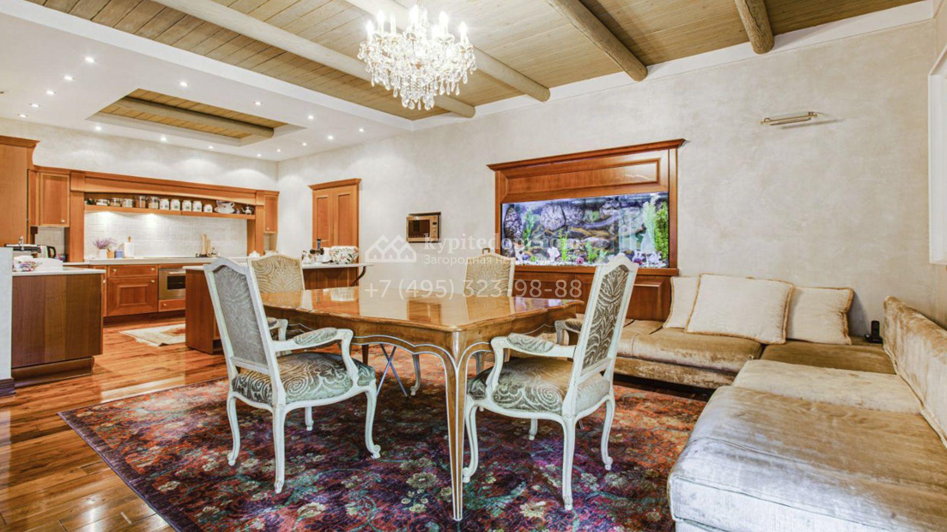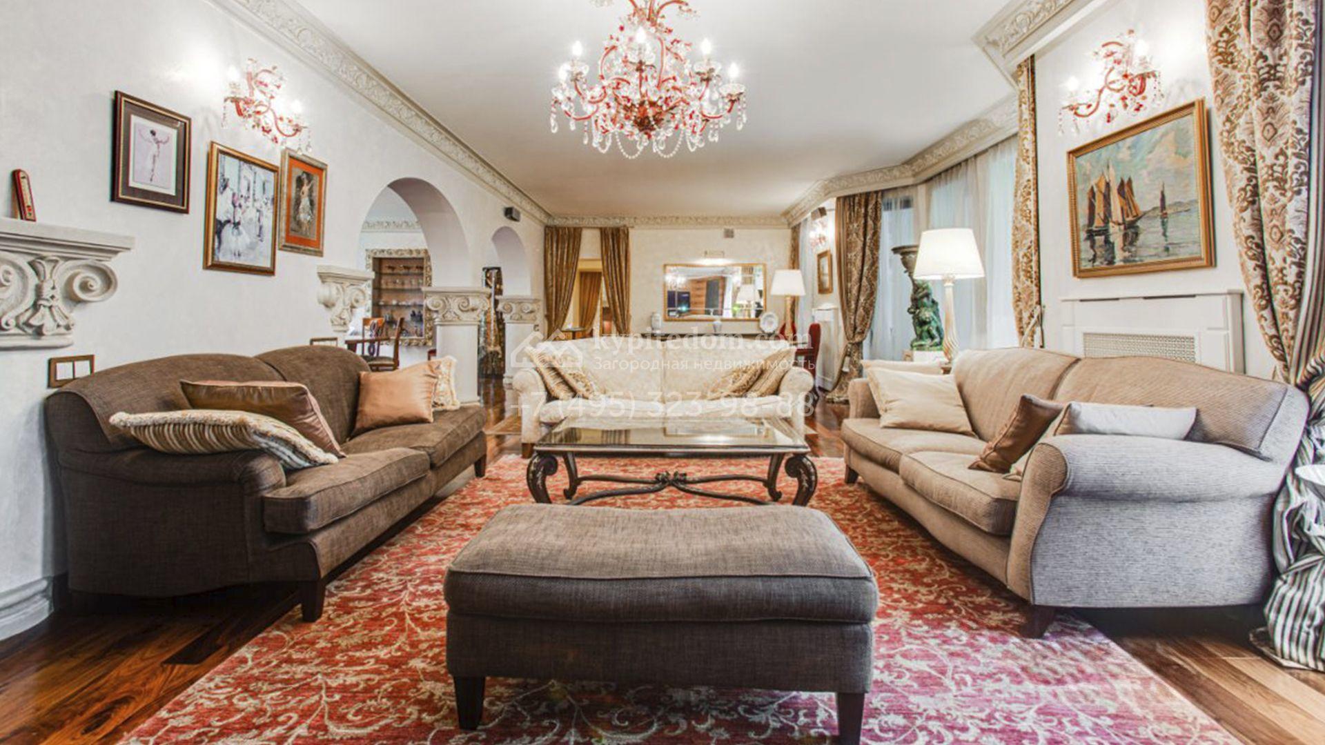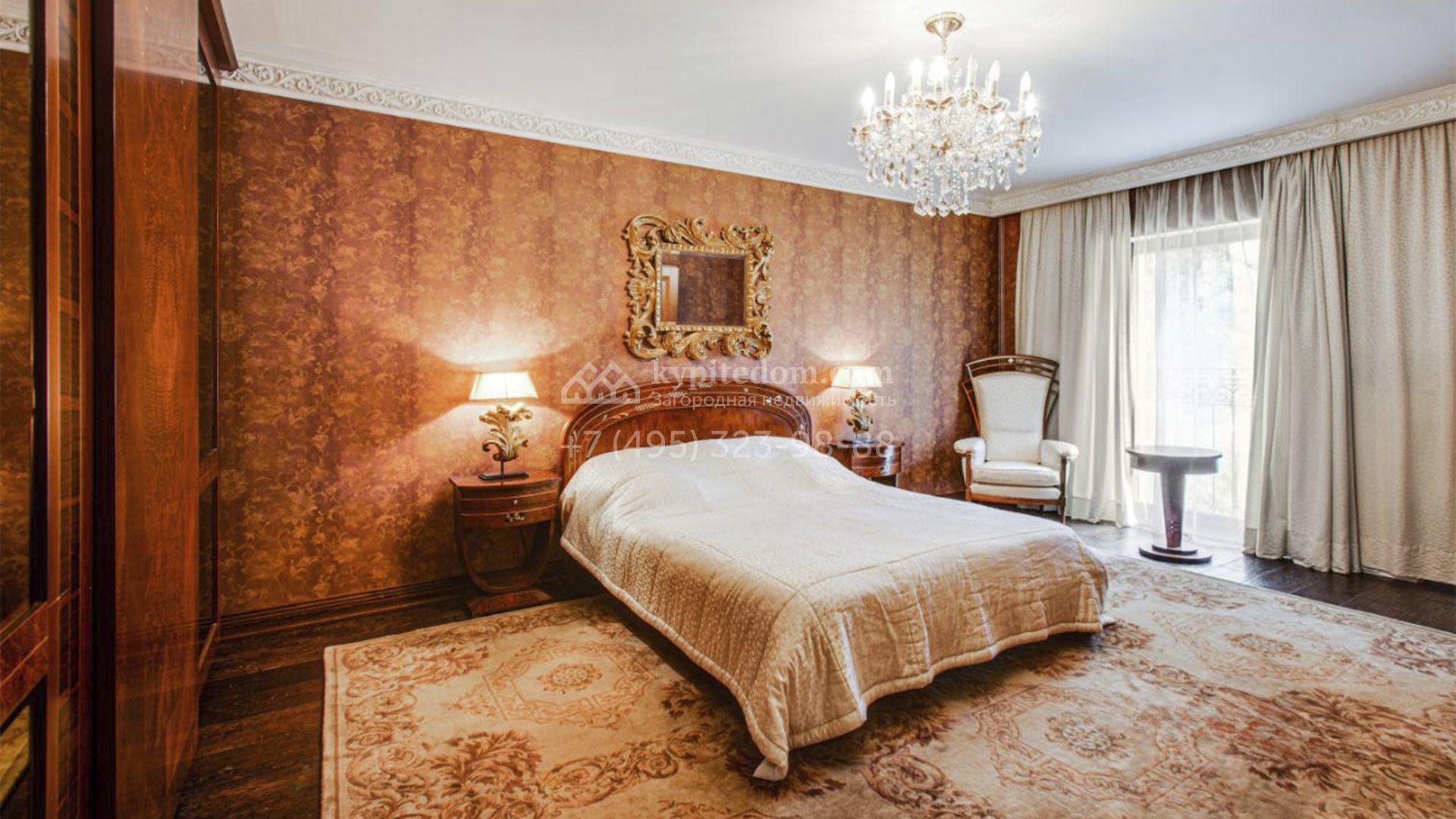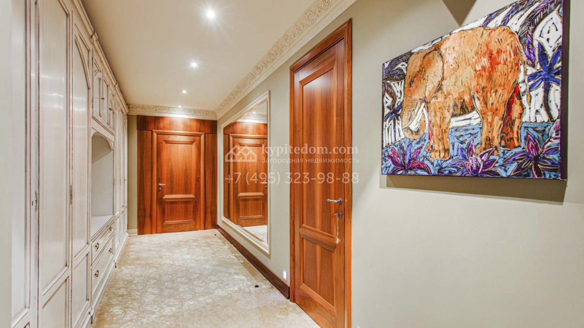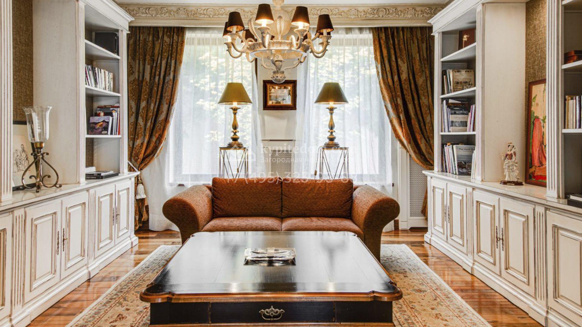 Загородная резиденция площадью 726 м² расположена на лесном участке 73 сотки. Фасад, выполненный в неоклассическом стиле, облицован кирпичом, коралловой штукатуркой и плиткой с фактурой камня, а также украшен изящной рустовкой, мозаикой и подсветкой, подчеркивающей архитектуру в вечерние часы. Панорамное остекление создает ощущение гармонии с природой и наполняет внутренние пространства светом. Интерьеры выдержаны в спокойных тонах, отделаны с использованием высококачественных натуральных материалов и дополнены классическими элементами — элегантными колоннами и лепниной на карнизах. Коттедж укомплектован мебелью от ведущих производителей, современной бытовой техникой и сантехникой. Система кондиционирования обеспечивает идеальный микроклимат в любое время года.