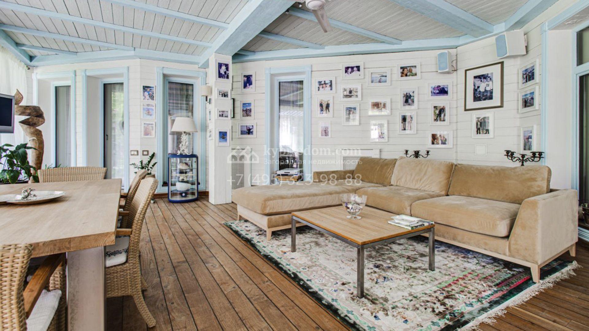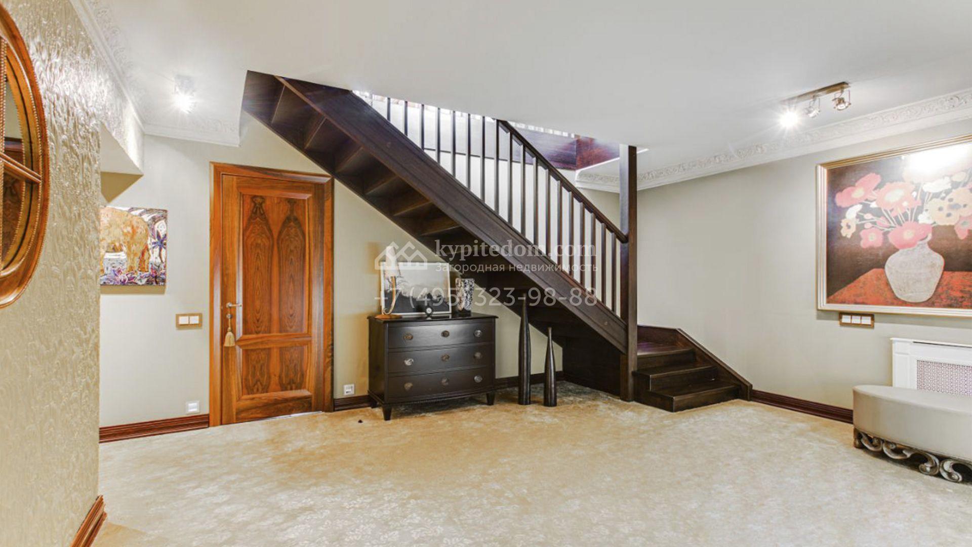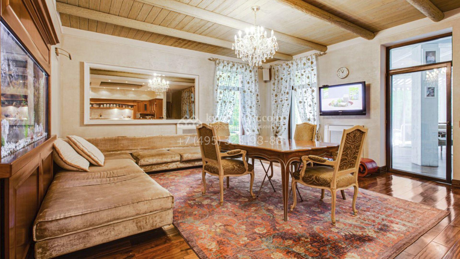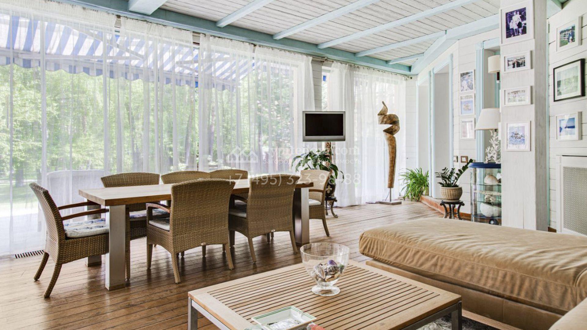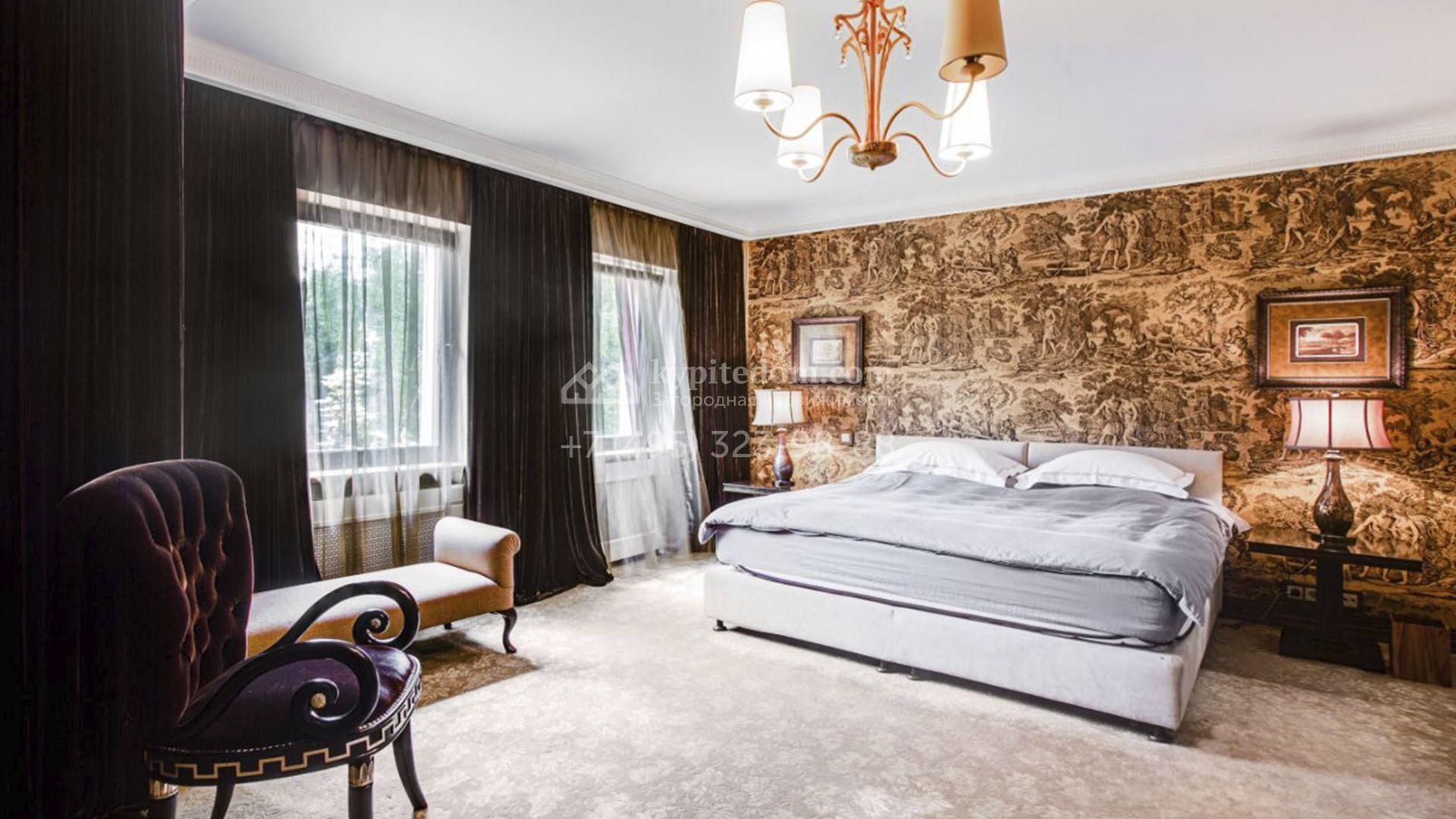 Загородная резиденция площадью 726 м² расположена на лесном участке 73 сотки. Фасад, выполненный в неоклассическом стиле, облицован кирпичом, коралловой штукатуркой и плиткой с фактурой камня, а также украшен изящной рустовкой, мозаикой и подсветкой, подчеркивающей архитектуру в вечерние часы. Панорамное остекление создает ощущение гармонии с природой и наполняет внутренние пространства светом. Интерьеры выдержаны в спокойных тонах, отделаны с использованием высококачественных натуральных материалов и дополнены классическими элементами — элегантными колоннами и лепниной на карнизах. Коттедж укомплектован мебелью от ведущих производителей, современной бытовой техникой и сантехникой. Система кондиционирования обеспечивает идеальный микроклимат в любое время года.