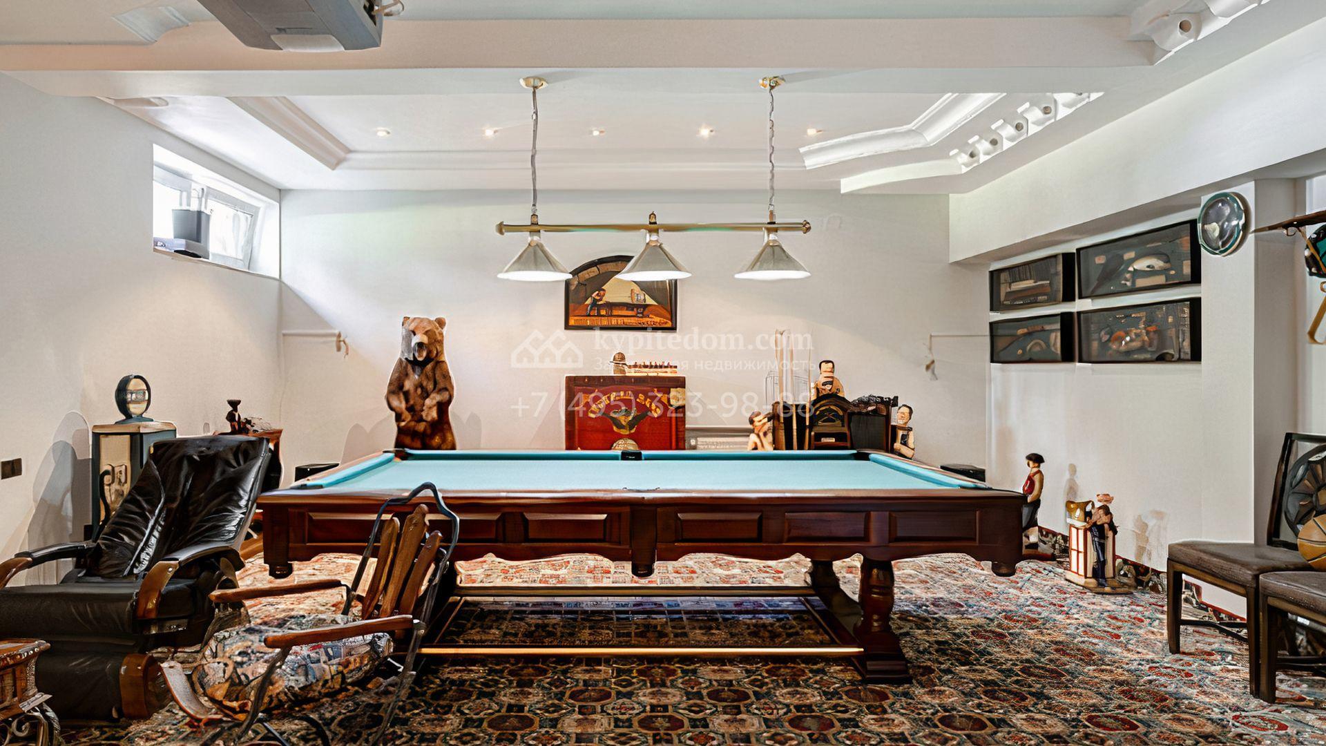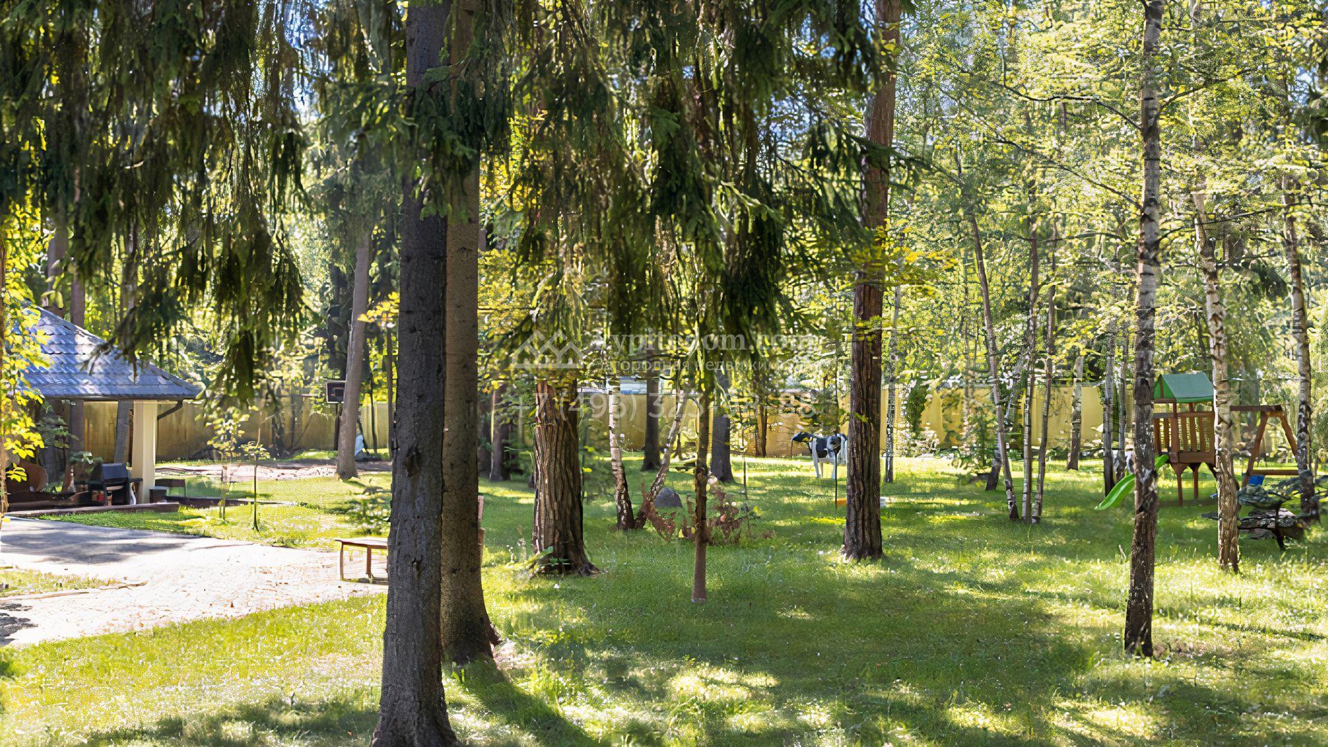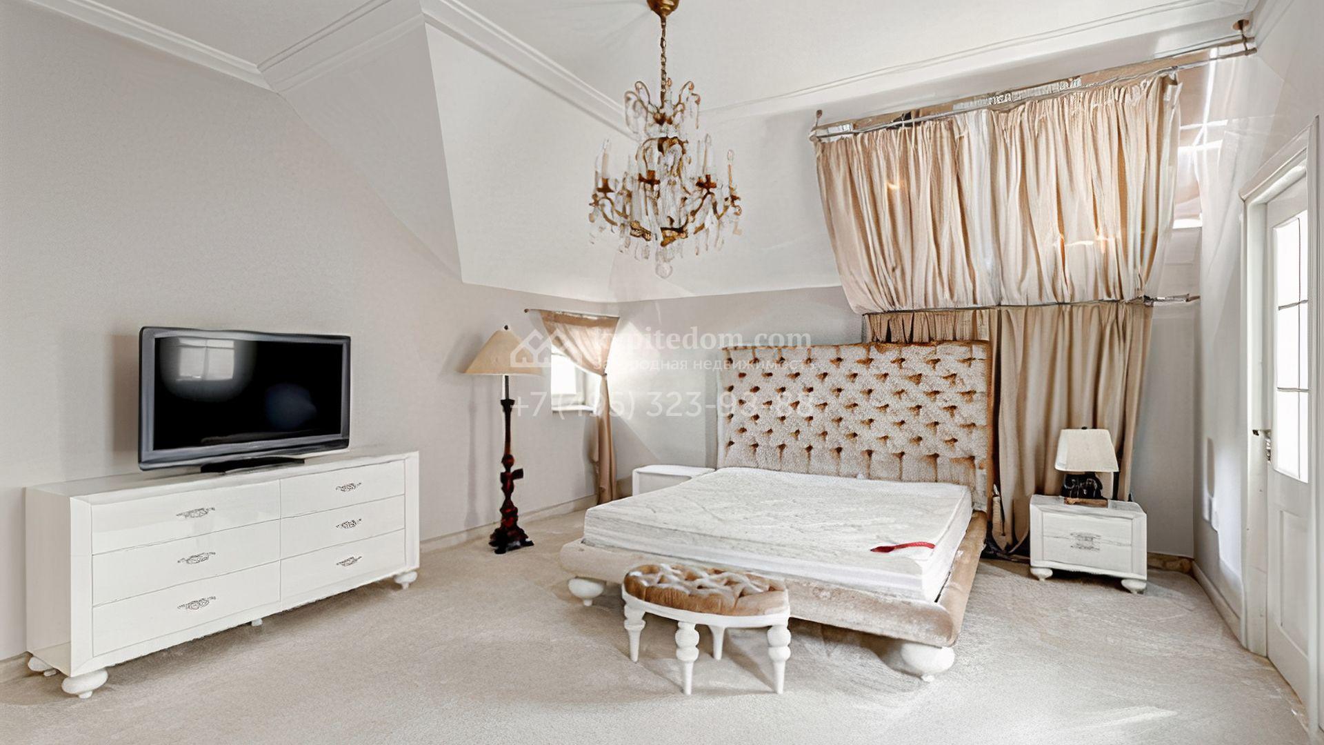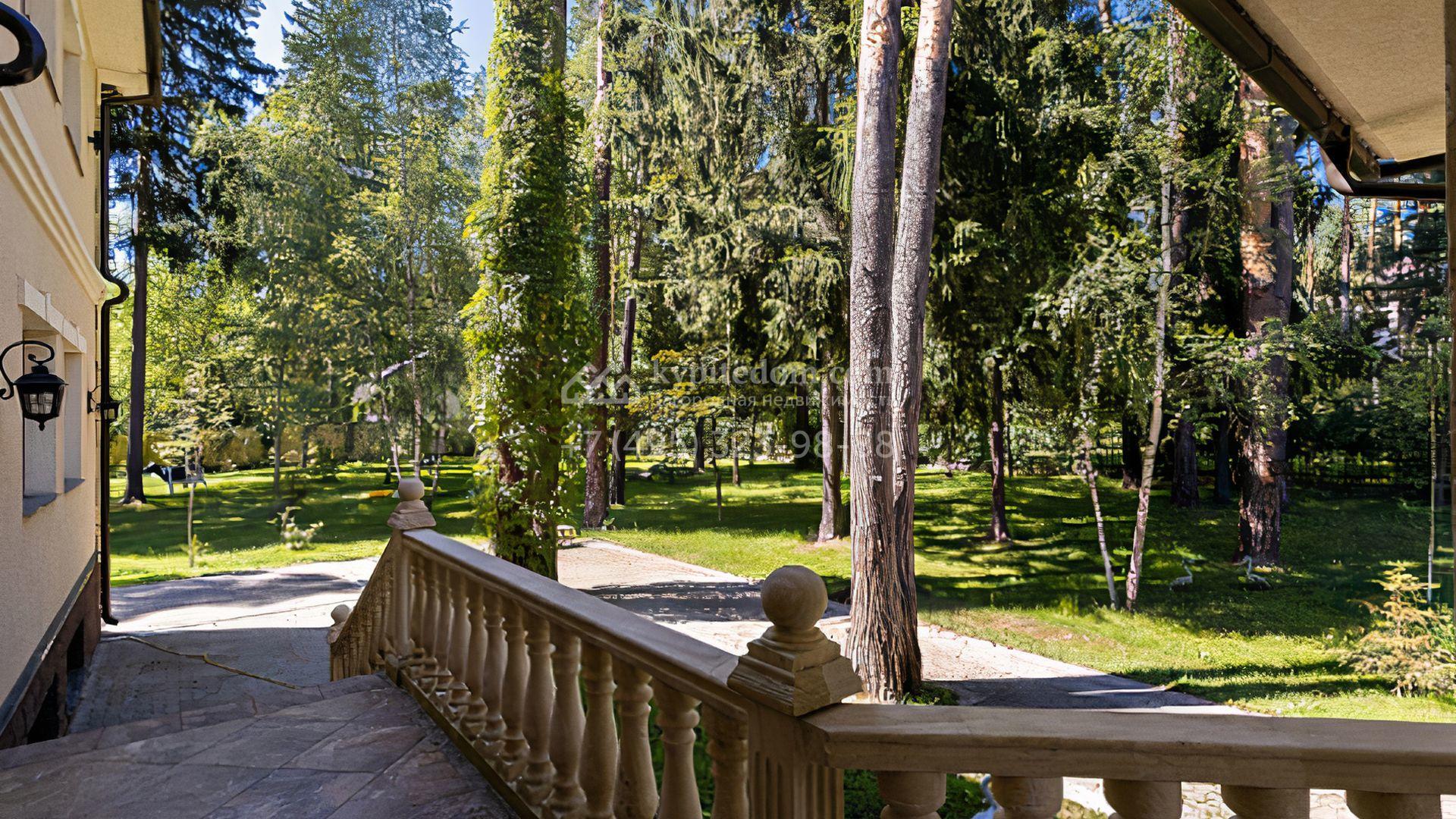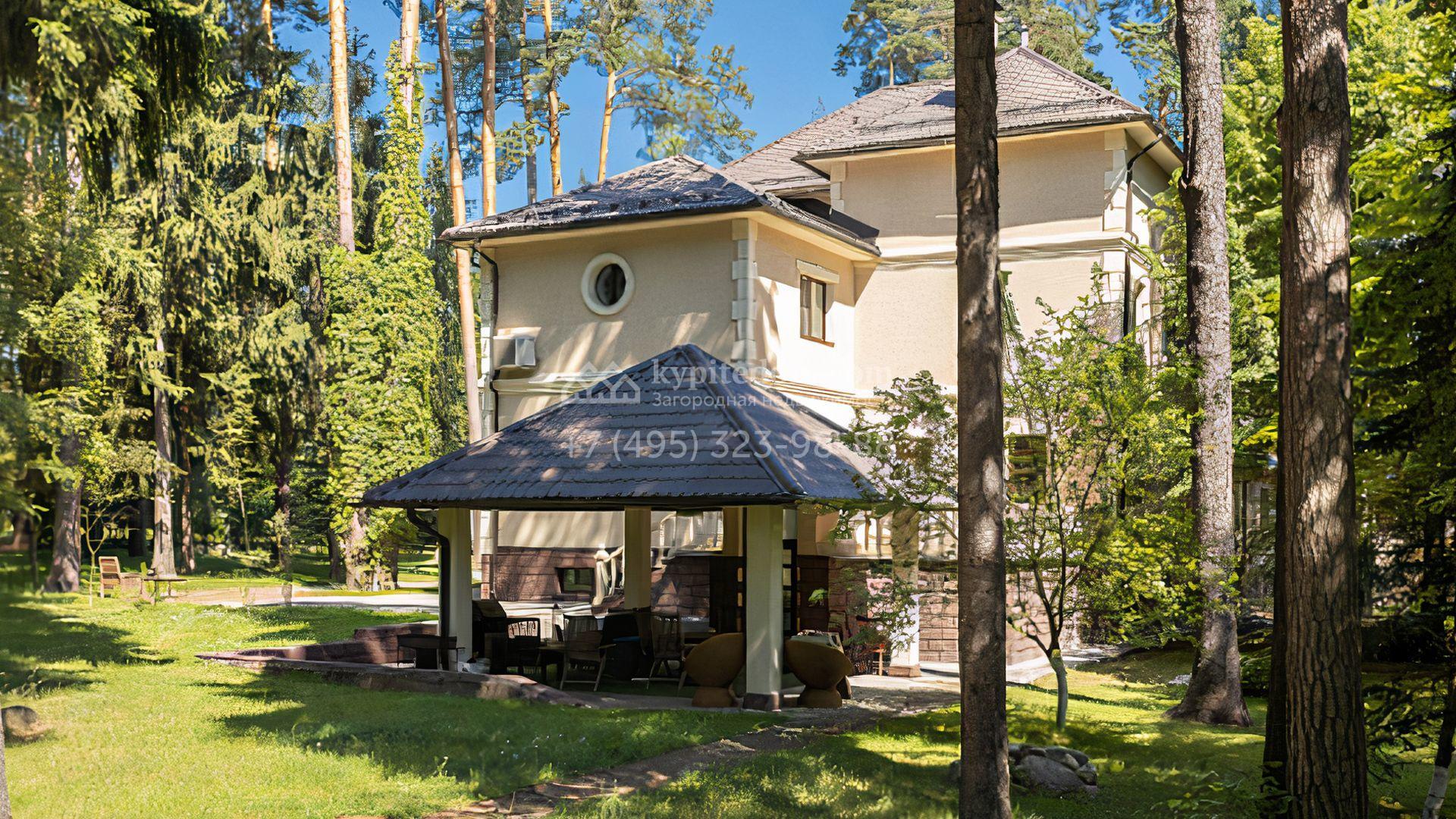 Загородный особняк площадью 860 м² построен на просторном лесном участке 43 сотки с соснами. Фасад в классическом стиле облицован бежевой штукатуркой, декорирован колоннами, балясинами и подсветкой. Интерьер оформлен в светлых теплых оттенках. В коттедже разместили 5 спален, гостиную с камином, из которой можно попасть на террасу, кухню-столовую, кабинет, рабочую кухню, бассейн с выходом на участок, тренажерный зал, сауну и бильярдную. На участке с ландшафтным дизайном вымощены дорожки, оборудованы детская площадка и зона барбекю, засеян газон.