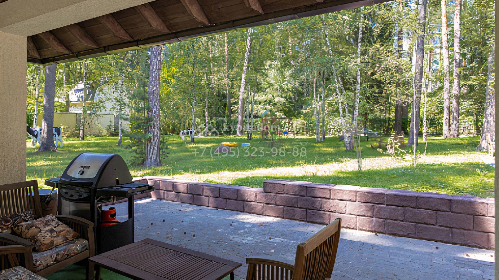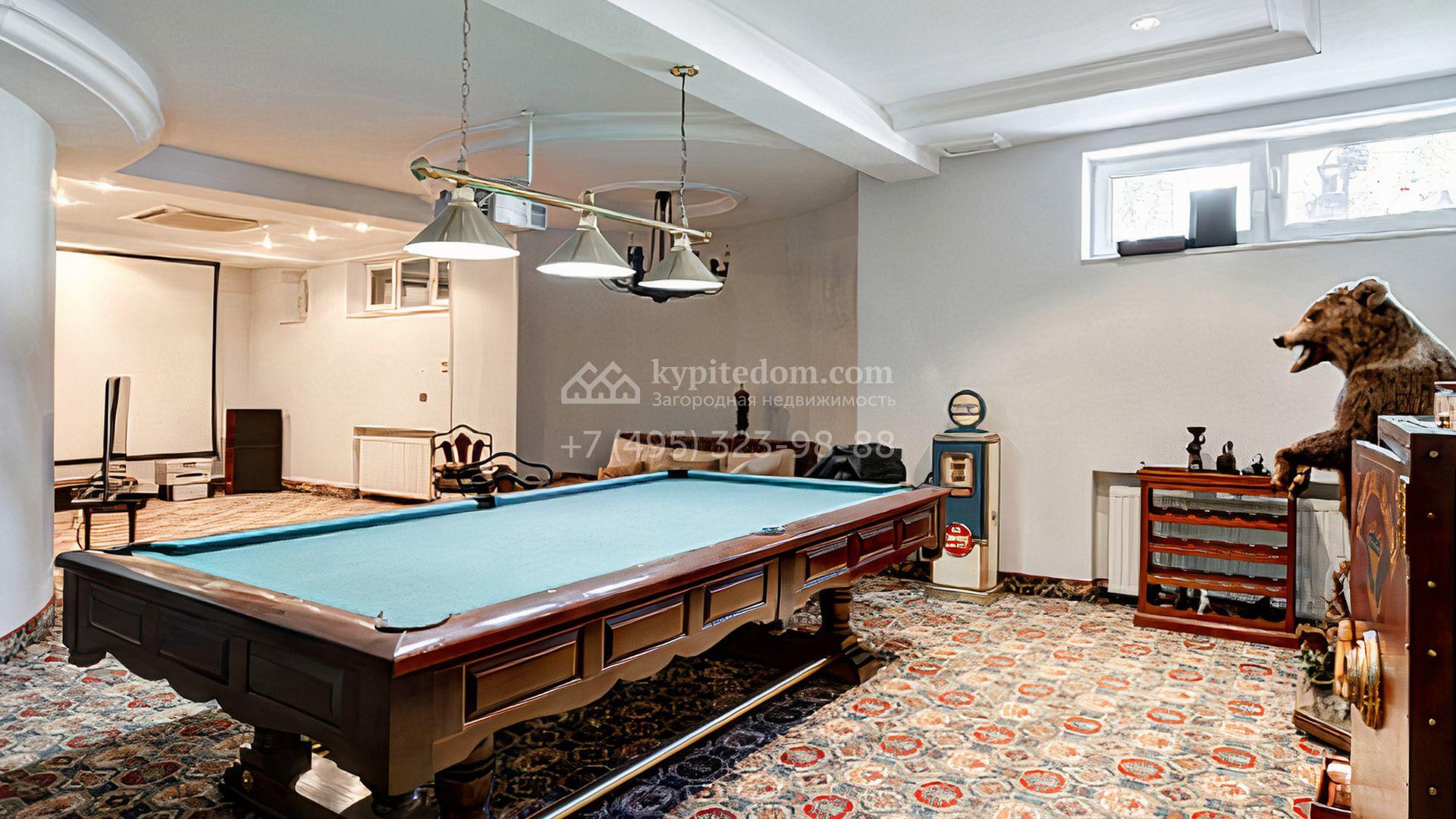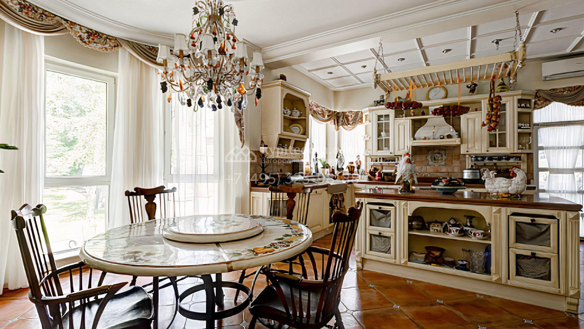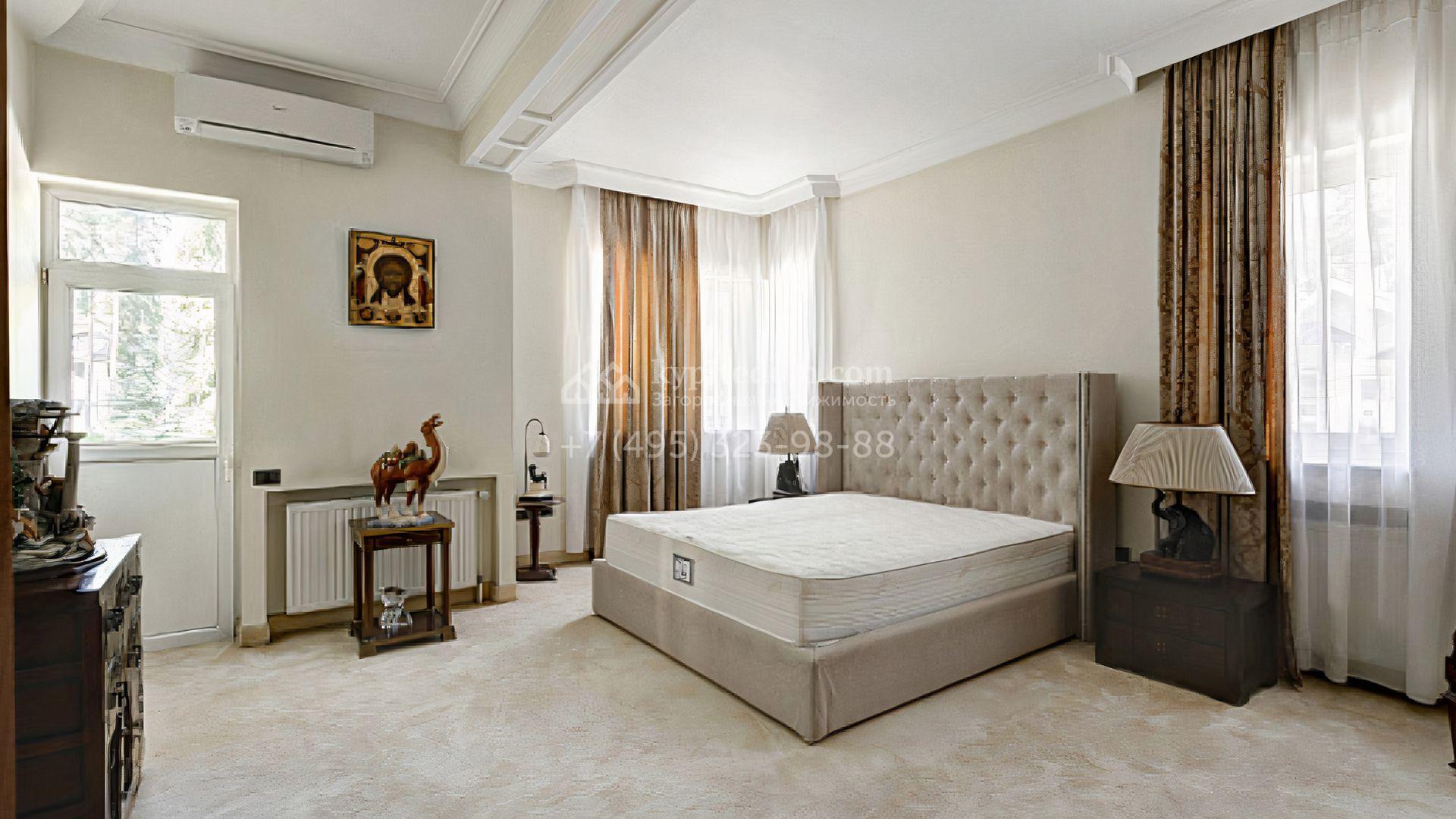 Загородный особняк площадью 860 м² построен на просторном лесном участке 43 сотки с соснами. Фасад в классическом стиле облицован бежевой штукатуркой, декорирован колоннами, балясинами и подсветкой. Интерьер оформлен в светлых теплых оттенках. В коттедже разместили 5 спален, гостиную с камином, из которой можно попасть на террасу, кухню-столовую, кабинет, рабочую кухню, бассейн с выходом на участок, тренажерный зал, сауну и бильярдную. На участке с ландшафтным дизайном вымощены дорожки, оборудованы детская площадка и зона барбекю, засеян газон.