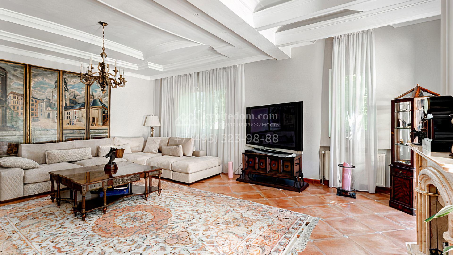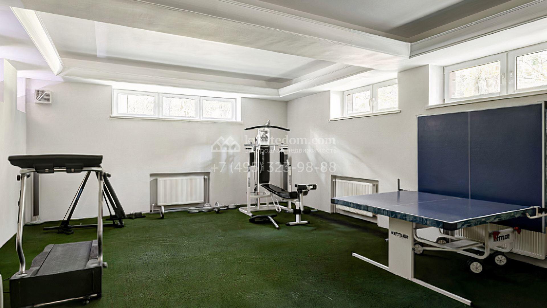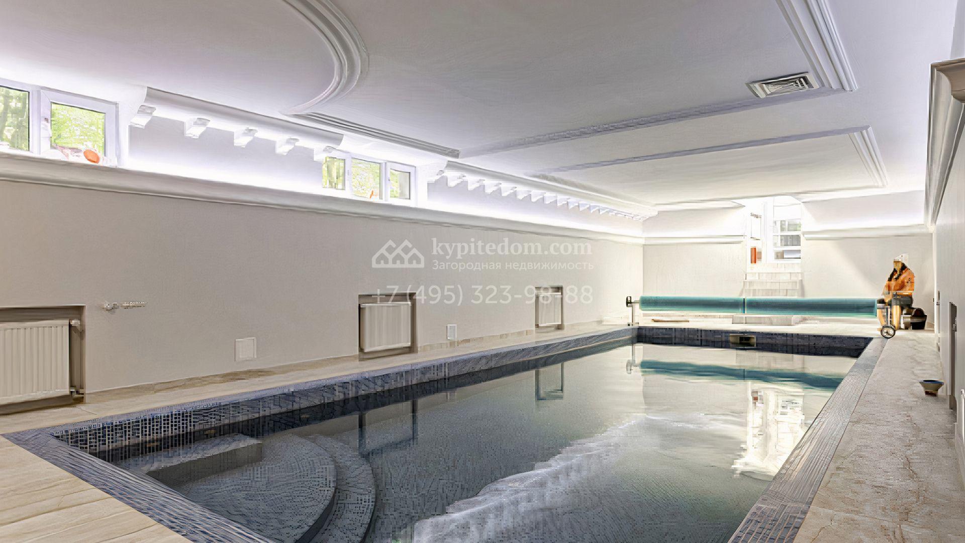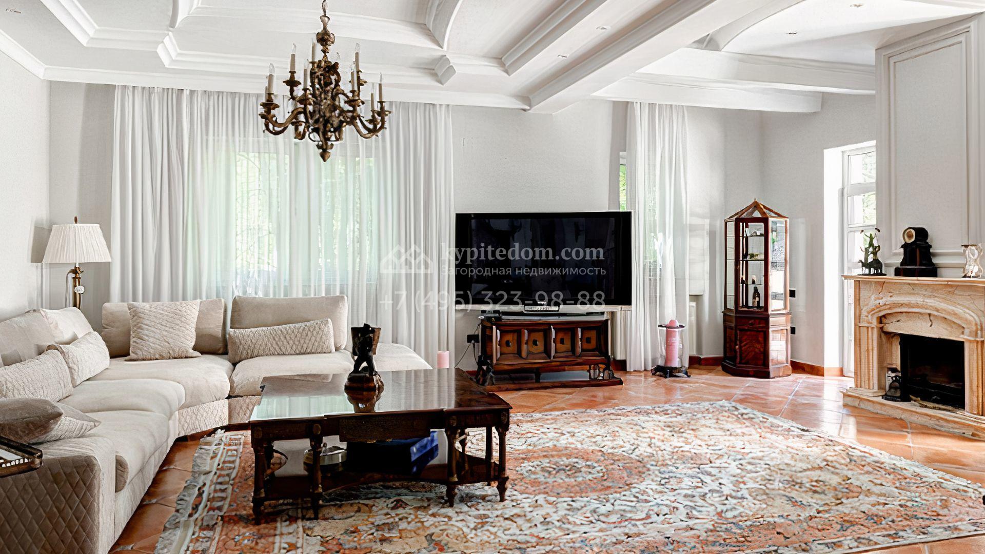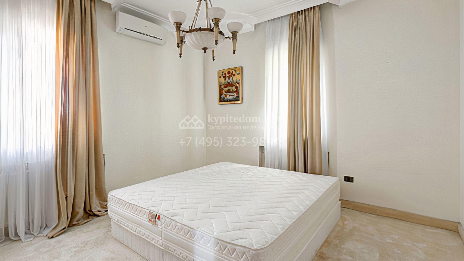 Загородный особняк площадью 860 м² построен на просторном лесном участке 43 сотки с соснами. Фасад в классическом стиле облицован бежевой штукатуркой, декорирован колоннами, балясинами и подсветкой. Интерьер оформлен в светлых теплых оттенках. В коттедже разместили 5 спален, гостиную с камином, из которой можно попасть на террасу, кухню-столовую, кабинет, рабочую кухню, бассейн с выходом на участок, тренажерный зал, сауну и бильярдную. На участке с ландшафтным дизайном вымощены дорожки, оборудованы детская площадка и зона барбекю, засеян газон.