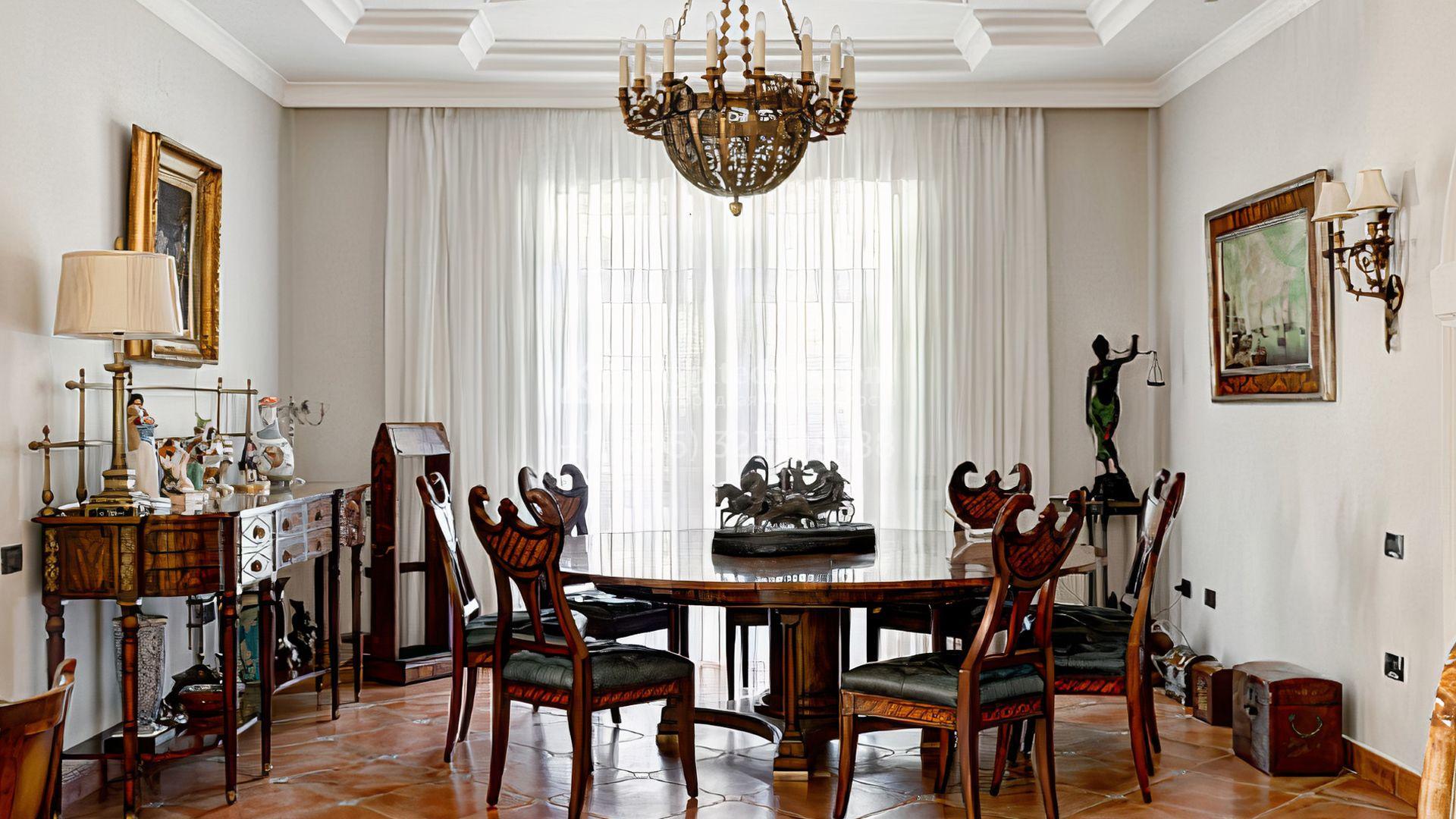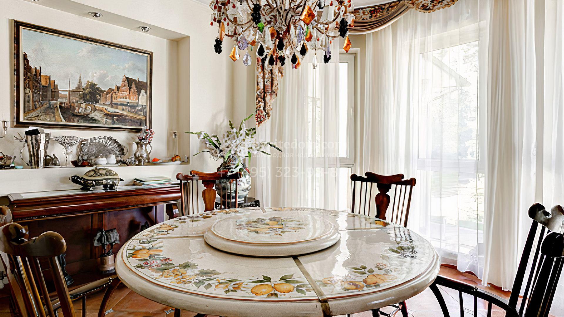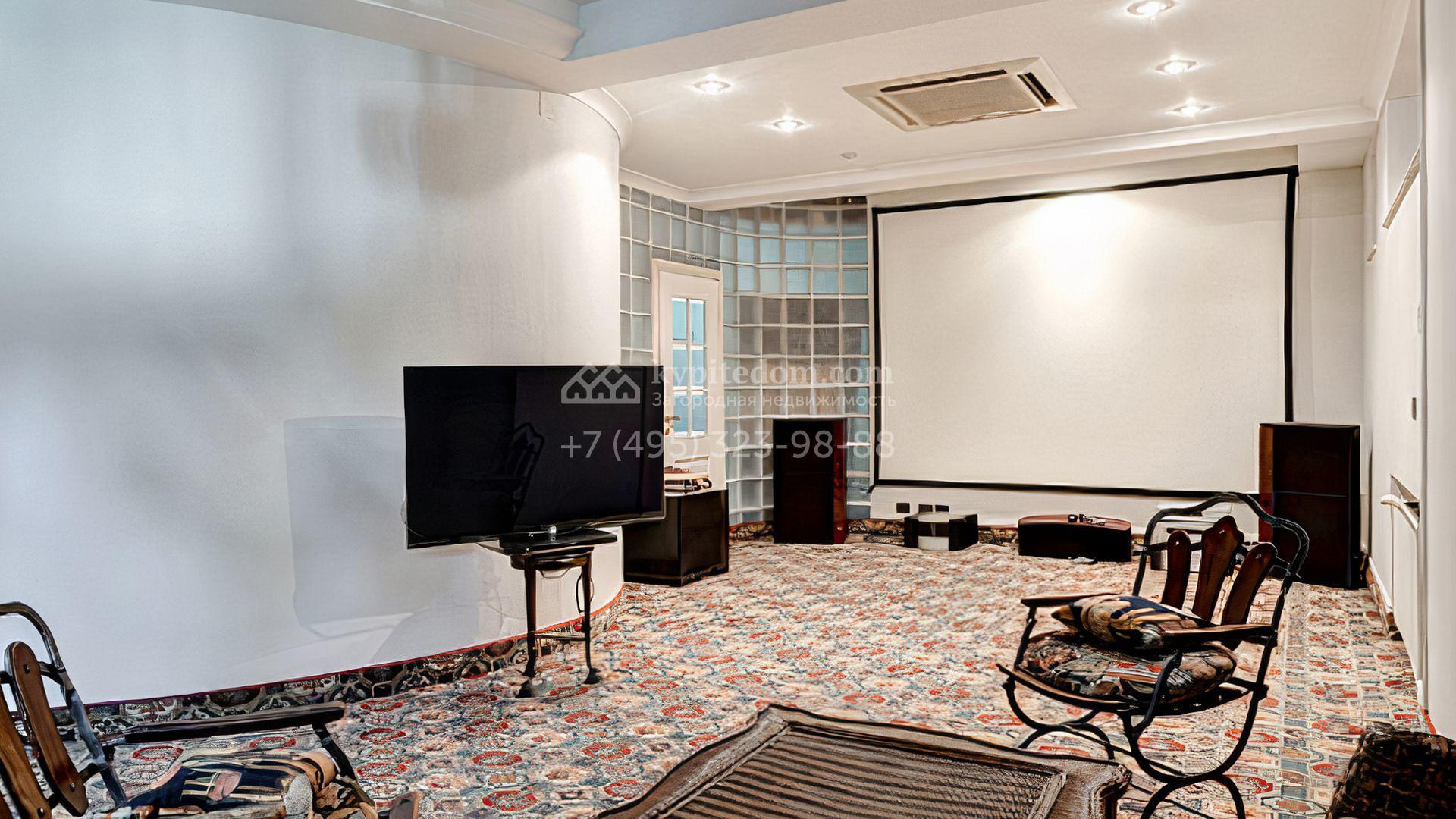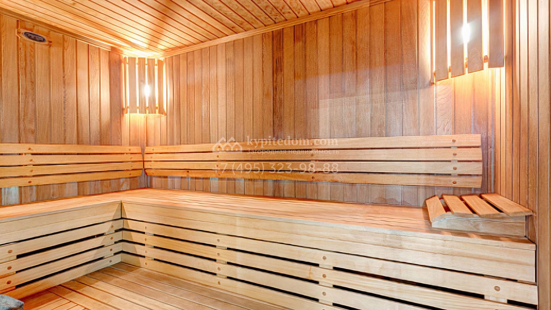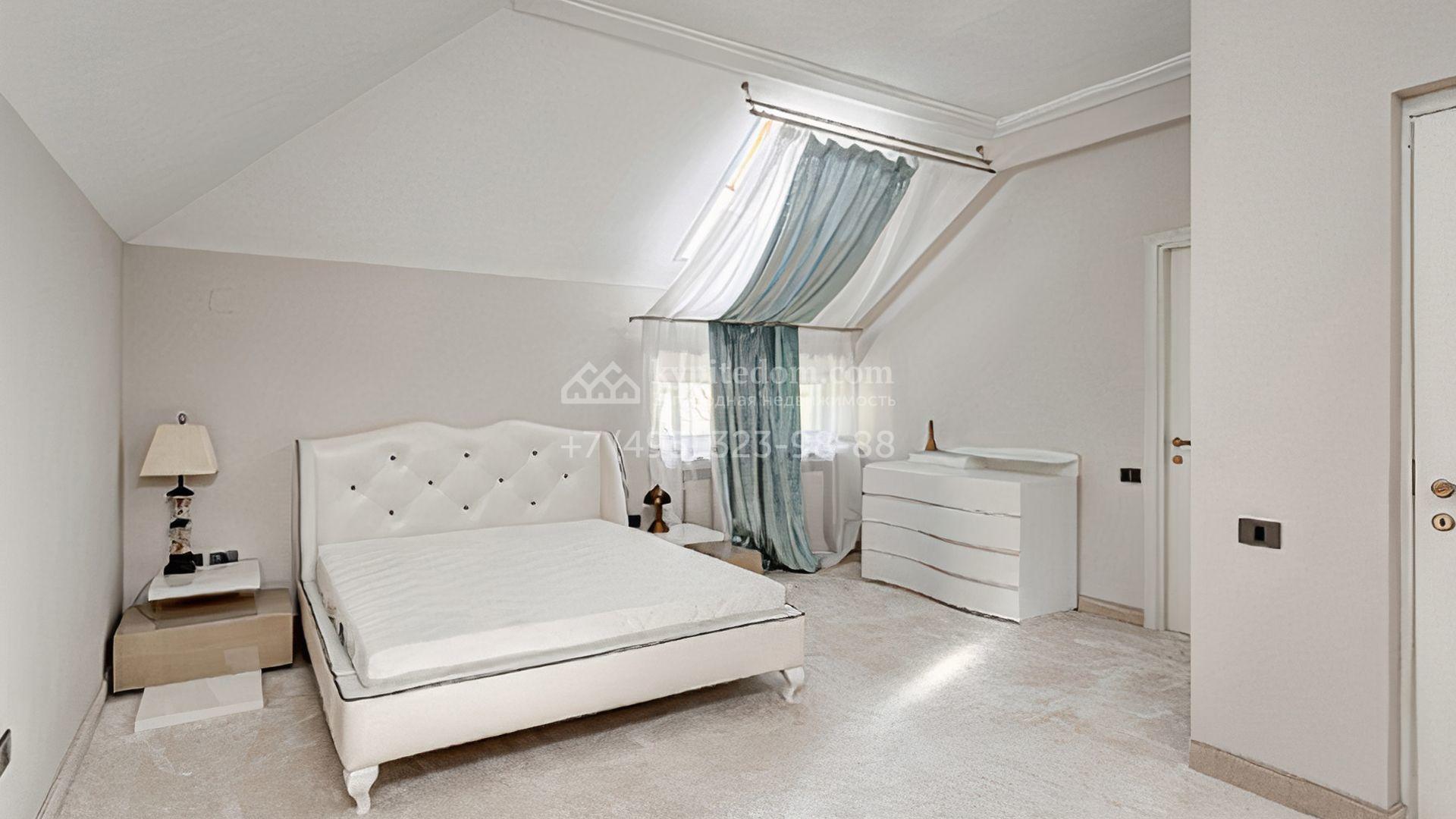 Загородный особняк площадью 860 м² построен на просторном лесном участке 43 сотки с соснами. Фасад в классическом стиле облицован бежевой штукатуркой, декорирован колоннами, балясинами и подсветкой. Интерьер оформлен в светлых теплых оттенках. В коттедже разместили 5 спален, гостиную с камином, из которой можно попасть на террасу, кухню-столовую, кабинет, рабочую кухню, бассейн с выходом на участок, тренажерный зал, сауну и бильярдную. На участке с ландшафтным дизайном вымощены дорожки, оборудованы детская площадка и зона барбекю, засеян газон.