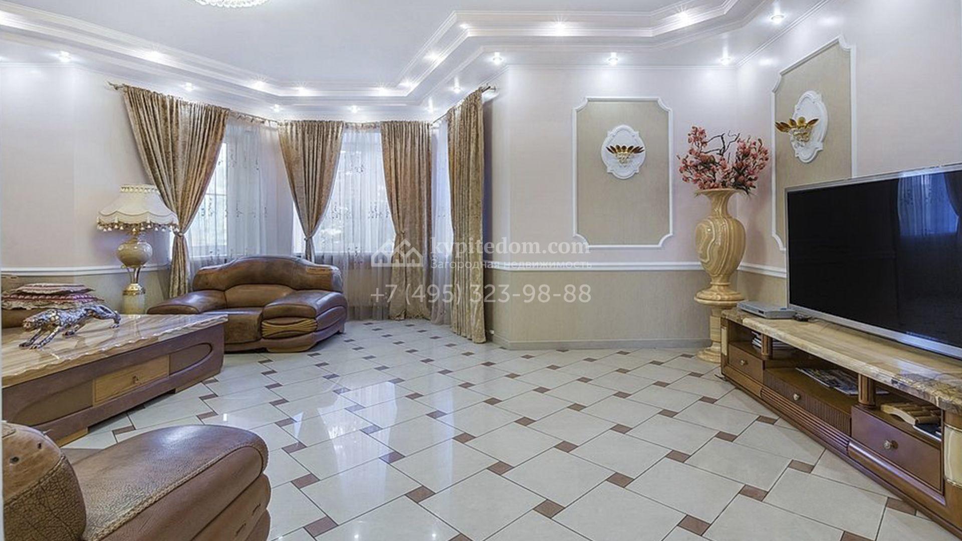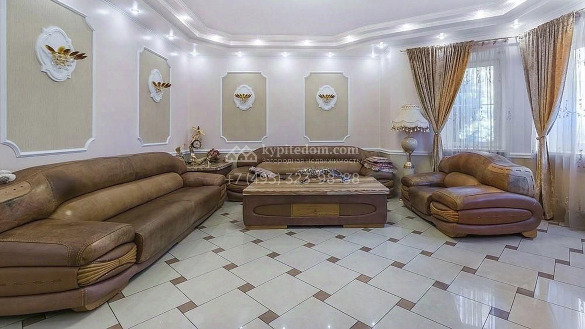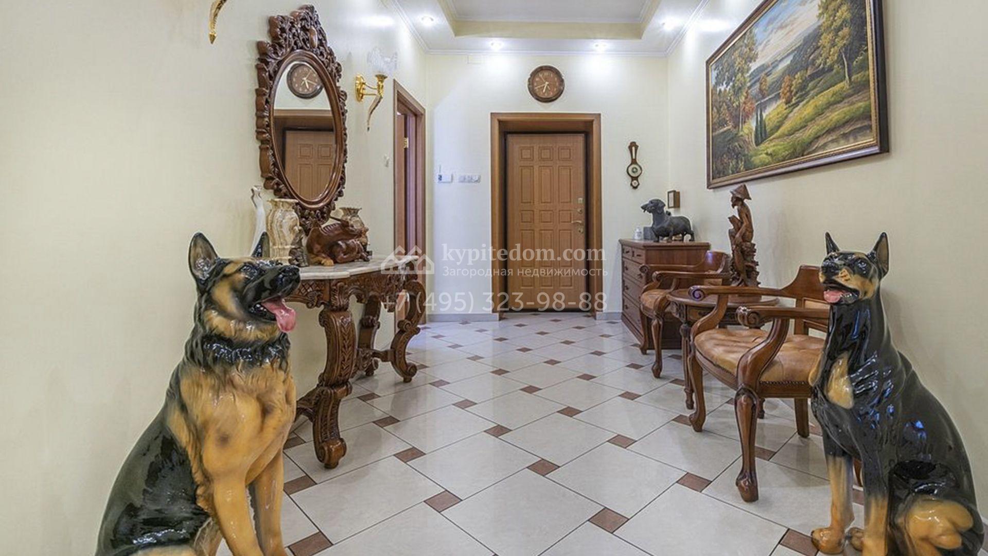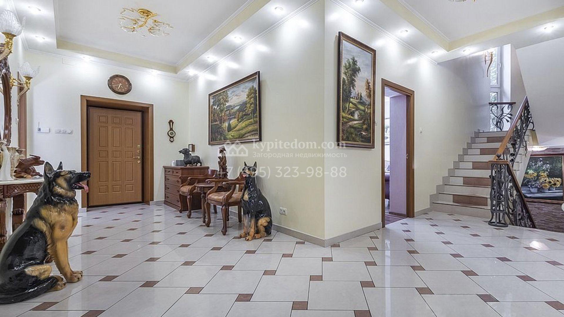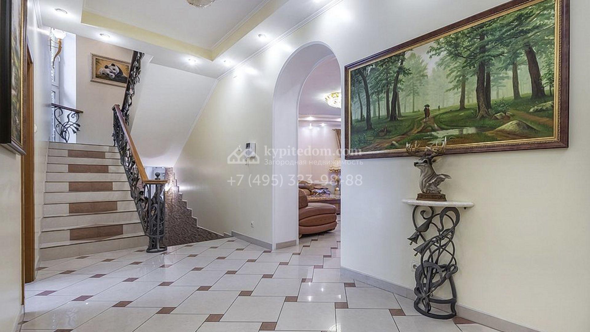 Загородный особняк площадью 718 м² расположен на прямоугольном участке 25 соток рядом с живописным лесом. Современный фасад с многоскатной крышей выполнен из кирпича и декорирован клинкером. Интерьер выдержан в спокойных тонах и дополнен итальянской и испанской мебелью, включая кожаные диваны и эксклюзивные предметы декора, такие как люстры Swarovski и оригинальные картины. Для дополнительных комфорта и безопасности в доме установлены финский котел, система очистки воды, кондиционеры и сигнализация.