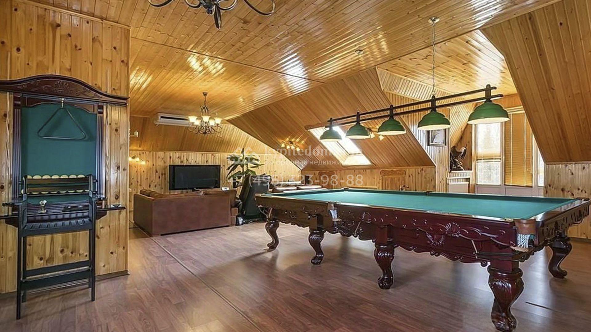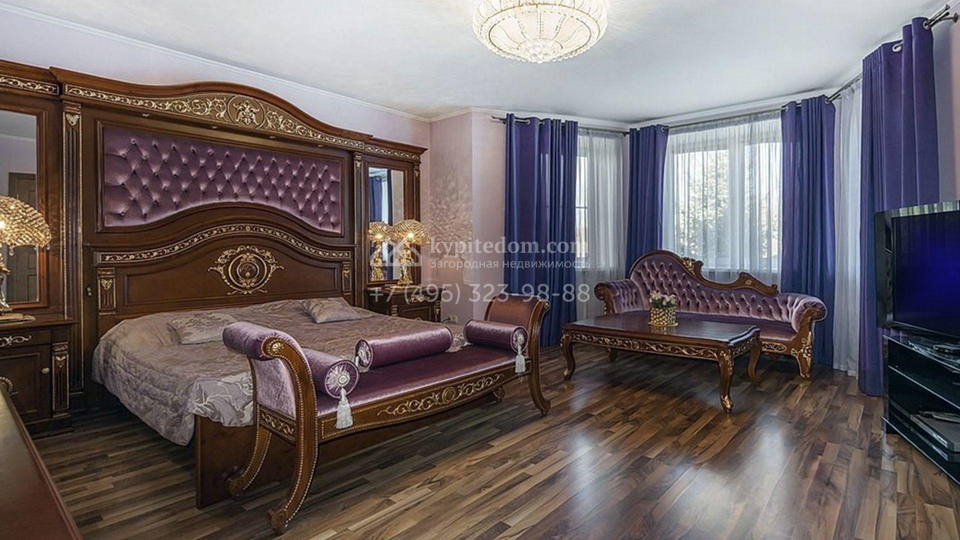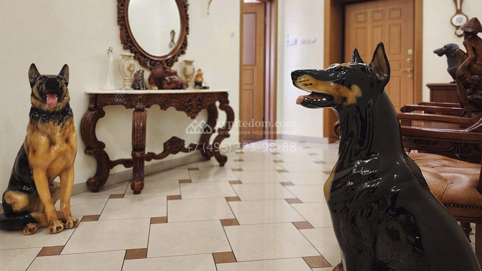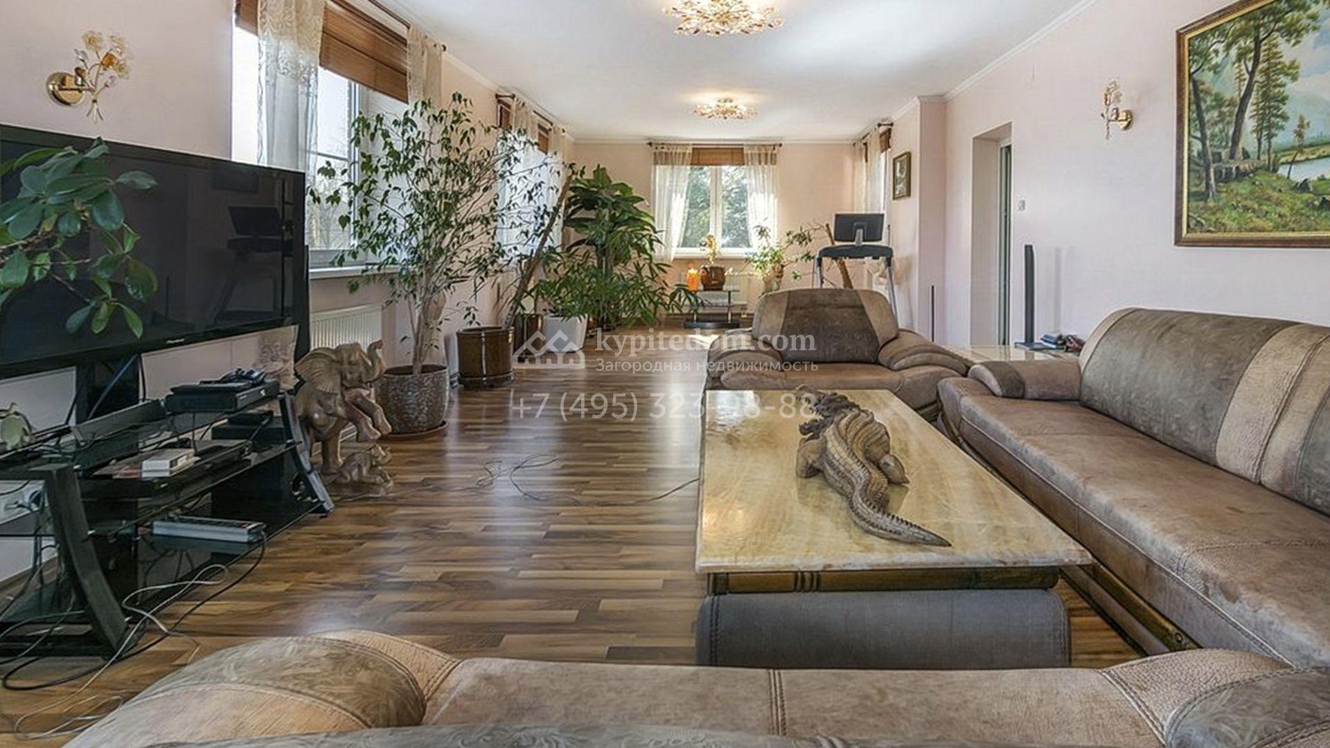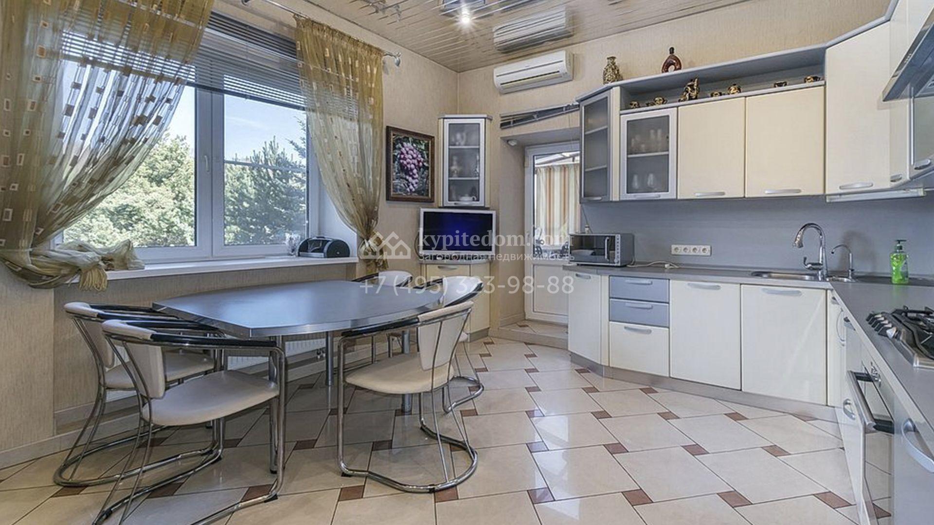 Загородный особняк площадью 718 м² расположен на прямоугольном участке 25 соток рядом с живописным лесом. Современный фасад с многоскатной крышей выполнен из кирпича и декорирован клинкером. Интерьер выдержан в спокойных тонах и дополнен итальянской и испанской мебелью, включая кожаные диваны и эксклюзивные предметы декора, такие как люстры Swarovski и оригинальные картины. Для дополнительных комфорта и безопасности в доме установлены финский котел, система очистки воды, кондиционеры и сигнализация.