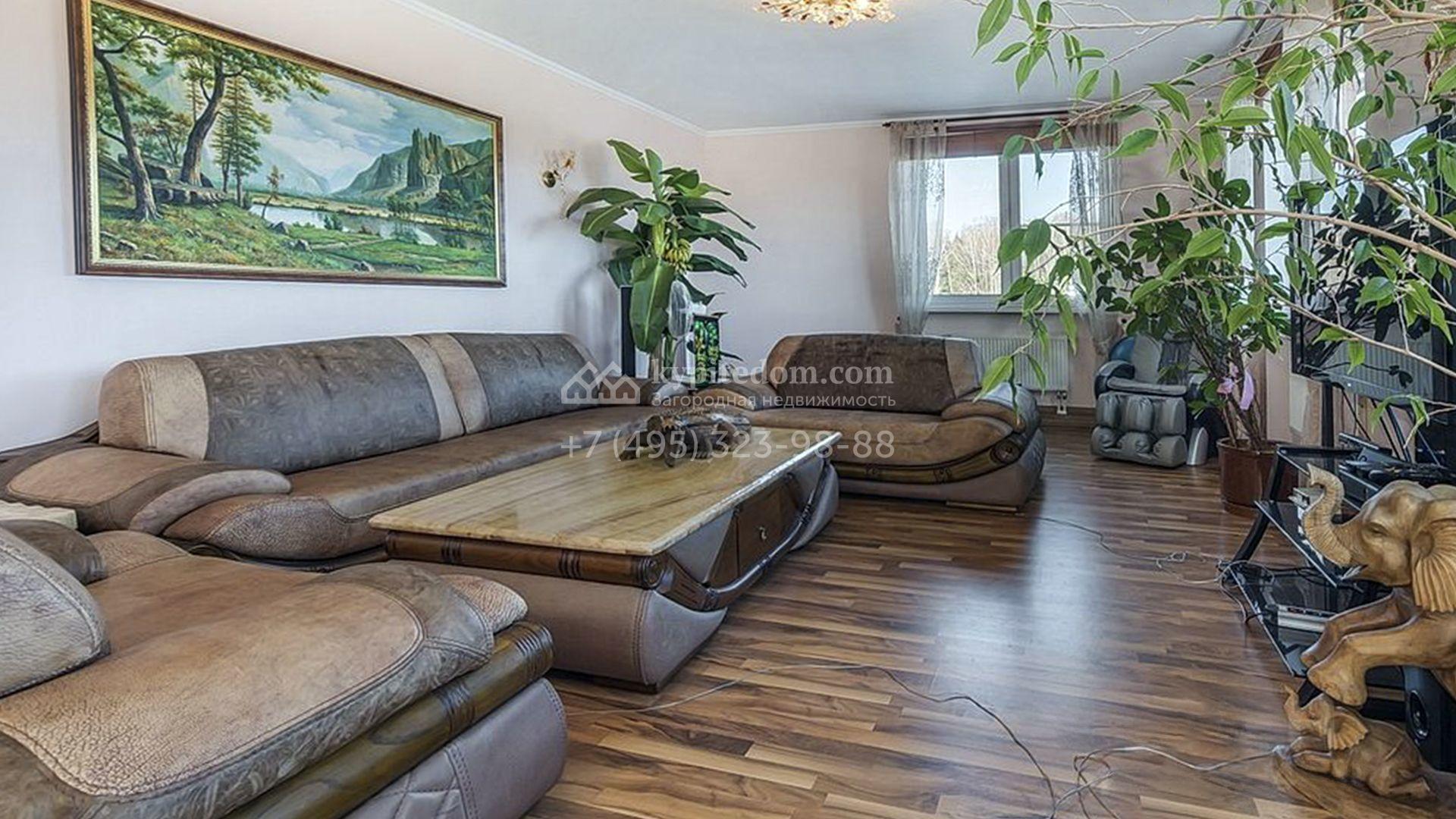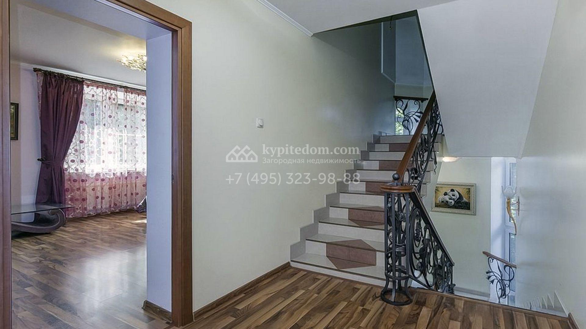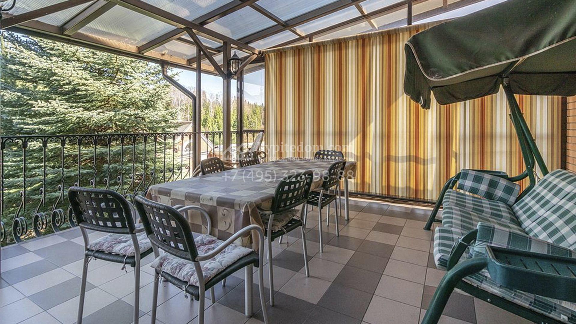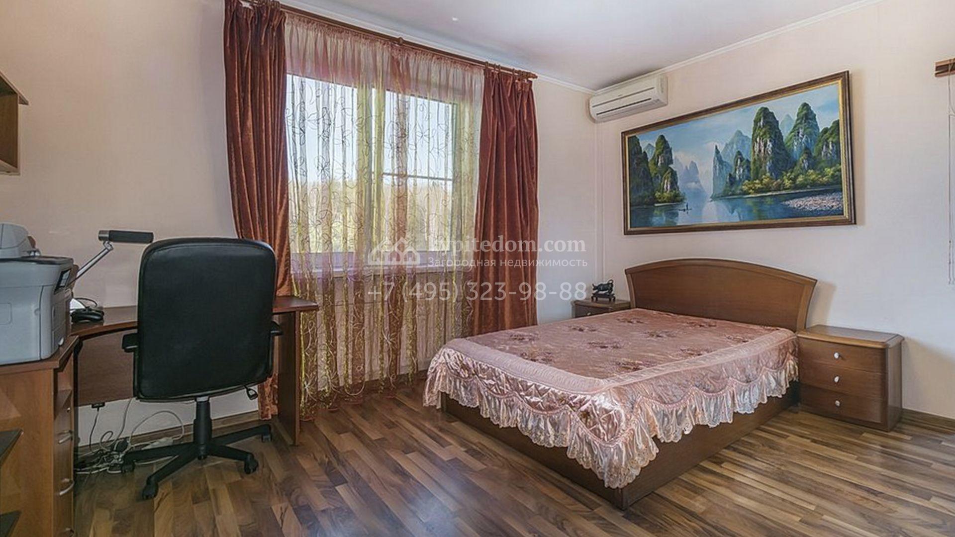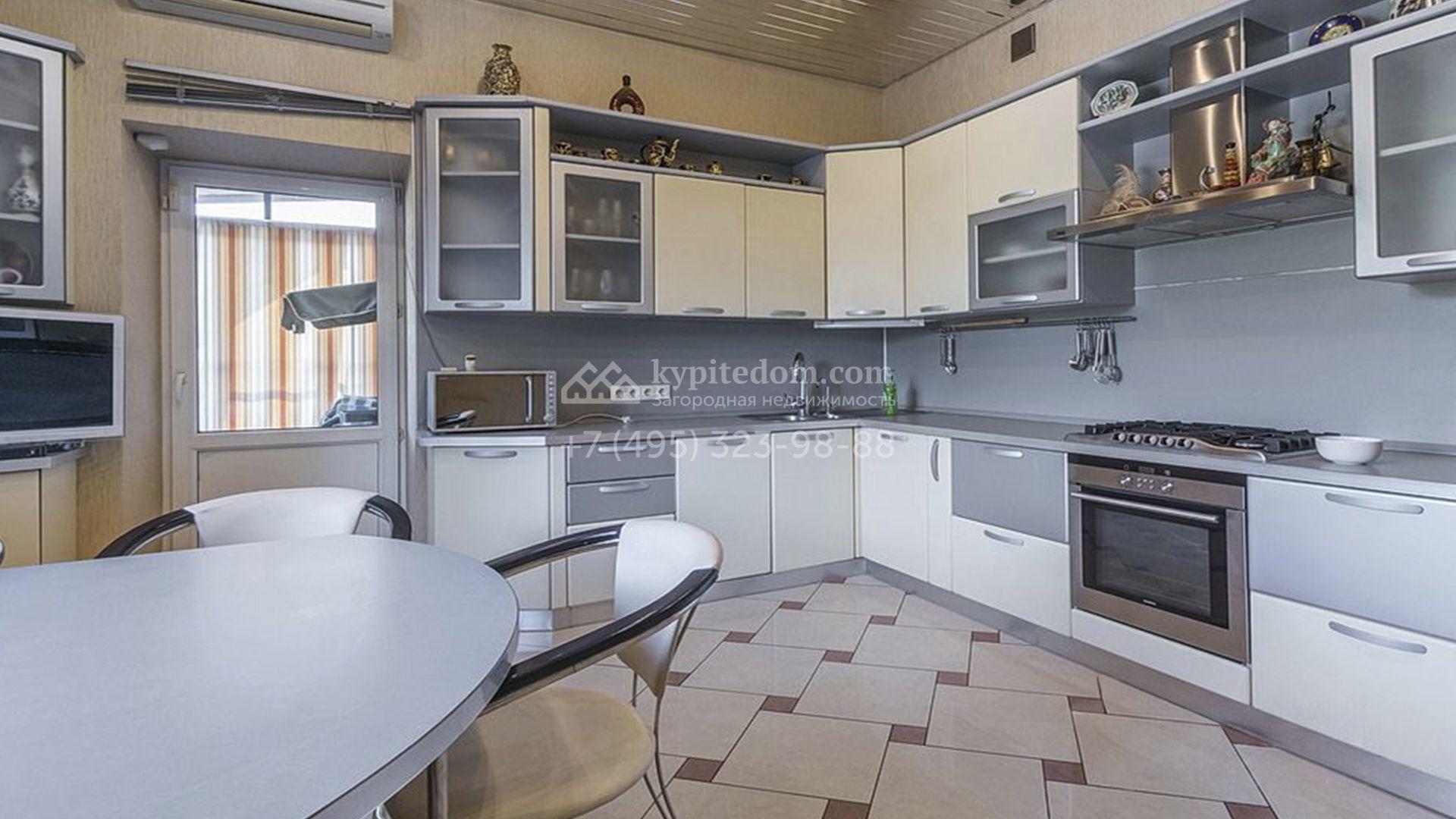 Загородный особняк площадью 718 м² расположен на прямоугольном участке 25 соток рядом с живописным лесом. Современный фасад с многоскатной крышей выполнен из кирпича и декорирован клинкером. Интерьер выдержан в спокойных тонах и дополнен итальянской и испанской мебелью, включая кожаные диваны и эксклюзивные предметы декора, такие как люстры Swarovski и оригинальные картины. Для дополнительных комфорта и безопасности в доме установлены финский котел, система очистки воды, кондиционеры и сигнализация.