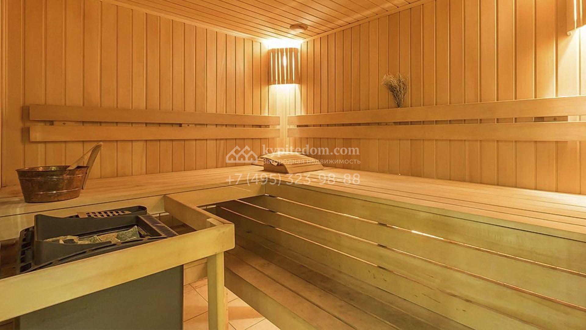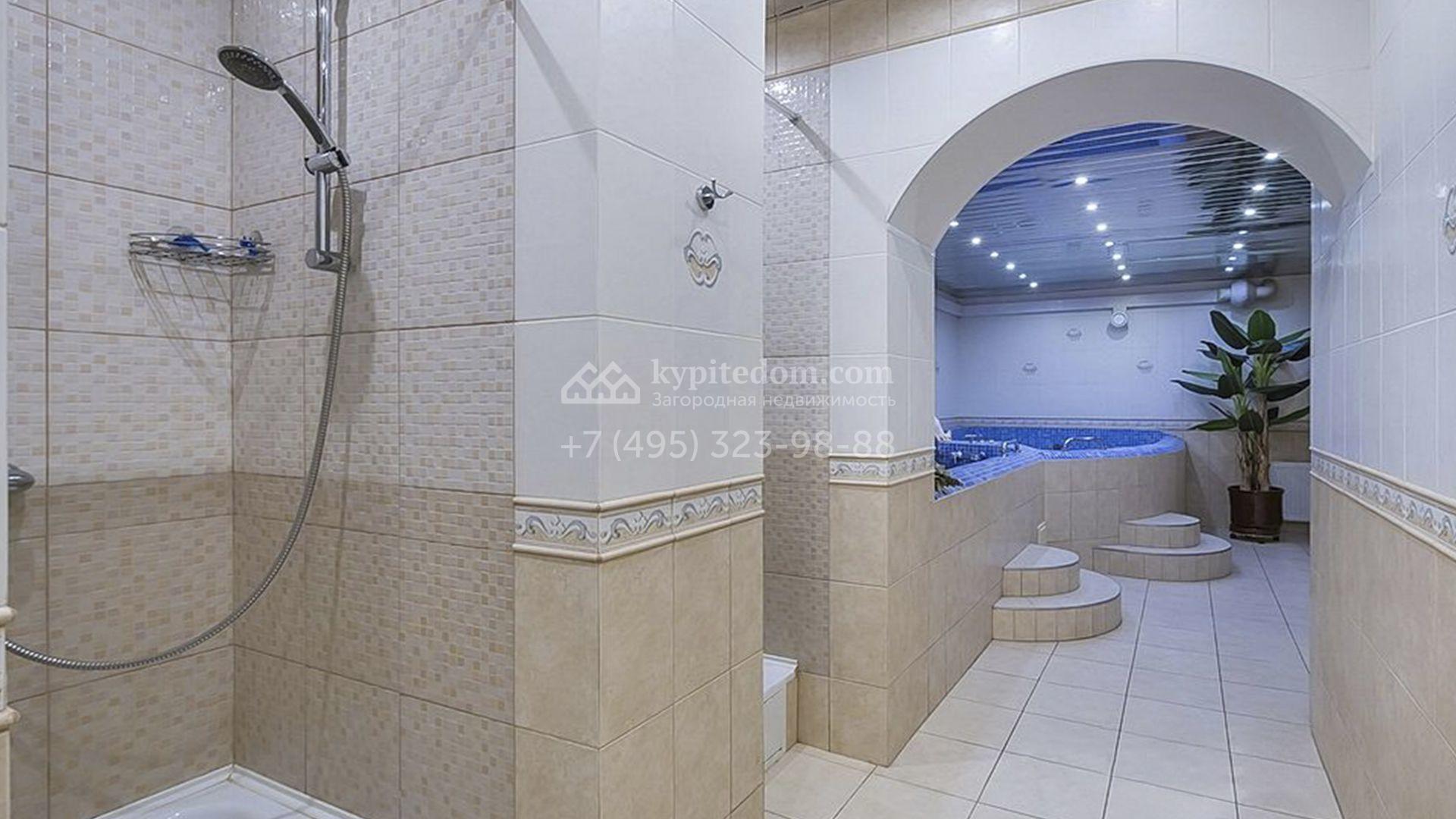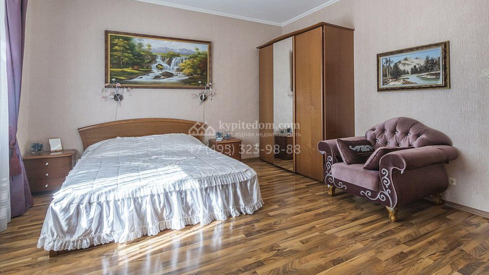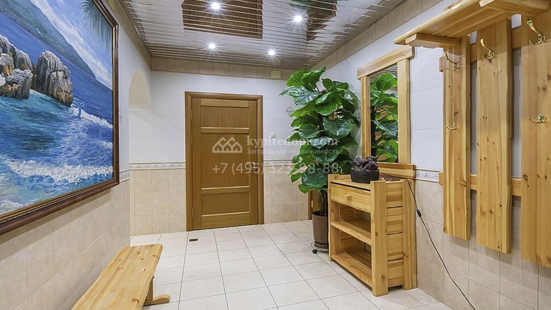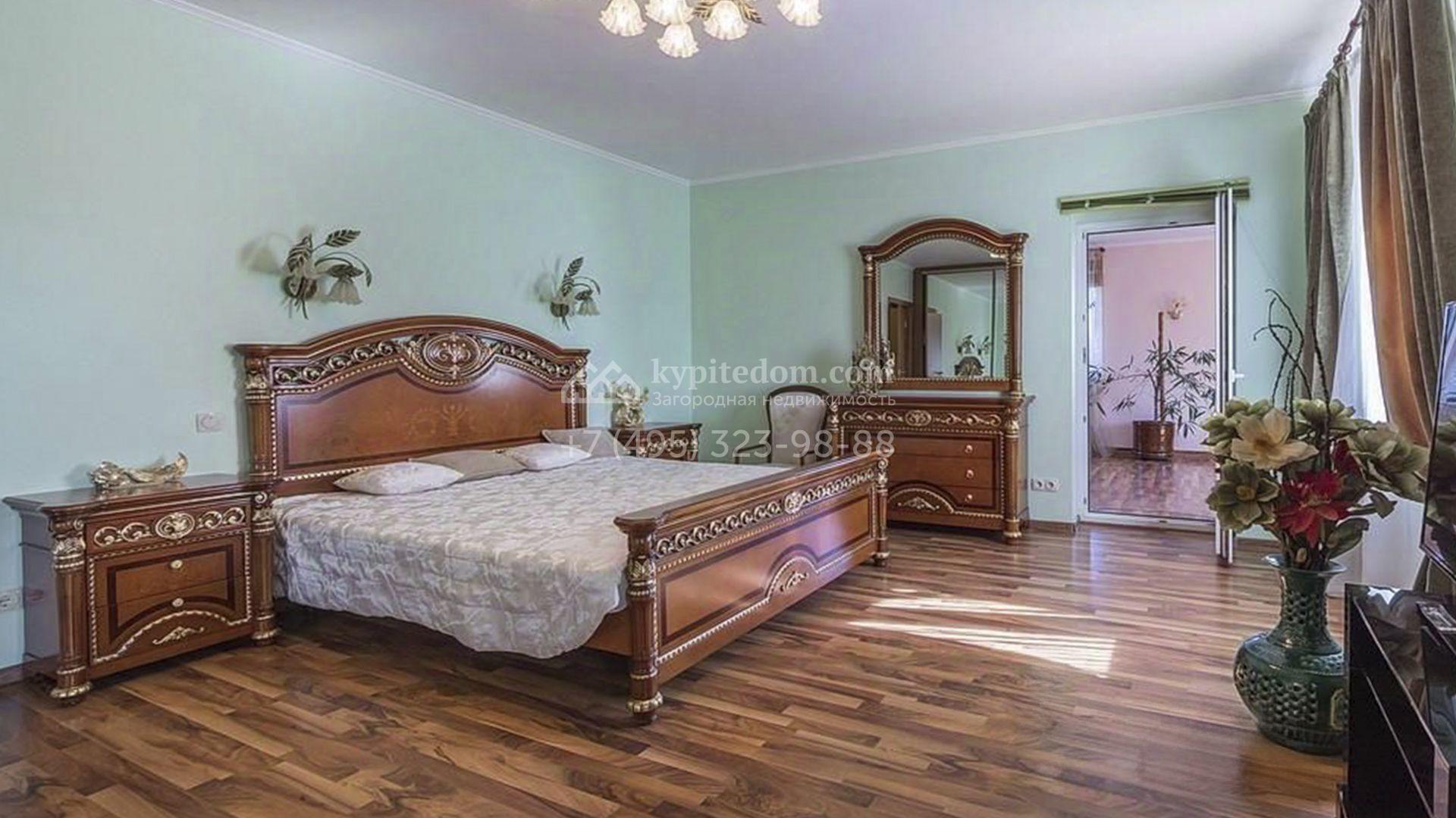 Загородный особняк площадью 718 м² расположен на прямоугольном участке 25 соток рядом с живописным лесом. Современный фасад с многоскатной крышей выполнен из кирпича и декорирован клинкером. Интерьер выдержан в спокойных тонах и дополнен итальянской и испанской мебелью, включая кожаные диваны и эксклюзивные предметы декора, такие как люстры Swarovski и оригинальные картины. Для дополнительных комфорта и безопасности в доме установлены финский котел, система очистки воды, кондиционеры и сигнализация.