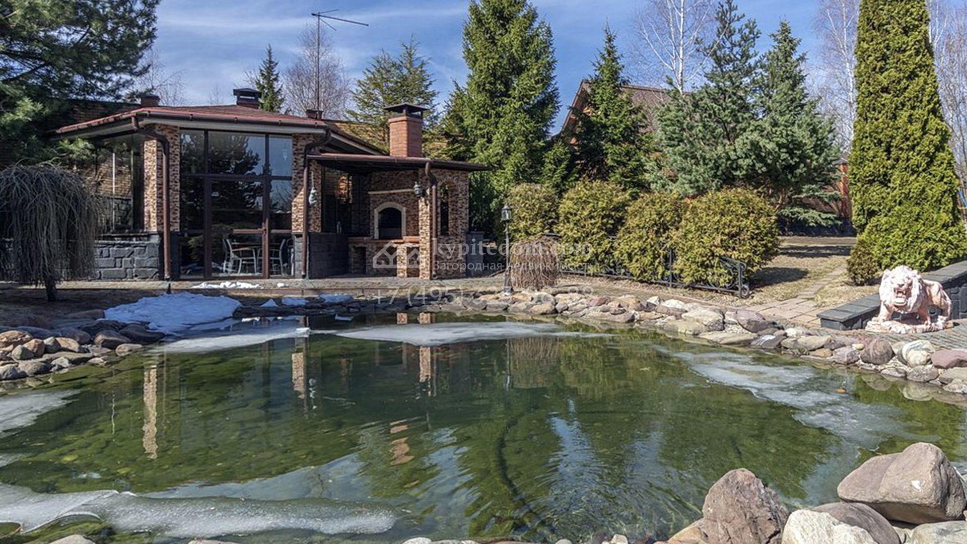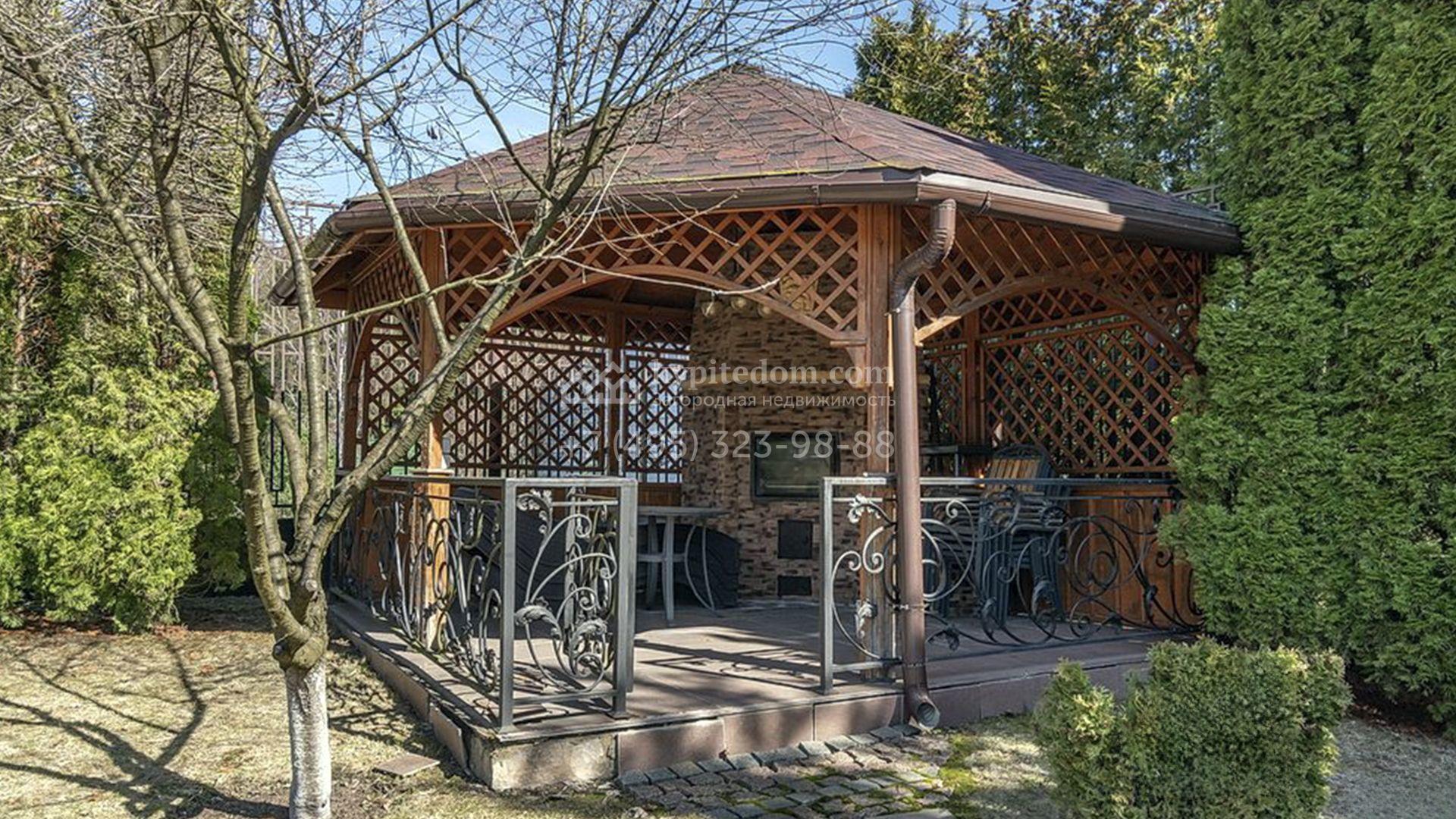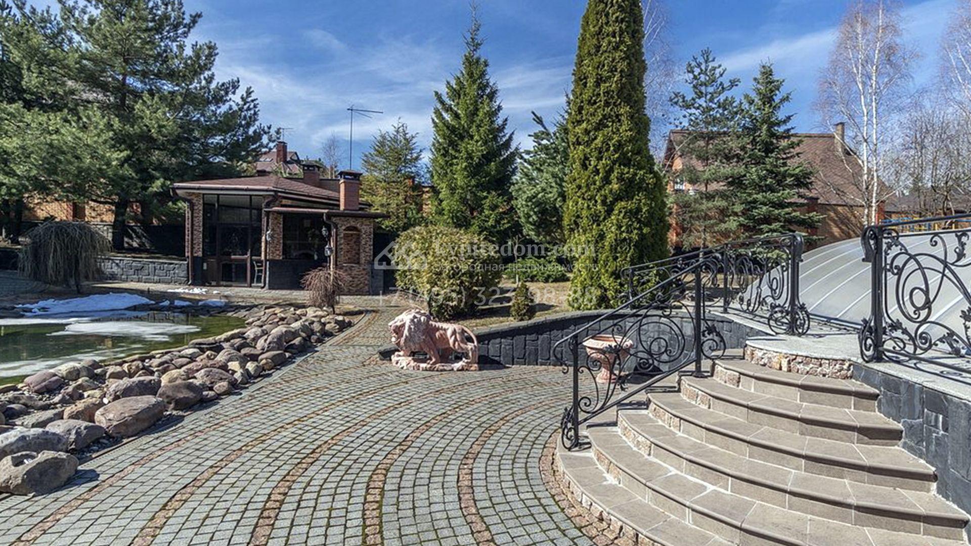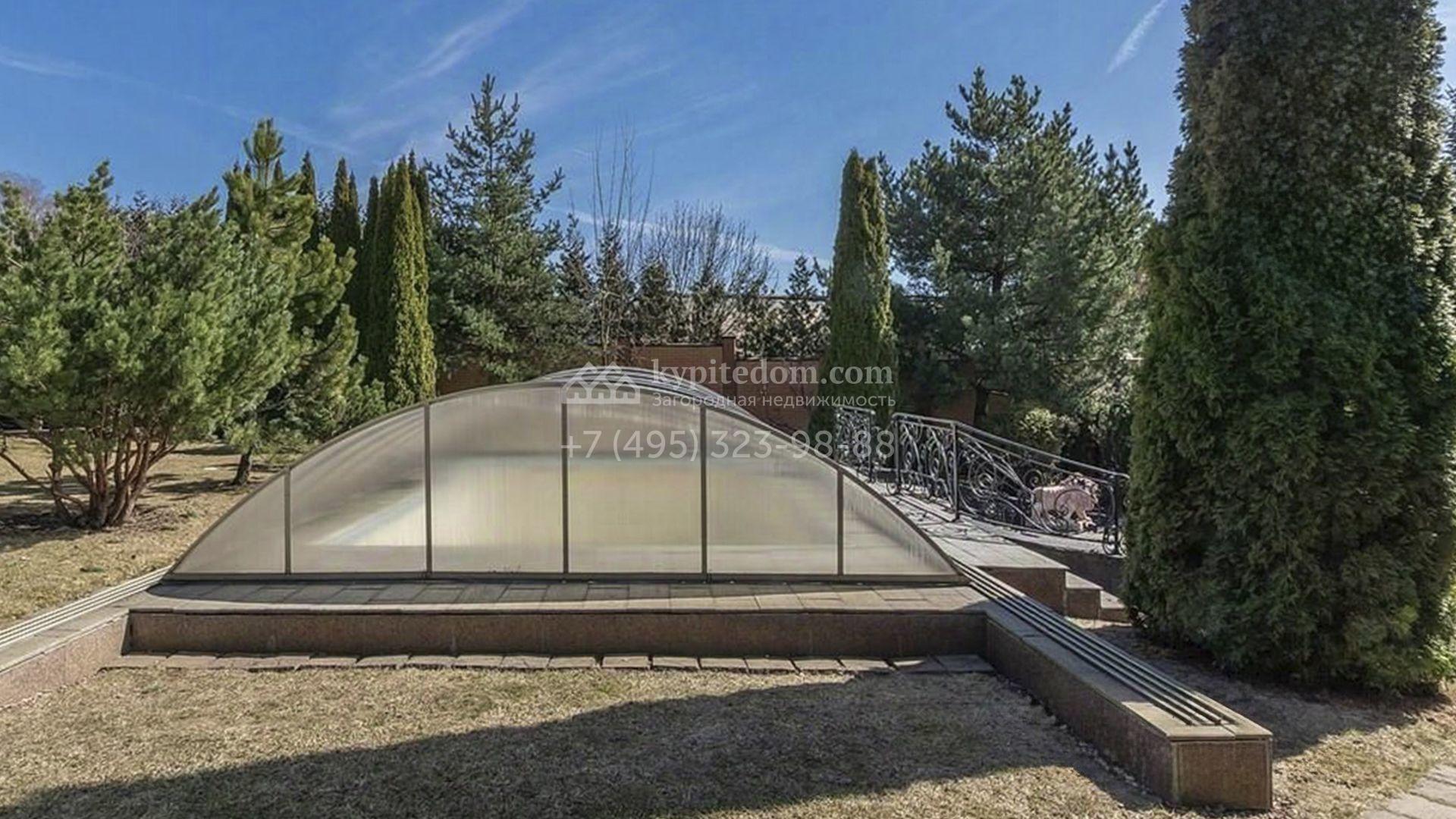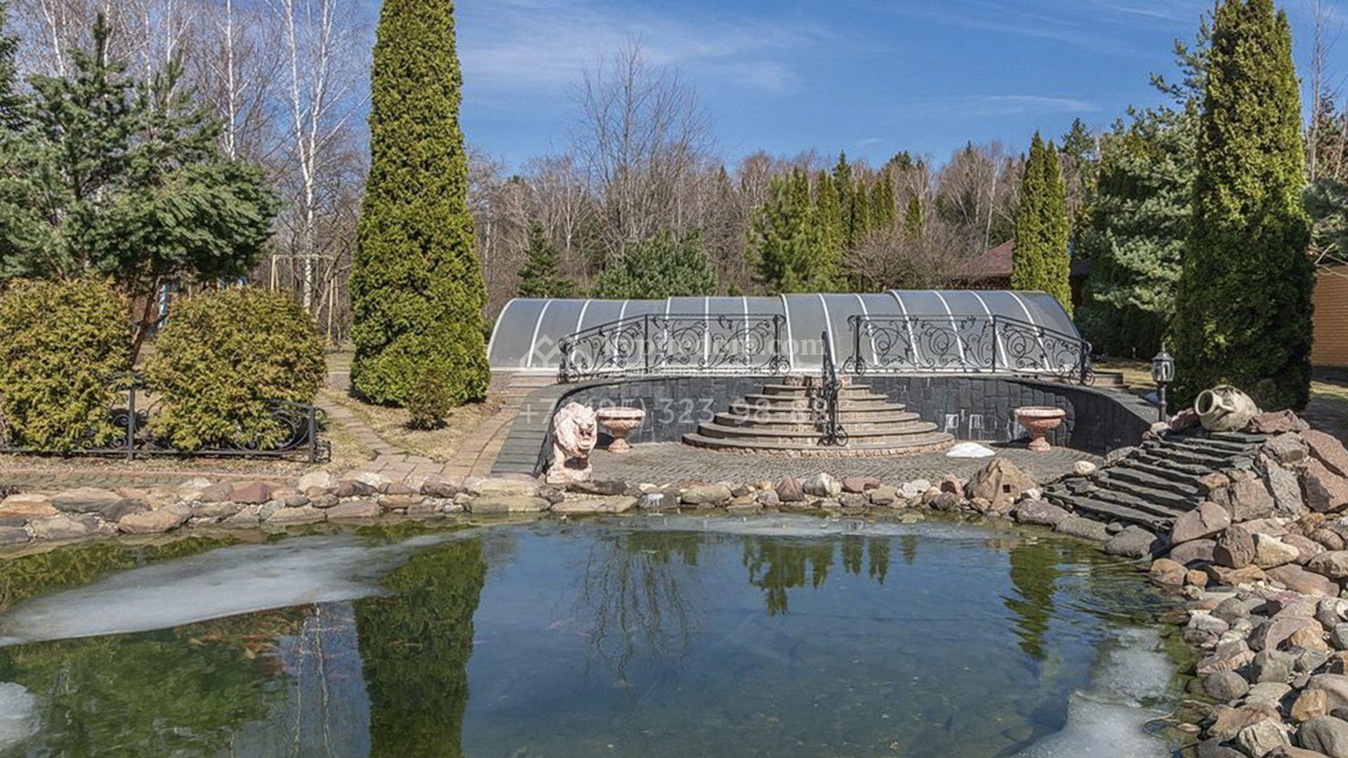 Рядом с основным зданием построены открытый бассейн с навесом, подогревом и системой очистки воды, остекленная беседка с камином и кухней для барбекю, а также летняя беседка с коптильней. В рамках ландшафтного дизайна на участке выполнено зонирование, растут кустарники и более 50-ти взрослых хвойных и фруктовых деревьев, размещен декоративный пруд с фонтаном и рыбками, установлены мраморные скульптуры, засеян газон, вымощены дорожки и оборудовано уличное освещение.