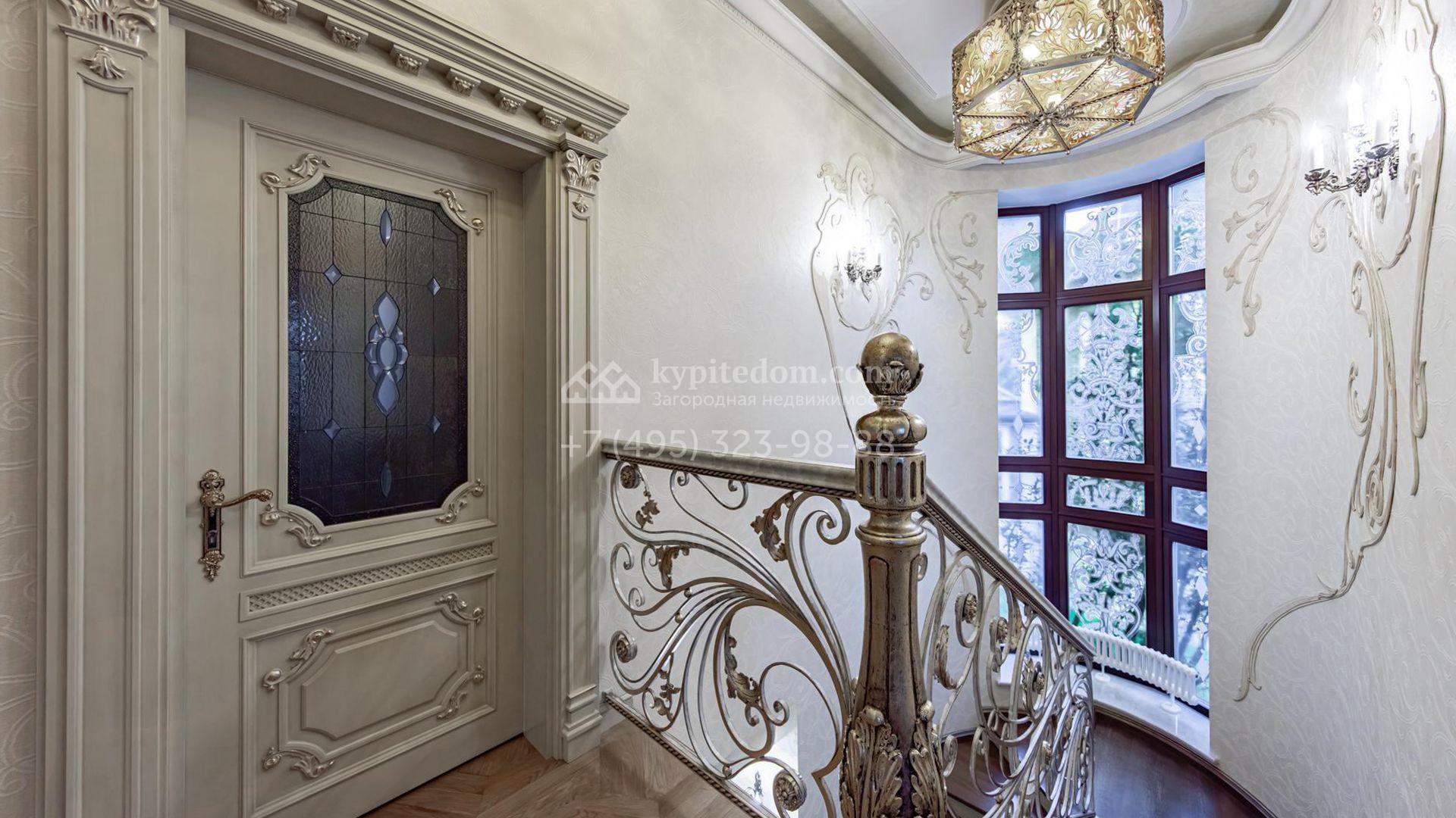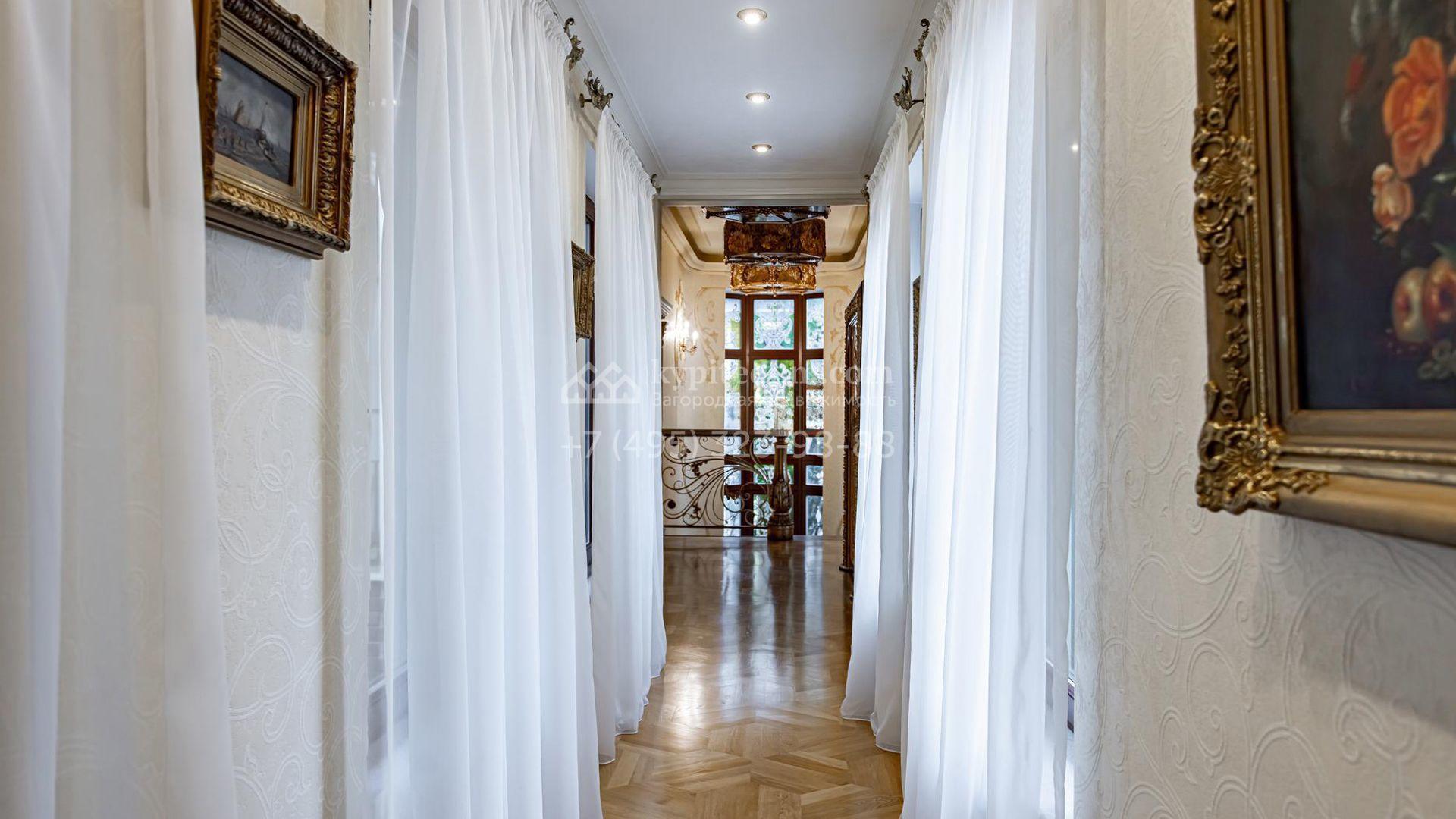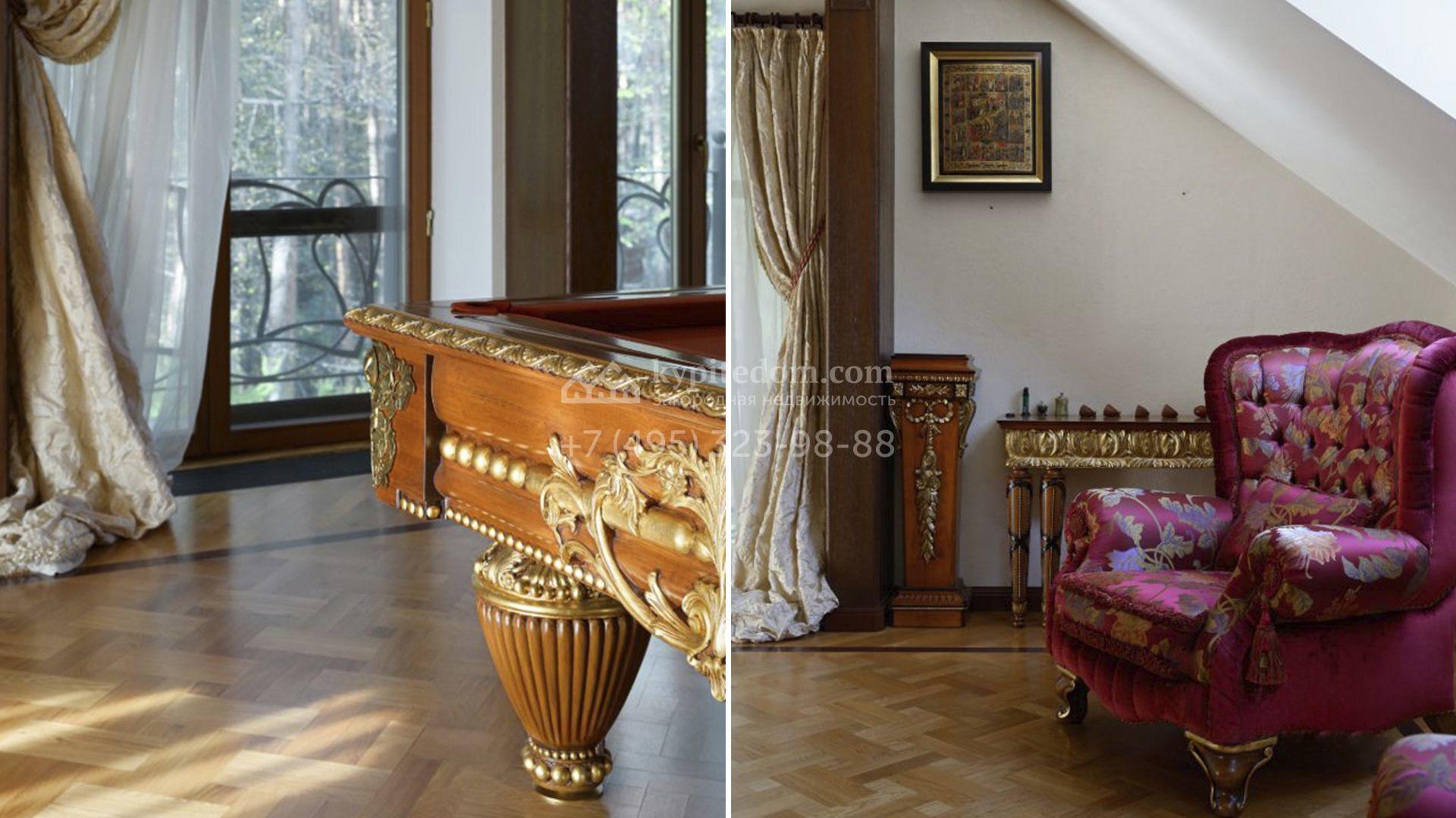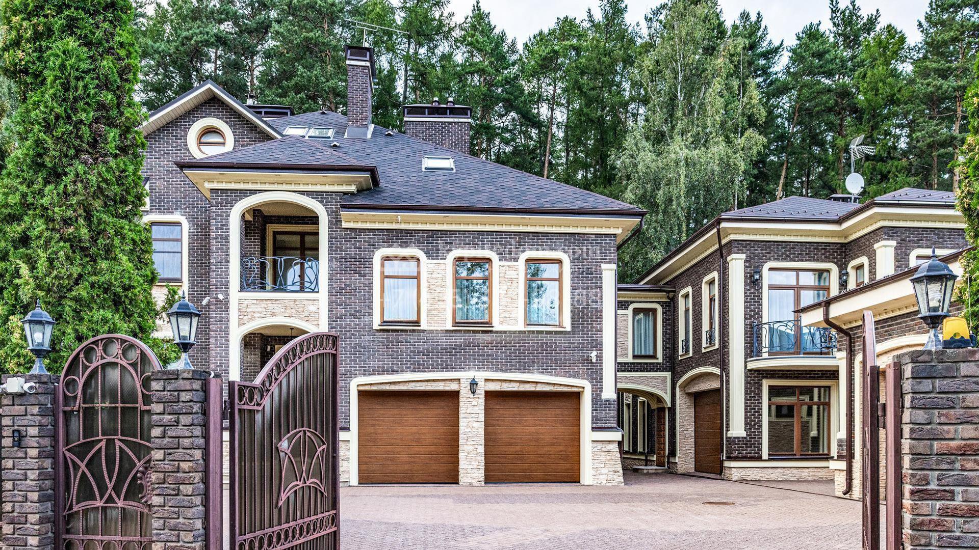 Загородный особняк площадью 920 м² расположен на живописном лесном участке 16 соток. Фасад, выполненный в элегантном европейском стиле, облицован темно-коричневым клинкерным кирпичом, дополнен плиткой с фактурой камня и украшен пилястрами и изящными коваными ограждениями. Интерьеры с классическими элементами выдержаны в светлых тонах и полностью укомплектованы комфортной мебелью, встроенной бытовой техникой и современной сантехникой. Для идеального микроклимата в резиденции установлена система кондиционирования.