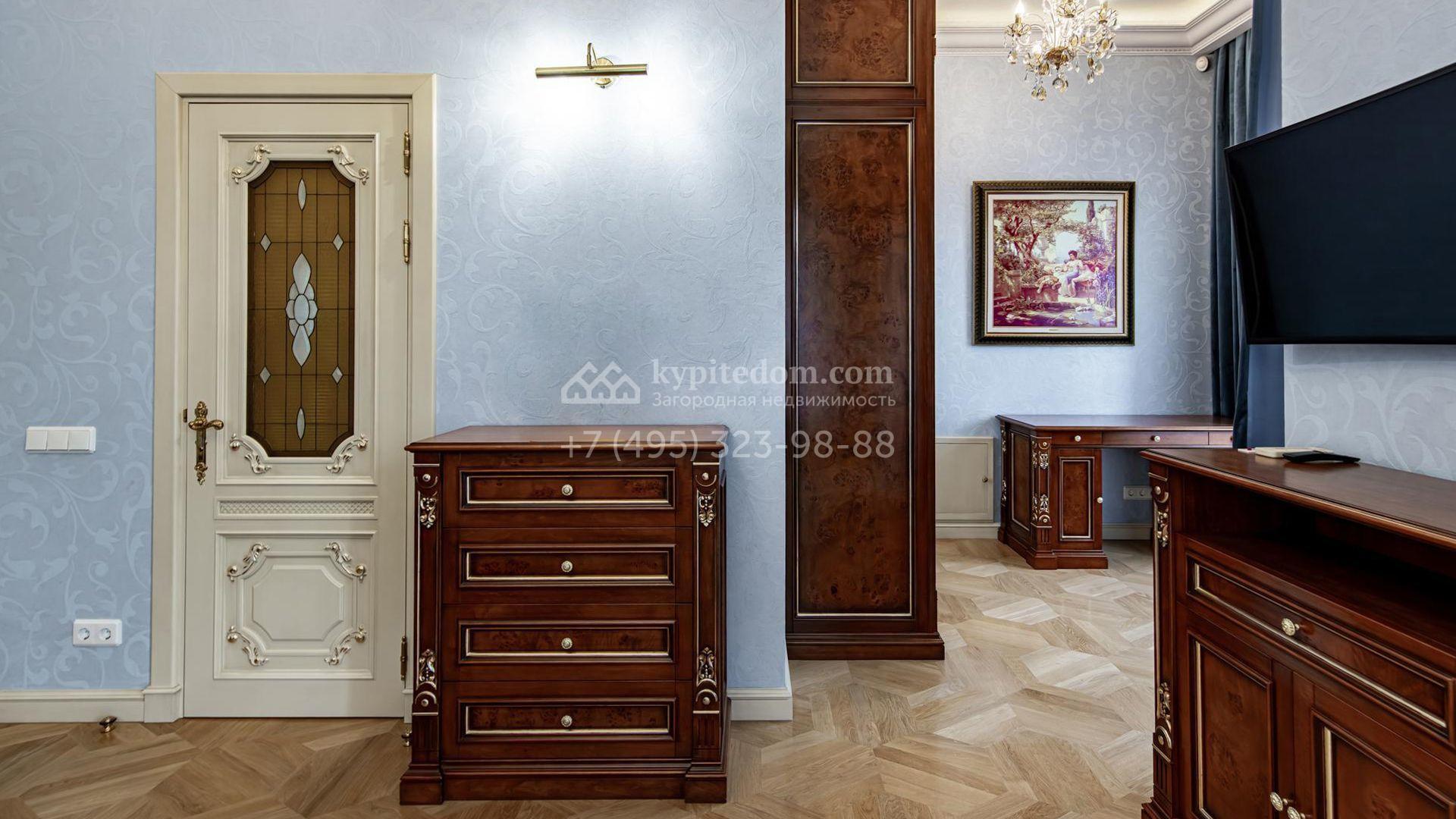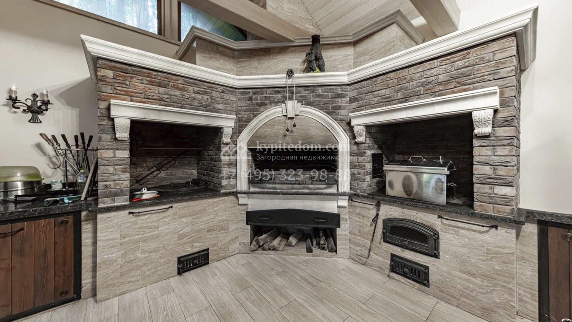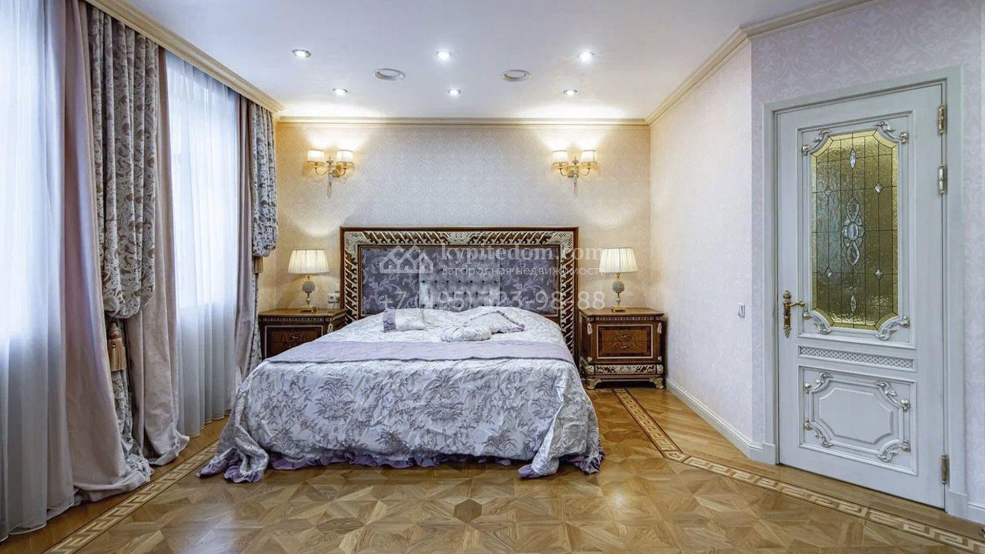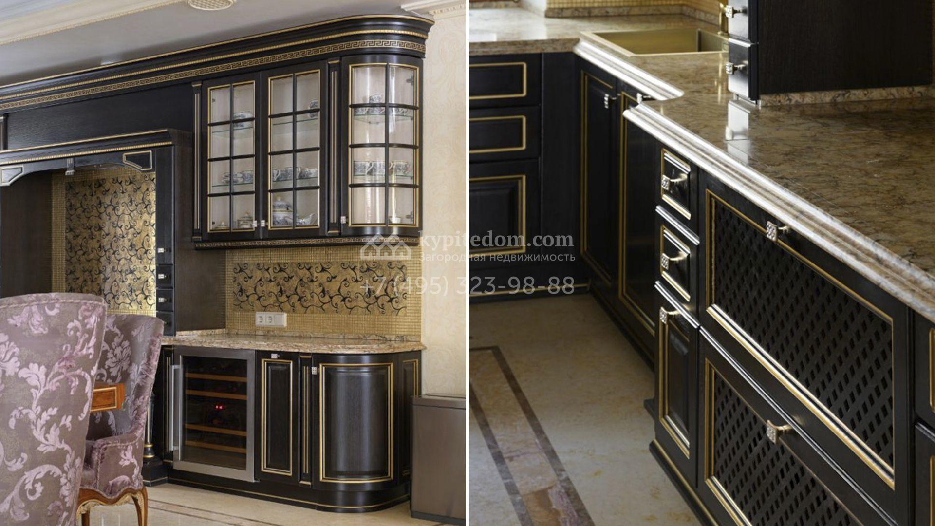 Загородный особняк площадью 920 м² расположен на живописном лесном участке 16 соток. Фасад, выполненный в элегантном европейском стиле, облицован темно-коричневым клинкерным кирпичом, дополнен плиткой с фактурой камня и украшен пилястрами и изящными коваными ограждениями. Интерьеры с классическими элементами выдержаны в светлых тонах и полностью укомплектованы комфортной мебелью, встроенной бытовой техникой и современной сантехникой. Для идеального микроклимата в резиденции установлена система кондиционирования.