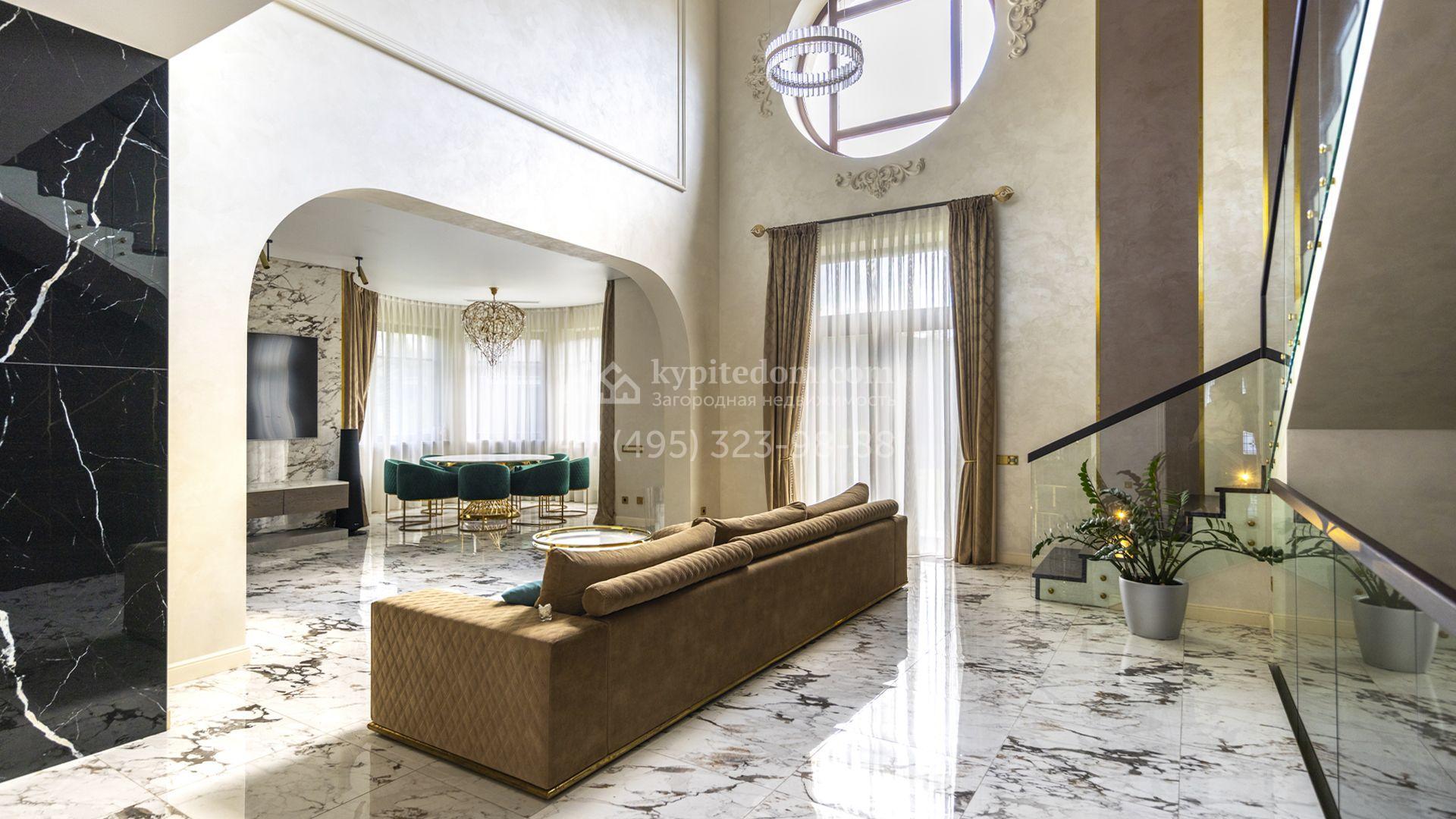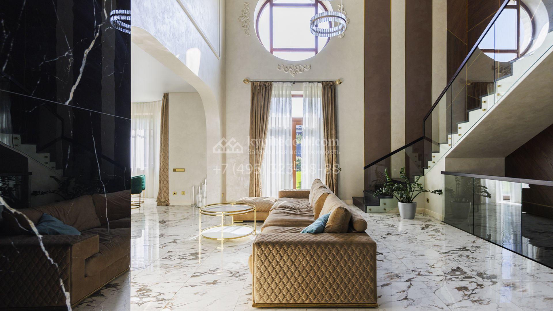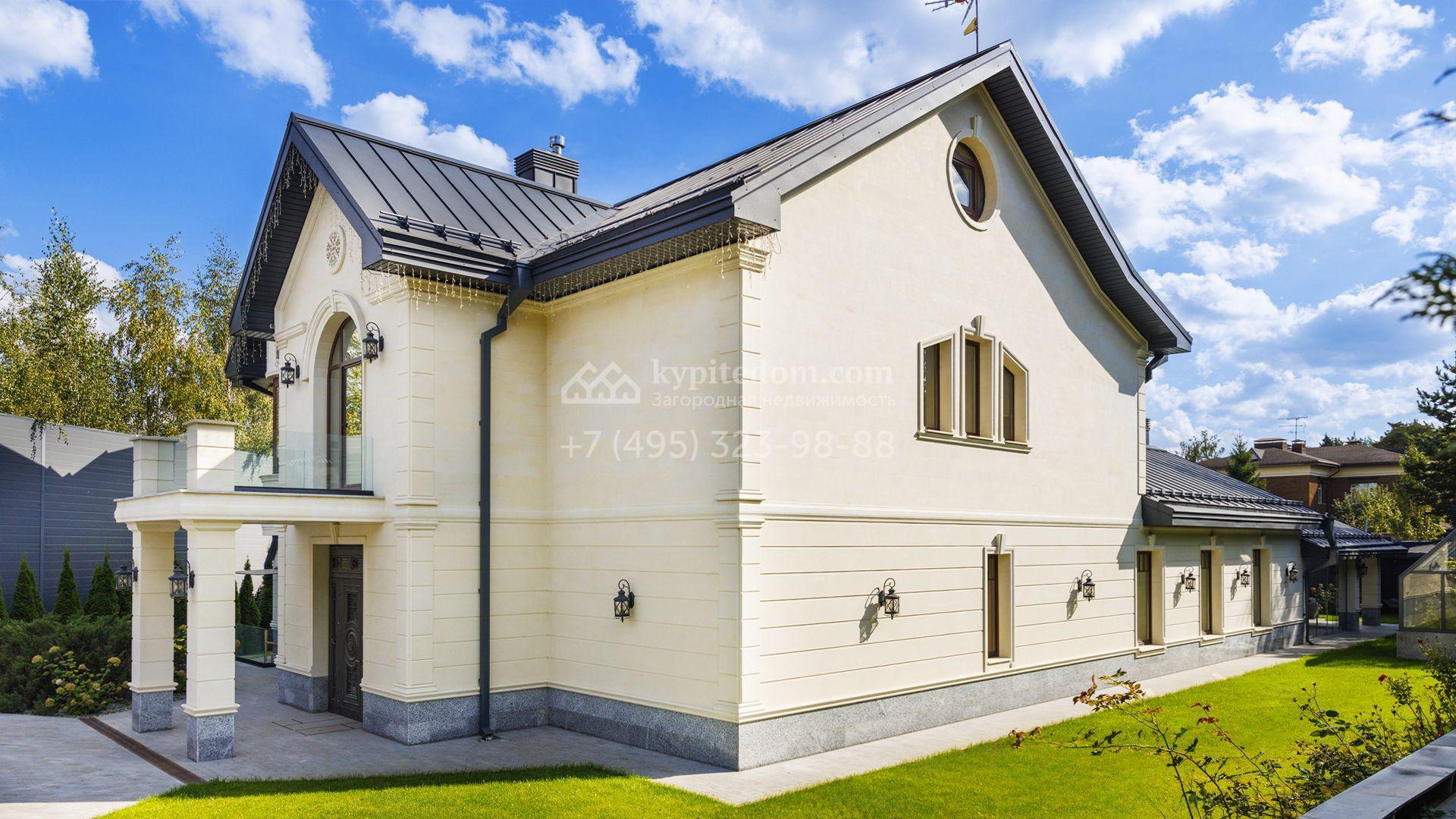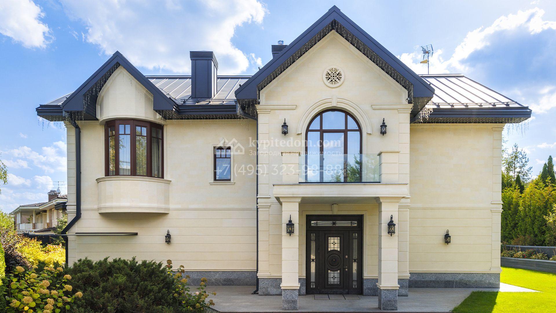 Загородный коттедж площадью 700 м² расположен на полевом участке 17 соток. Фасад с многоскатной крышей, выполненный в неоклассическом стиле, украшен элегантными колоннами и рустовкой. Стены облицованы кремовой плиткой с благородной фактурой камня, создающей ощущение монументальности и изысканности. Большие окна визуально расширяют внутренние пространства и наполняют их солнечными лучами.