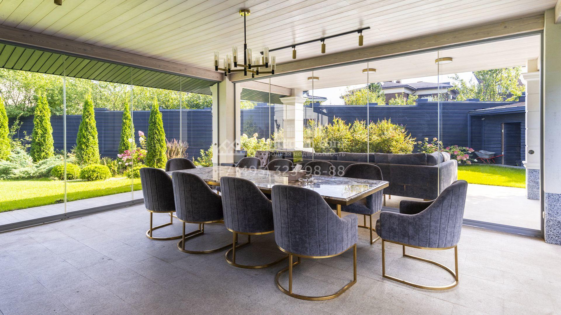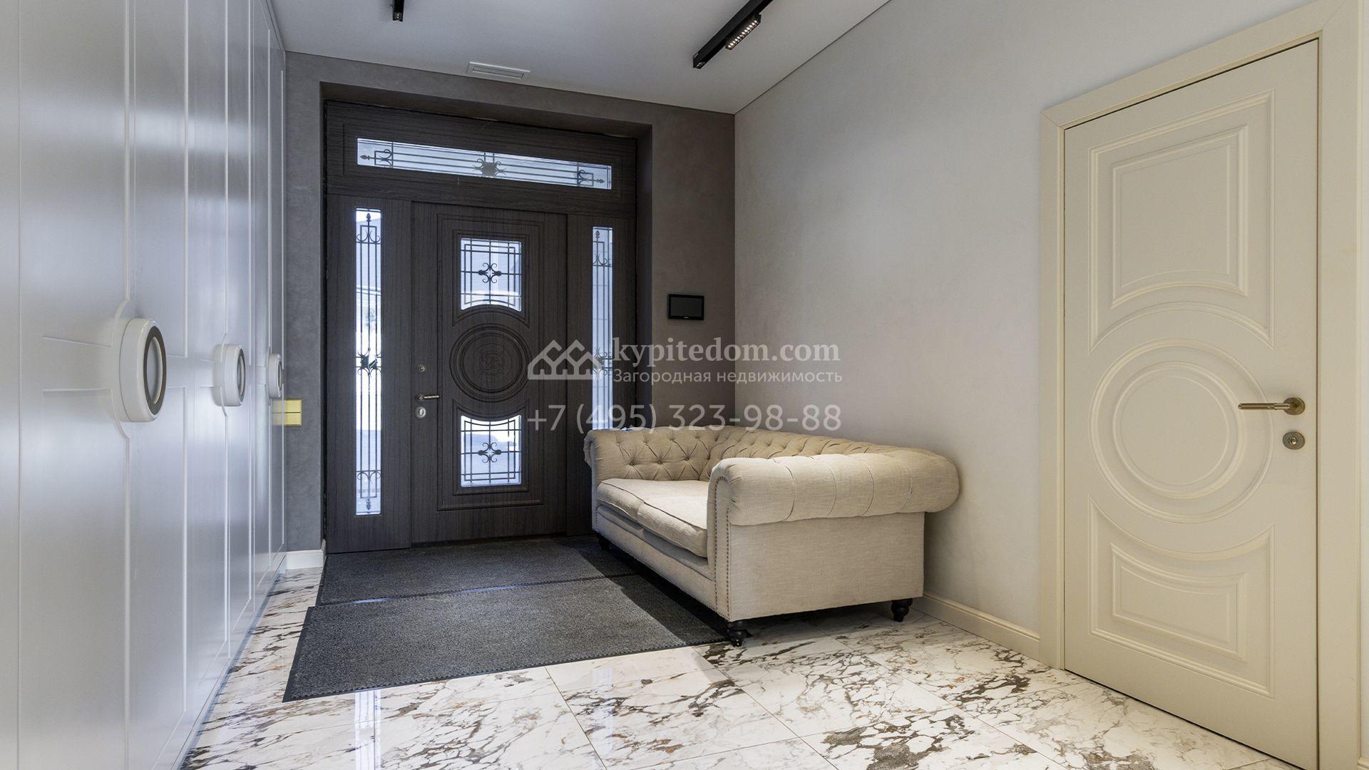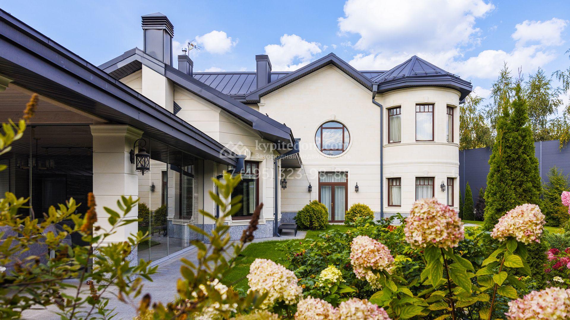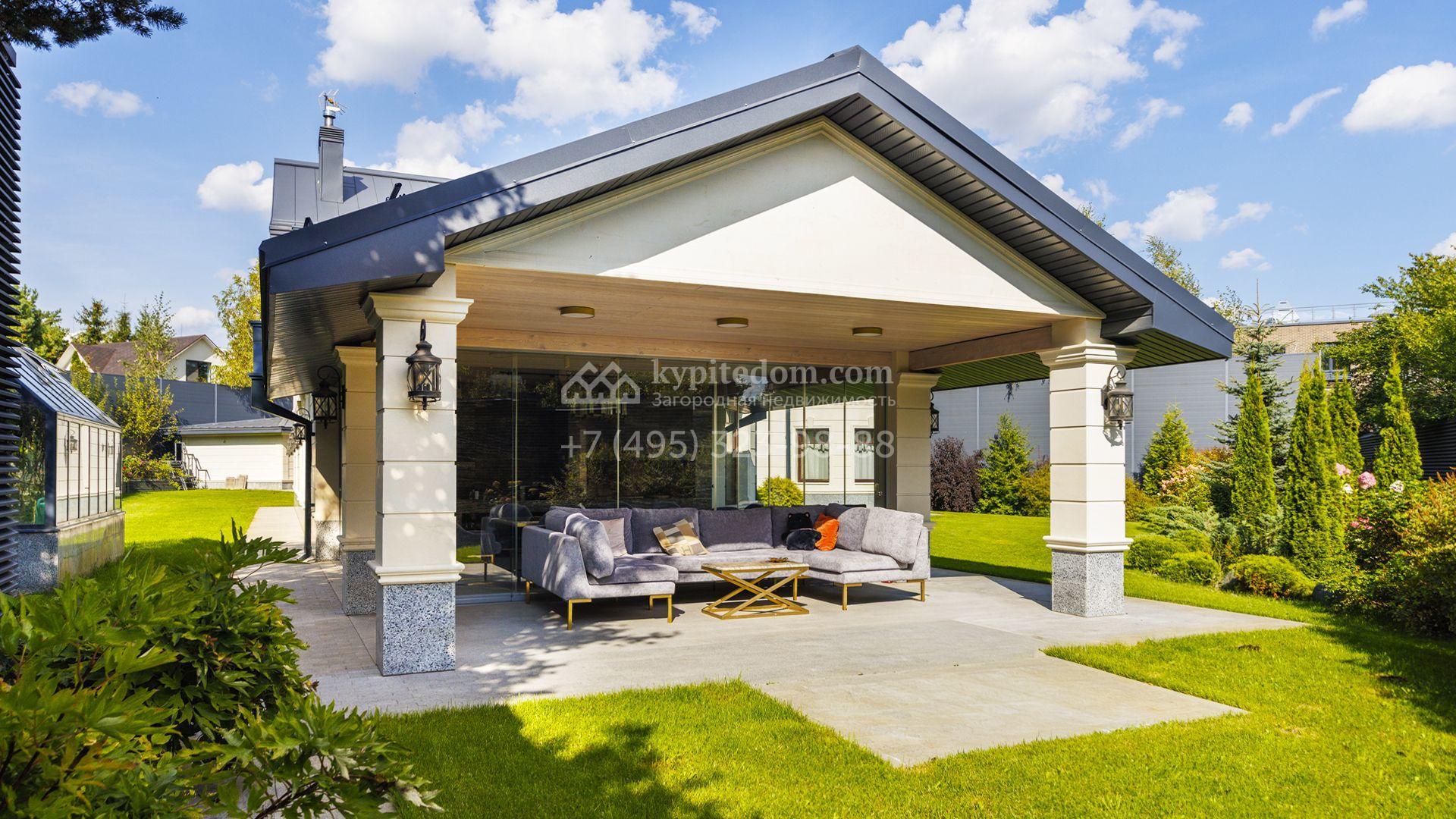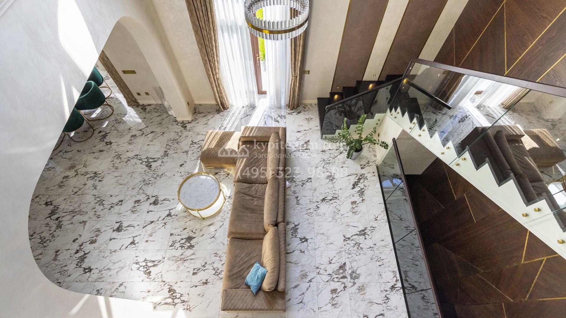 Загородный коттедж площадью 700 м² расположен на полевом участке 17 соток. Фасад с многоскатной крышей, выполненный в неоклассическом стиле, украшен элегантными колоннами и рустовкой. Стены облицованы кремовой плиткой с благородной фактурой камня, создающей ощущение монументальности и изысканности. Большие окна визуально расширяют внутренние пространства и наполняют их солнечными лучами.