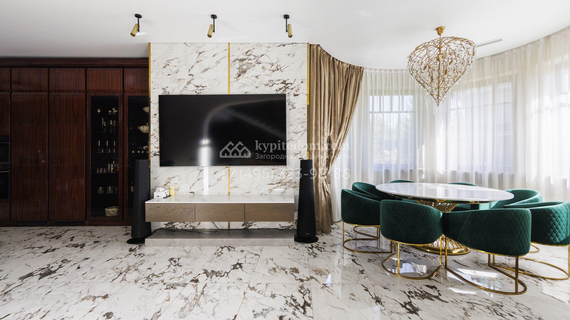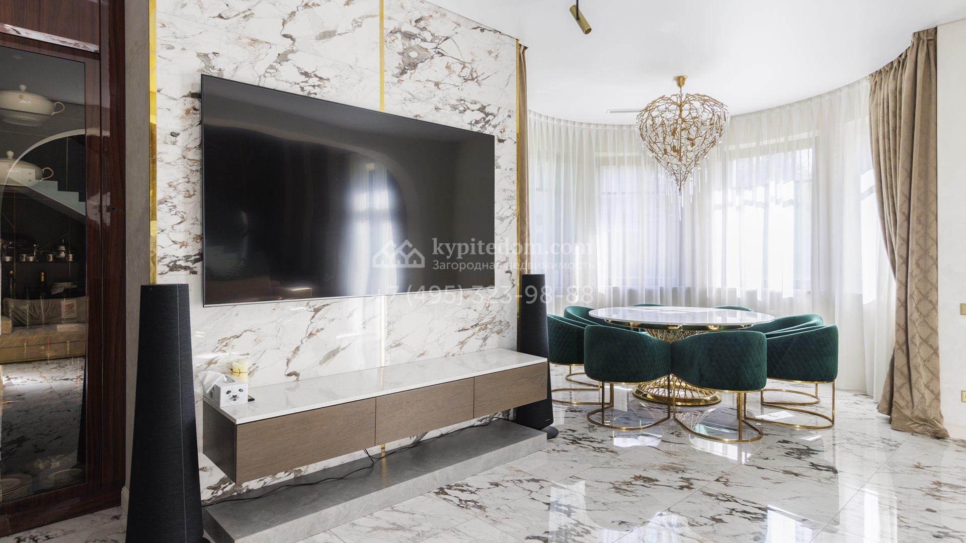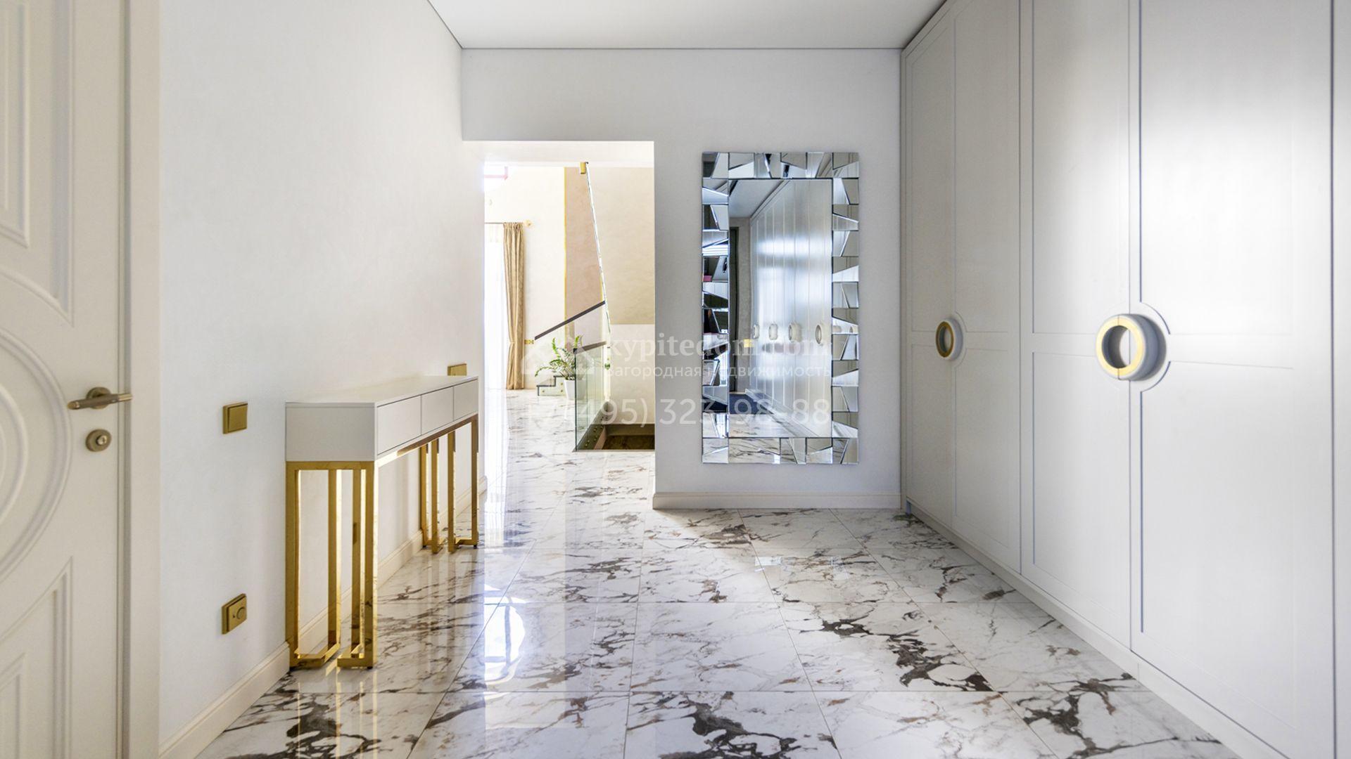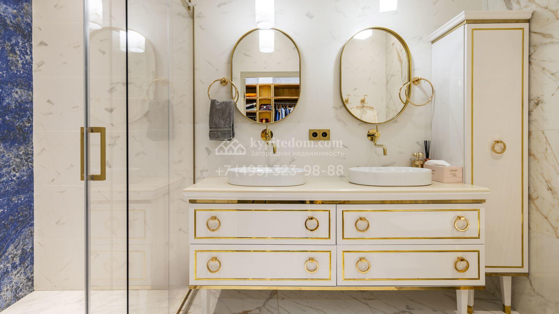 Современные интерьеры выдержаны в светлых тонах и декорированы молдингами, стеновыми панелями с геометричными золотистыми вставками и изящными люстрами. Комфортная мебель, встроенная бытовая техника и система кондиционирования дополняют образ идеального имения. Сердцем дома стала просторная двухсветная гостиная-кухня-столовая с камином. Кроме того, планировка включает четыре уютные спальни, спа-зону с бассейном, баней и хаммамом, бильярдную и комнату отдыха.