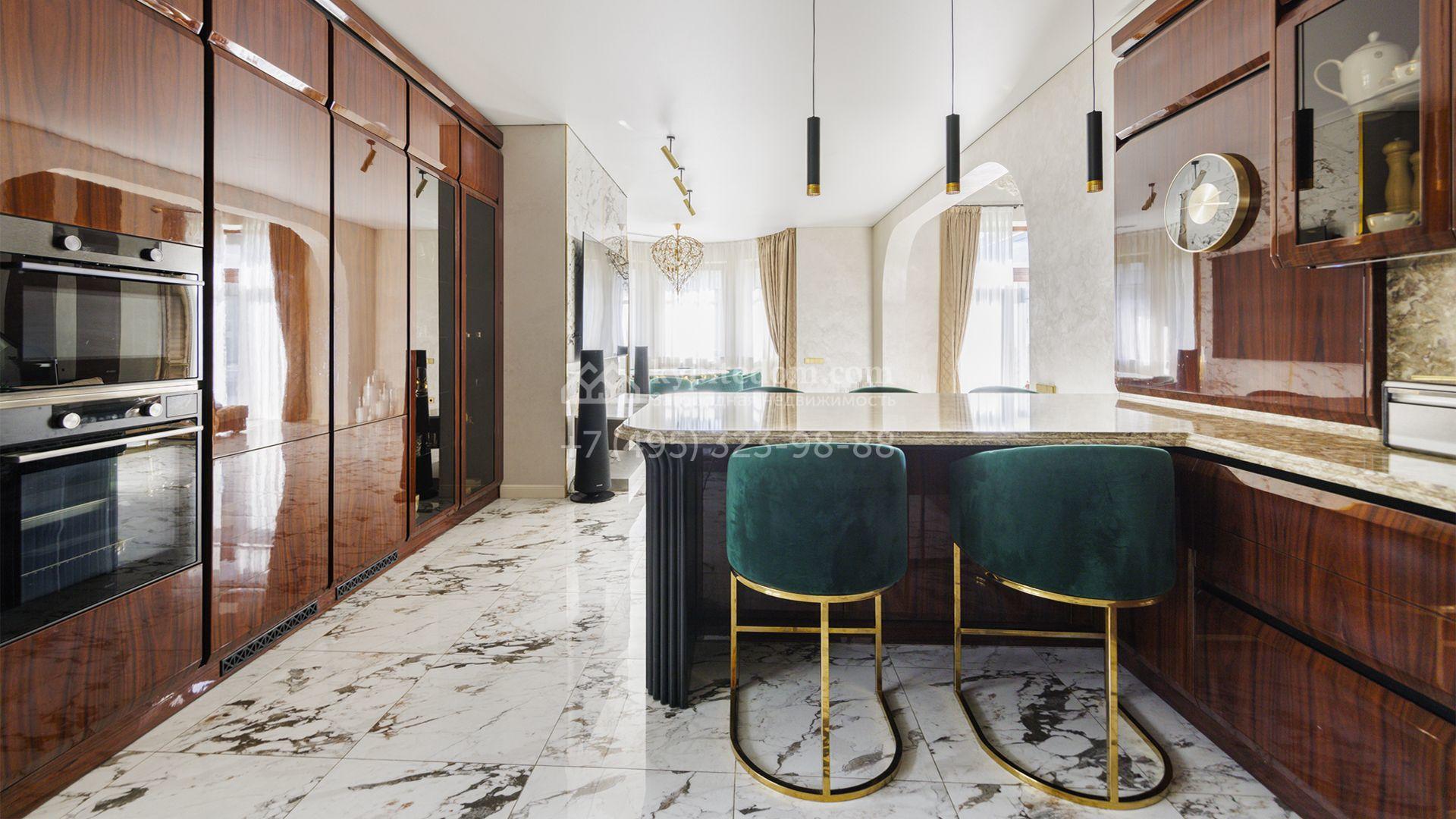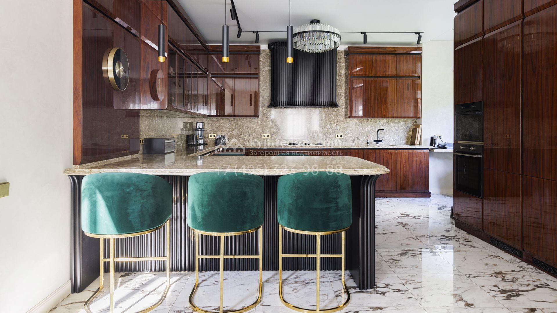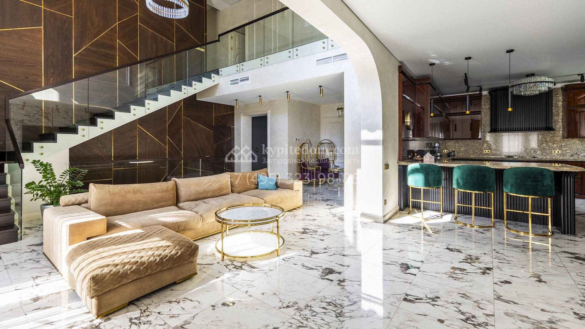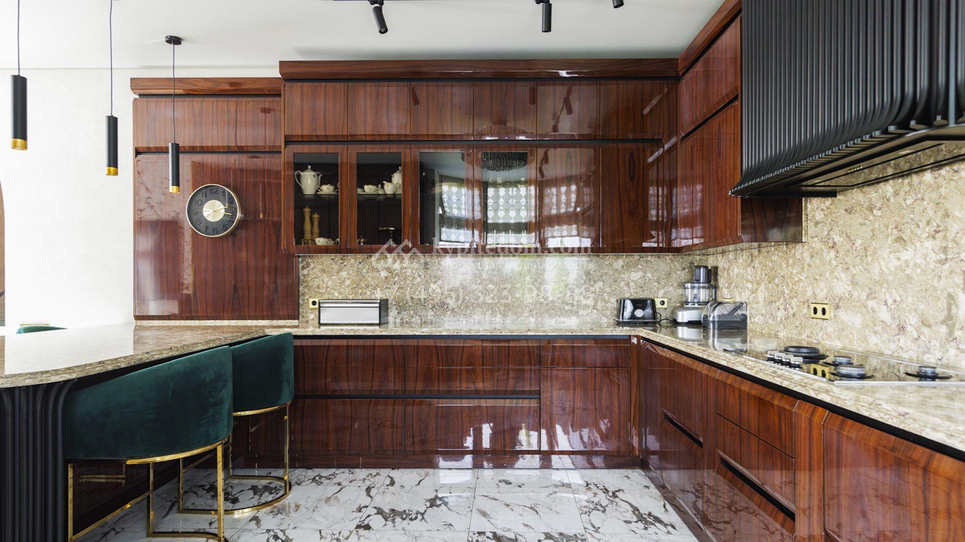 Современные интерьеры выдержаны в светлых тонах и декорированы молдингами, стеновыми панелями с геометричными золотистыми вставками и изящными люстрами. Комфортная мебель, встроенная бытовая техника и система кондиционирования дополняют образ идеального имения. Сердцем дома стала просторная двухсветная гостиная-кухня-столовая с камином. Кроме того, планировка включает четыре уютные спальни, спа-зону с бассейном, баней и хаммамом, бильярдную и комнату отдыха.