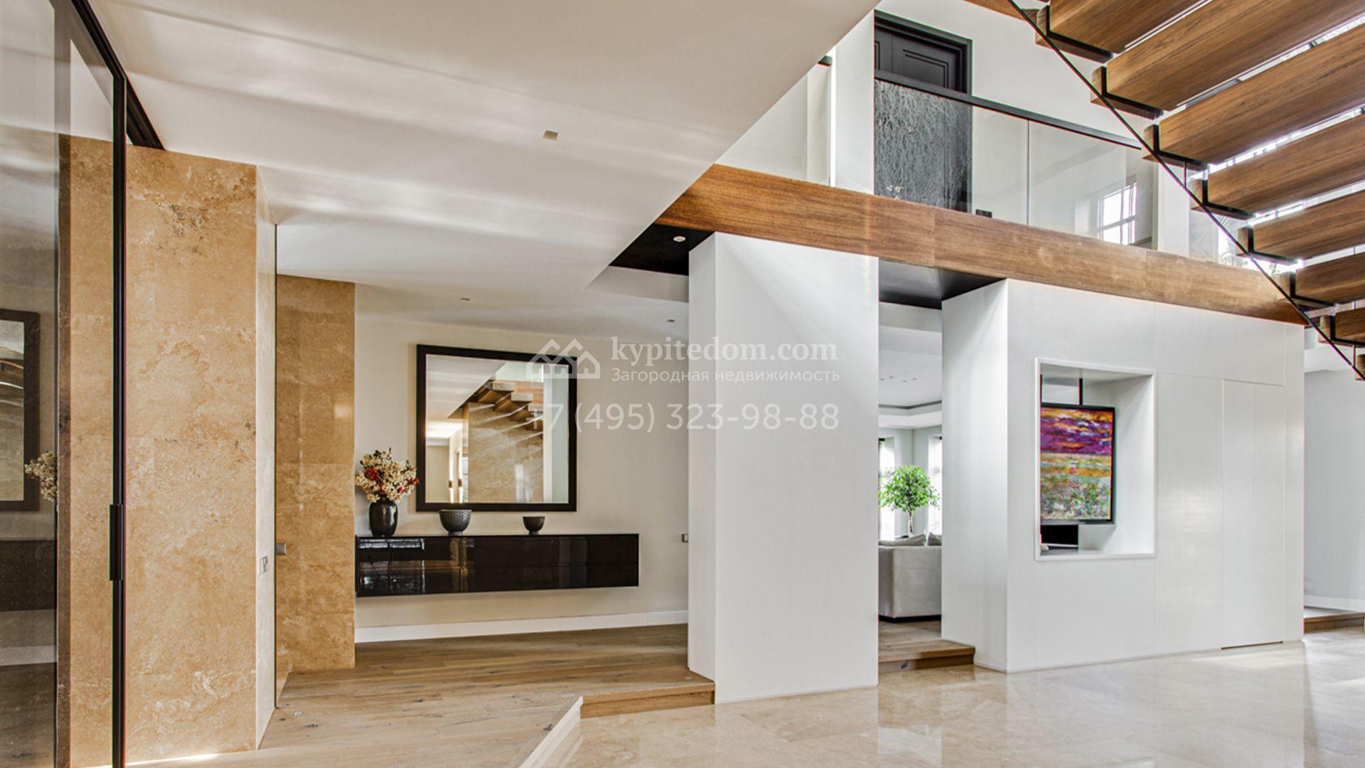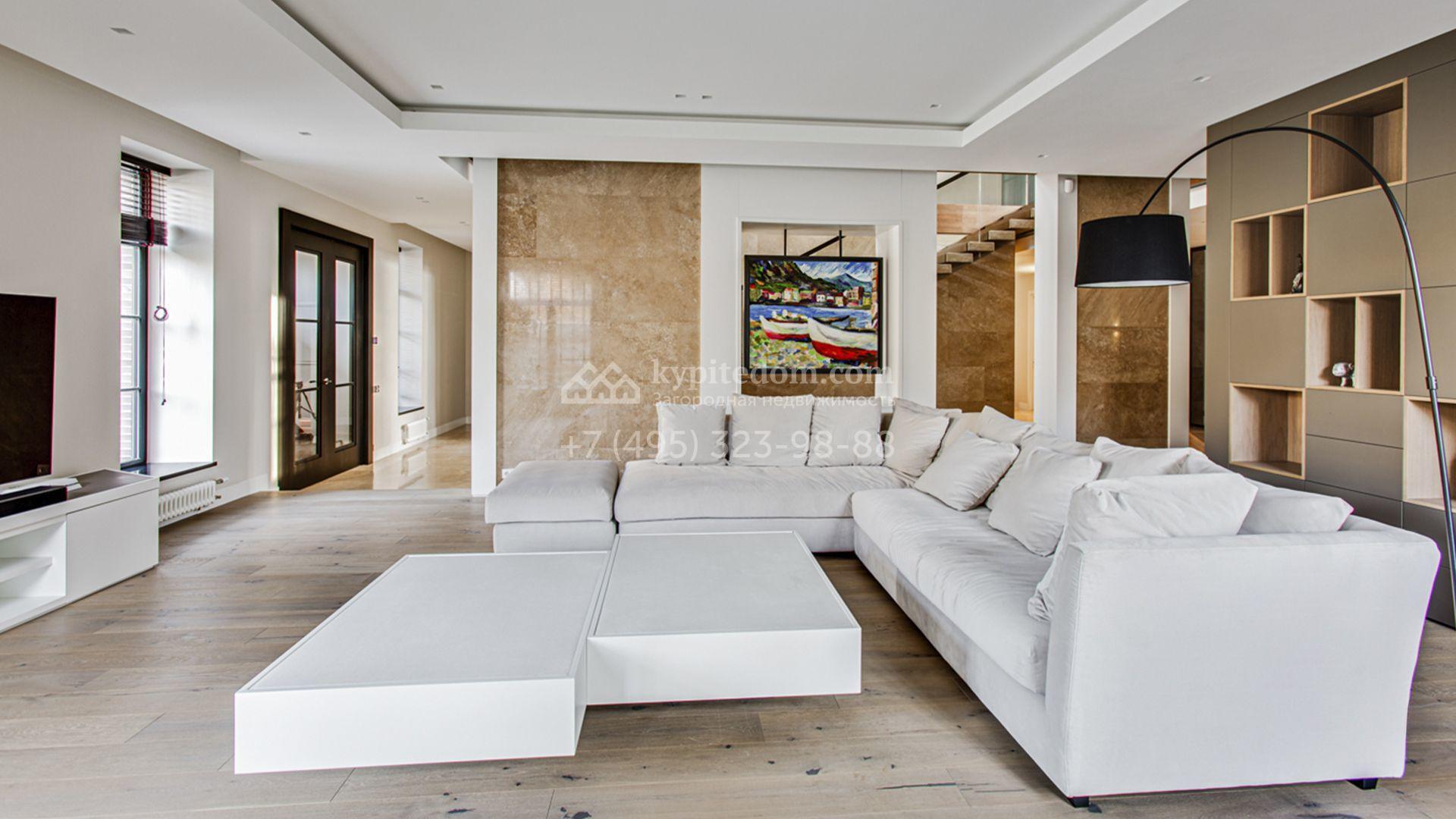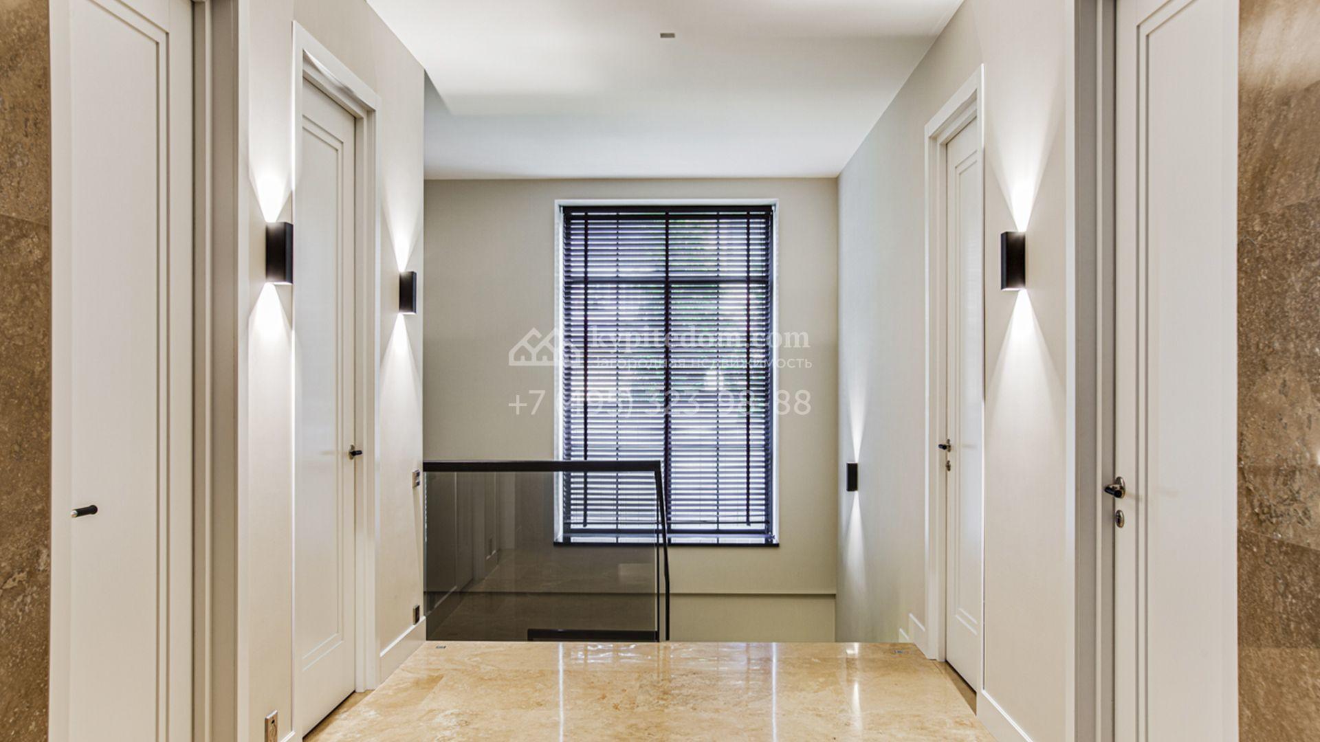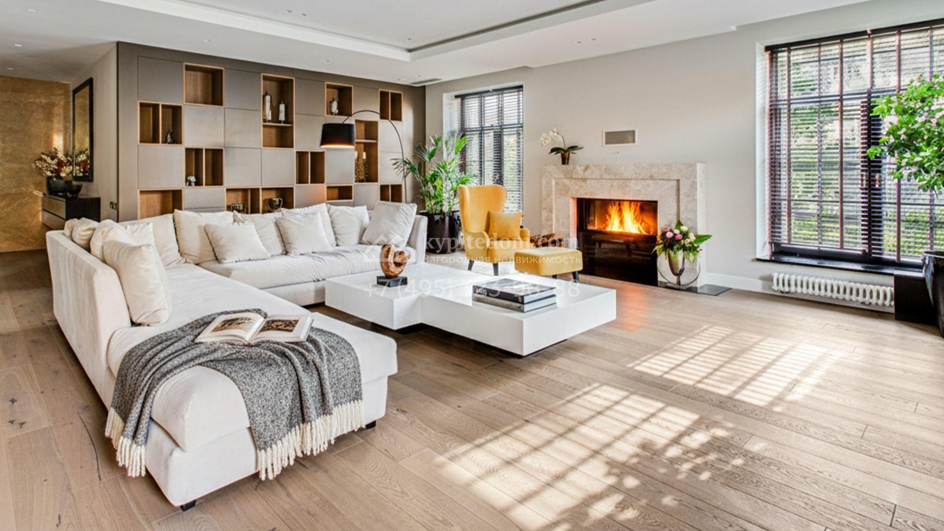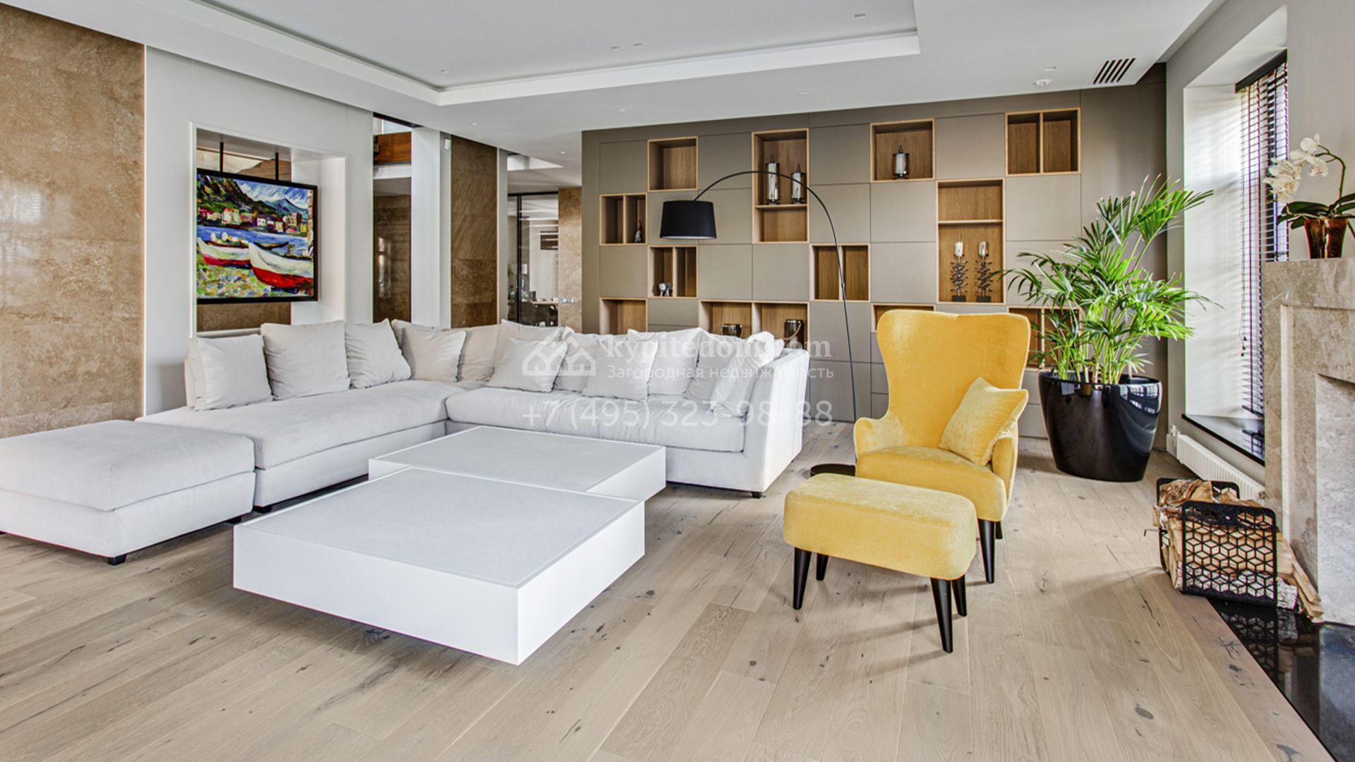 Светлые дизайнерские интерьеры отделаны с использованием натуральных мрамора, травертина и ценных пород дерева. На полу уложены инженерная доска Finex и плитка с подогревом. Коттедж укомплектован элегантной мебелью, техникой Miele и Liebherr и сантехникой Villeroy&Boch, а особую атмосферу формируют светильники Delta Light. Комфорт обеспечивают системы кондиционирования, приточно-вытяжной вентиляции Systemair и «умный дом» от Control 4.