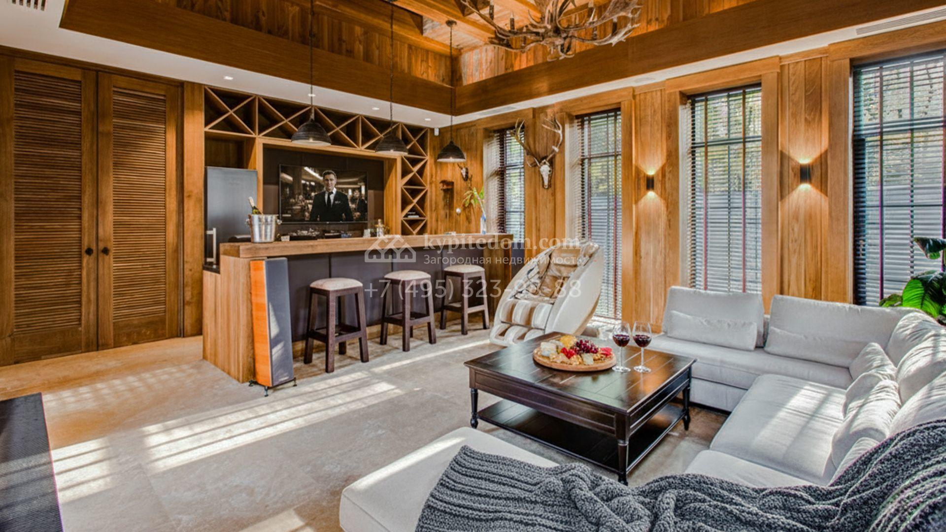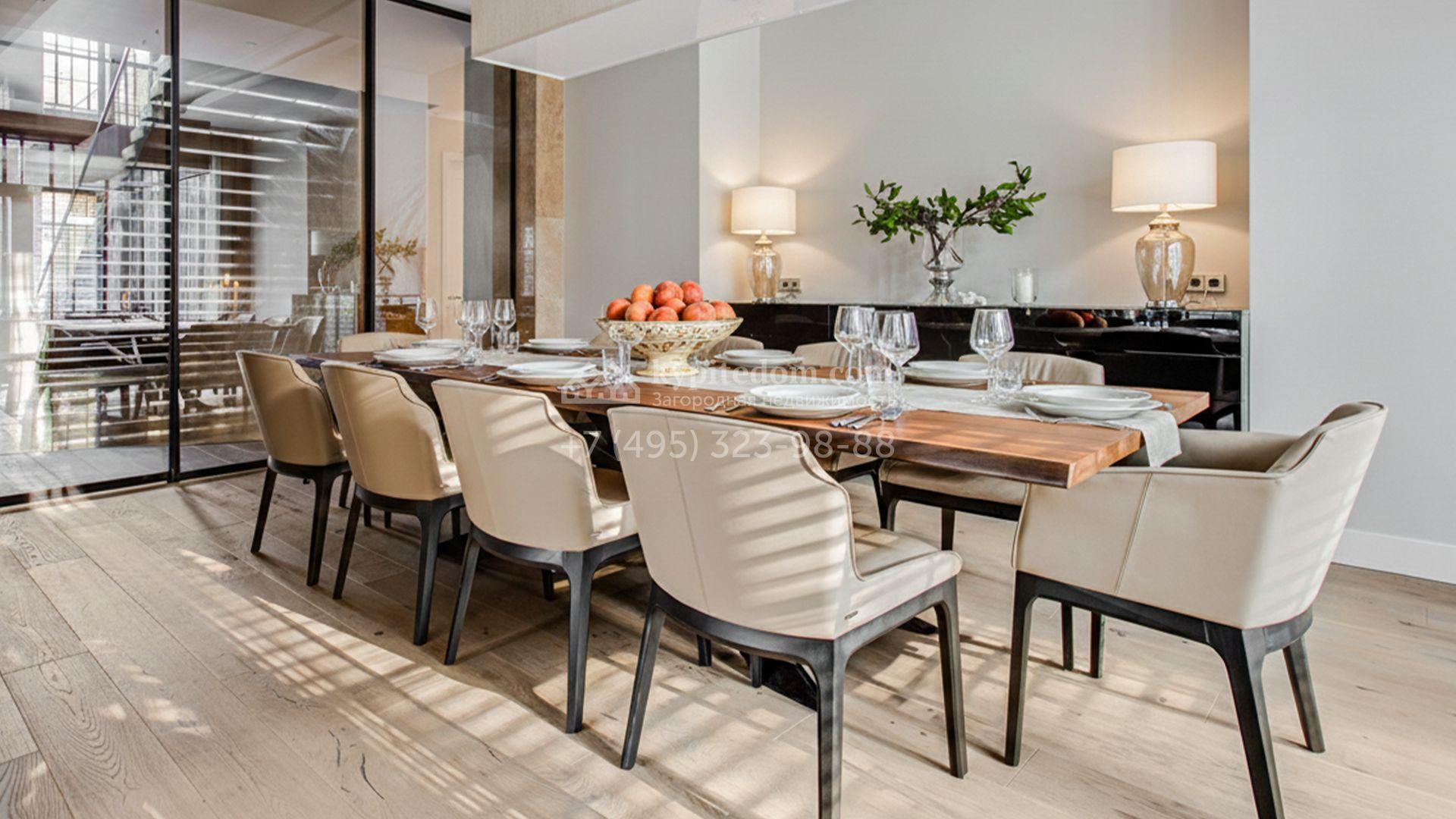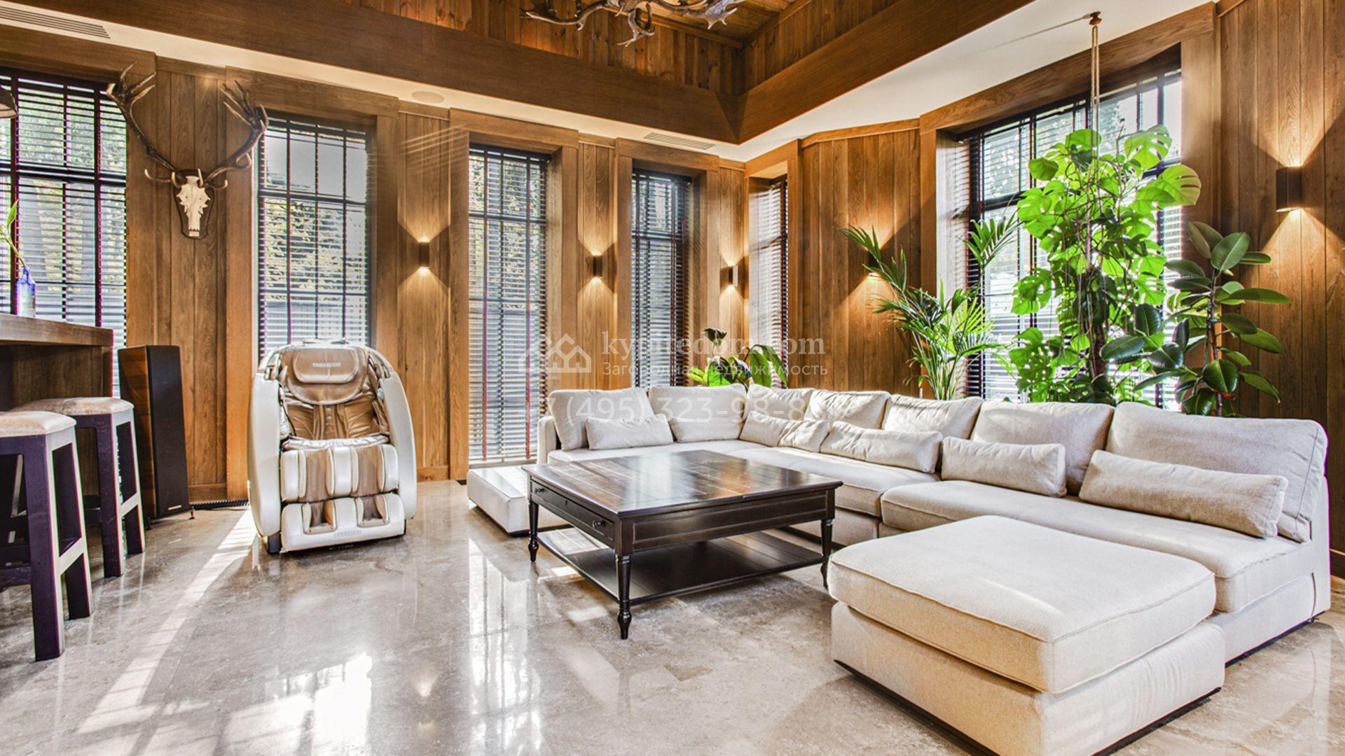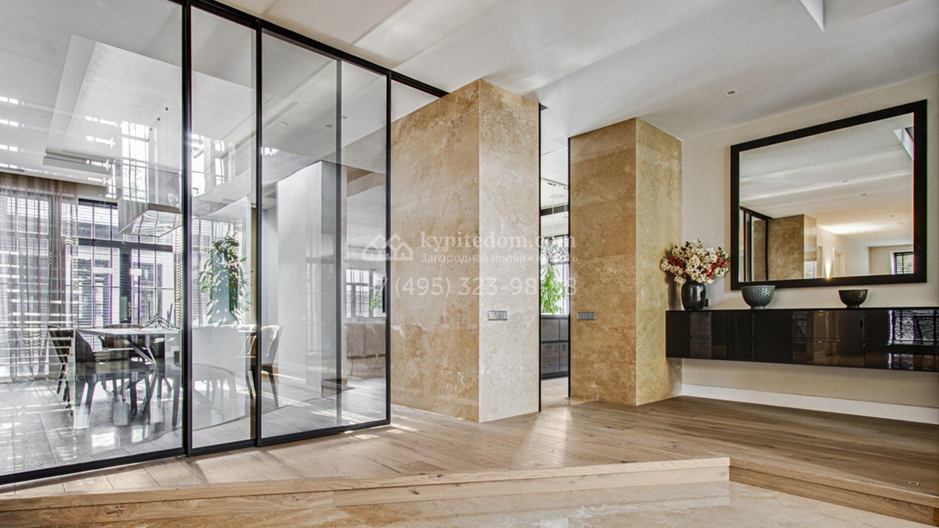 Светлые дизайнерские интерьеры отделаны с использованием натуральных мрамора, травертина и ценных пород дерева. На полу уложены инженерная доска Finex и плитка с подогревом. Коттедж укомплектован элегантной мебелью, техникой Miele и Liebherr и сантехникой Villeroy&Boch, а особую атмосферу формируют светильники Delta Light. Комфорт обеспечивают системы кондиционирования, приточно-вытяжной вентиляции Systemair и «умный дом» от Control 4.