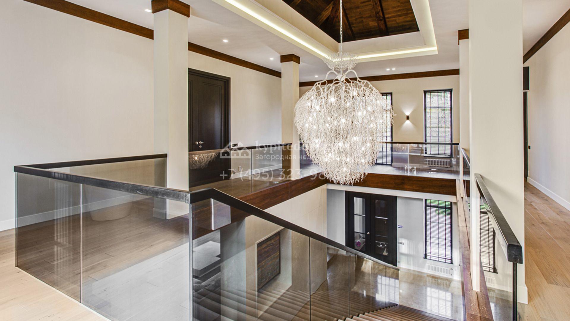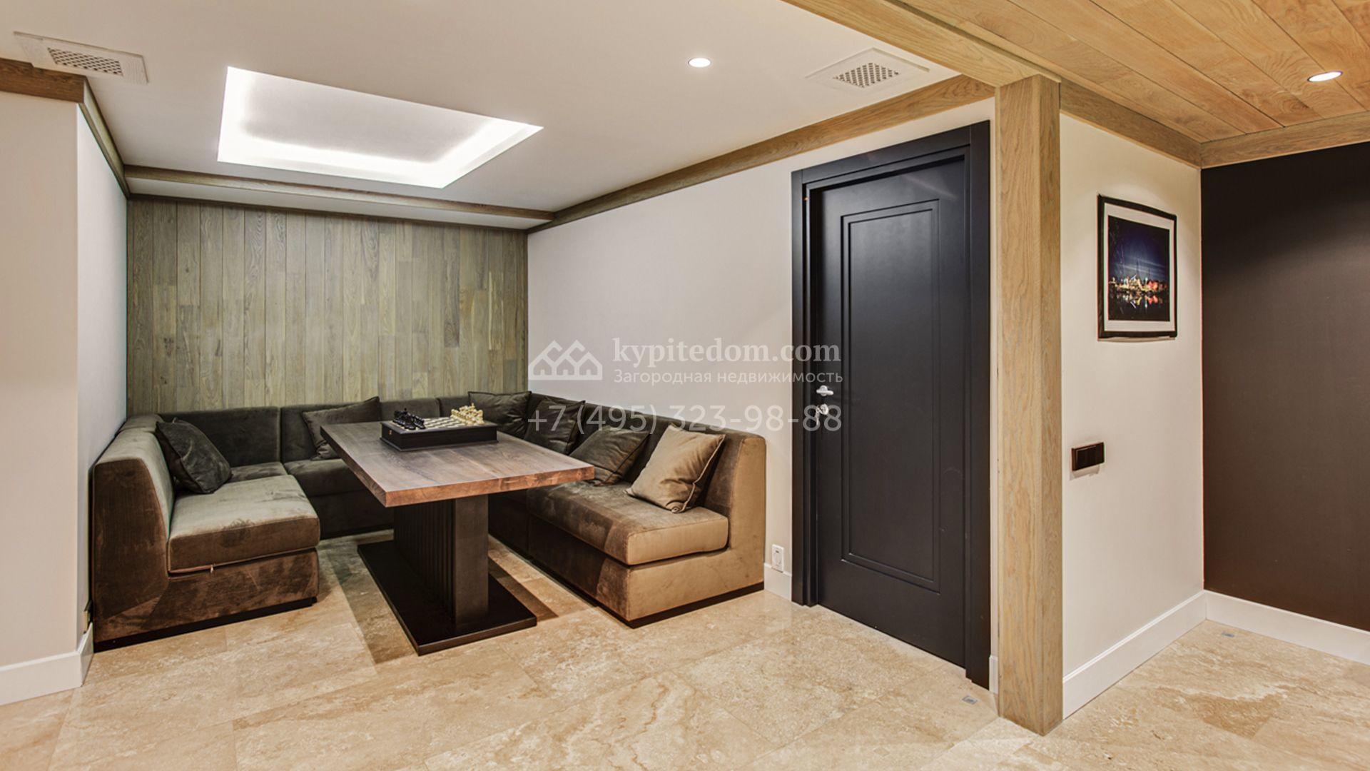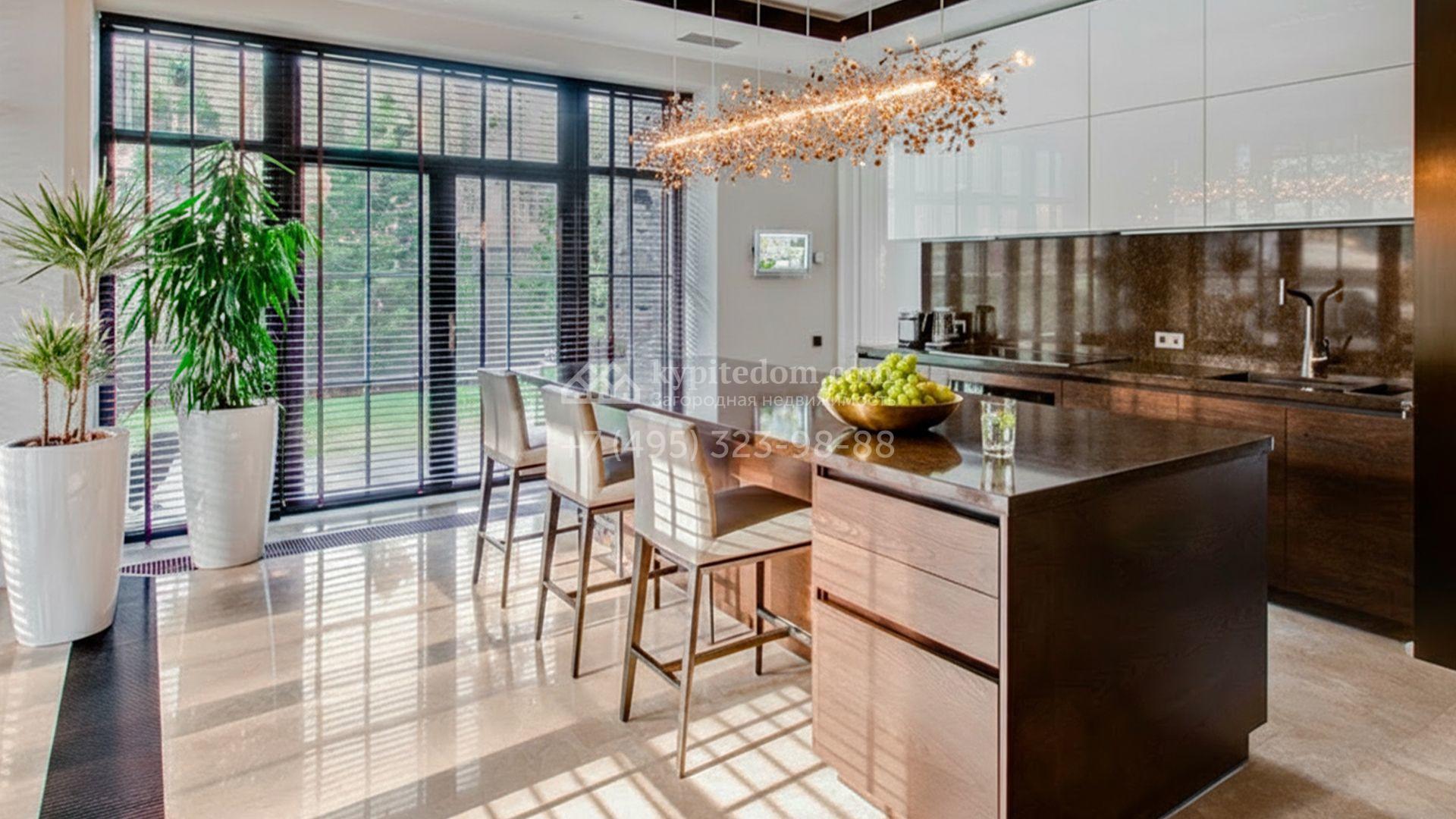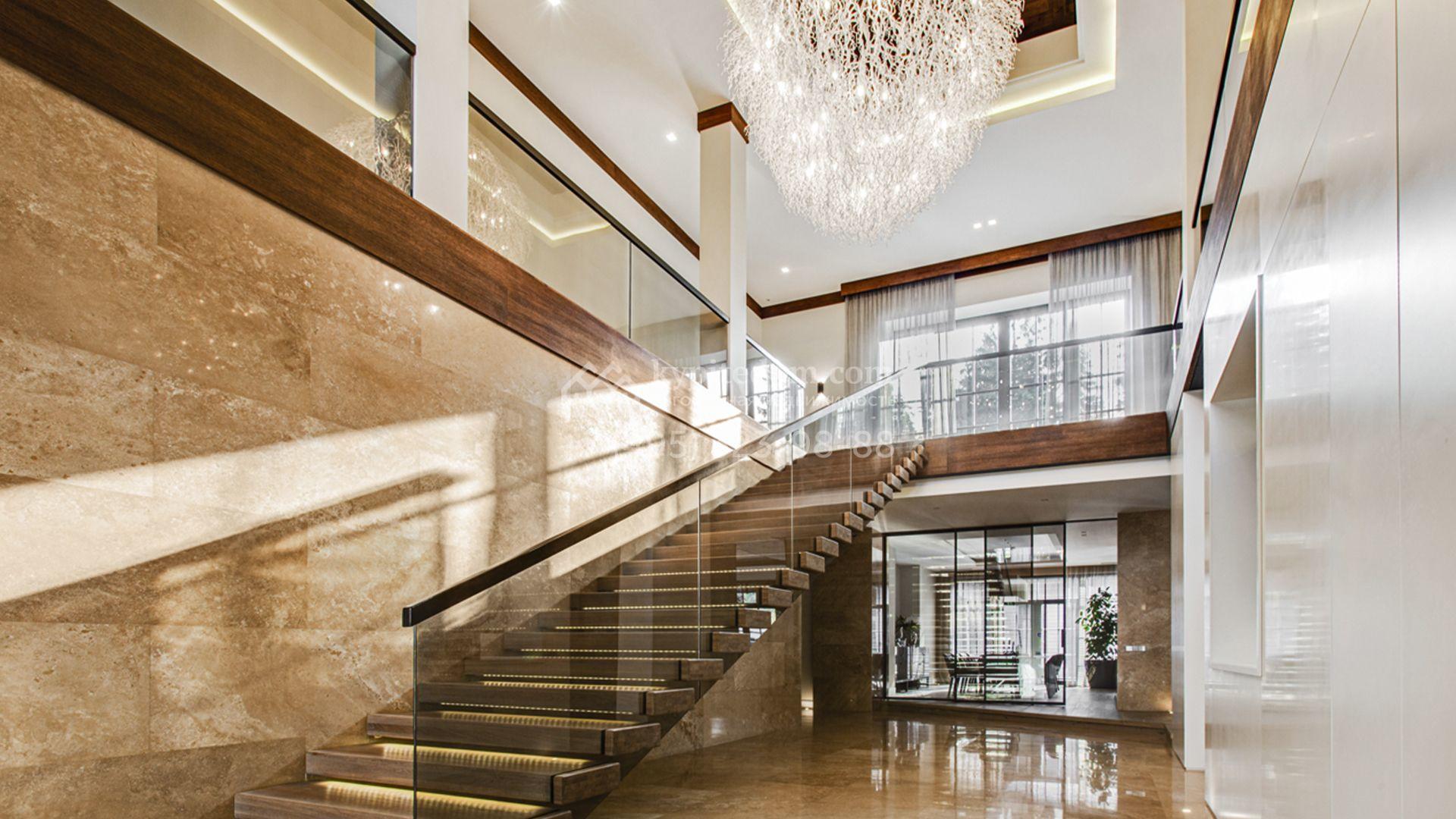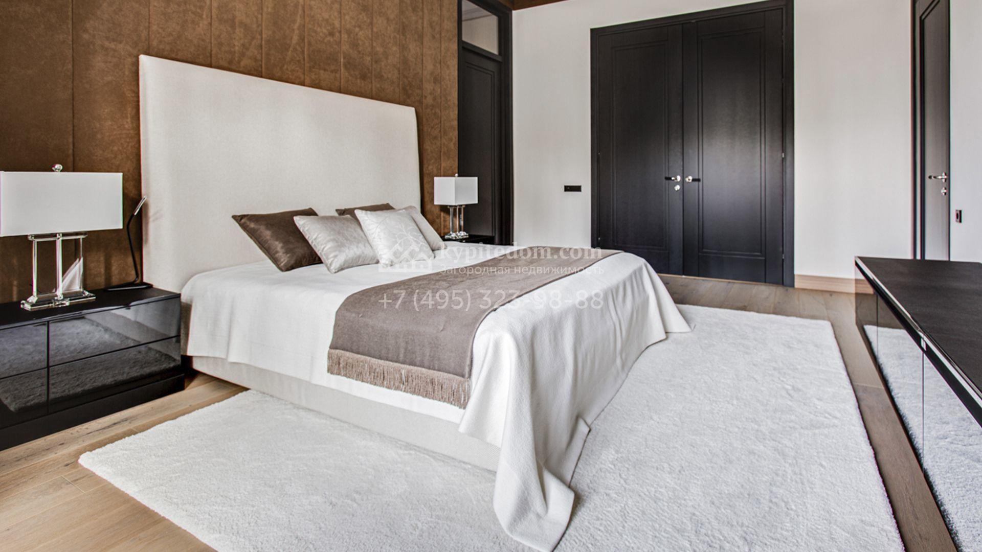 Светлые дизайнерские интерьеры отделаны с использованием натуральных мрамора, травертина и ценных пород дерева. На полу уложены инженерная доска Finex и плитка с подогревом. Коттедж укомплектован элегантной мебелью, техникой Miele и Liebherr и сантехникой Villeroy&Boch, а особую атмосферу формируют светильники Delta Light. Комфорт обеспечивают системы кондиционирования, приточно-вытяжной вентиляции Systemair и «умный дом» от Control 4.
