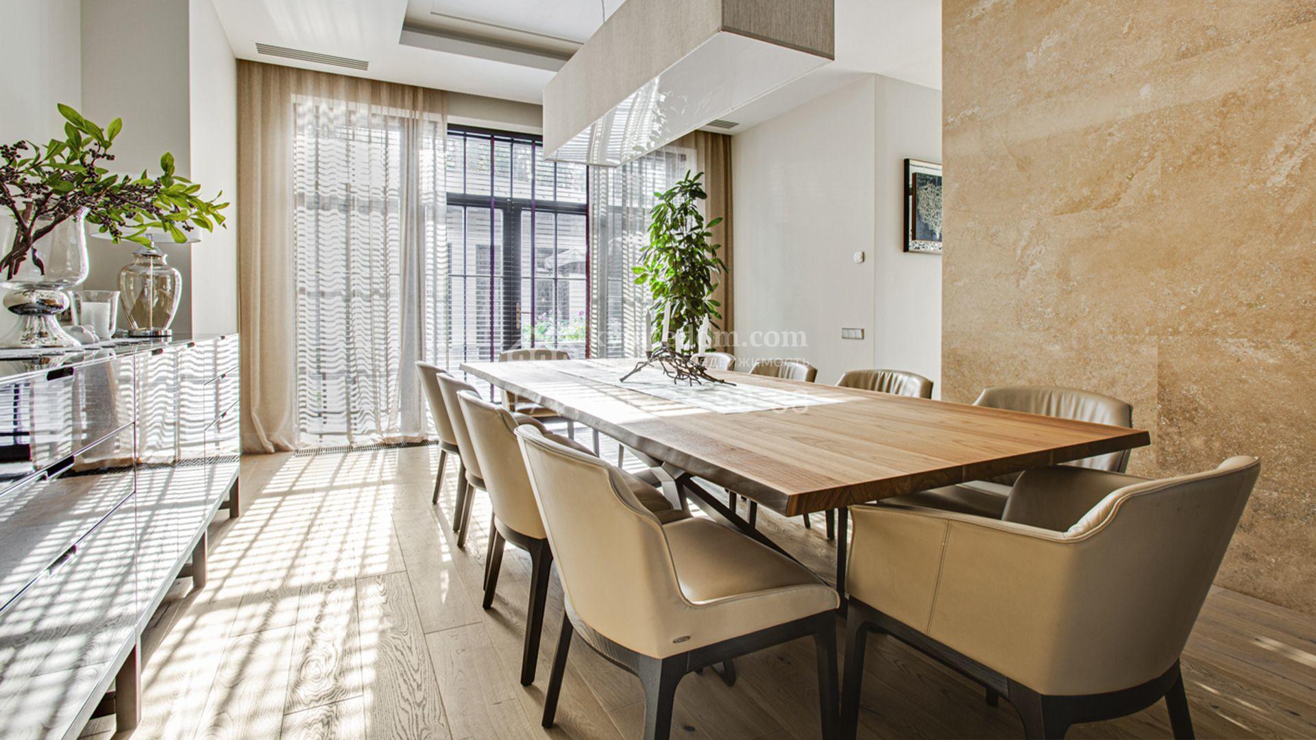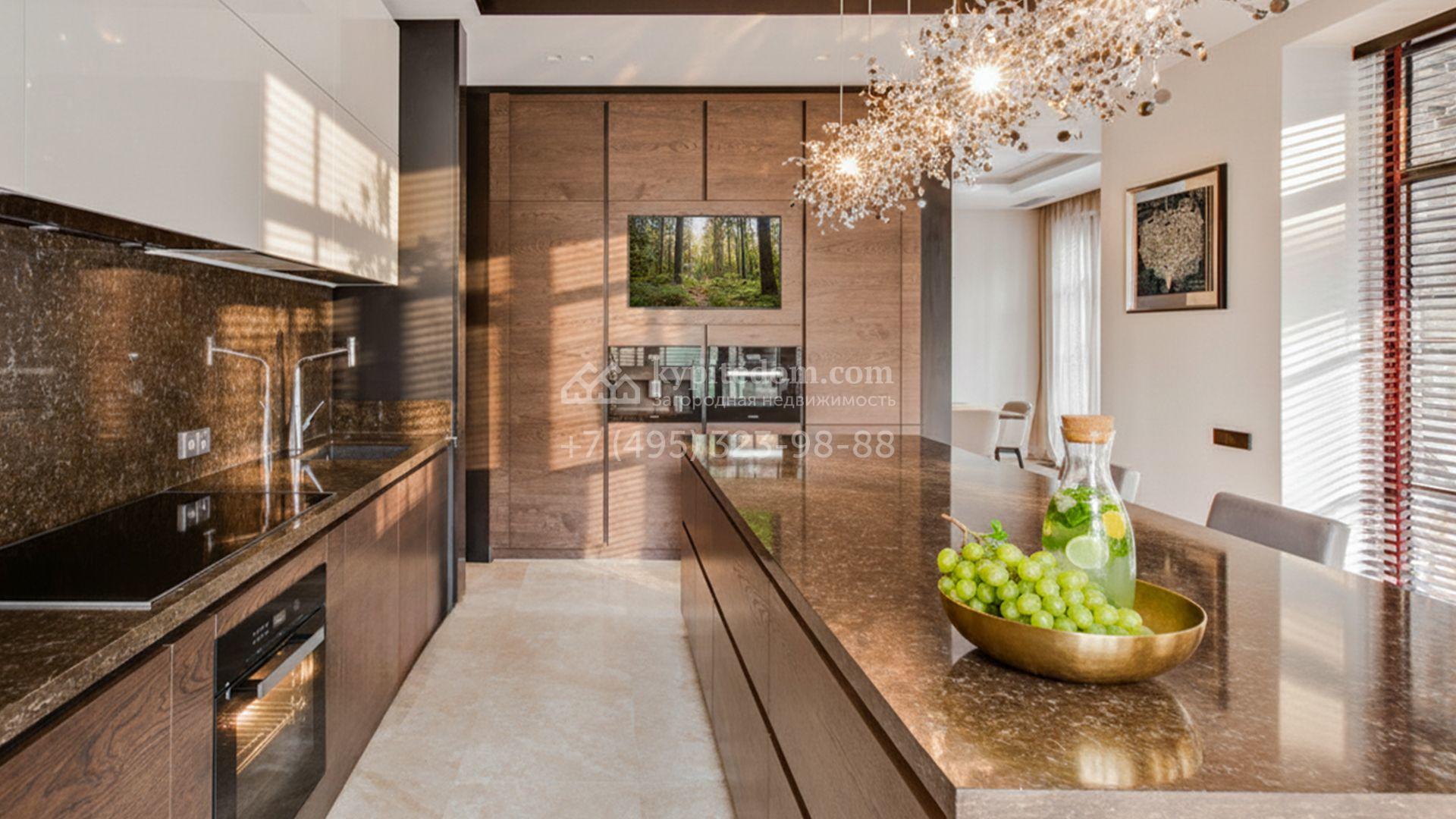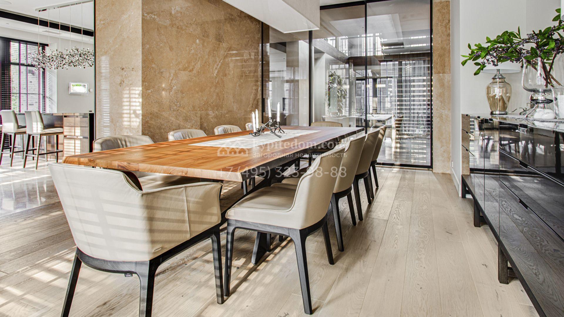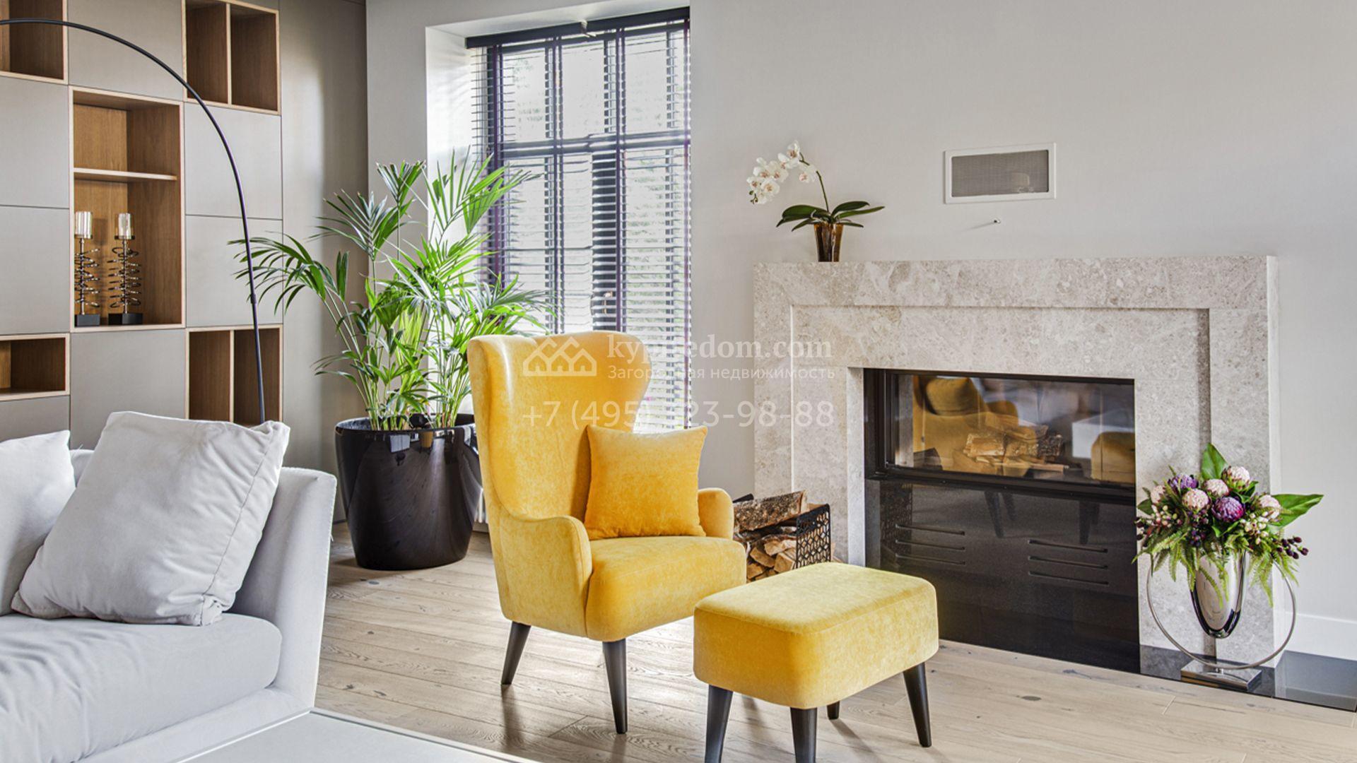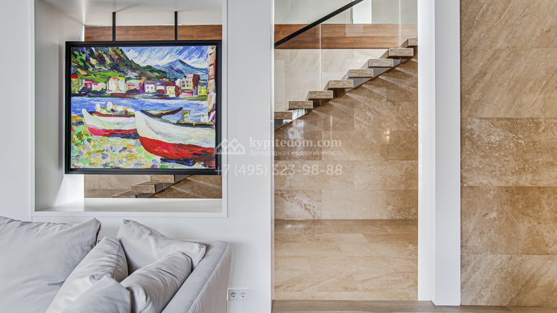 Светлые дизайнерские интерьеры отделаны с использованием натуральных мрамора, травертина и ценных пород дерева. На полу уложены инженерная доска Finex и плитка с подогревом. Коттедж укомплектован элегантной мебелью, техникой Miele и Liebherr и сантехникой Villeroy&Boch, а особую атмосферу формируют светильники Delta Light. Комфорт обеспечивают системы кондиционирования, приточно-вытяжной вентиляции Systemair и «умный дом» от Control 4.
