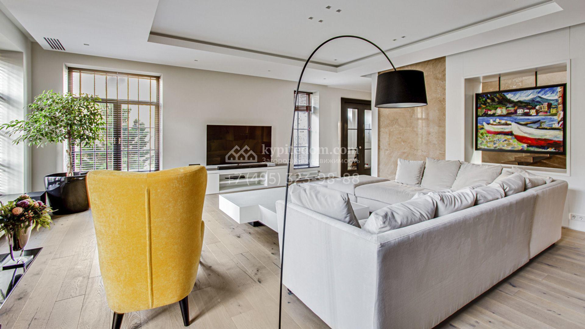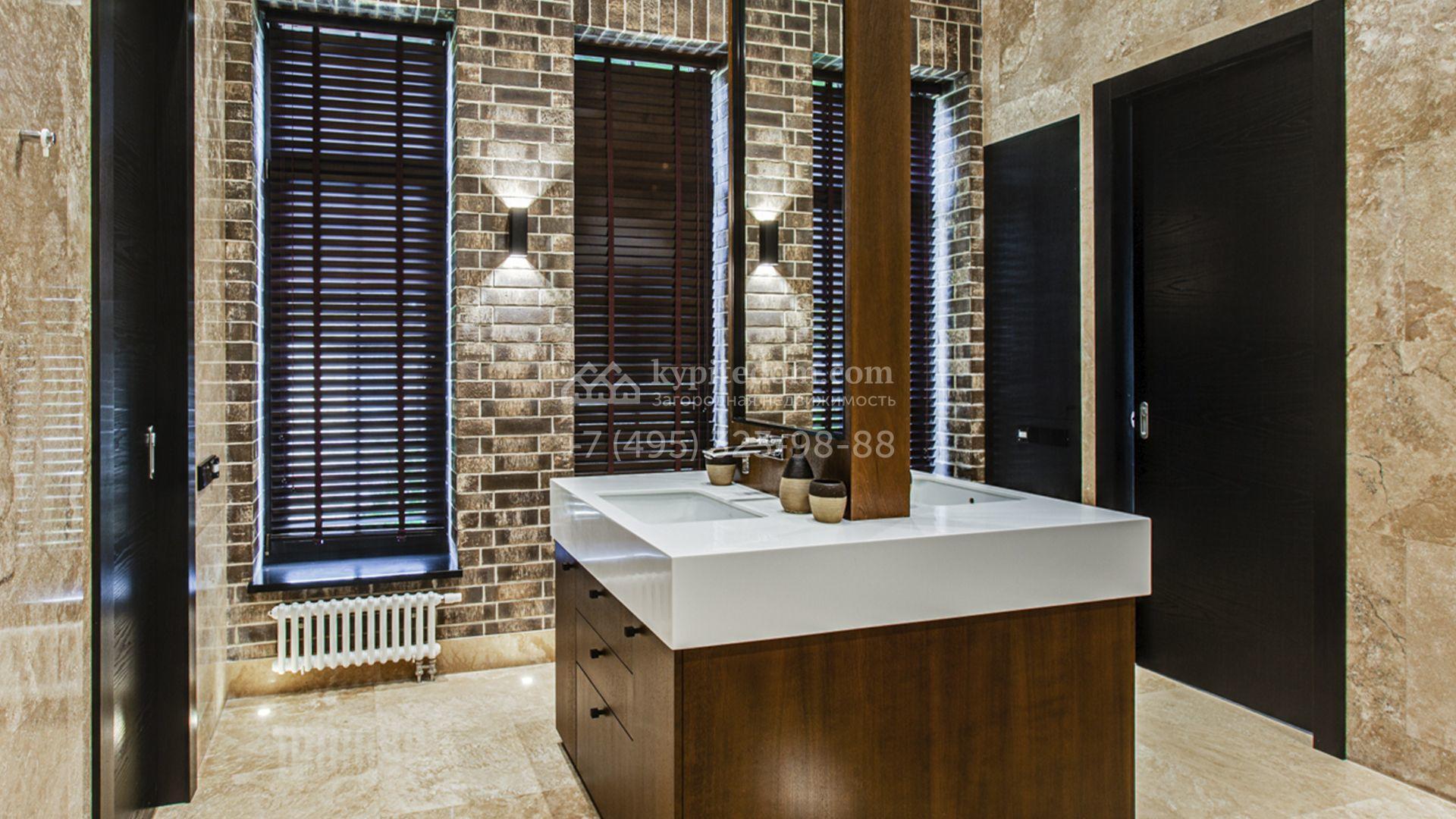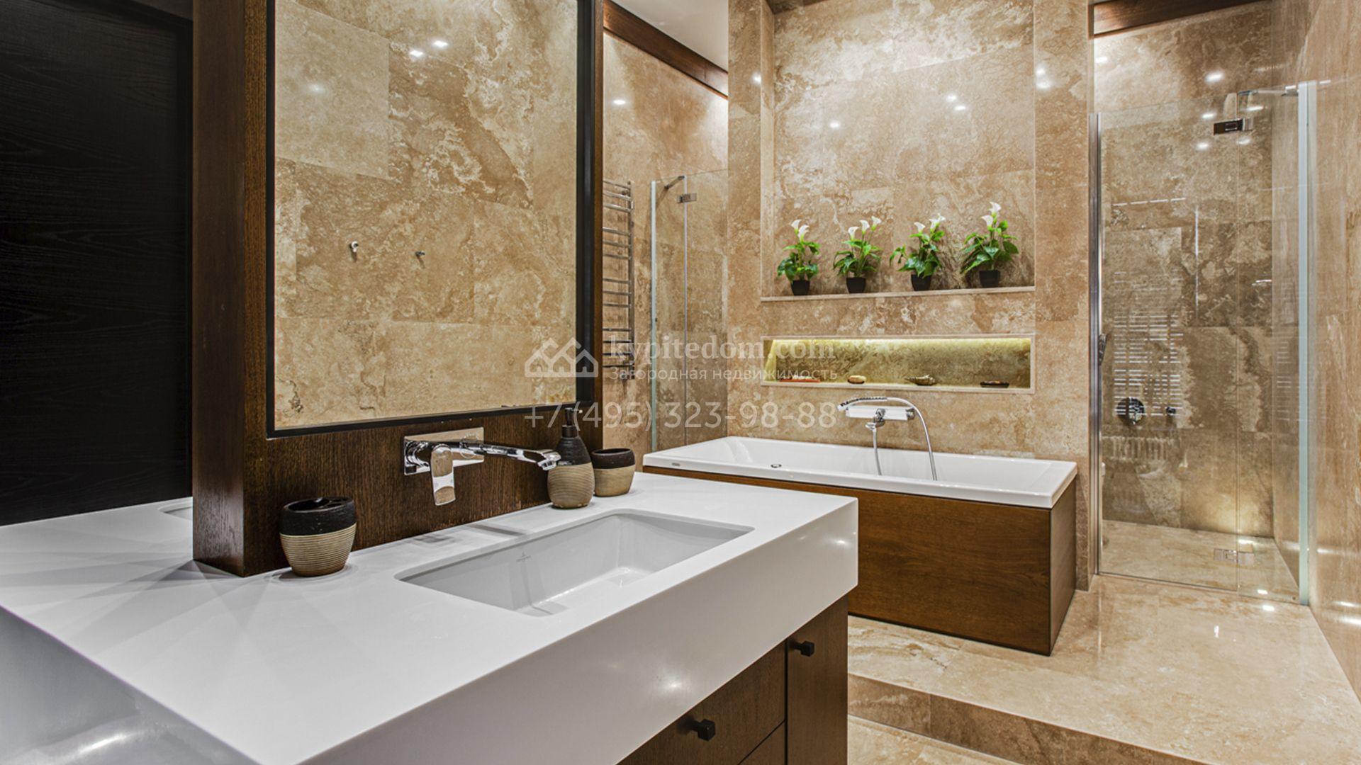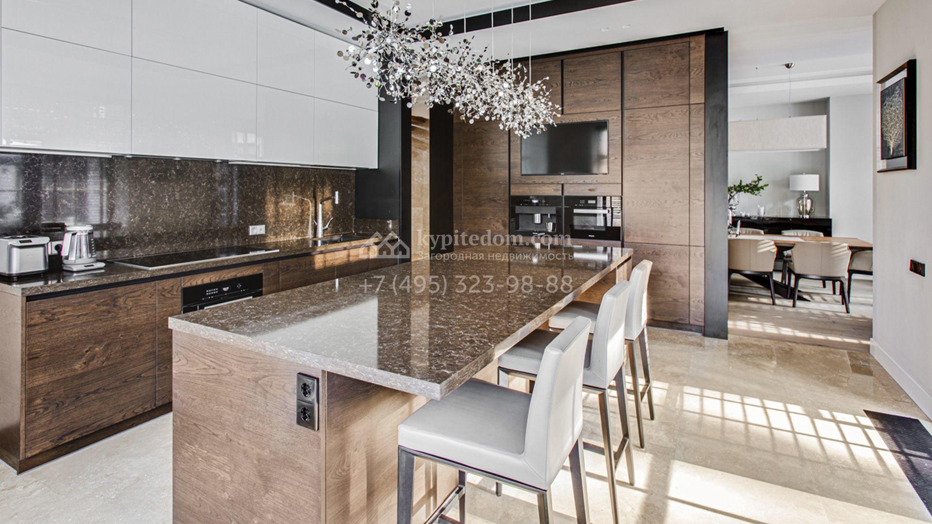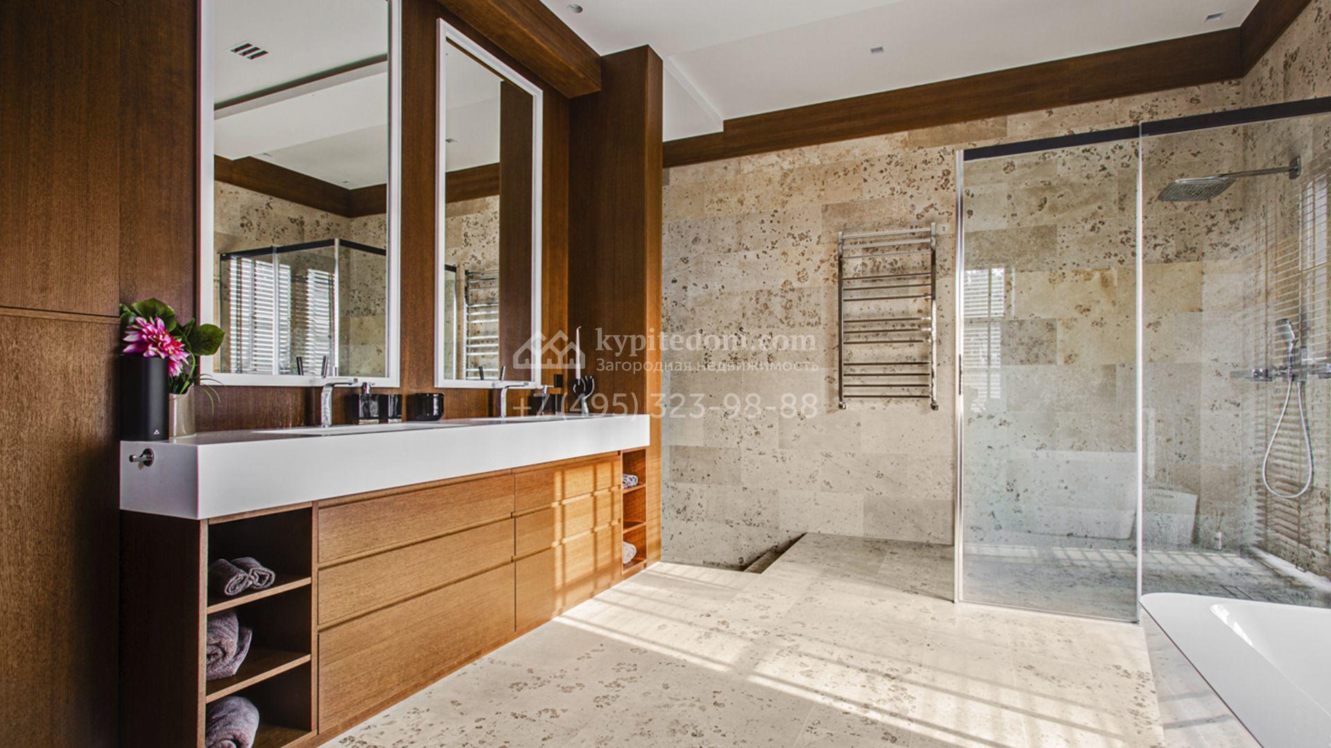 Светлые дизайнерские интерьеры отделаны с использованием натуральных мрамора, травертина и ценных пород дерева. На полу уложены инженерная доска Finex и плитка с подогревом. Коттедж укомплектован элегантной мебелью, техникой Miele и Liebherr и сантехникой Villeroy&Boch, а особую атмосферу формируют светильники Delta Light. Комфорт обеспечивают системы кондиционирования, приточно-вытяжной вентиляции Systemair и «умный дом» от Control 4.