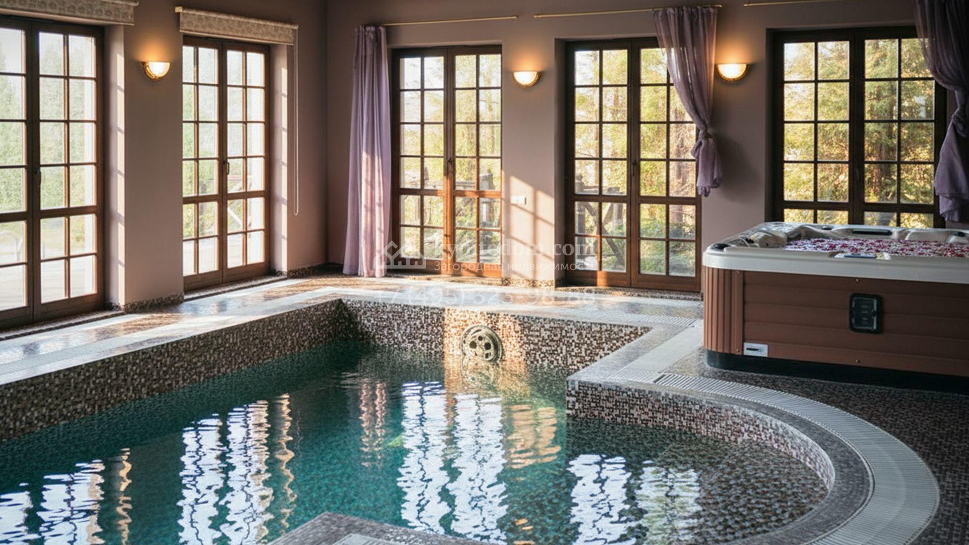 Планировка включает просторную гостиную с мраморным камином и возможностью установки домашнего кинотеатра, столовую, кухню с итальянским гарнитуром из натурального дерева и зимний сад с художественной росписью под стеклянным куполом. Для отдыха предусмотрены девять уютных спален, винотека-бильярдная и спа-зона с бассейном, джакузи, дровяной сауной и хаммамом.