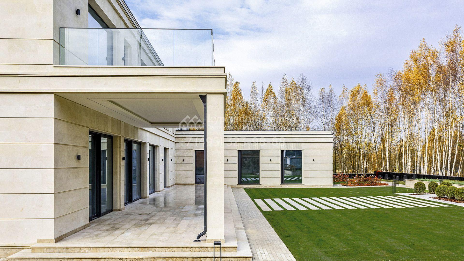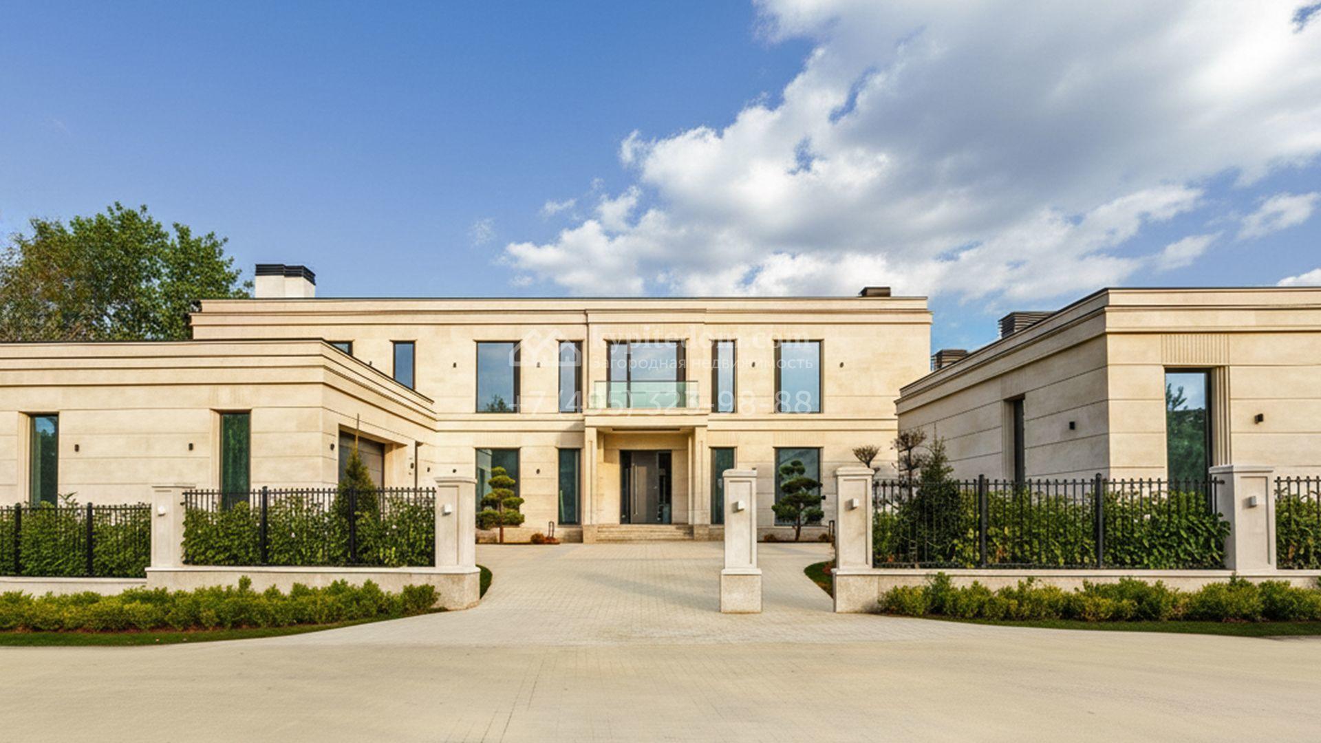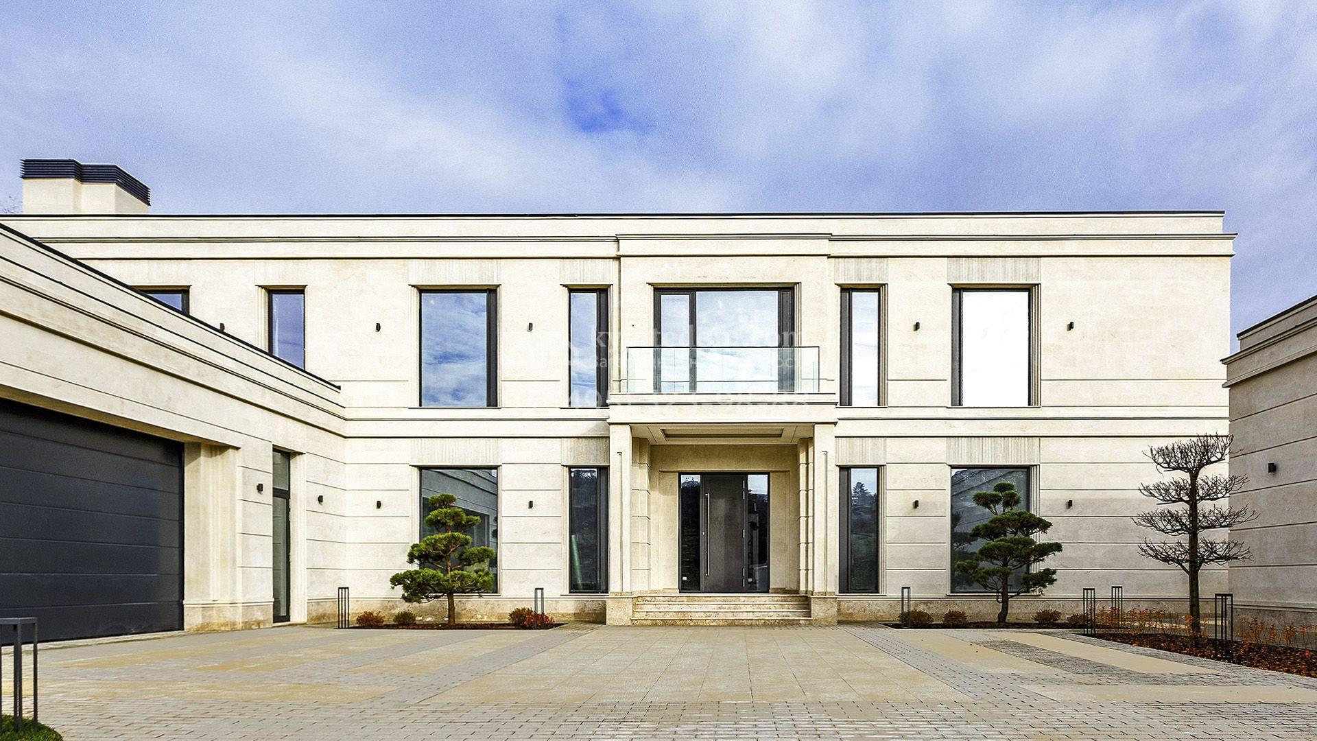 Загородный особняк площадью 1500 м² расположен на полевом участке 26 соток с живописными видами на берёзовую рощу. Фасад, выполненный в элегантном неоклассическом стиле, облицован благородной плиткой с фактурой камня и украшен изящными колоннами, а стильная подсветка эффектно подчёркивает лаконичную архитектуру здания с наступлением вечера.