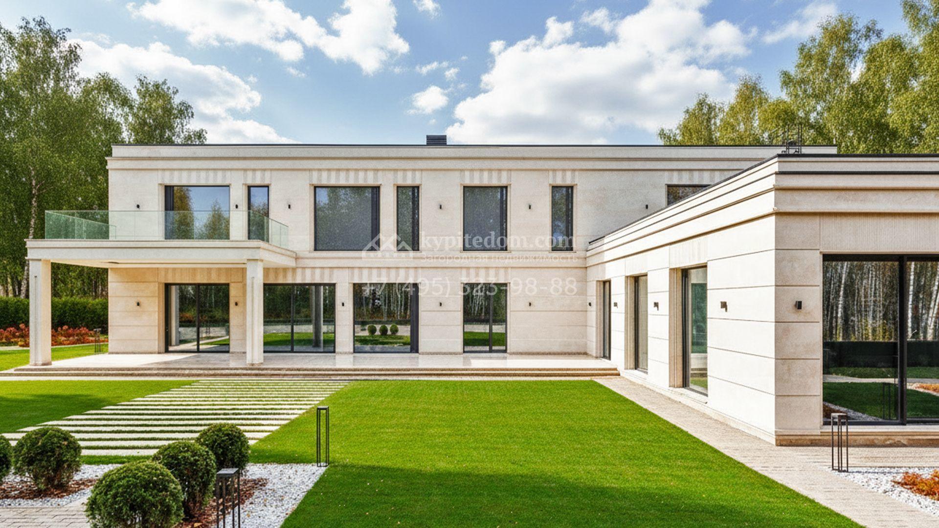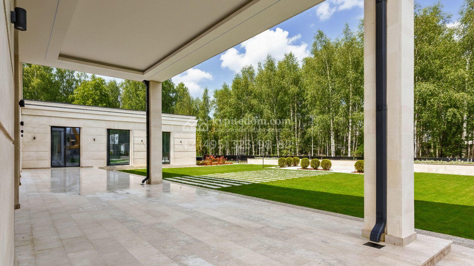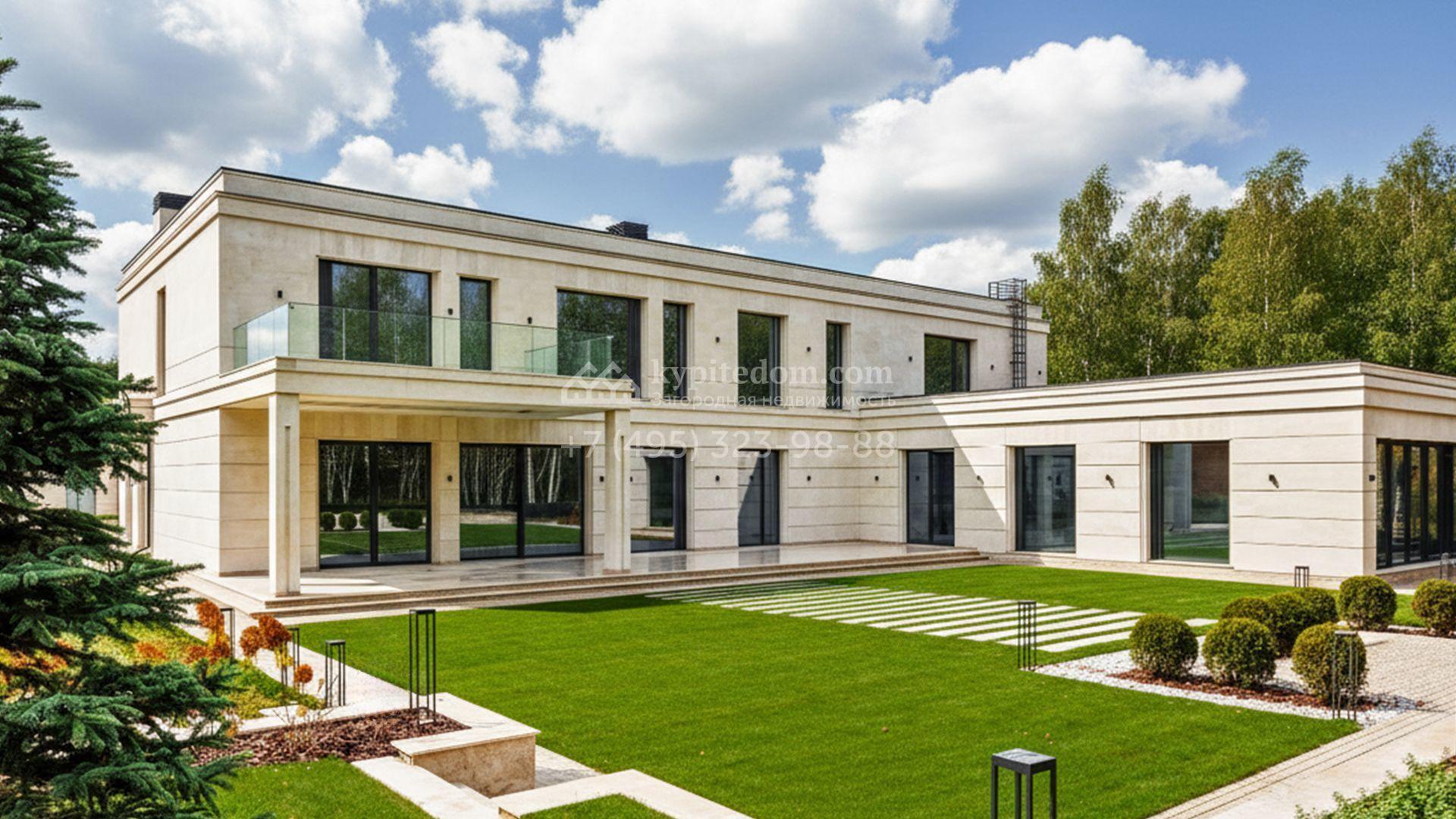 Загородный особняк площадью 1500 м² расположен на полевом участке 26 соток с живописными видами на берёзовую рощу. Фасад, выполненный в элегантном неоклассическом стиле, облицован благородной плиткой с фактурой камня и украшен изящными колоннами, а стильная подсветка эффектно подчёркивает лаконичную архитектуру здания с наступлением вечера.