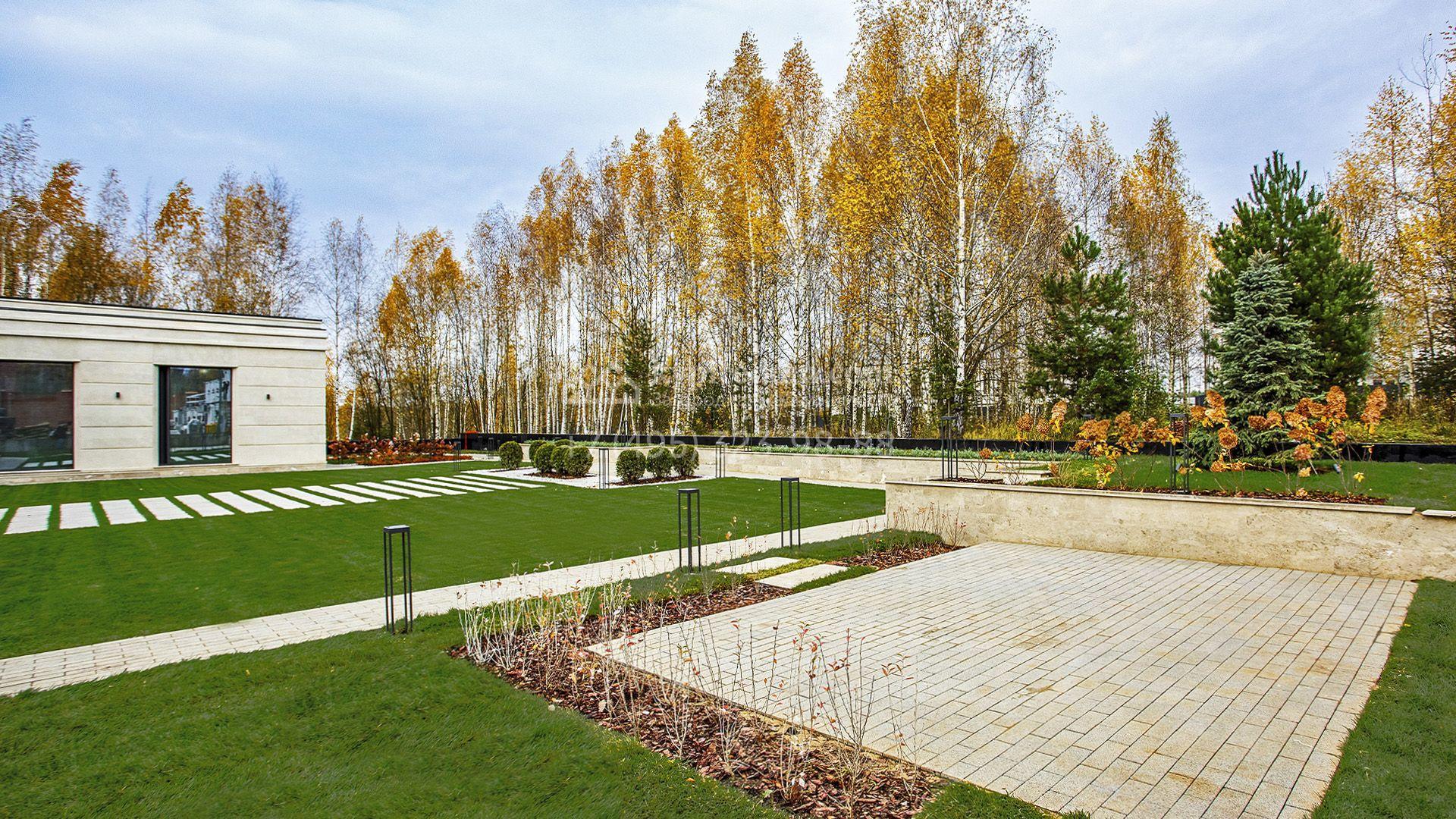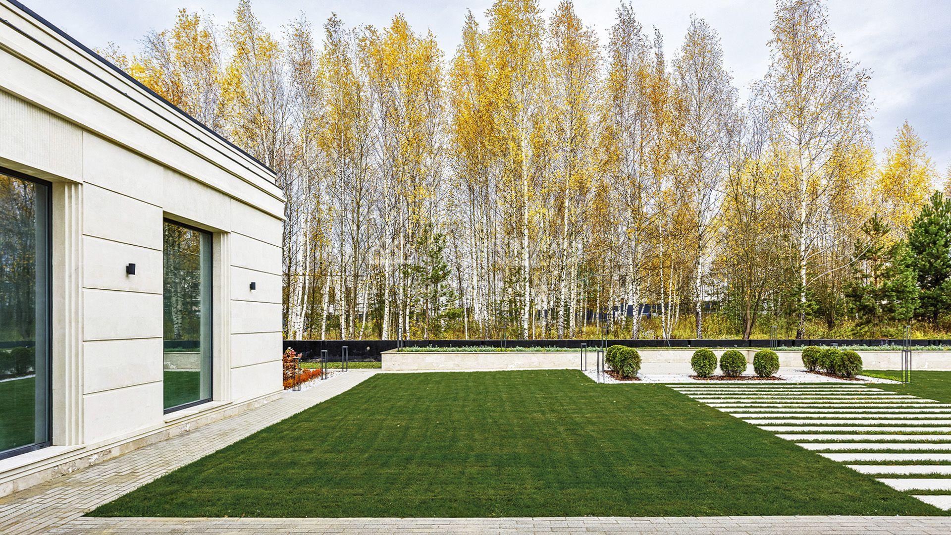 Дополнительным преимуществом стал отдельный дом для персонала площадью 85 м², где разместили кухню и две спальни. Благоустроенная территория участка радует глаз: здесь проложены гармонично вписанные в ландшафт дорожки, засеян аккуратный газон, высажены декоративные кустарники и фигурно подстриженные деревья, создавая умиротворённую и эстетичную атмосферу.