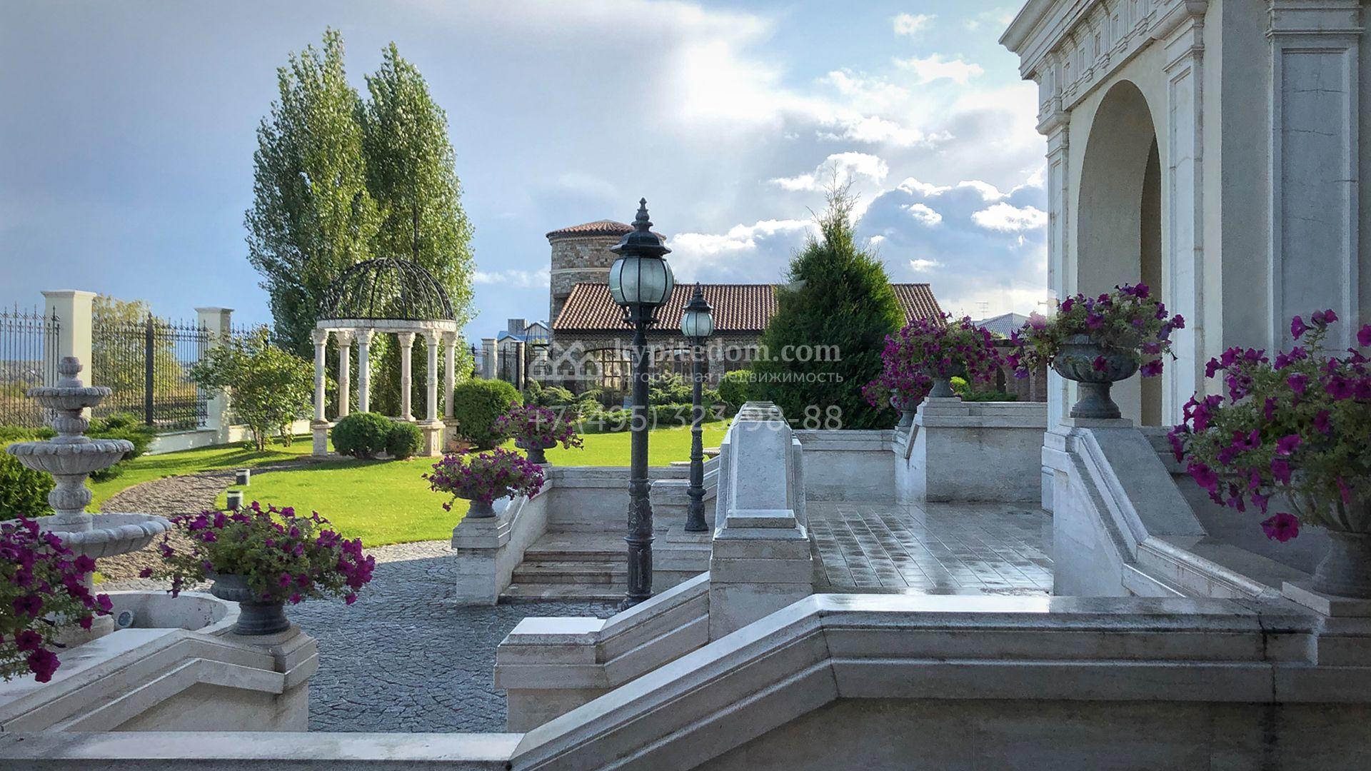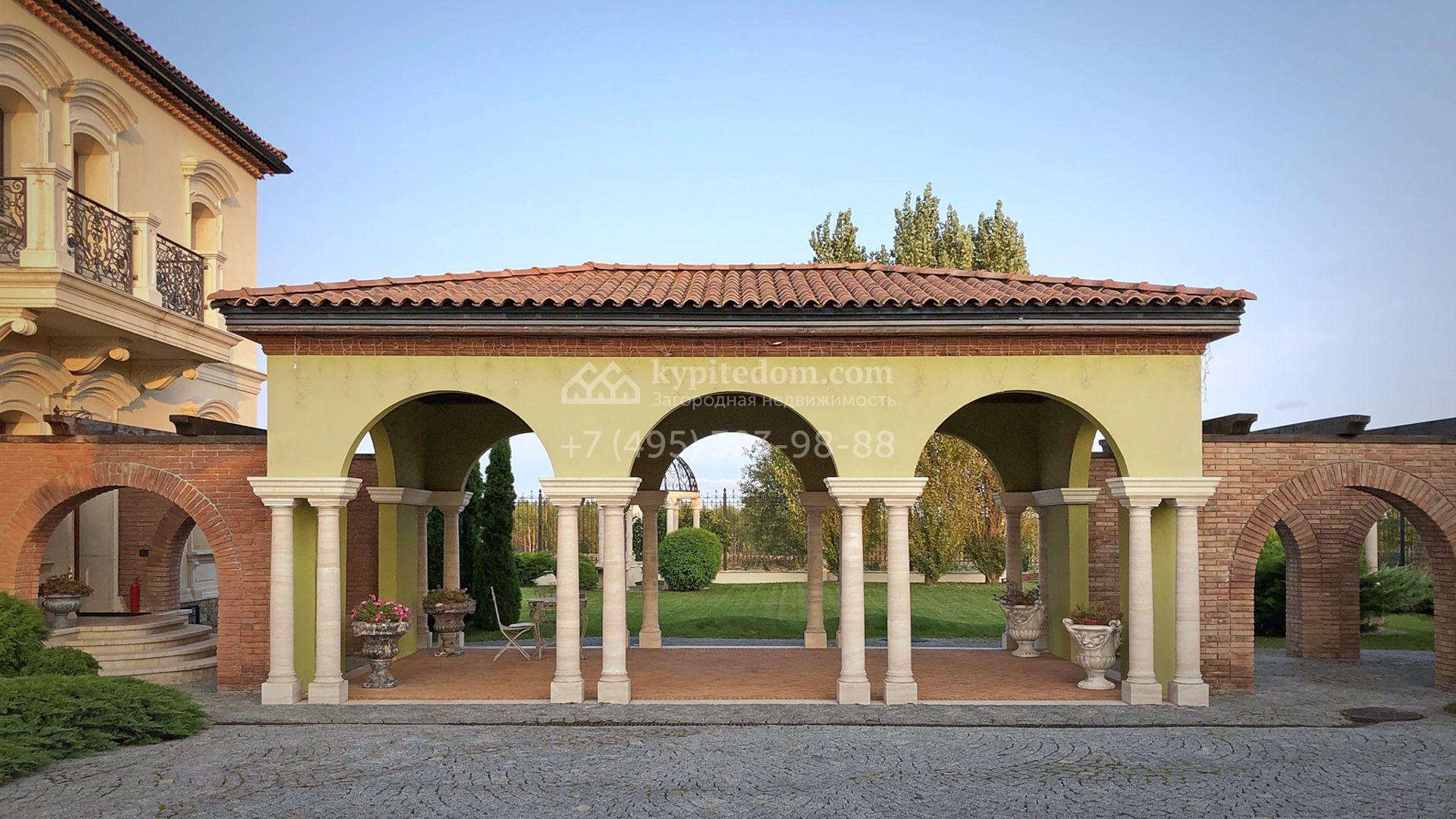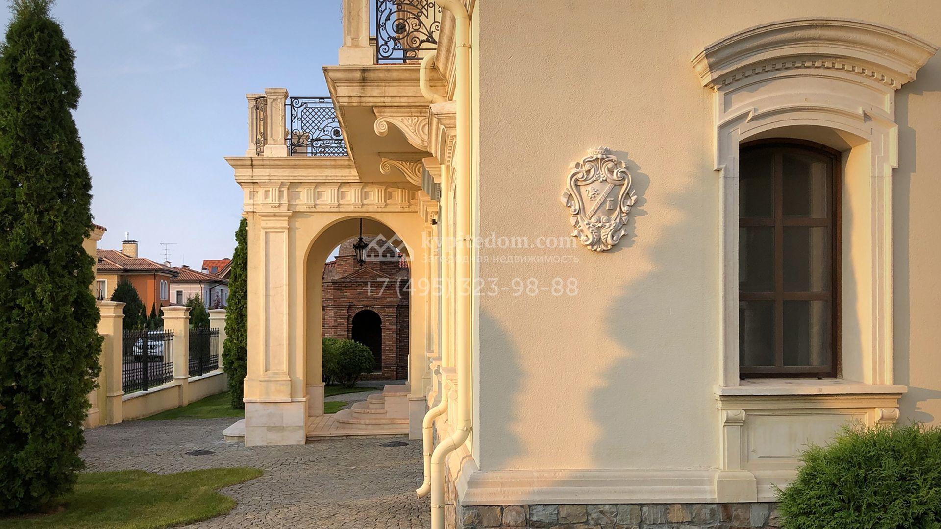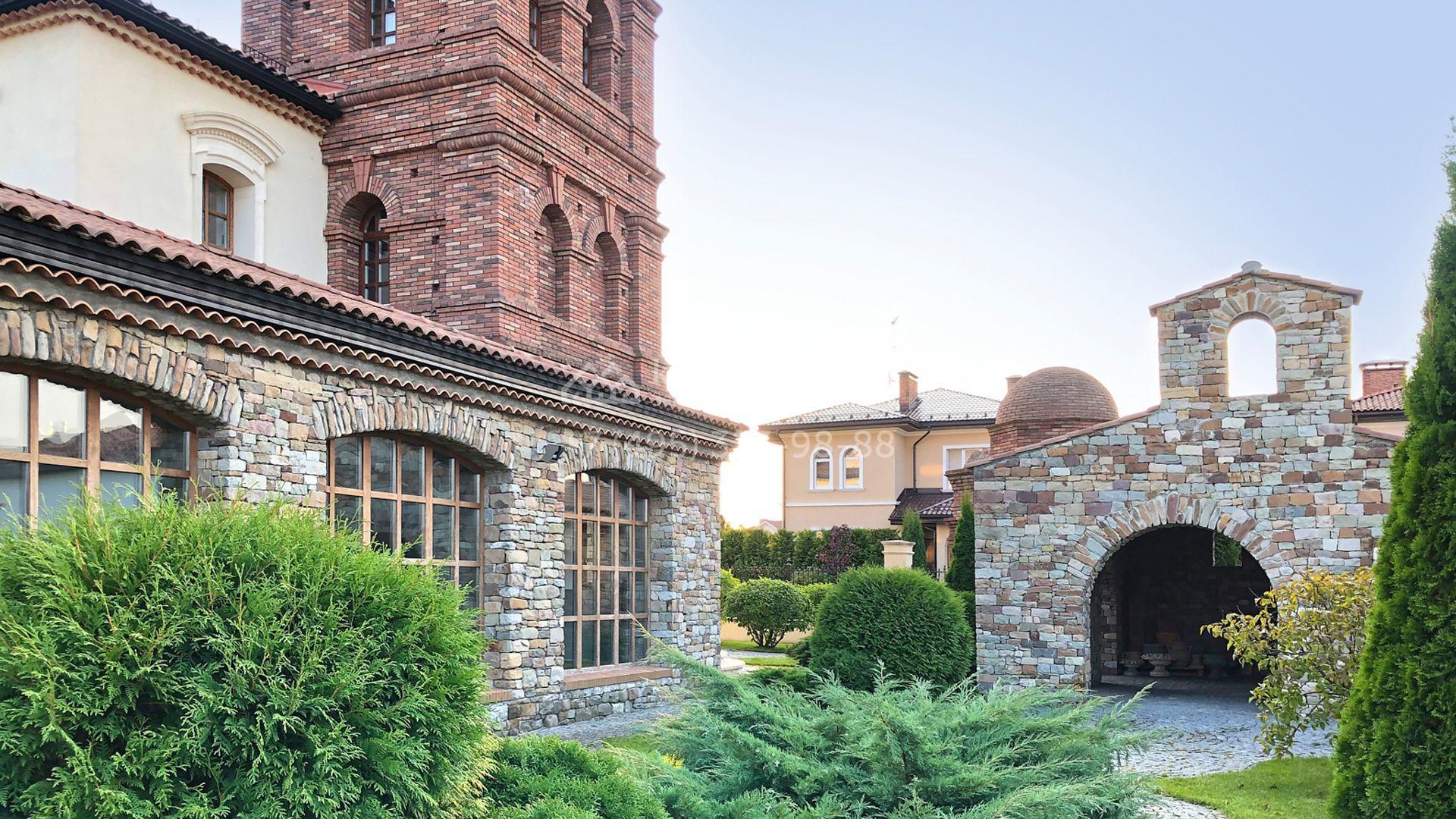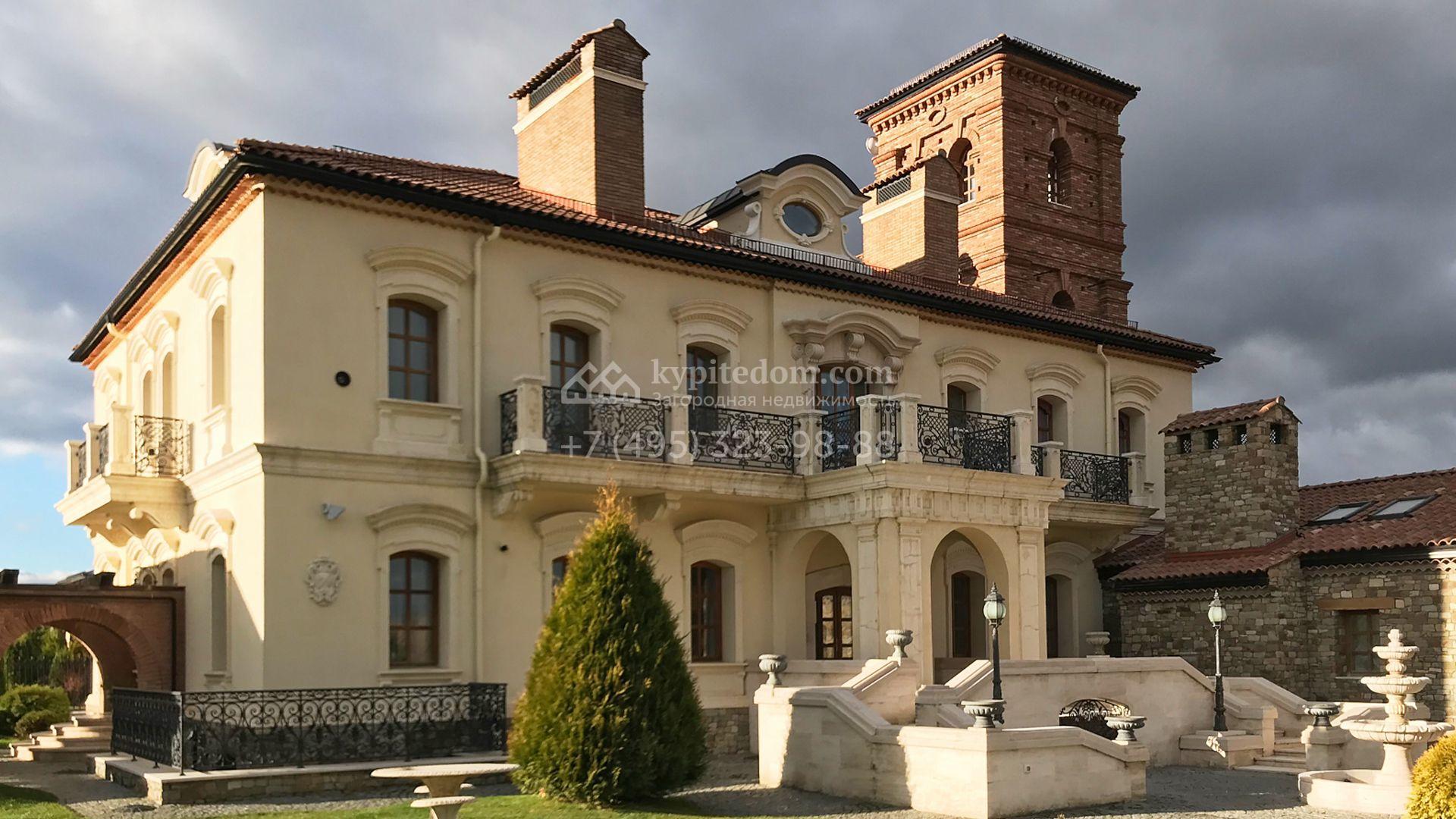 Загородная резиденция площадью 1500 м² построена на просторном полевом участке 32 сотки. Фасад здания с башней оформлен в итальянском стиле, облицован бежевой штукатуркой и украшен резными и коваными элементами. В отделке интерьера использованы травертин, гранит, дерево, а также интегрированы современные решения — стекло, ультрамодные световые технологии, системы хранения. Планировка дома включает двухсветный холл с фонтаном, 3 спальни, уютную гостиную с камином, объединенную со столовой, кухню, чайную комнату, кабинет-библиотеку, кинозал и террасу с уличным камином. Рядом с особняком расположены гараж на 1 машину, дом персонала и SPA-комплекс с бассейном. На участке выполнен ландшафтный дизайн, вымощена брусчастка, обустроена большая прогулочная зона с привезёнными из Италии деревьями.