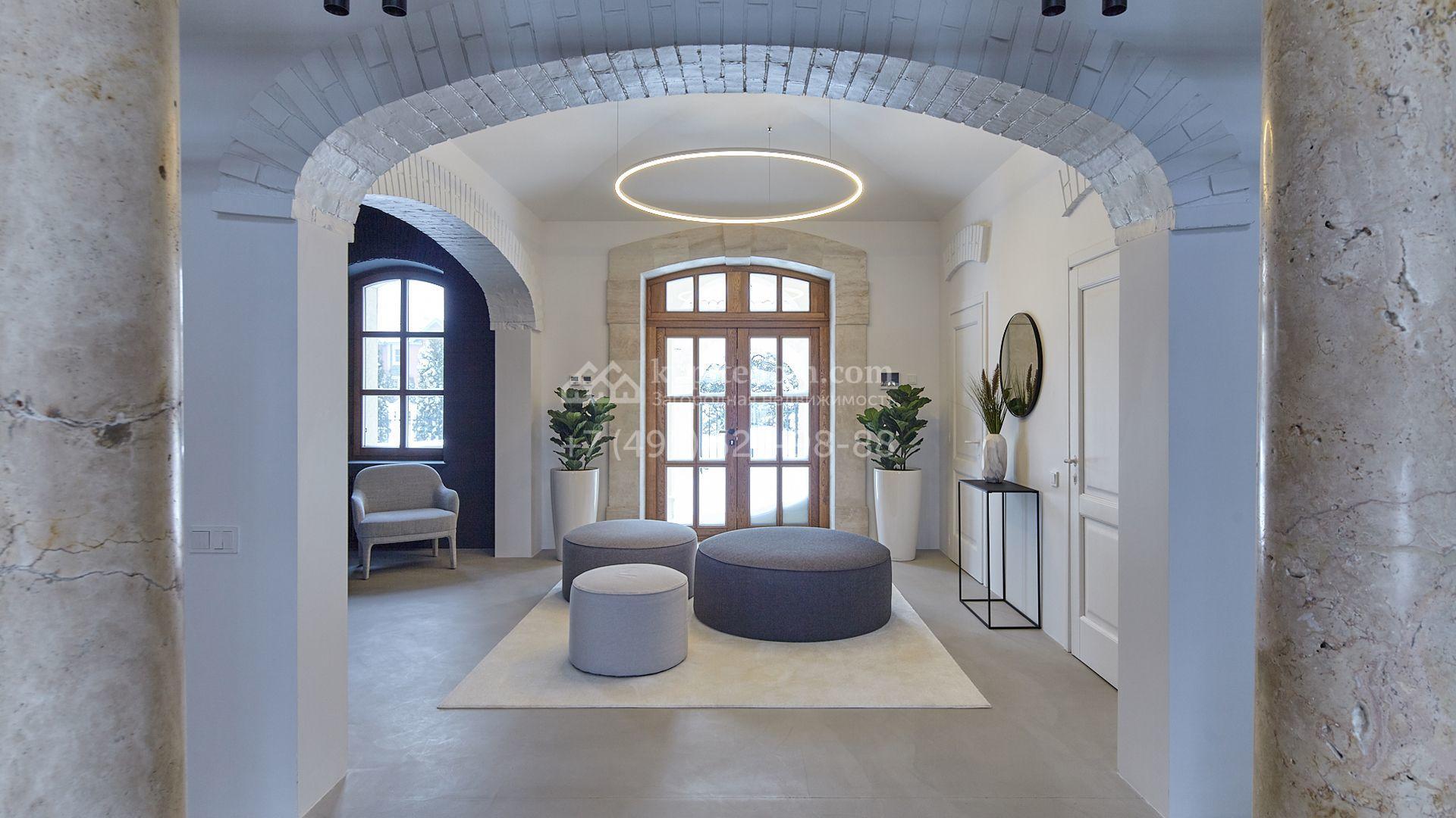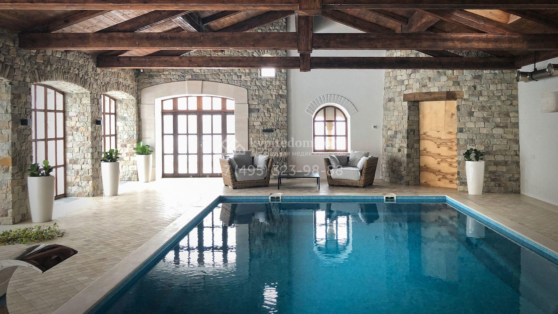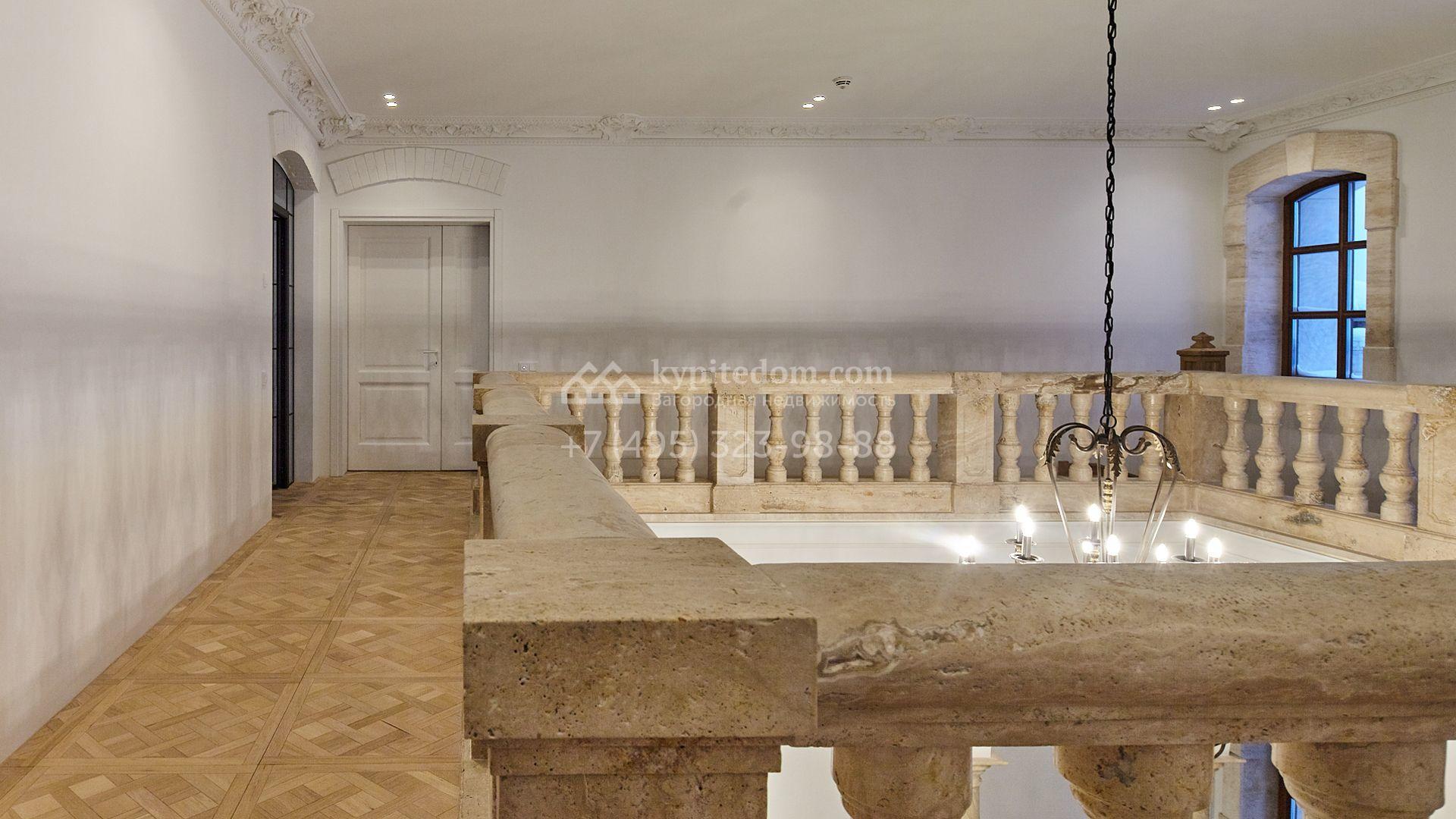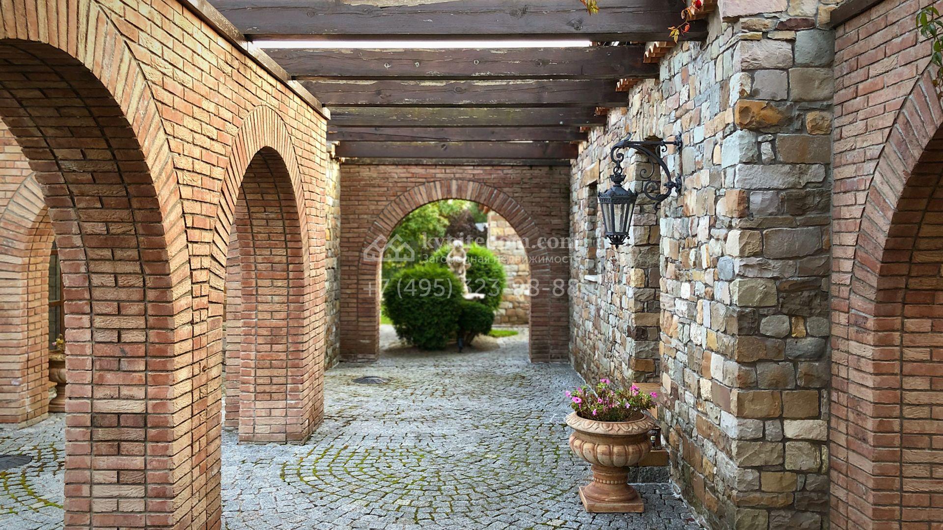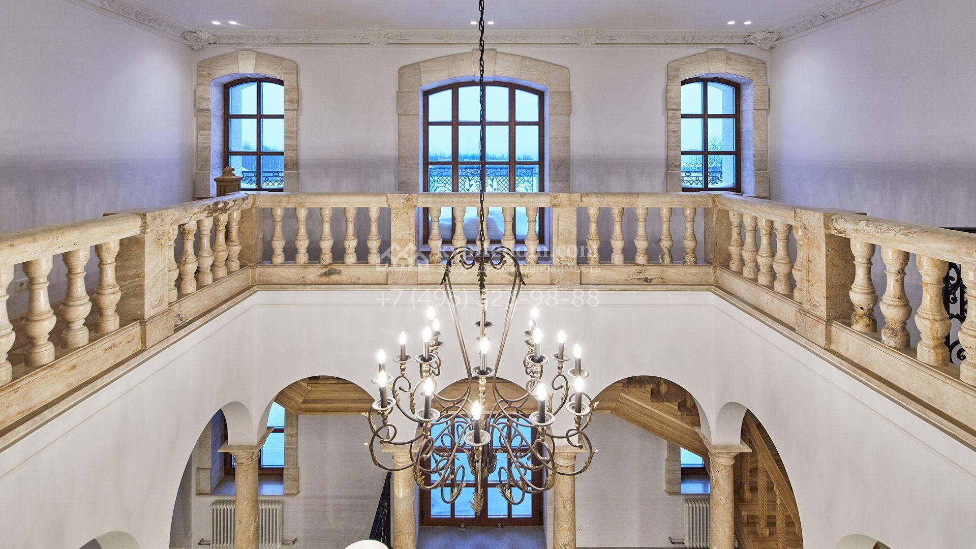 Загородная резиденция площадью 1500 м² построена на просторном полевом участке 32 сотки. Фасад здания с башней оформлен в итальянском стиле, облицован бежевой штукатуркой и украшен резными и коваными элементами. В отделке интерьера использованы травертин, гранит, дерево, а также интегрированы современные решения — стекло, ультрамодные световые технологии, системы хранения. Планировка дома включает двухсветный холл с фонтаном, 3 спальни, уютную гостиную с камином, объединенную со столовой, кухню, чайную комнату, кабинет-библиотеку, кинозал и террасу с уличным камином. Рядом с особняком расположены гараж на 1 машину, дом персонала и SPA-комплекс с бассейном. На участке выполнен ландшафтный дизайн, вымощена брусчастка, обустроена большая прогулочная зона с привезёнными из Италии деревьями.