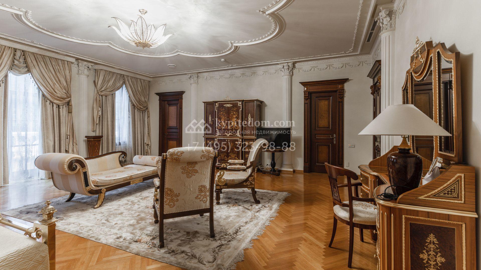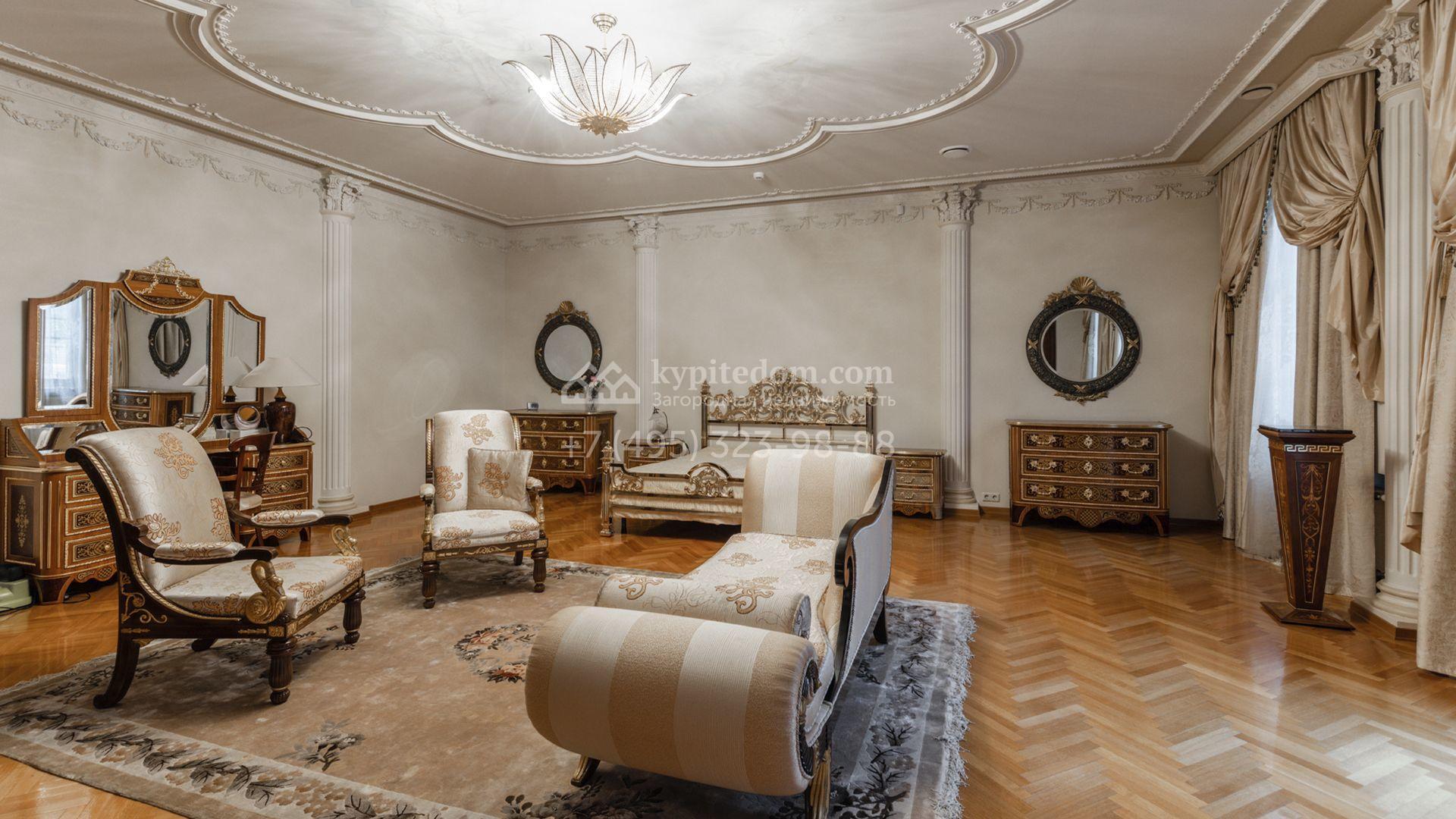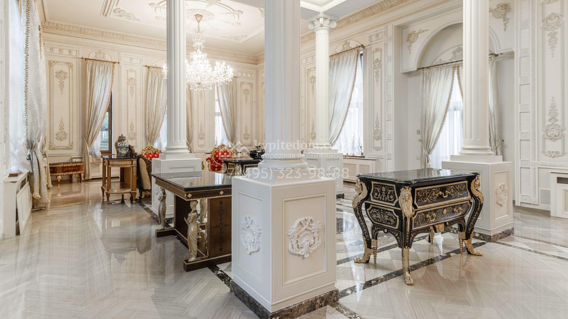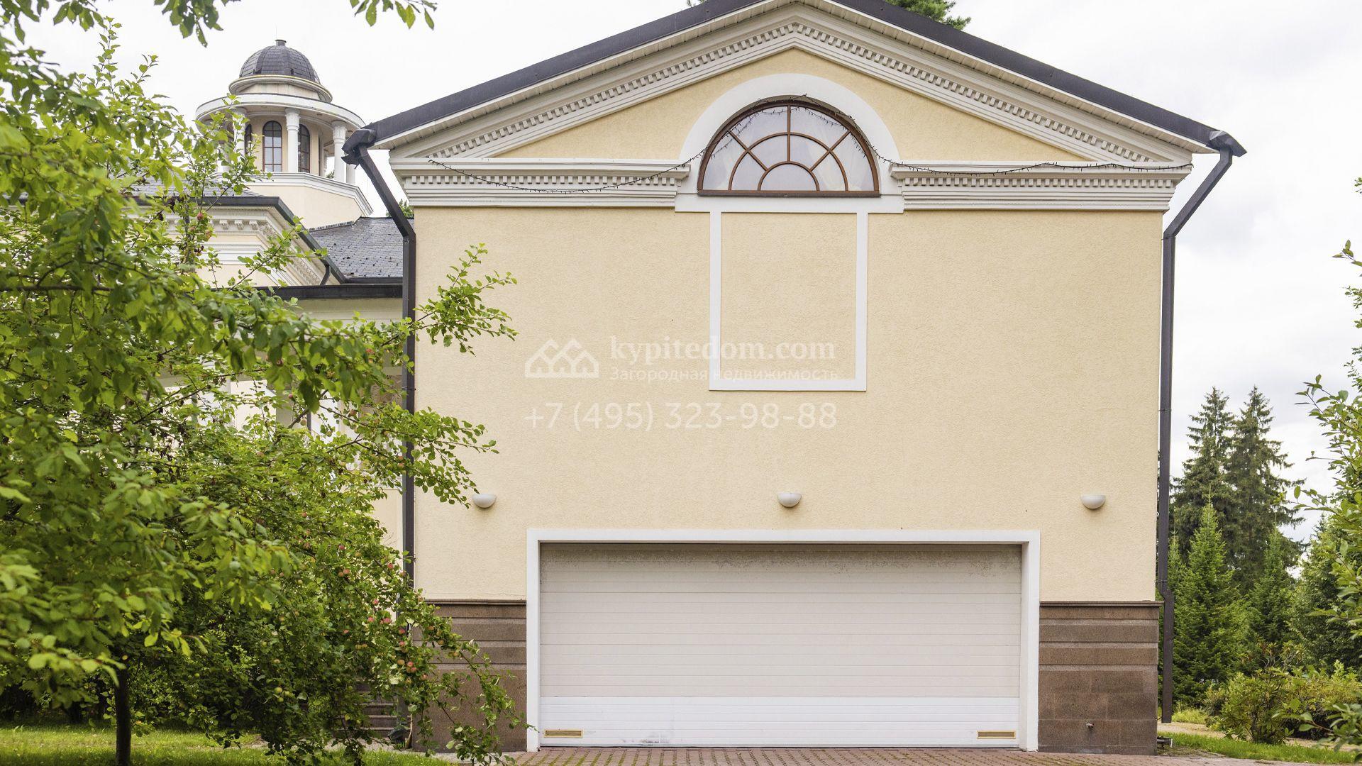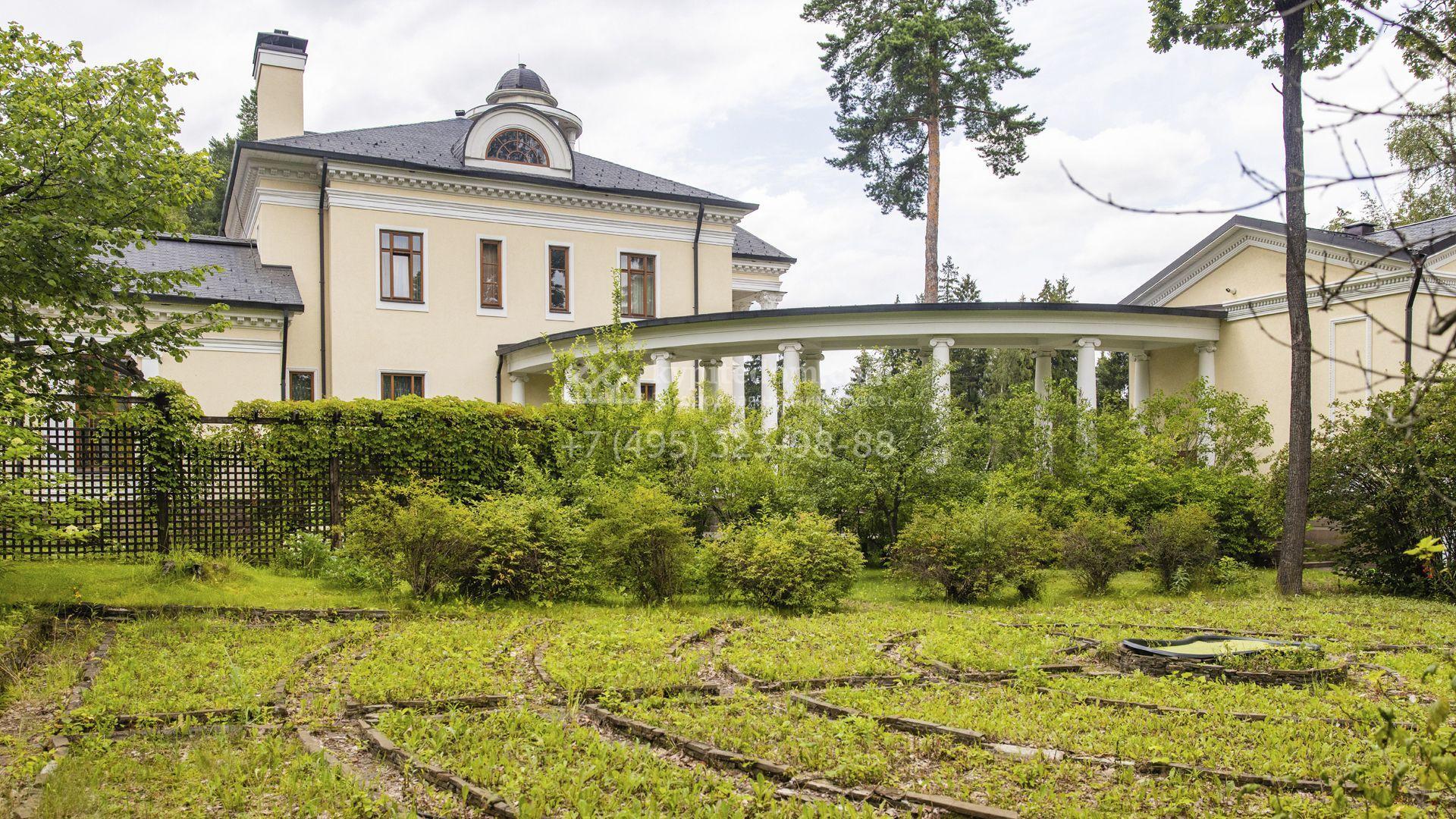 Внутреннее пространство включает шесть спален, гостиную с камином, кухню, столовую, кабинет, кинотеатр, бассейн и сауну. Симметрию ансамбля поддерживают две колоннады, завершённые зданиями с отапливаемыми гаражами на два автомобиля и квартирой для персонала. Дополнительно предусмотрен отдельный гараж на три машины. Участок с прудом оформлен в едином ландшафтном стиле — проложены дорожки, установлено декоративное освещение, обустроены беседка с зоной барбекю и детская площадка.