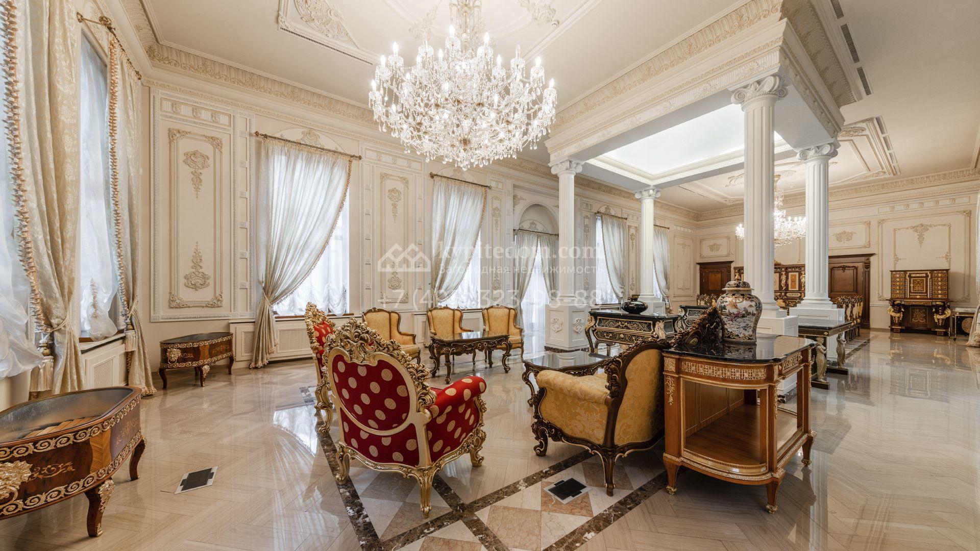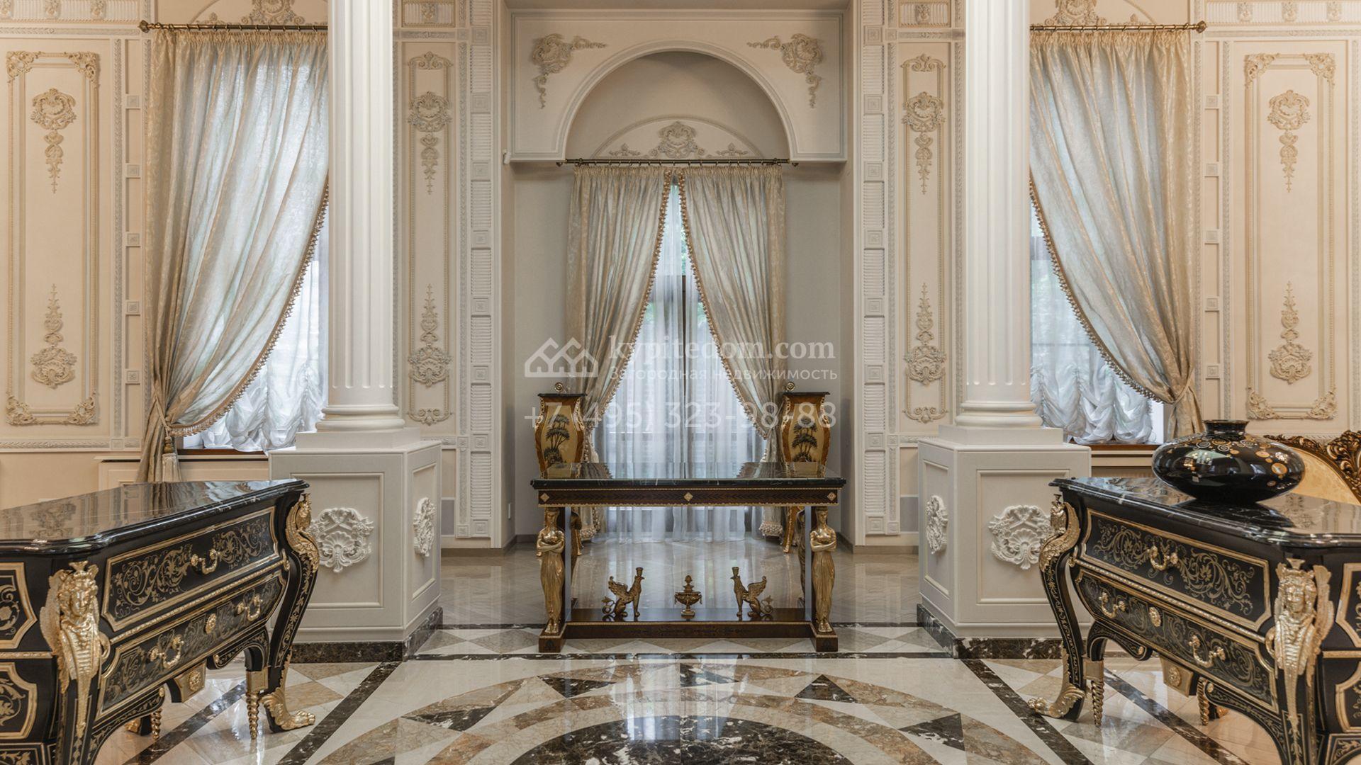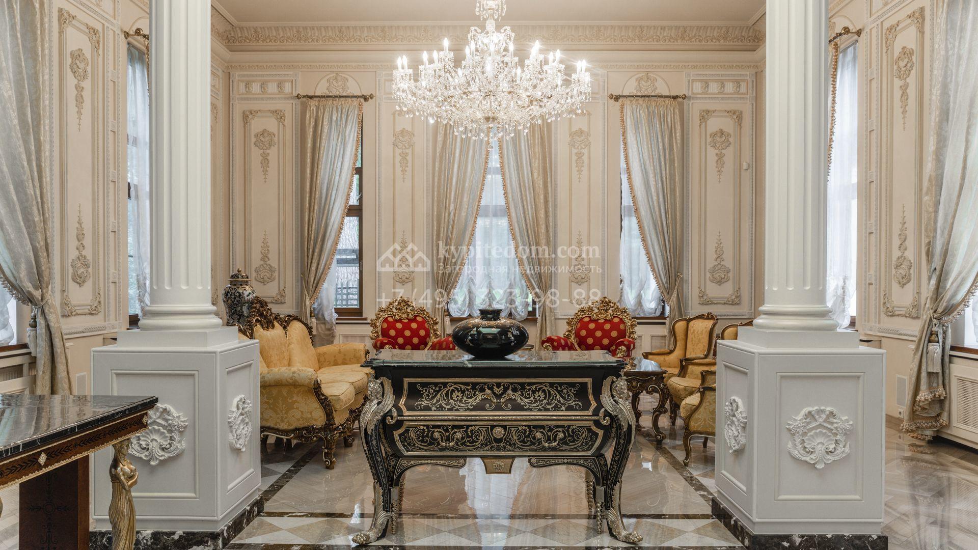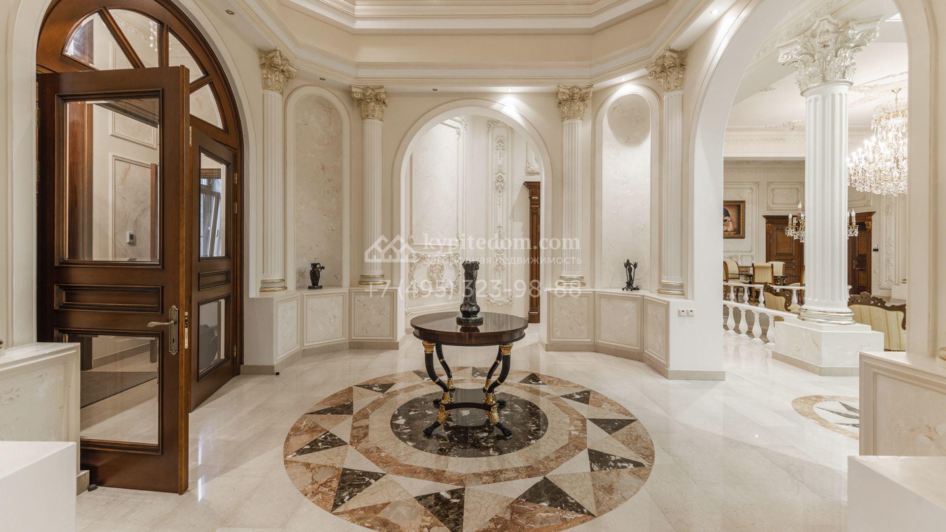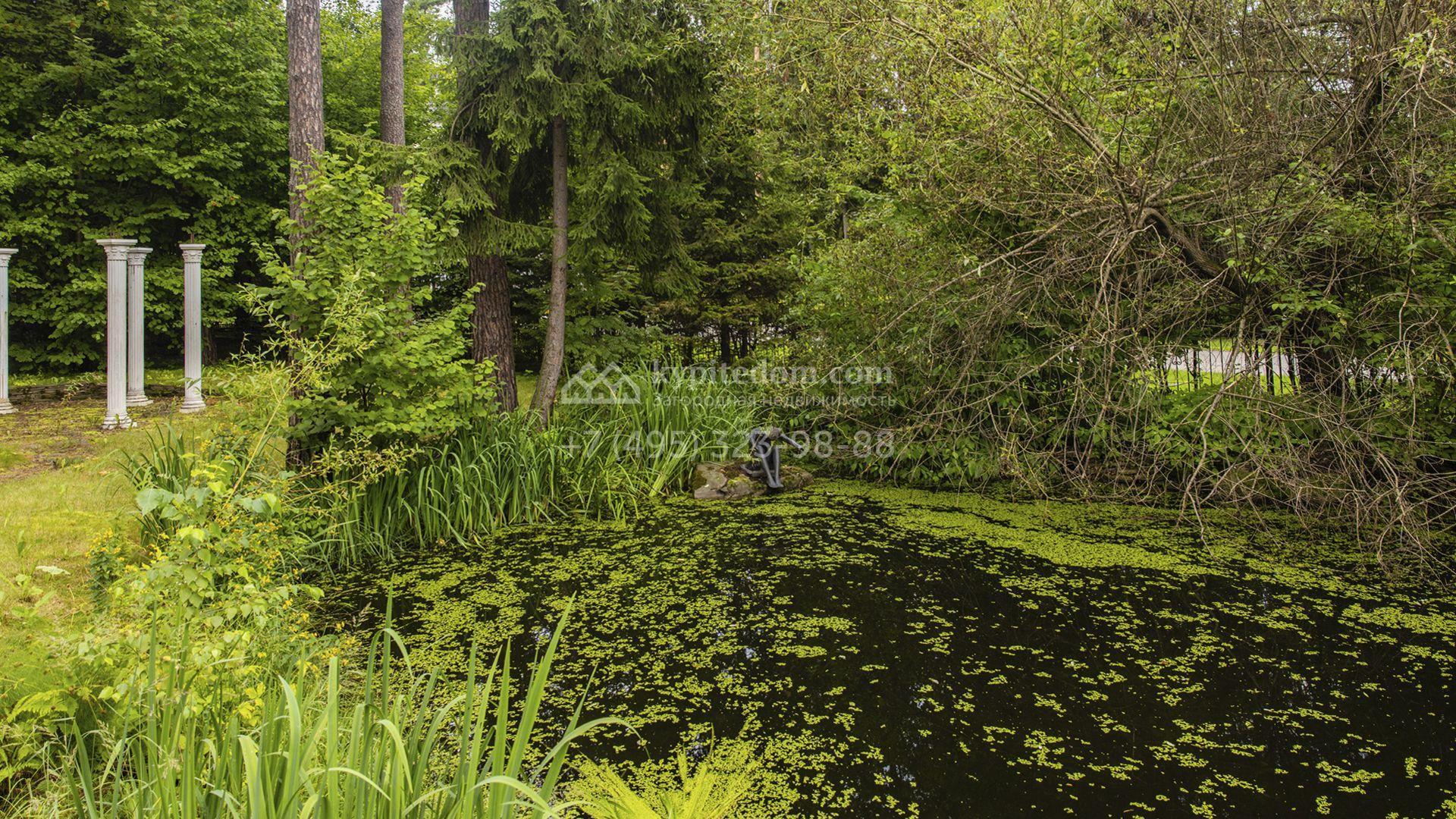 Внутреннее пространство включает шесть спален, гостиную с камином, кухню, столовую, кабинет, кинотеатр, бассейн и сауну. Симметрию ансамбля поддерживают две колоннады, завершённые зданиями с отапливаемыми гаражами на два автомобиля и квартирой для персонала. Дополнительно предусмотрен отдельный гараж на три машины. Участок с прудом оформлен в едином ландшафтном стиле — проложены дорожки, установлено декоративное освещение, обустроены беседка с зоной барбекю и детская площадка.