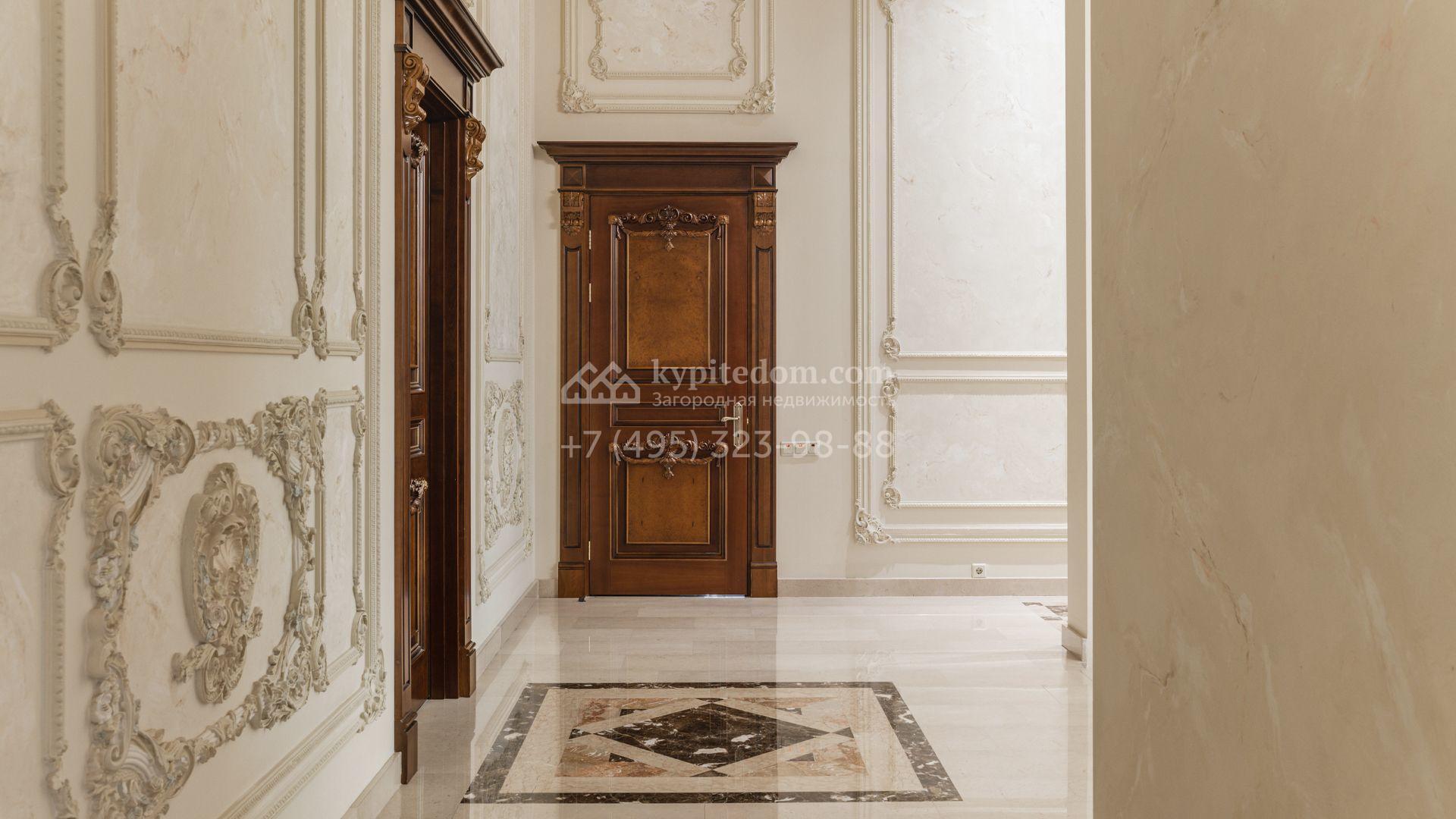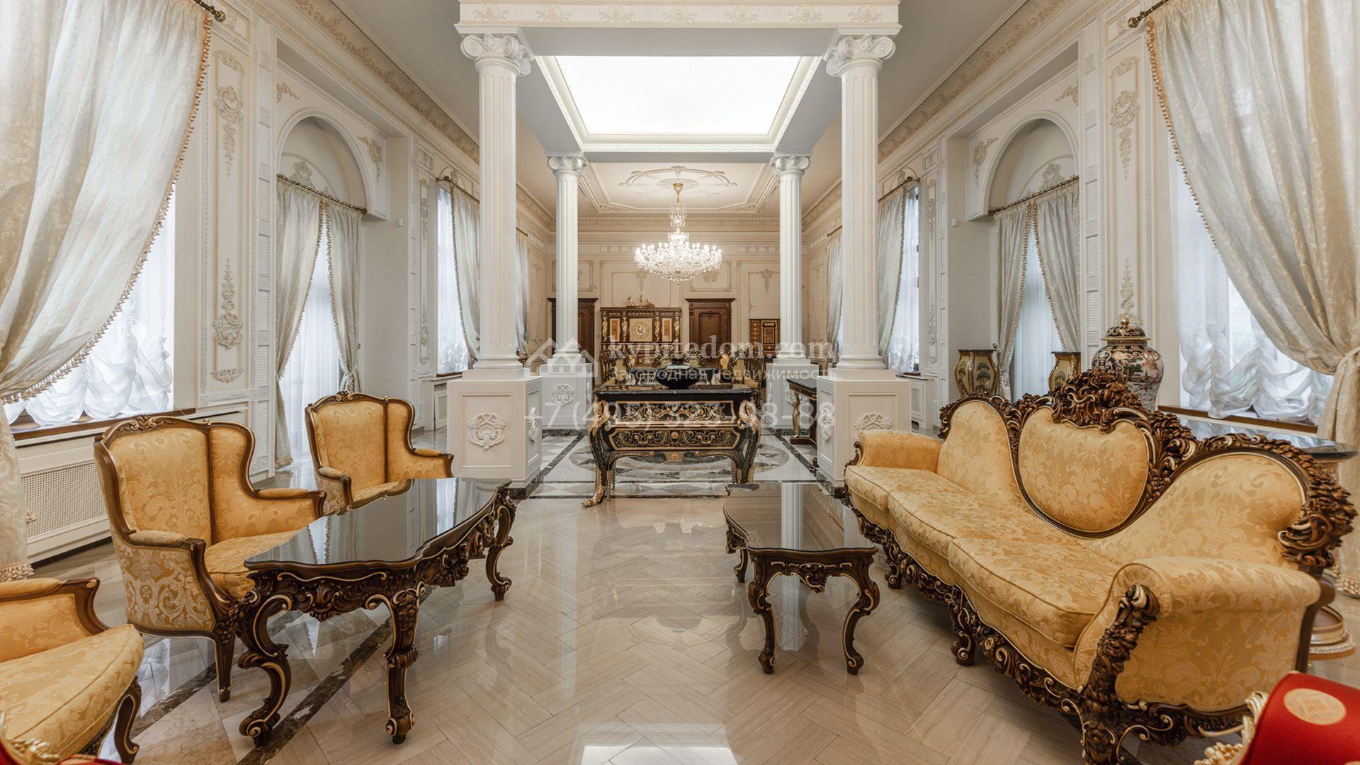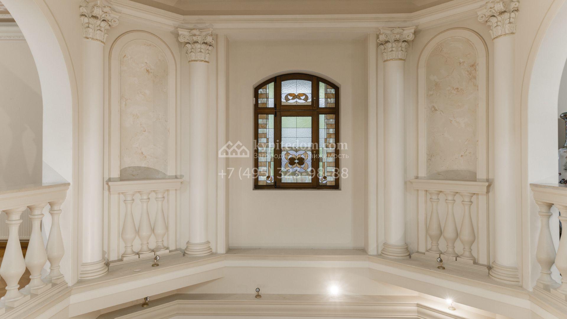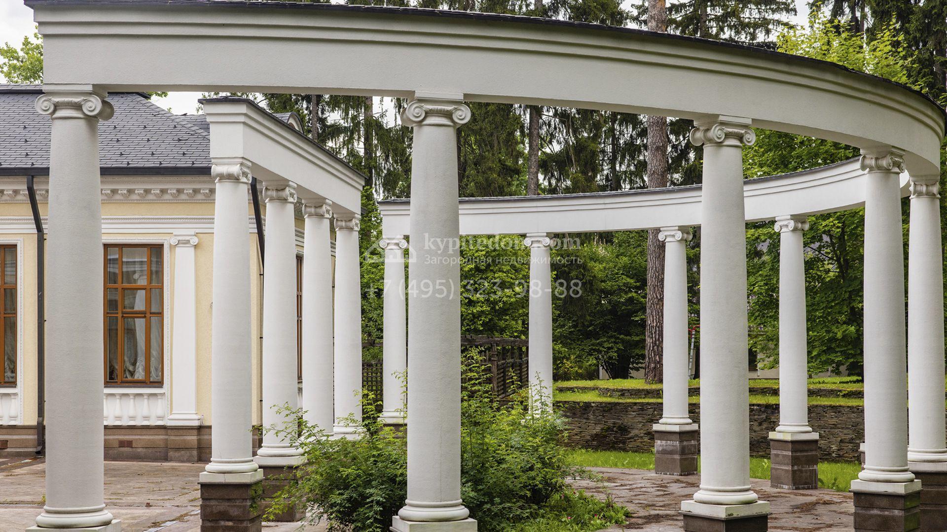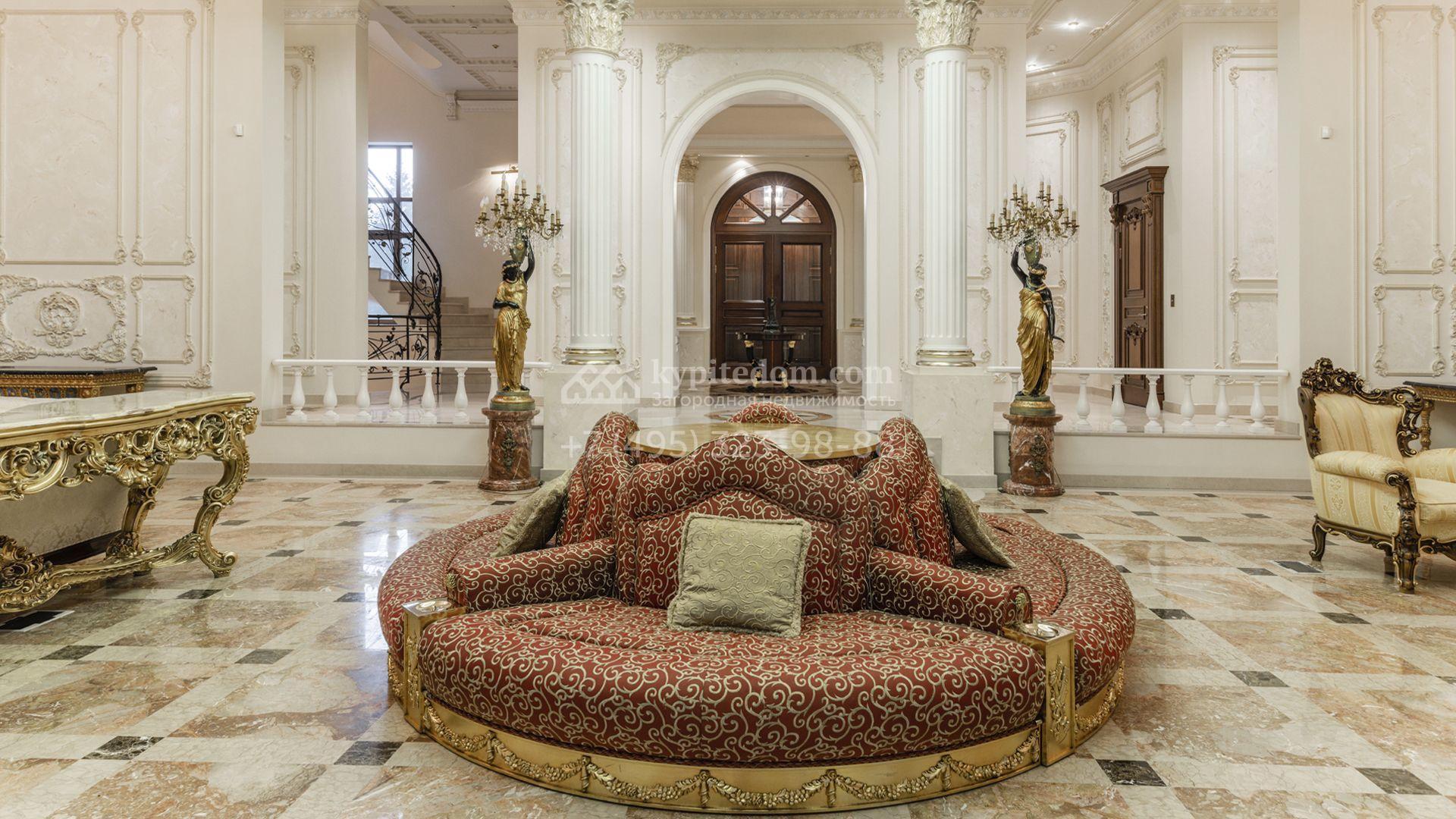 Внутреннее пространство включает шесть спален, гостиную с камином, кухню, столовую, кабинет, кинотеатр, бассейн и сауну. Симметрию ансамбля поддерживают две колоннады, завершённые зданиями с отапливаемыми гаражами на два автомобиля и квартирой для персонала. Дополнительно предусмотрен отдельный гараж на три машины. Участок с прудом оформлен в едином ландшафтном стиле — проложены дорожки, установлено декоративное освещение, обустроены беседка с зоной барбекю и детская площадка.