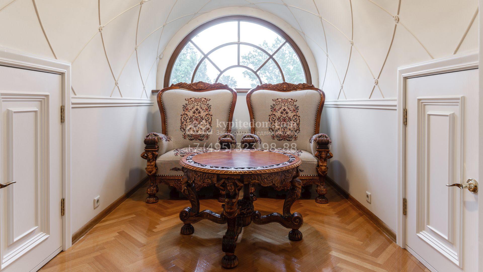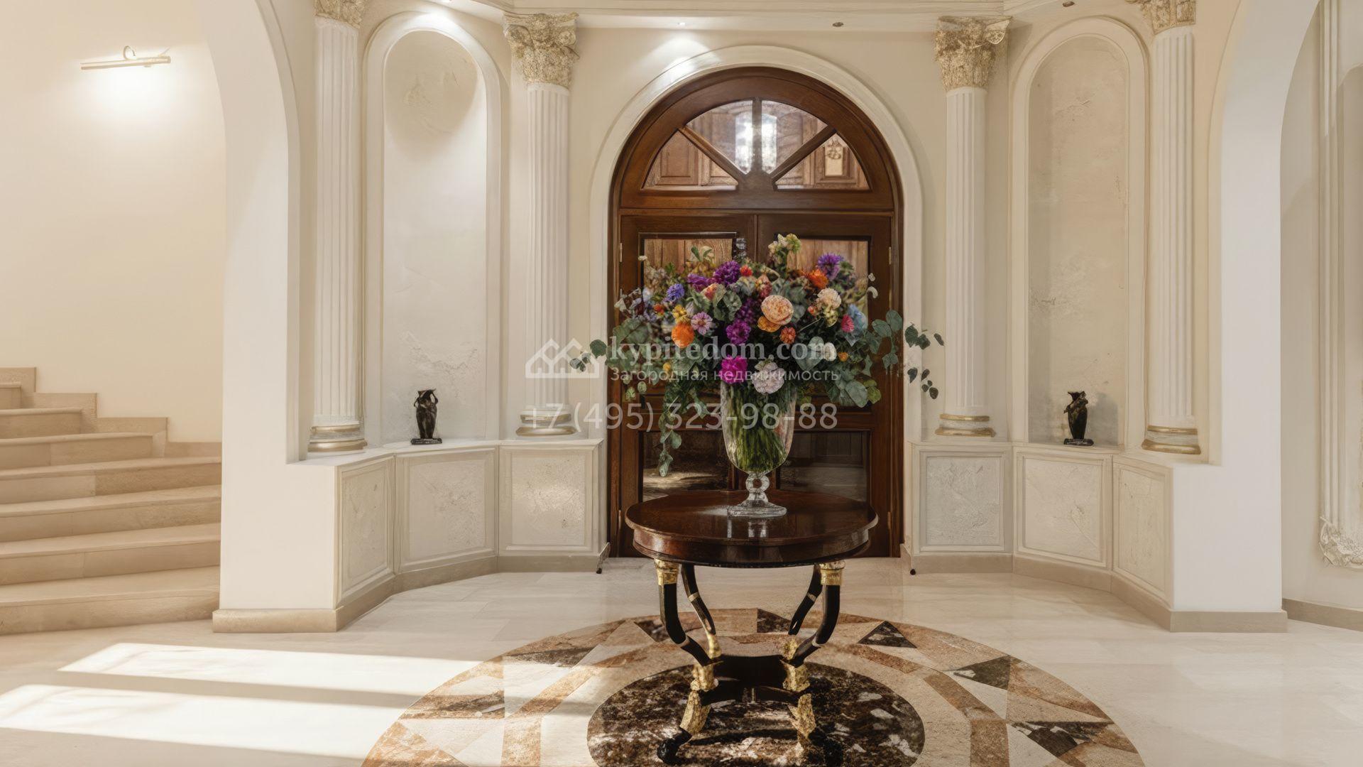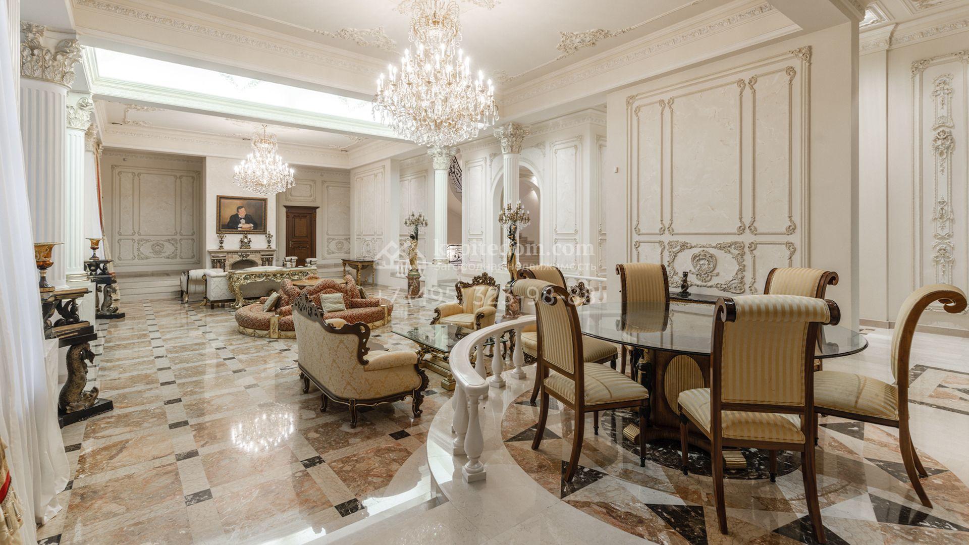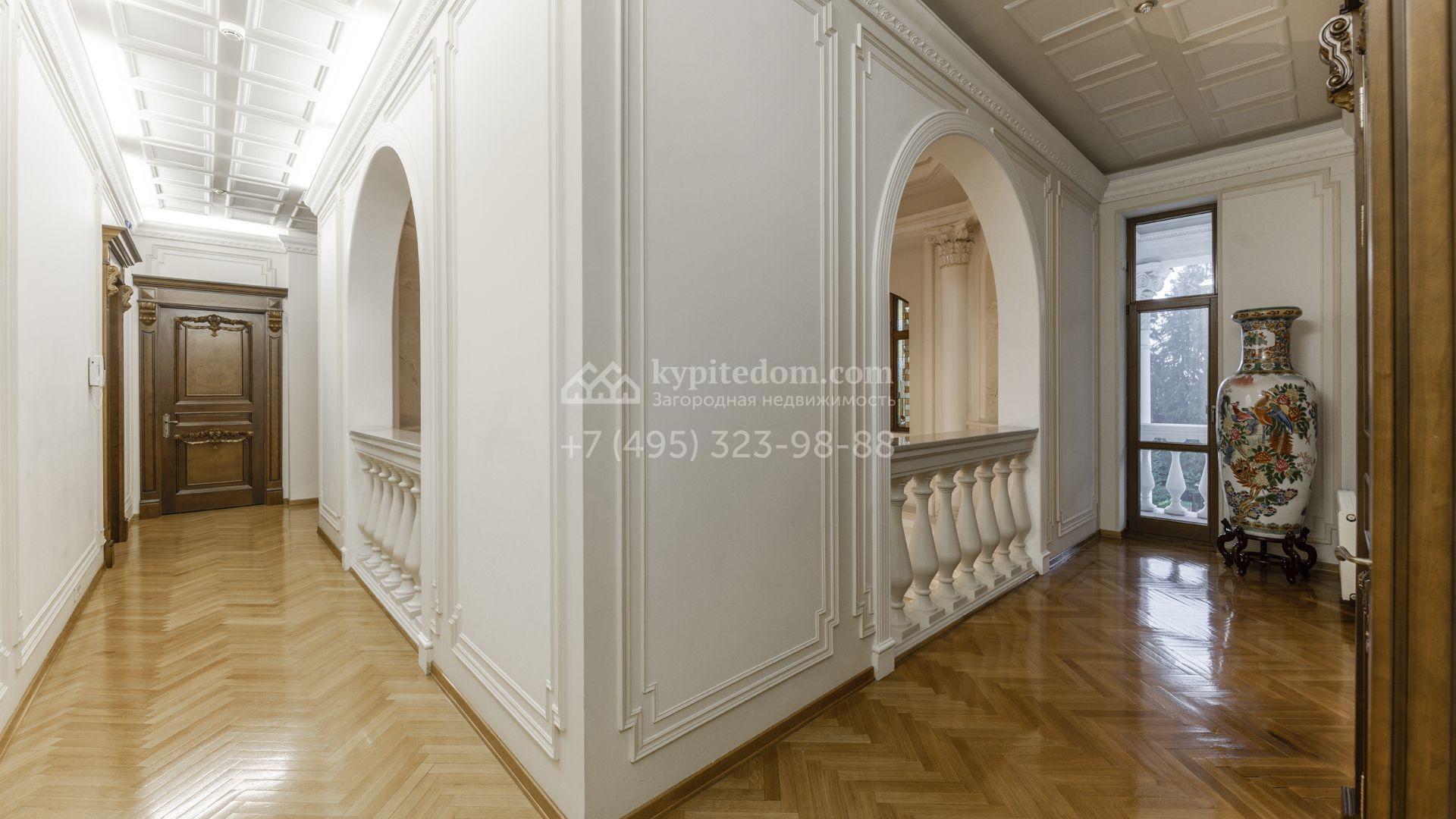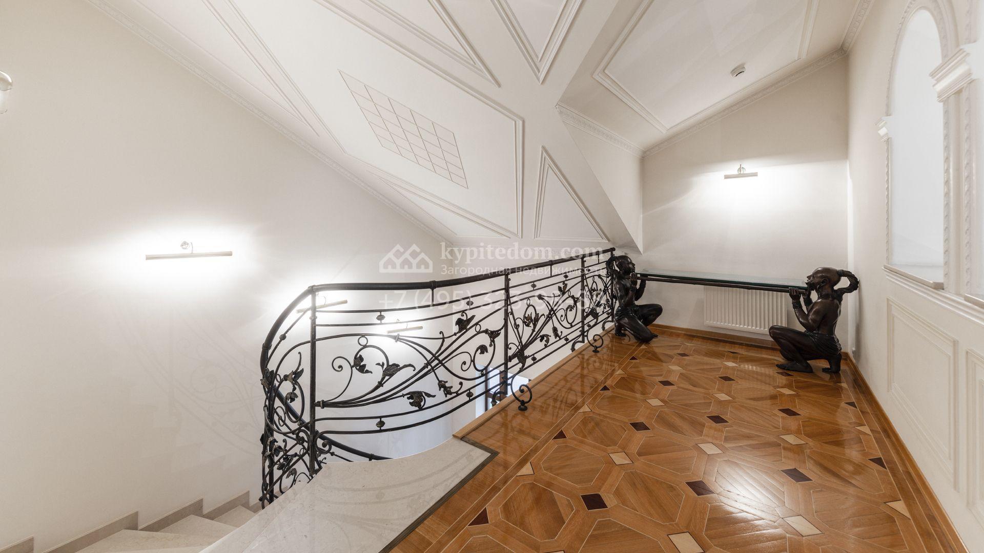Внутреннее пространство включает шесть спален, гостиную с камином, кухню, столовую, кабинет, кинотеатр, бассейн и сауну. Симметрию ансамбля поддерживают две колоннады, завершённые зданиями с отапливаемыми гаражами на два автомобиля и квартирой для персонала. Дополнительно предусмотрен отдельный гараж на три машины. Участок с прудом оформлен в едином ландшафтном стиле — проложены дорожки, установлено декоративное освещение, обустроены беседка с зоной барбекю и детская площадка.