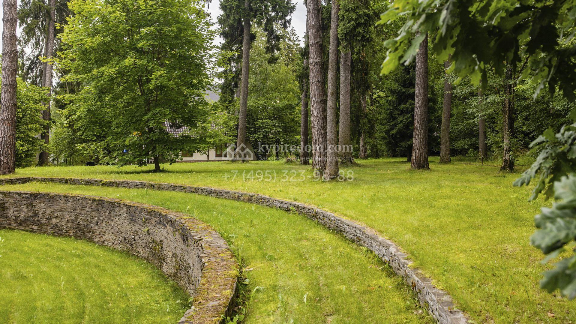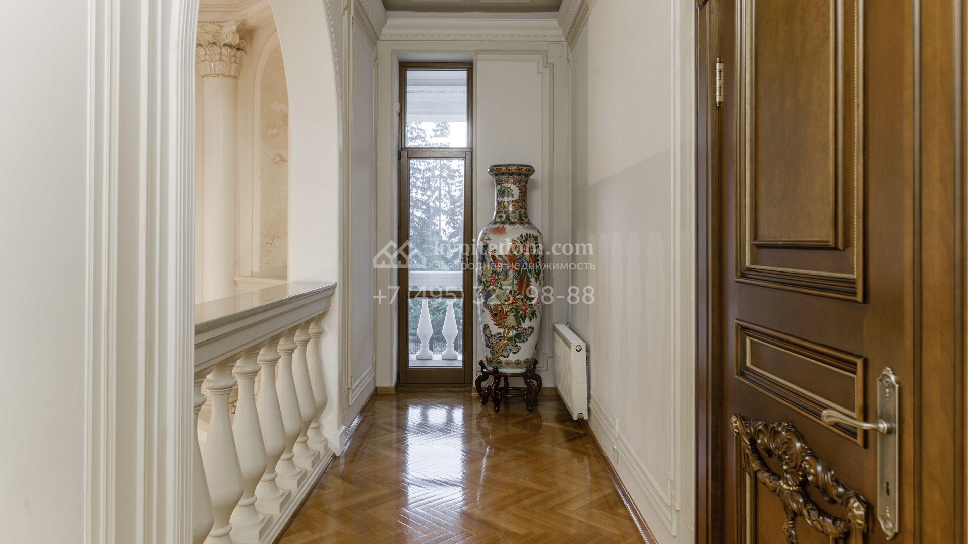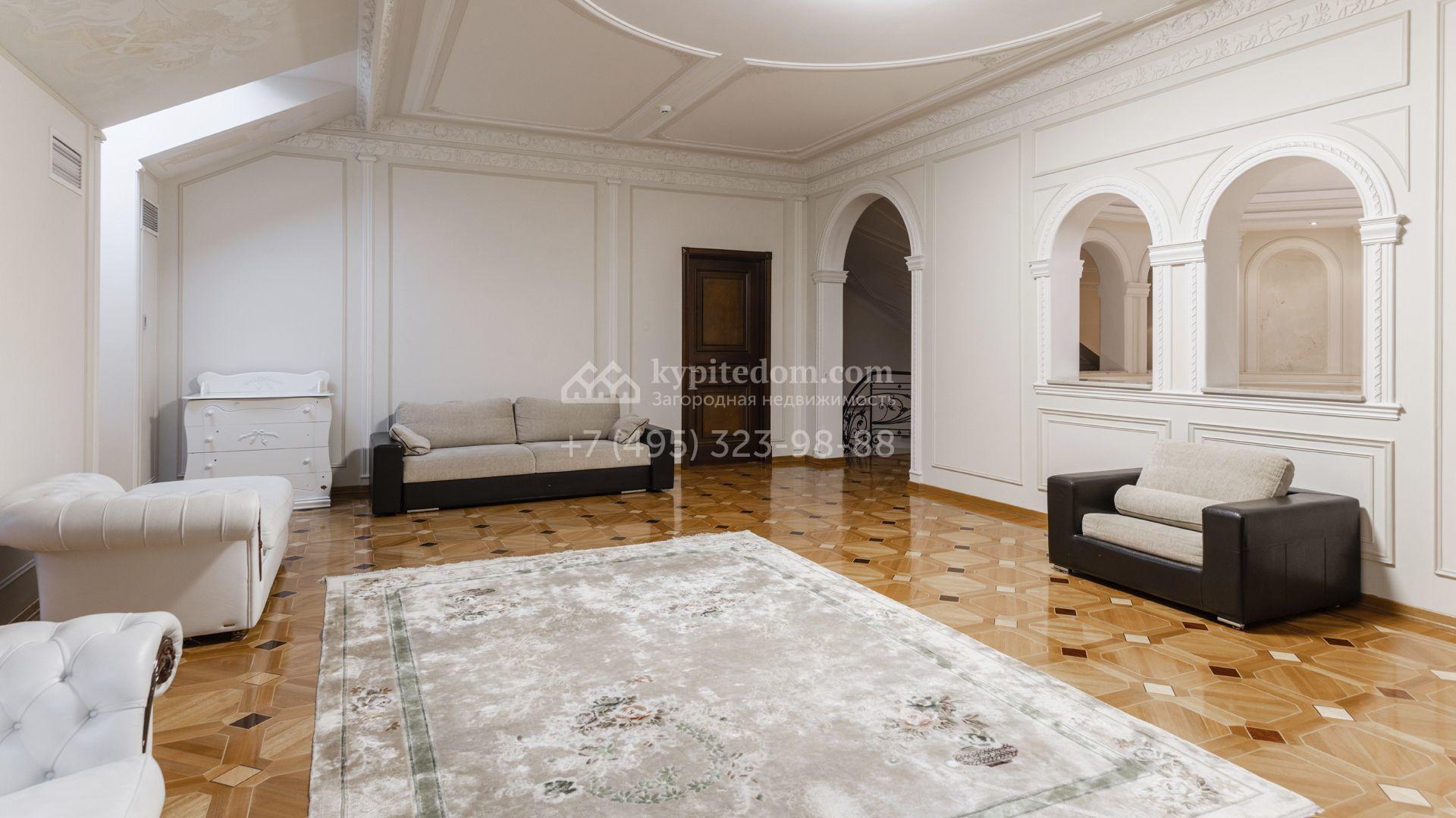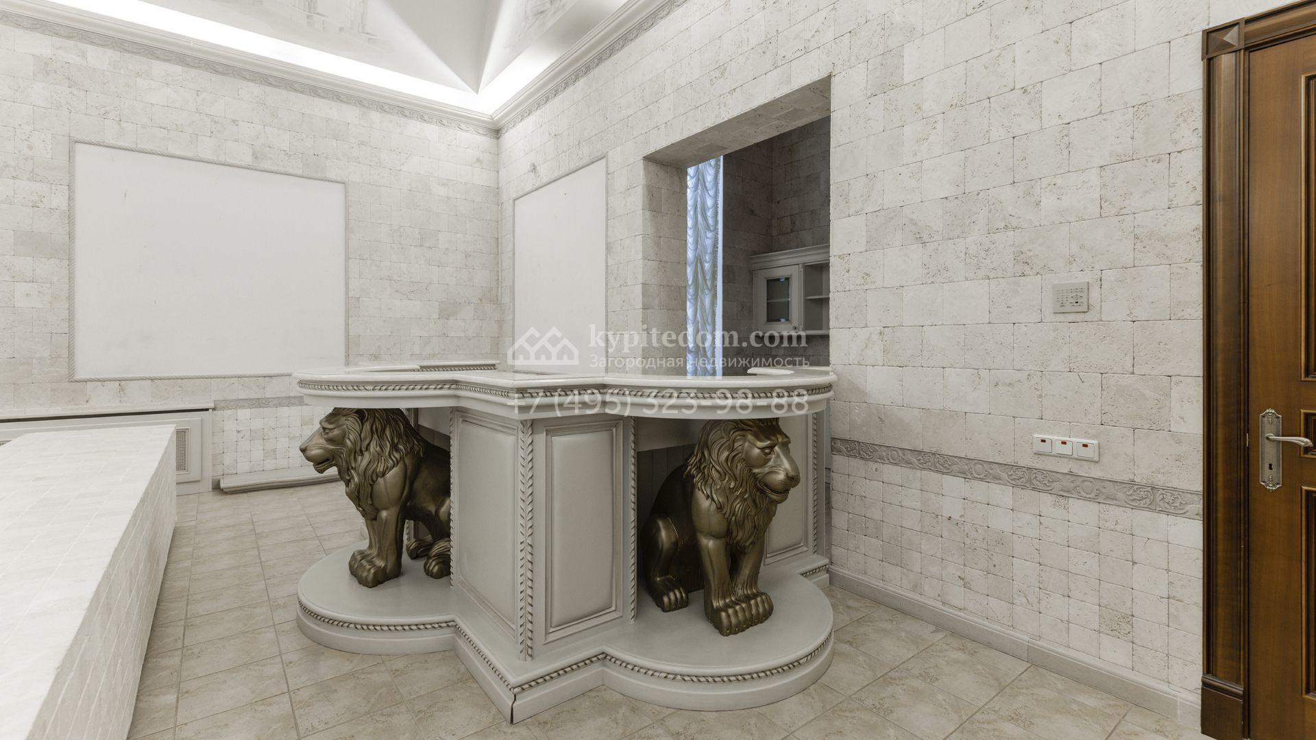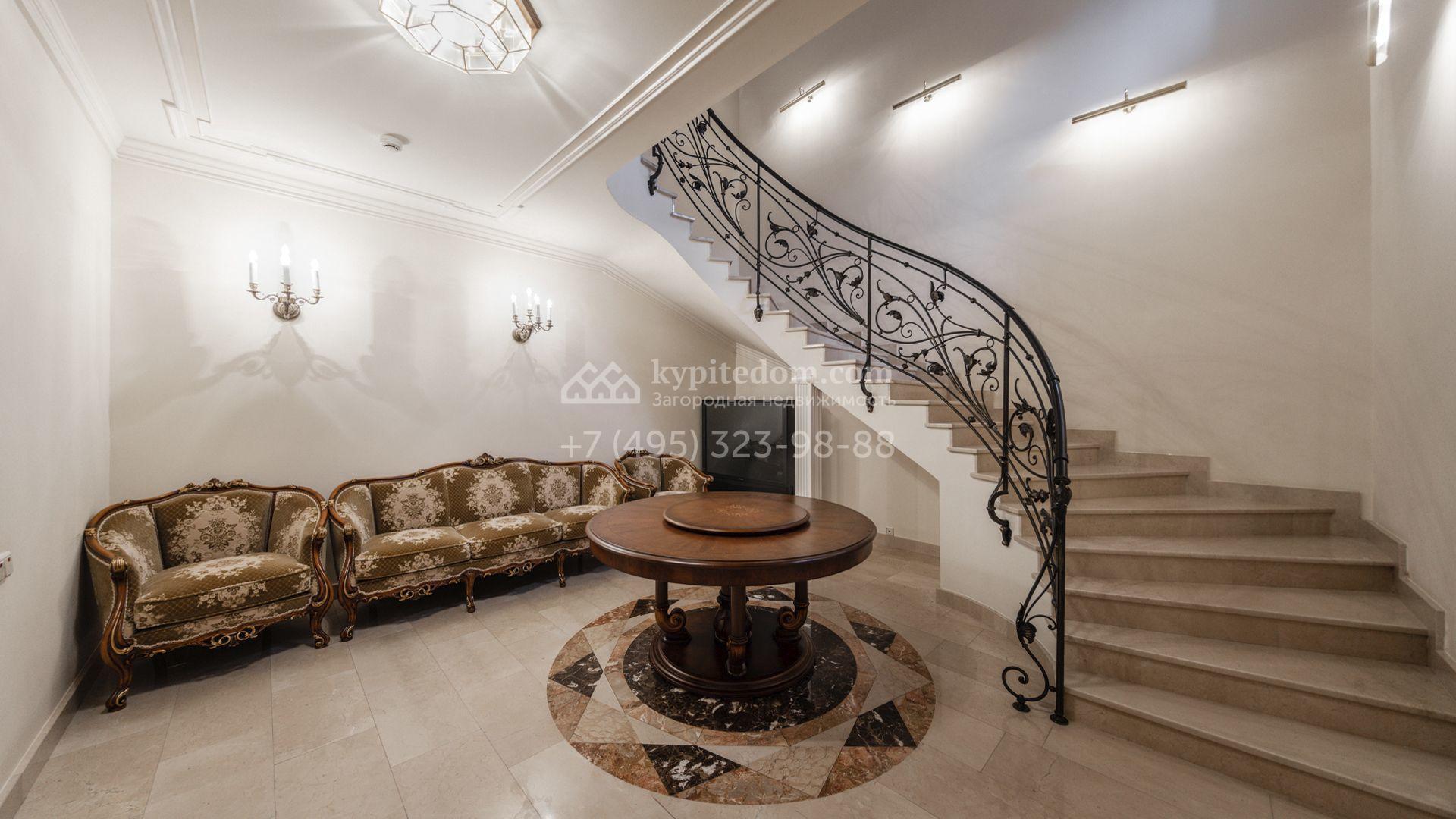 Внутреннее пространство включает шесть спален, гостиную с камином, кухню, столовую, кабинет, кинотеатр, бассейн и сауну. Симметрию ансамбля поддерживают две колоннады, завершённые зданиями с отапливаемыми гаражами на два автомобиля и квартирой для персонала. Дополнительно предусмотрен отдельный гараж на три машины. Участок с прудом оформлен в едином ландшафтном стиле — проложены дорожки, установлено декоративное освещение, обустроены беседка с зоной барбекю и детская площадка.