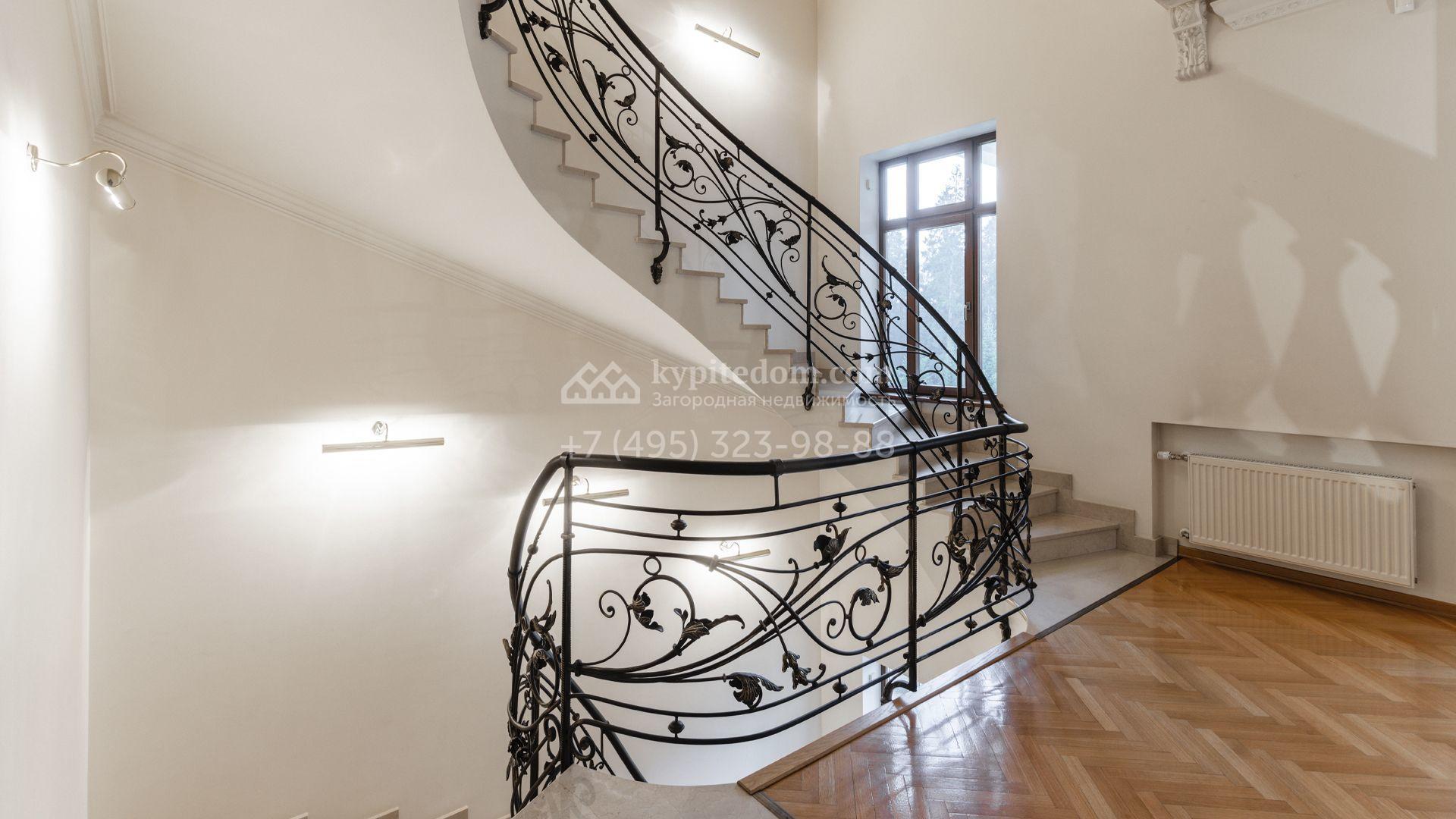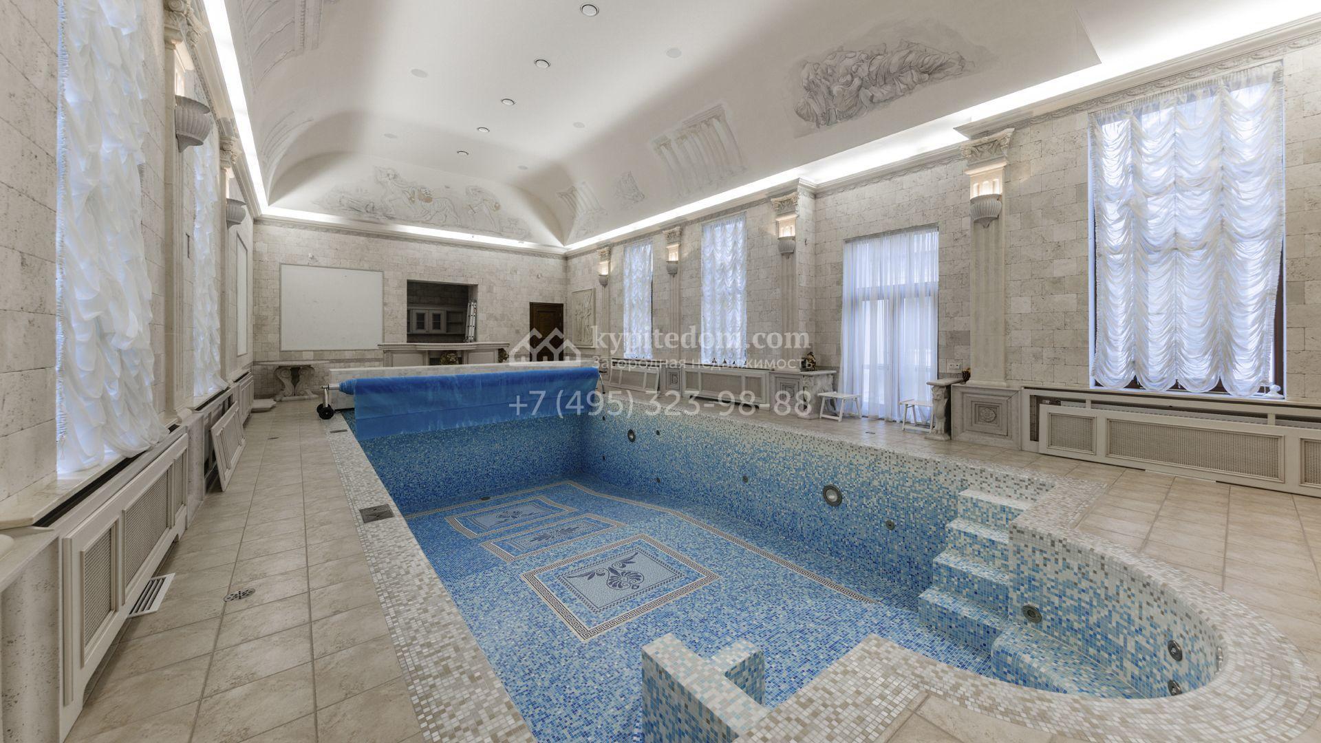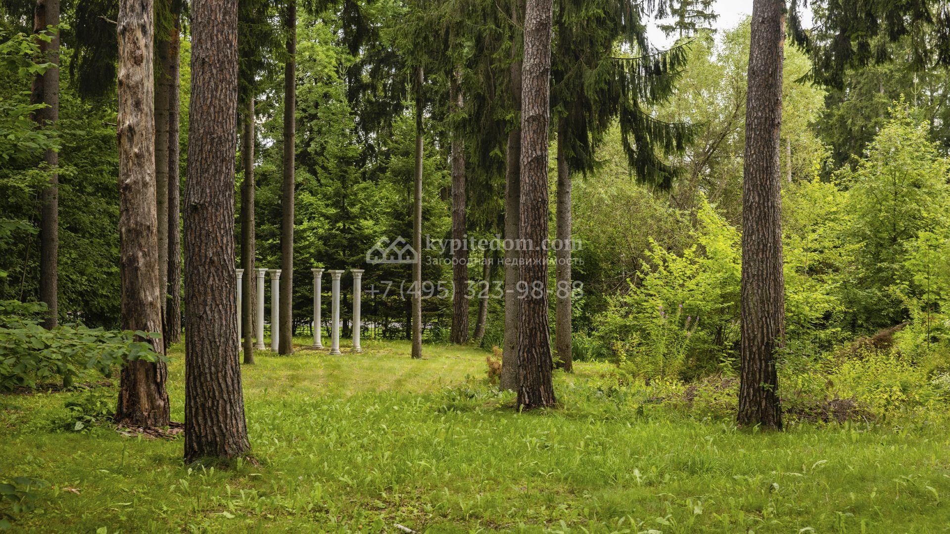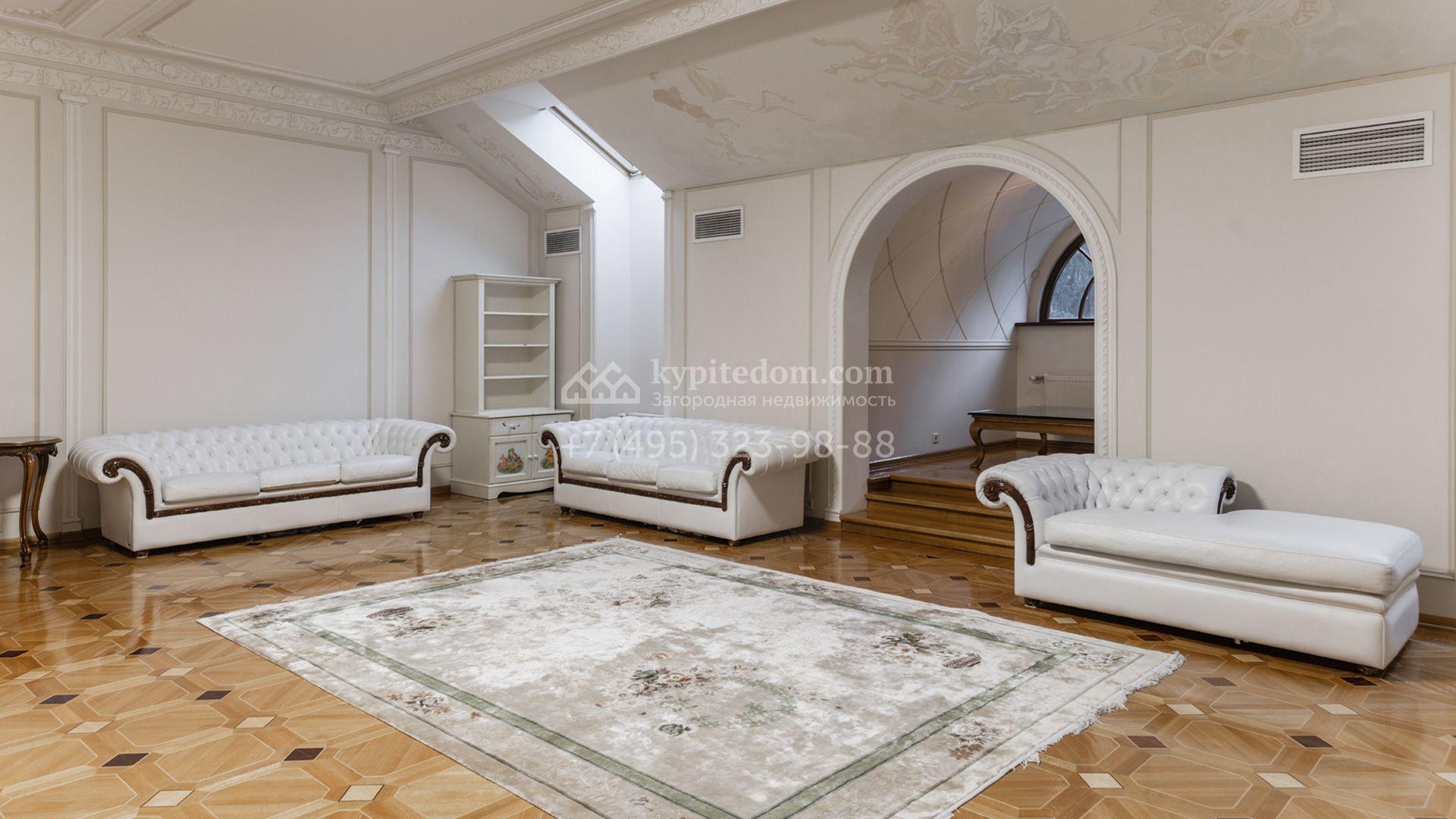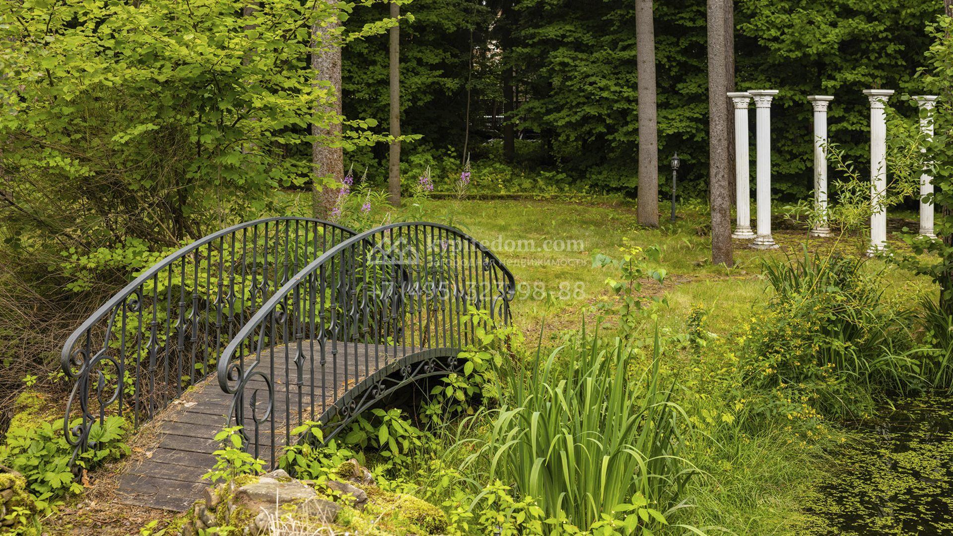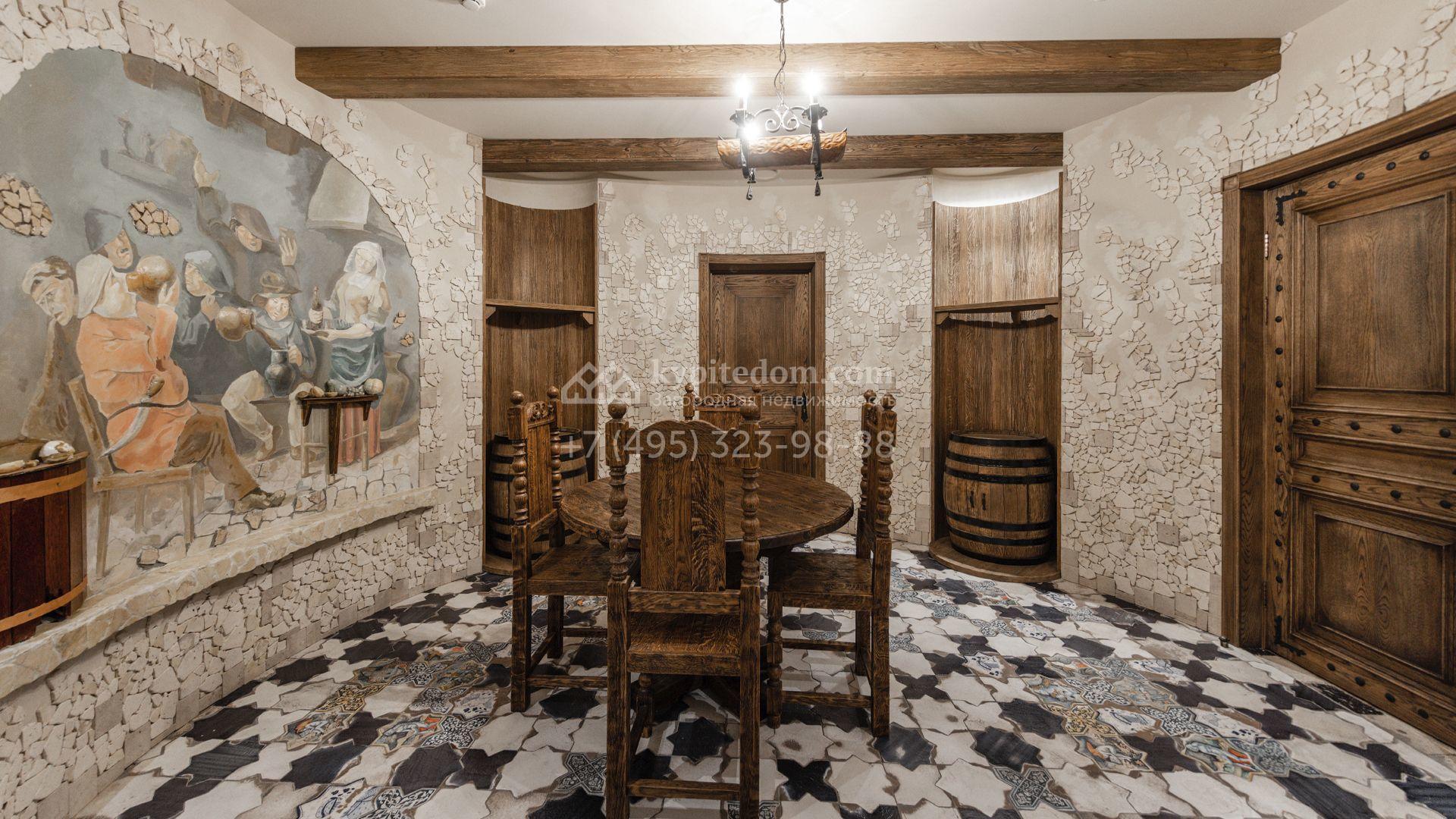 Внутреннее пространство включает шесть спален, гостиную с камином, кухню, столовую, кабинет, кинотеатр, бассейн и сауну. Симметрию ансамбля поддерживают две колоннады, завершённые зданиями с отапливаемыми гаражами на два автомобиля и квартирой для персонала. Дополнительно предусмотрен отдельный гараж на три машины. Участок с прудом оформлен в едином ландшафтном стиле — проложены дорожки, установлено декоративное освещение, обустроены беседка с зоной барбекю и детская площадка.