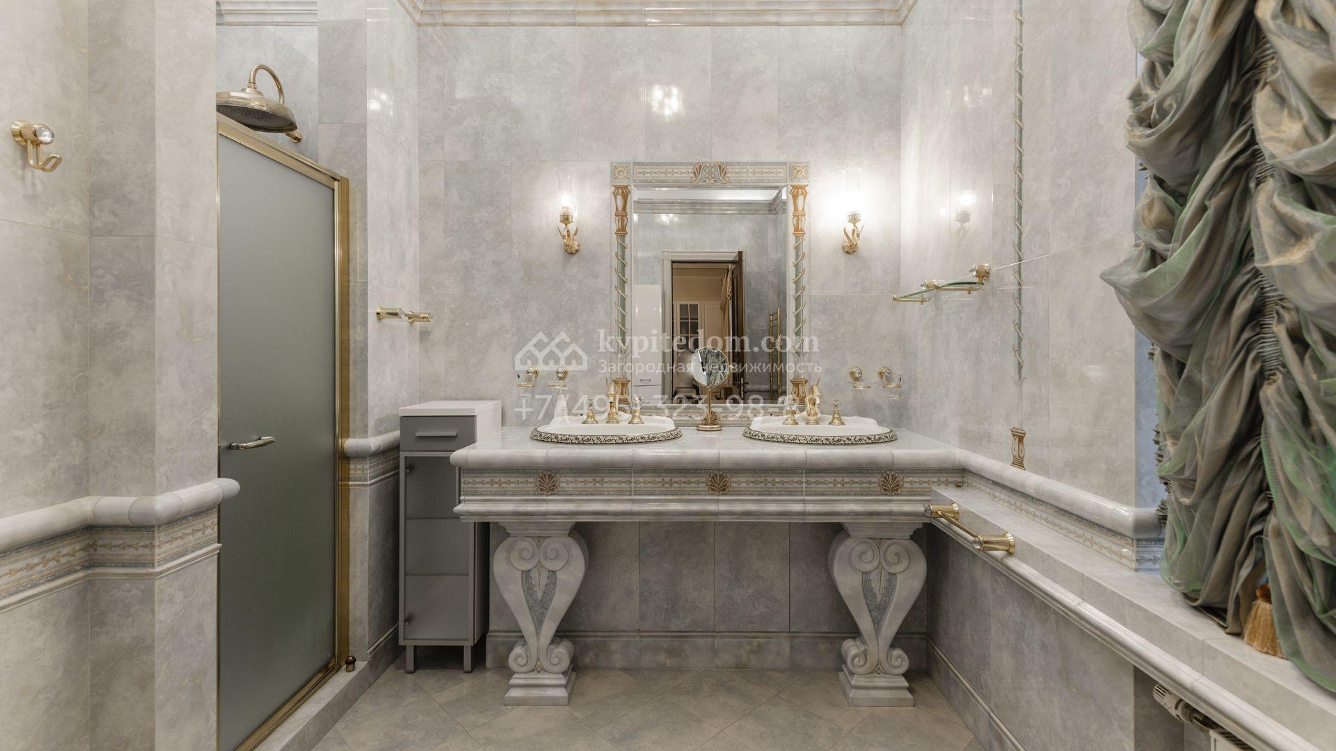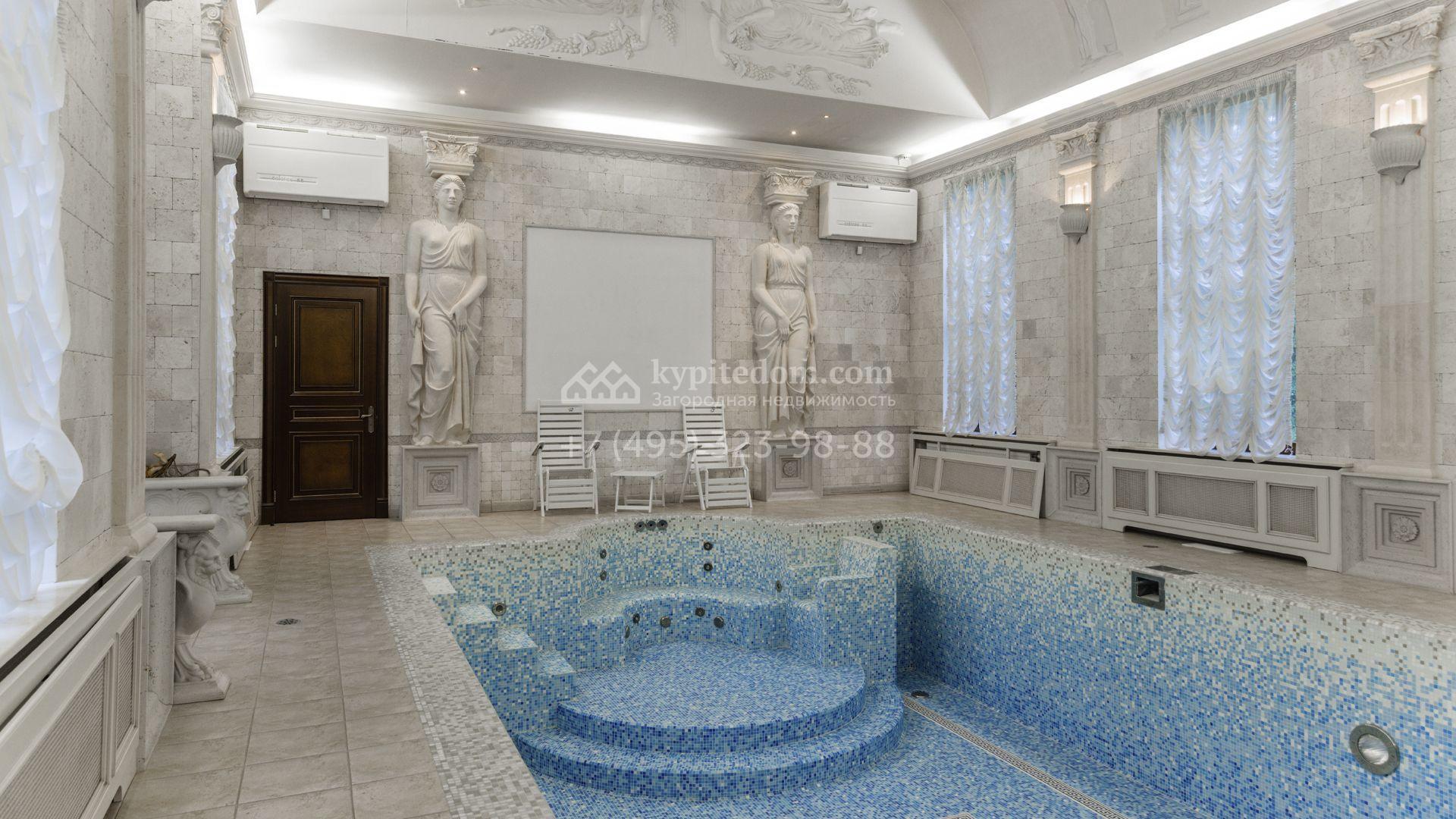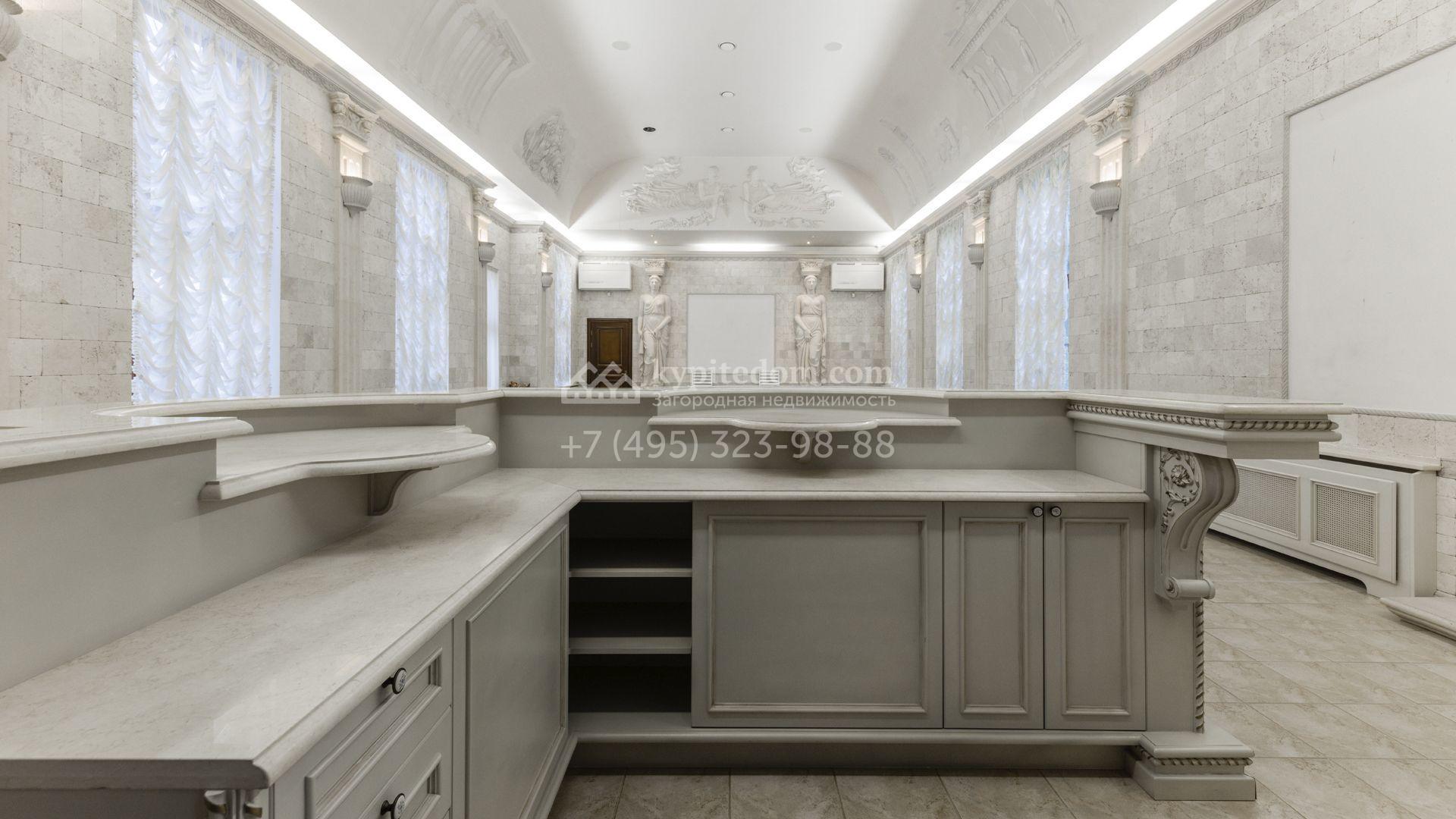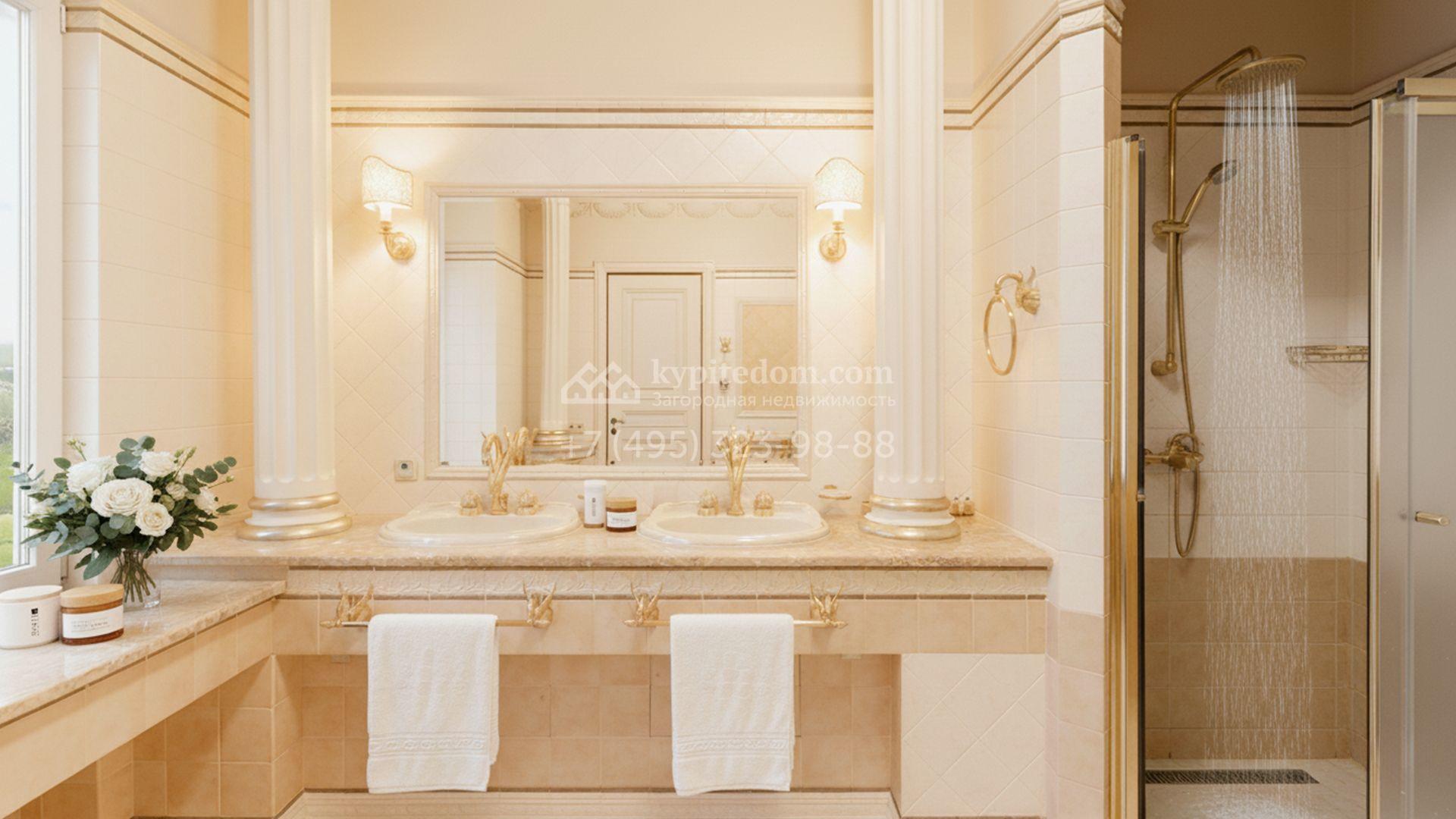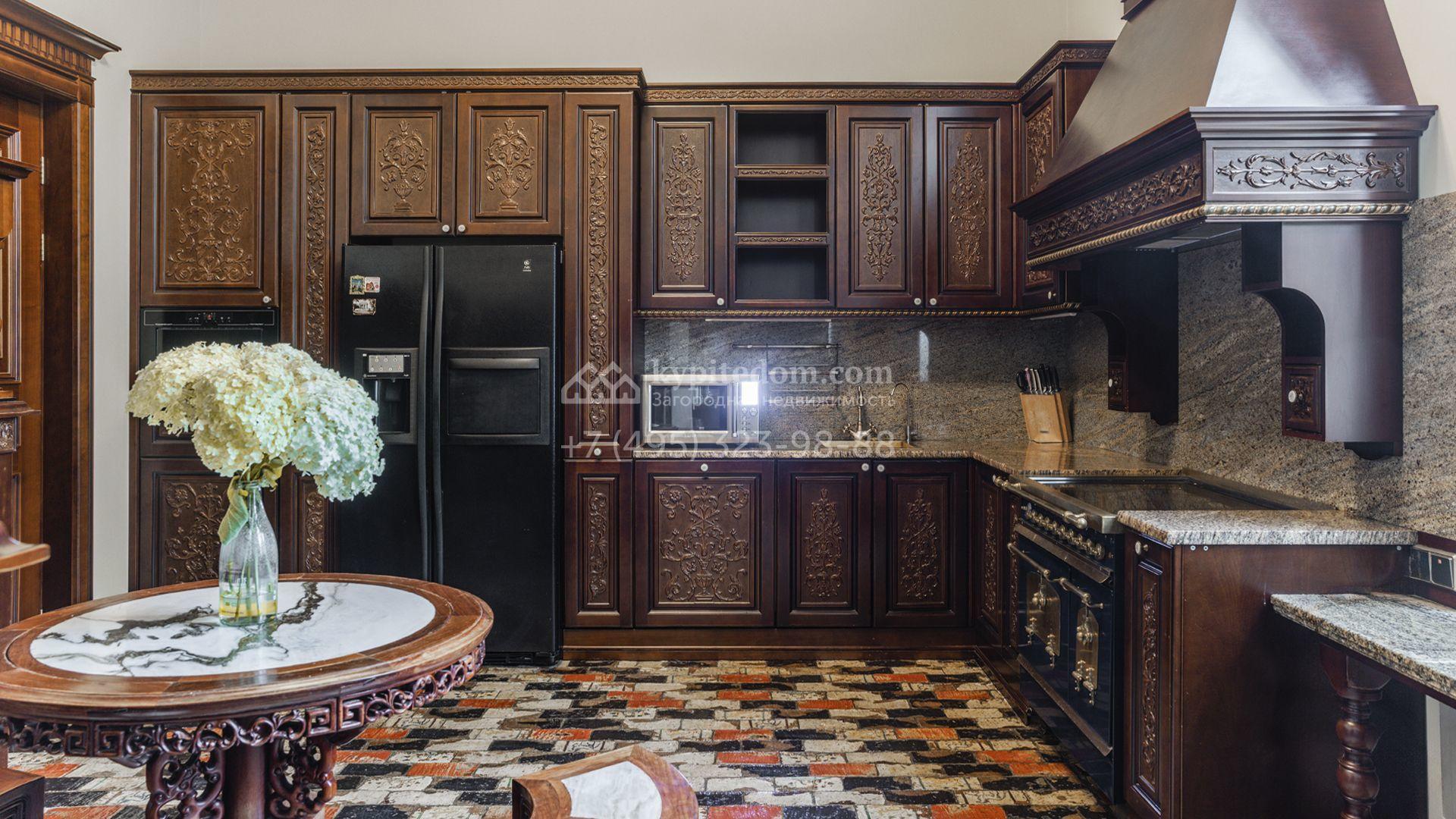 Внутреннее пространство включает шесть спален, гостиную с камином, кухню, столовую, кабинет, кинотеатр, бассейн и сауну. Симметрию ансамбля поддерживают две колоннады, завершённые зданиями с отапливаемыми гаражами на два автомобиля и квартирой для персонала. Дополнительно предусмотрен отдельный гараж на три машины. Участок с прудом оформлен в едином ландшафтном стиле — проложены дорожки, установлено декоративное освещение, обустроены беседка с зоной барбекю и детская площадка.