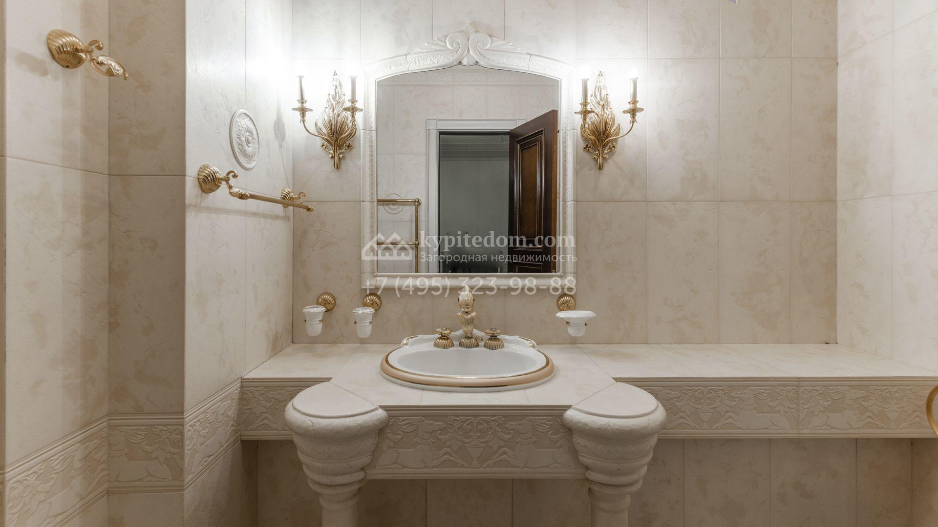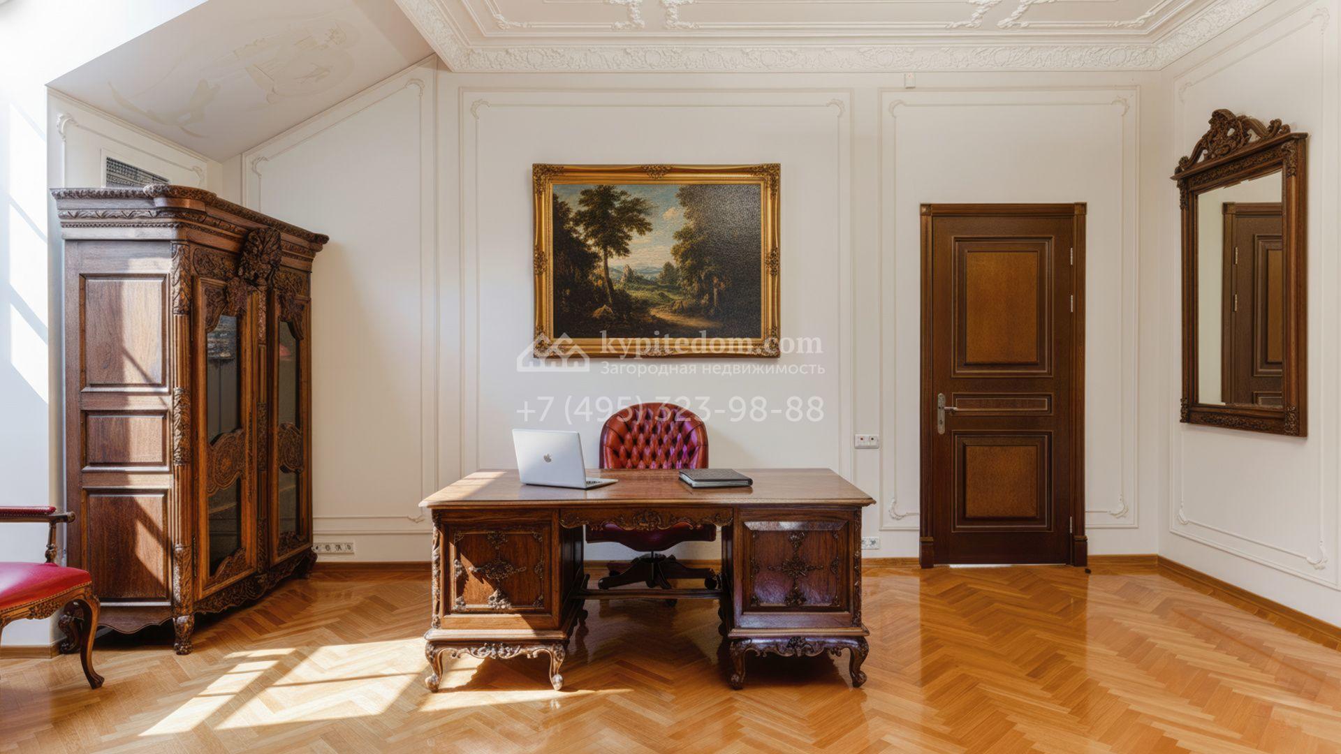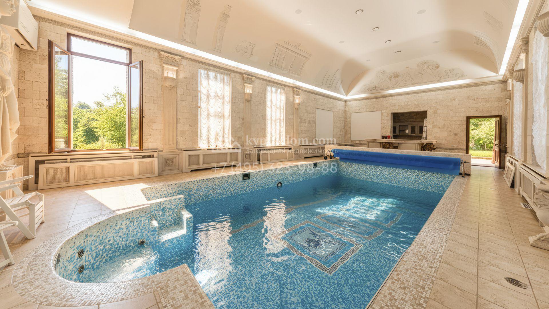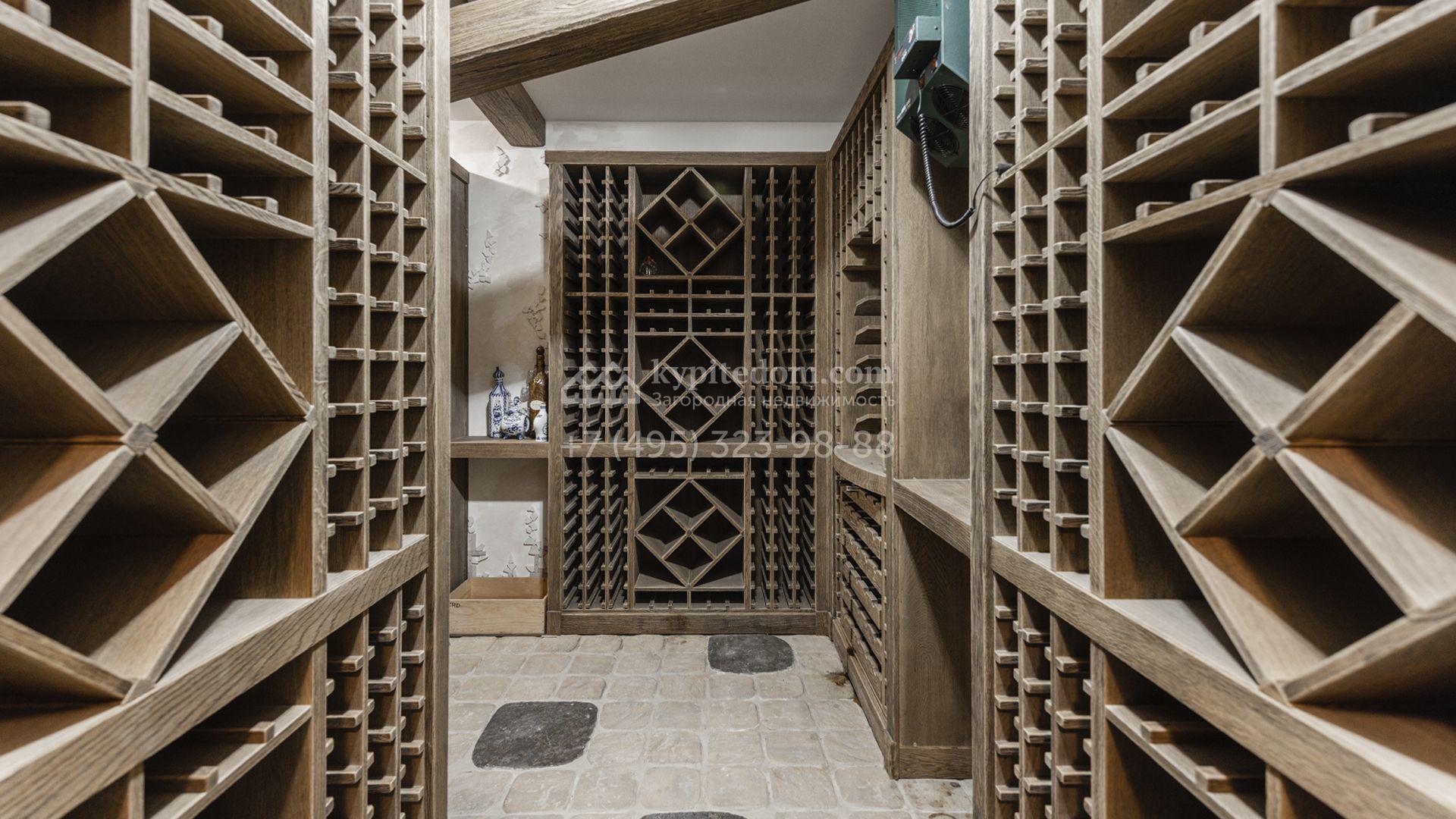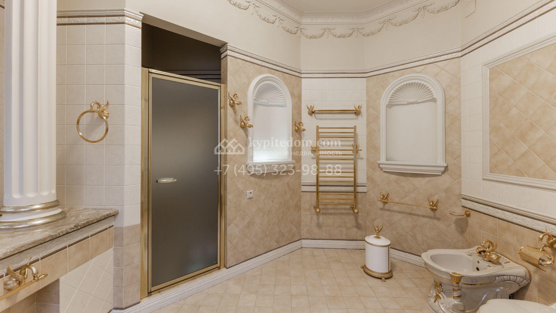 Внутреннее пространство включает шесть спален, гостиную с камином, кухню, столовую, кабинет, кинотеатр, бассейн и сауну. Симметрию ансамбля поддерживают две колоннады, завершённые зданиями с отапливаемыми гаражами на два автомобиля и квартирой для персонала. Дополнительно предусмотрен отдельный гараж на три машины. Участок с прудом оформлен в едином ландшафтном стиле — проложены дорожки, установлено декоративное освещение, обустроены беседка с зоной барбекю и детская площадка.