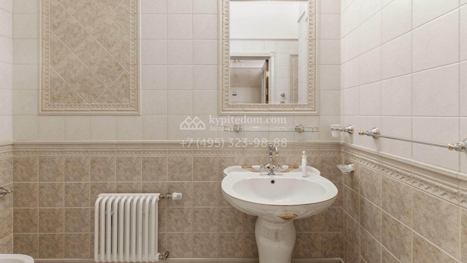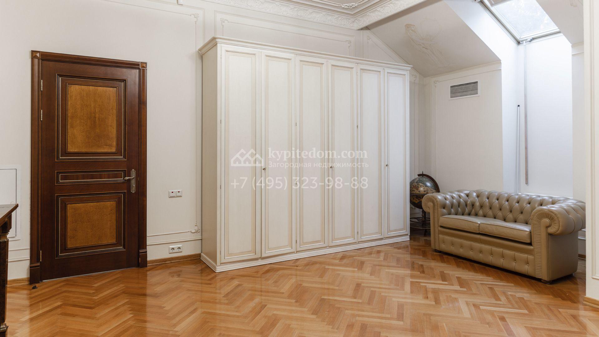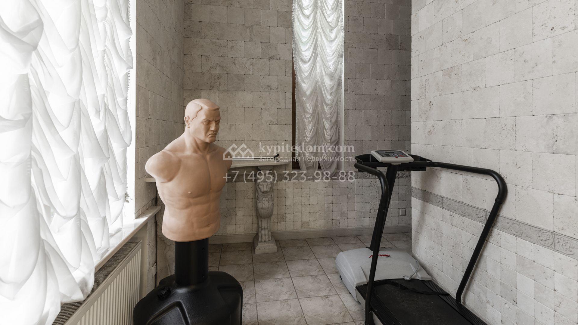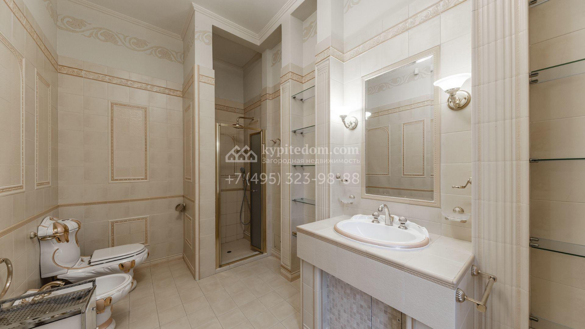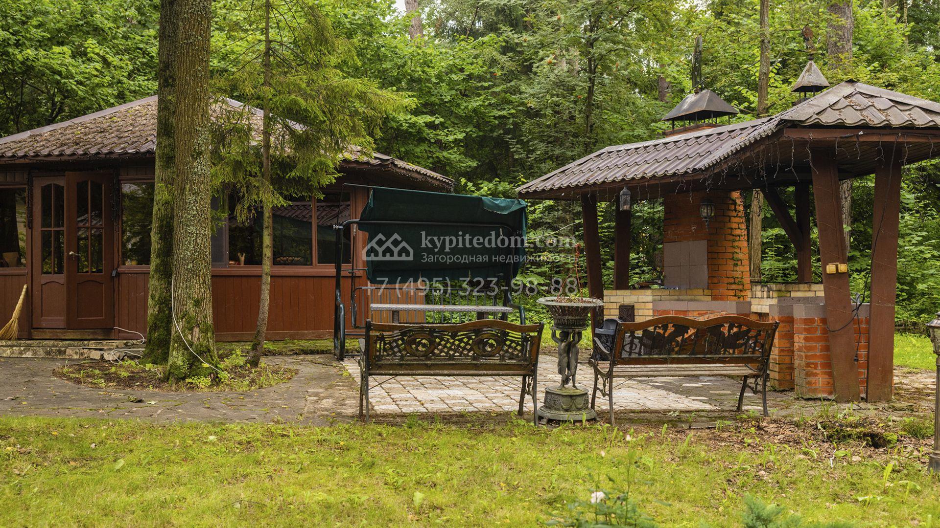 Внутреннее пространство включает шесть спален, гостиную с камином, кухню, столовую, кабинет, кинотеатр, бассейн и сауну. Симметрию ансамбля поддерживают две колоннады, завершённые зданиями с отапливаемыми гаражами на два автомобиля и квартирой для персонала. Дополнительно предусмотрен отдельный гараж на три машины. Участок с прудом оформлен в едином ландшафтном стиле — проложены дорожки, установлено декоративное освещение, обустроены беседка с зоной барбекю и детская площадка.