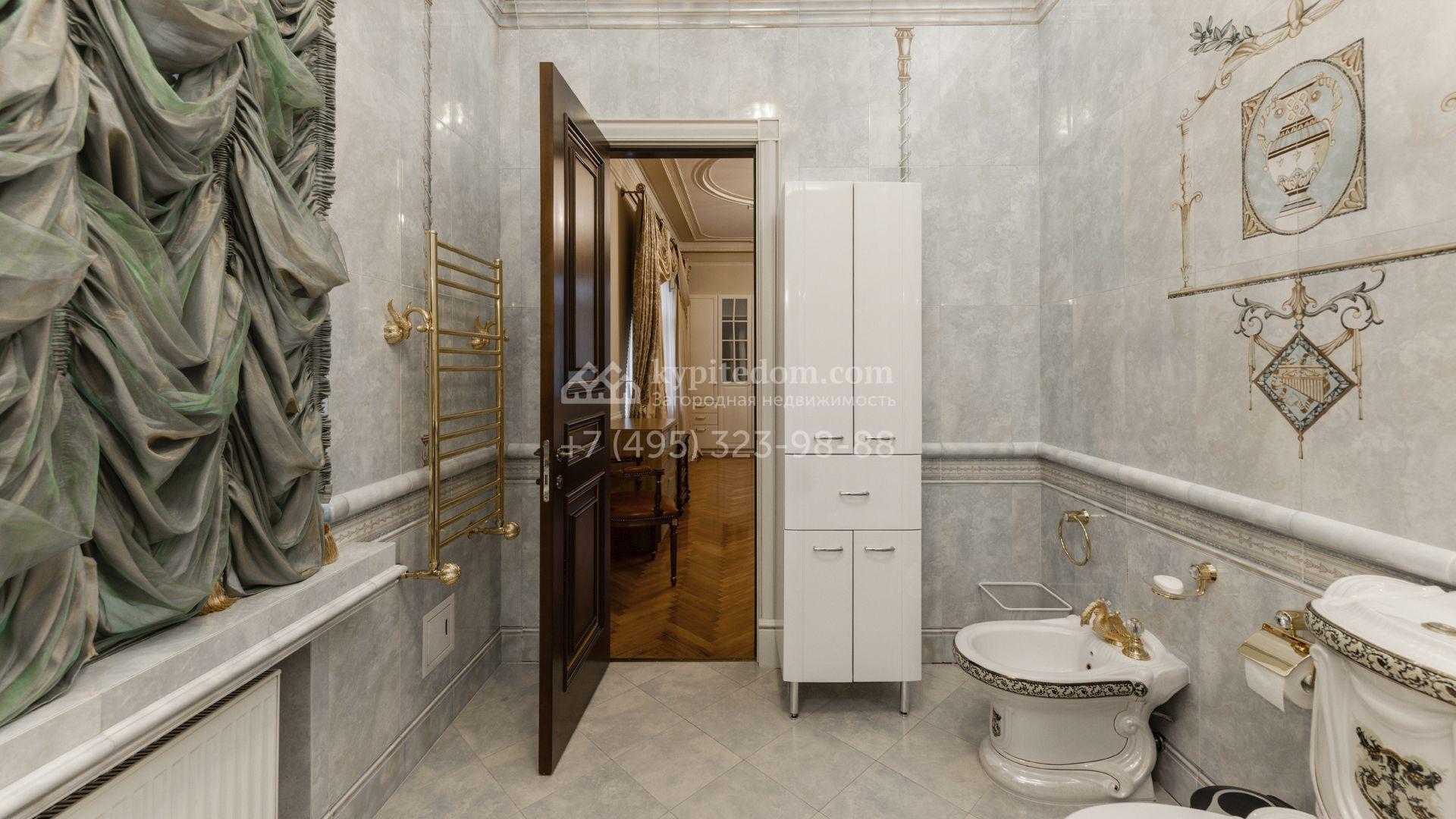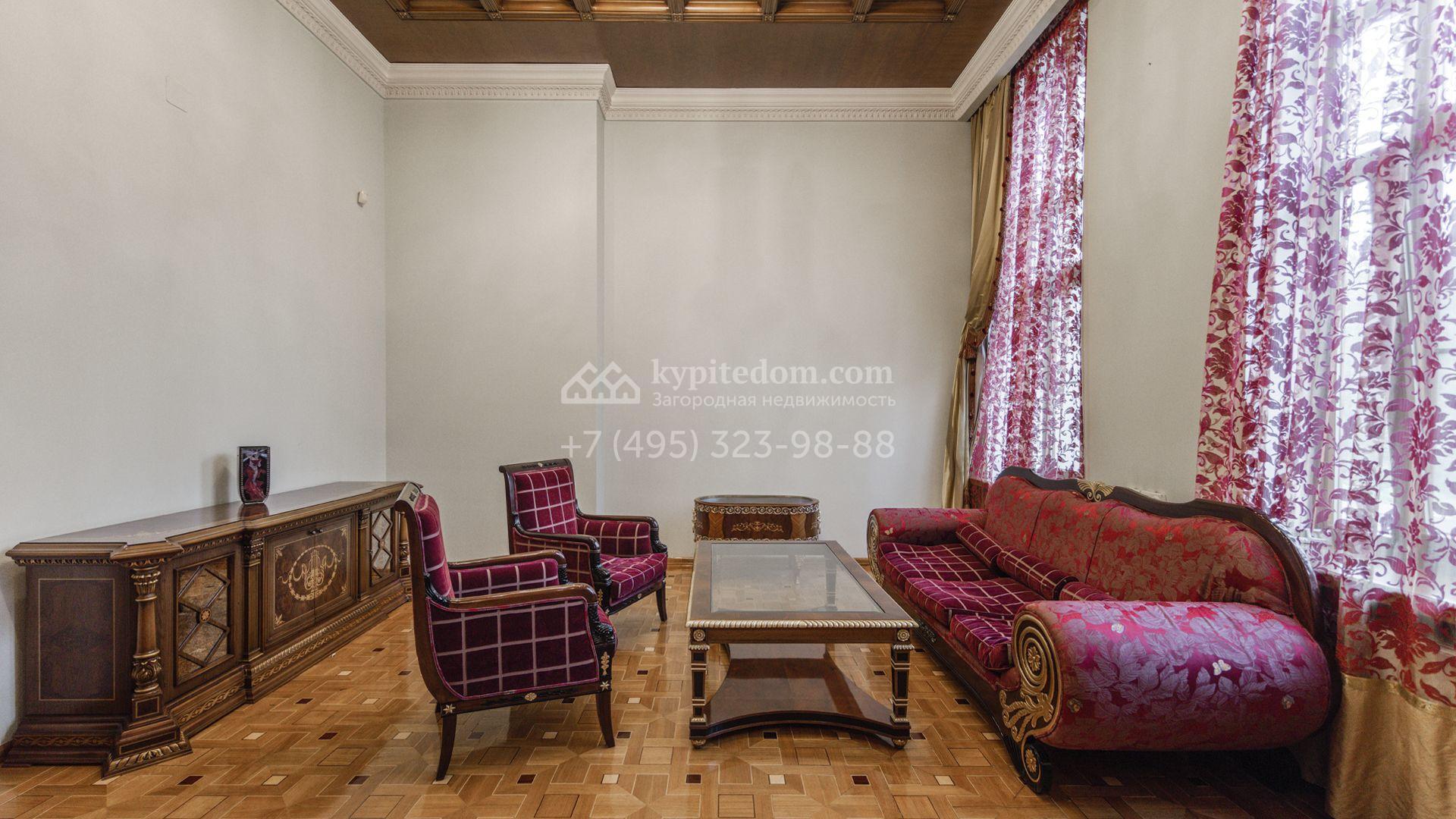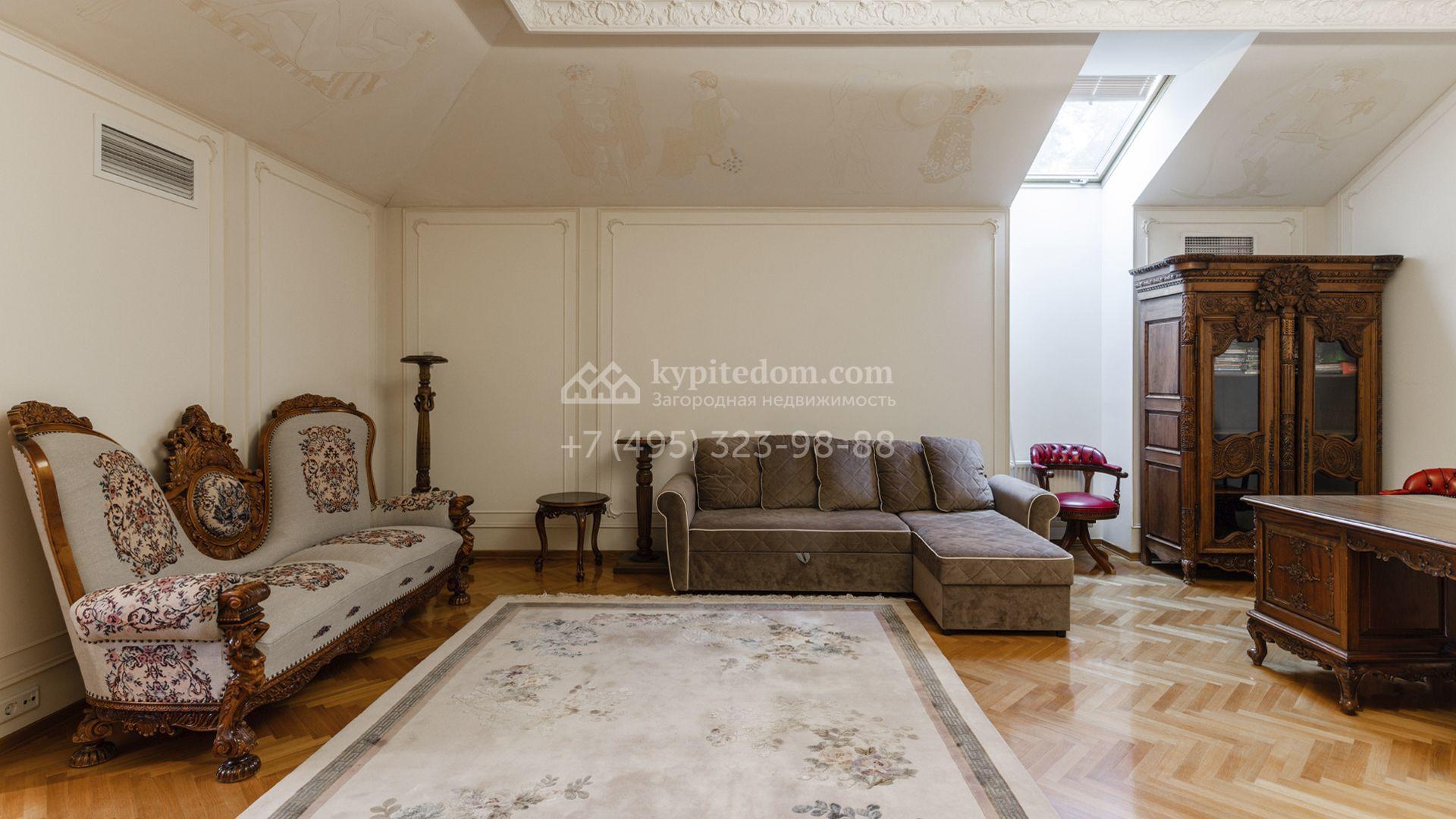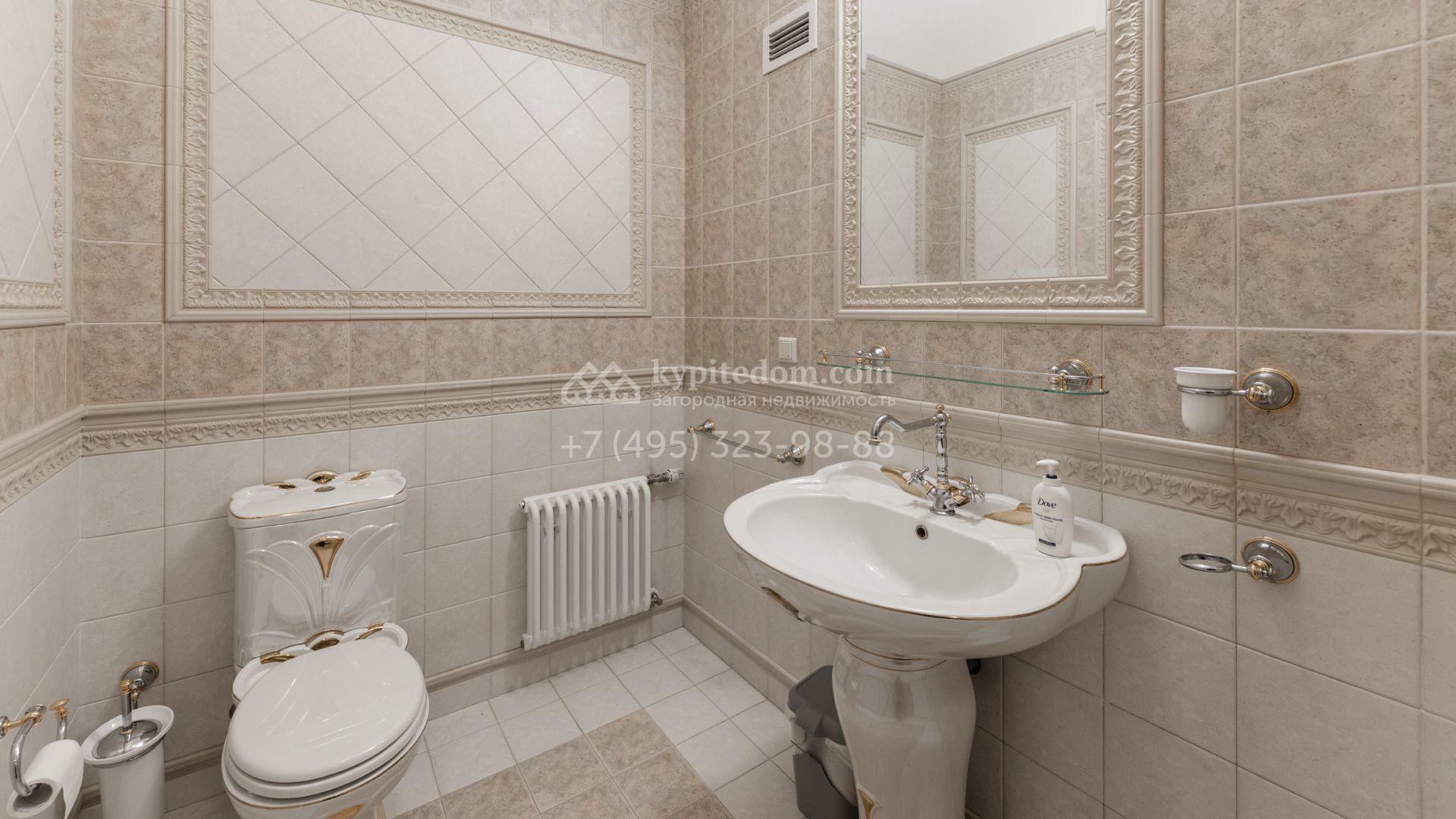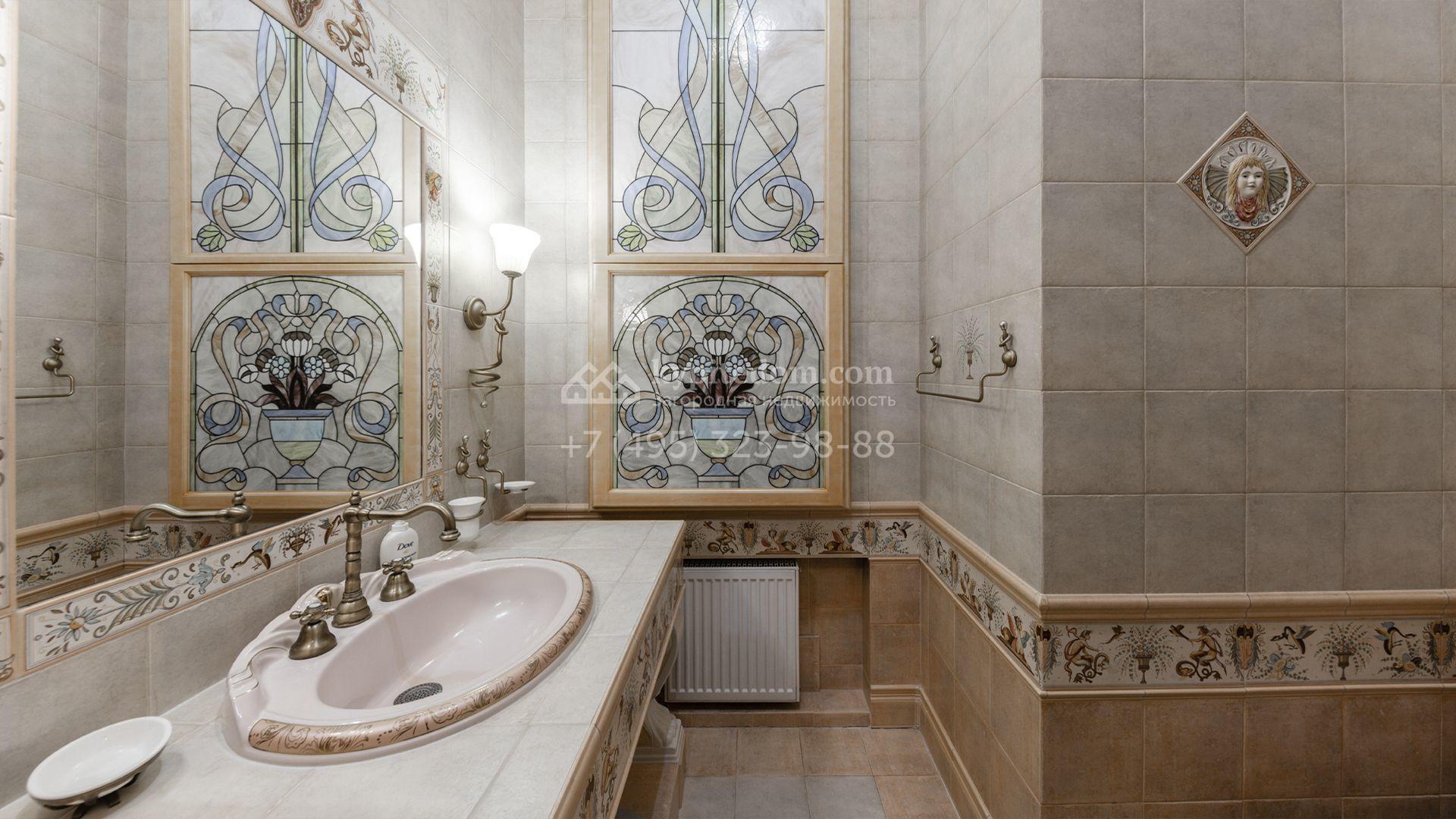 Внутреннее пространство включает шесть спален, гостиную с камином, кухню, столовую, кабинет, кинотеатр, бассейн и сауну. Симметрию ансамбля поддерживают две колоннады, завершённые зданиями с отапливаемыми гаражами на два автомобиля и квартирой для персонала. Дополнительно предусмотрен отдельный гараж на три машины. Участок с прудом оформлен в едином ландшафтном стиле — проложены дорожки, установлено декоративное освещение, обустроены беседка с зоной барбекю и детская площадка.