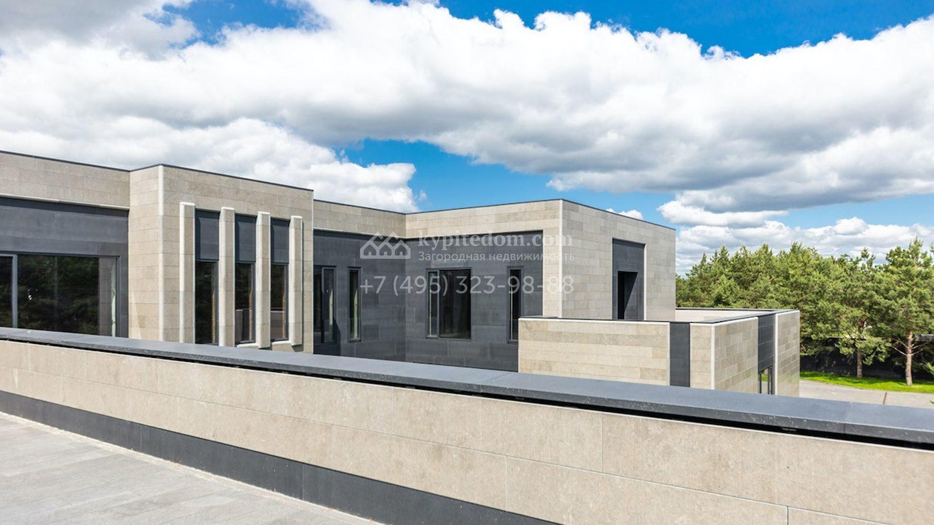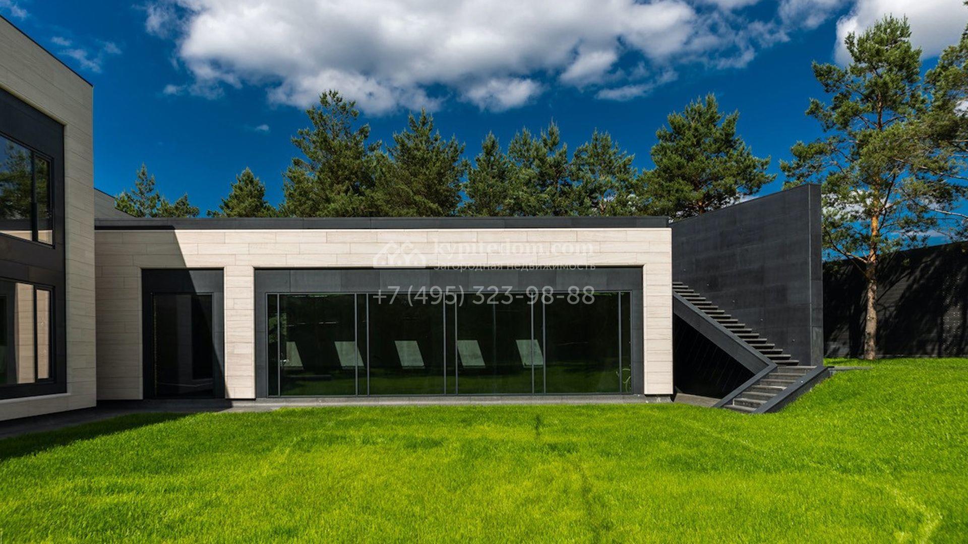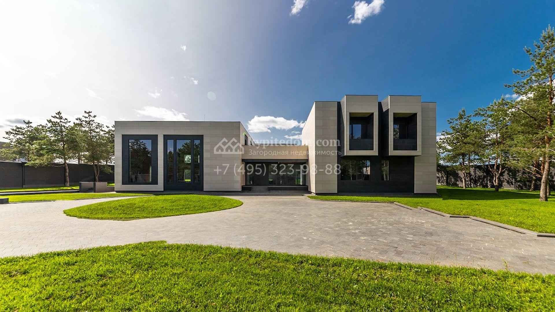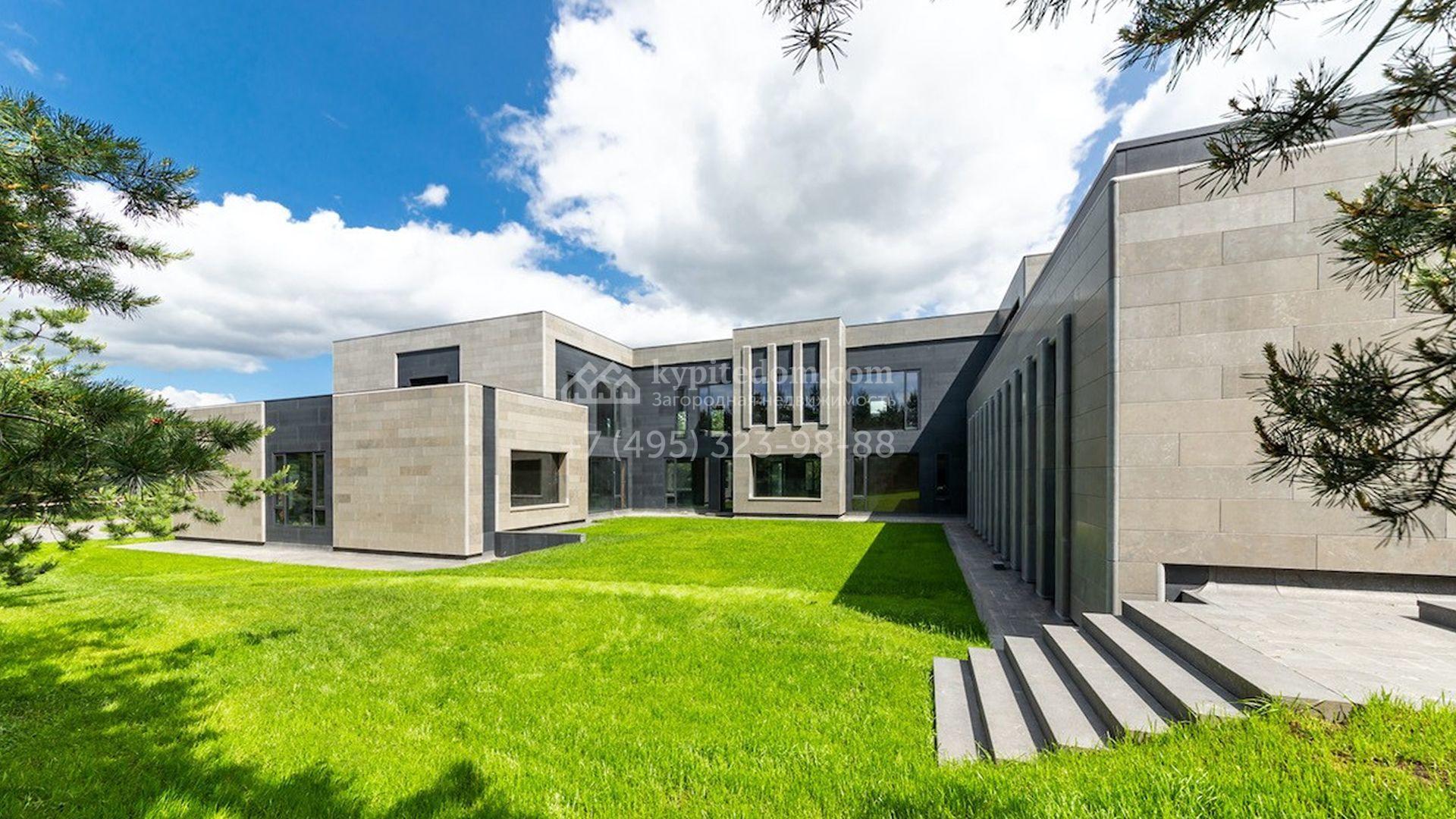 Резиденция в современном стиле площадью 2 050 м² построена на полевом участке 55 соток. Дом с лаконичным фасадом оформлен графитовым и светлым камнем. Дом предлагается с отделкой whitebox — проведена черновая отделка, разведены коммуникации, выполнена стяжка, возведены стены. В доме спланировано 7 спален для гостей и резидентов, множество гостевых помещений, и СПА-зона с панорамным бассейном. На цокольном этаже предусмотрен блок для персонала и гараж для нескольких машин. На участке площадка для парковки вымощена брусчаткой, около дома растет ровный газон и молодые сосны, закрывающие резиденцию от посторонних взглядов.