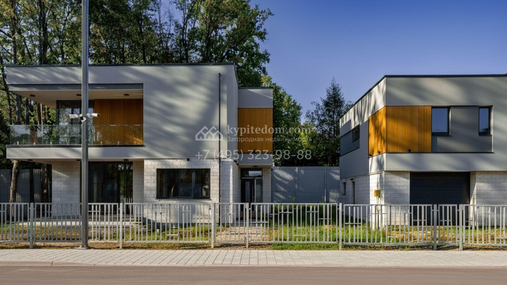 Просторный загородный дом площадью 363 м² построен на полевом участке 11,8 соток. Фасад выполнен в современном стиле и облицован белой штукатуркой, клинкерной плиткой и декорирован вставками под дерево. Коттедж представлен без отделки, что позволяет реализовать индивидуальный дизайн-проект. Участок с газоном окружен изгородью.