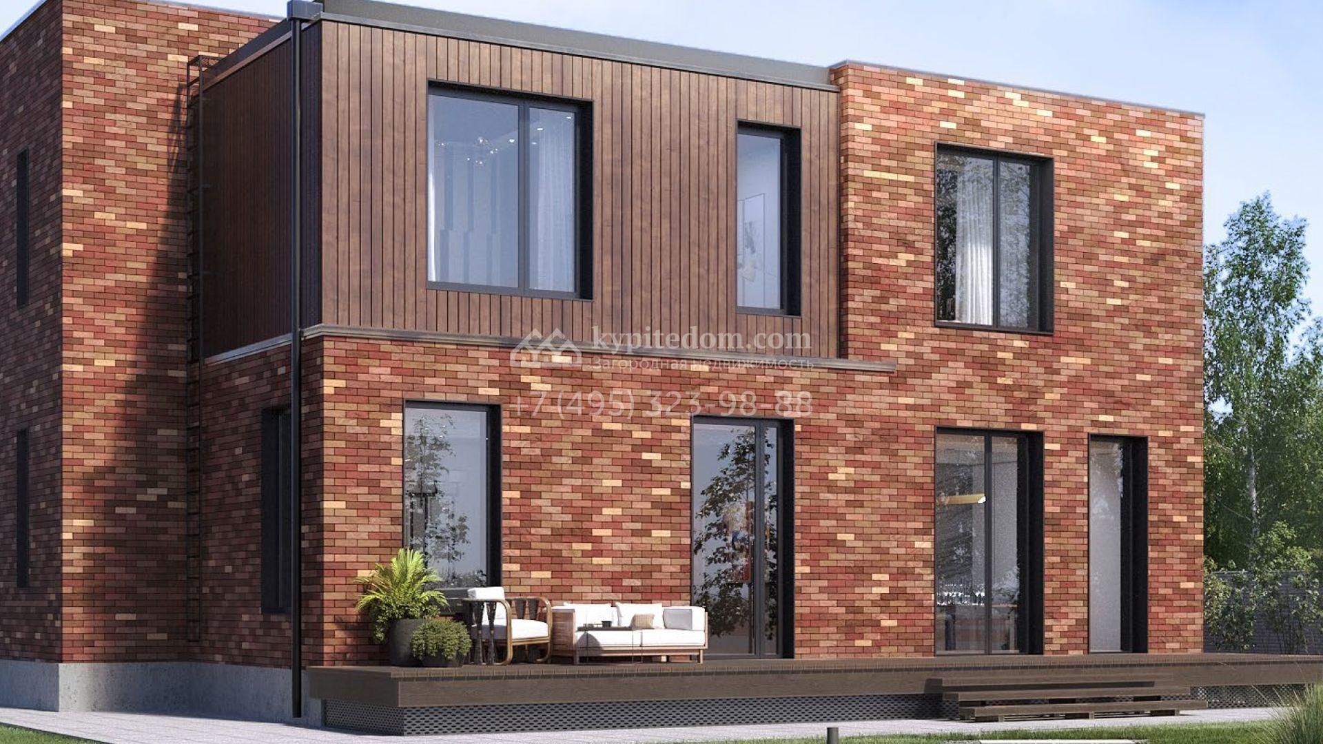 Дом по проекту Berry площадью 290 м² построен на полевом участке 11 соток. Фасад здания квадратной формы с плоской кровлей облицован светлым кирпичом в сочетании с деревом натуральных оттенков. Коттедж представлен без отделки. В резиденции спланировали 3 спальни, гостиную, кабинет, кухню-столовую и террасу. На участке выполнен ландшафтный дизайн, вымощены дорожки и уложен газон.