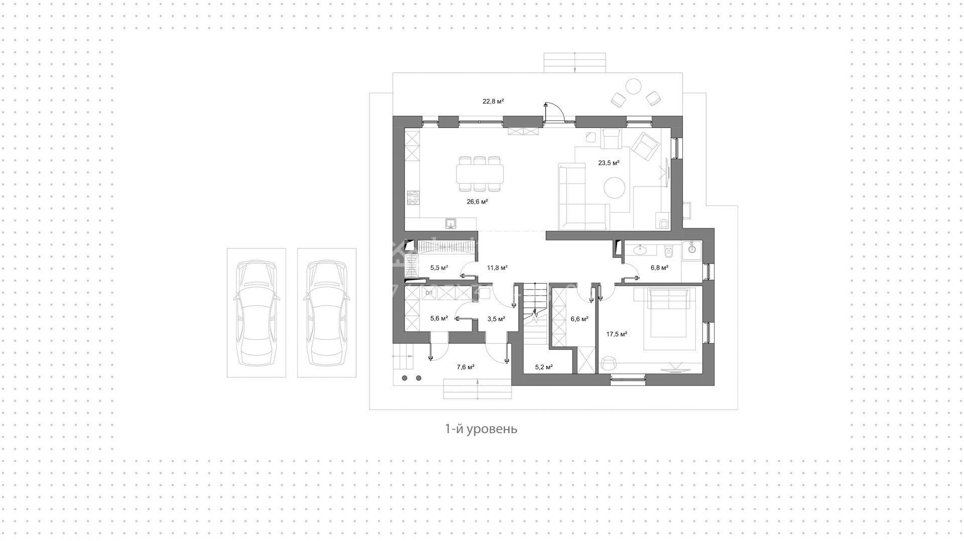 Дом по проекту Berry площадью 290 м² построен на полевом участке 12,7 сотки. Фасад здания квадратной формы с плоской кровлей облицован светлым кирпичом в сочетании с деревом натуральных оттенков. Коттедж представлен без отделки. В резиденции спланировали 3 спальни, гостиную, кабинет, кухню-столовую и террасу. На участке выполнен ландшафтный дизайн, вымощены дорожки и уложен газон.